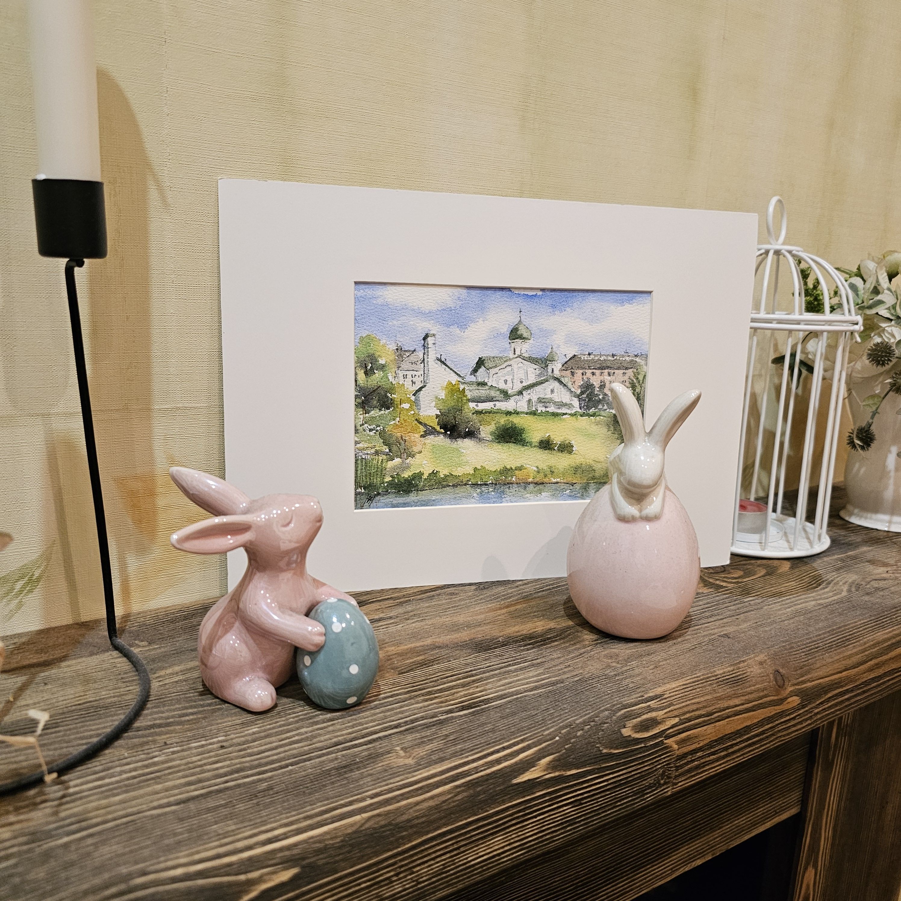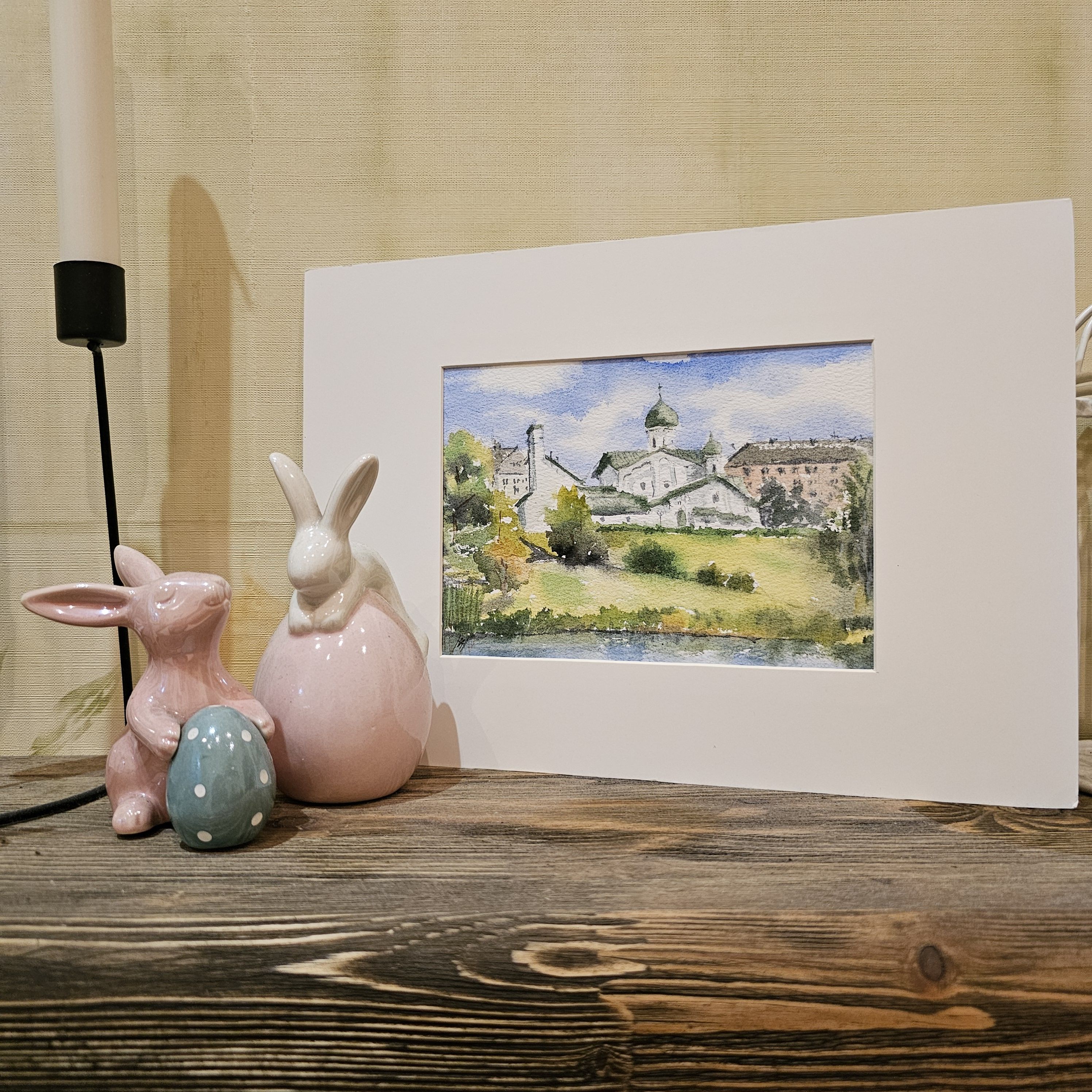Картина оформлена в светлое паспарту и готова к размещению в раме 21*30 см.
