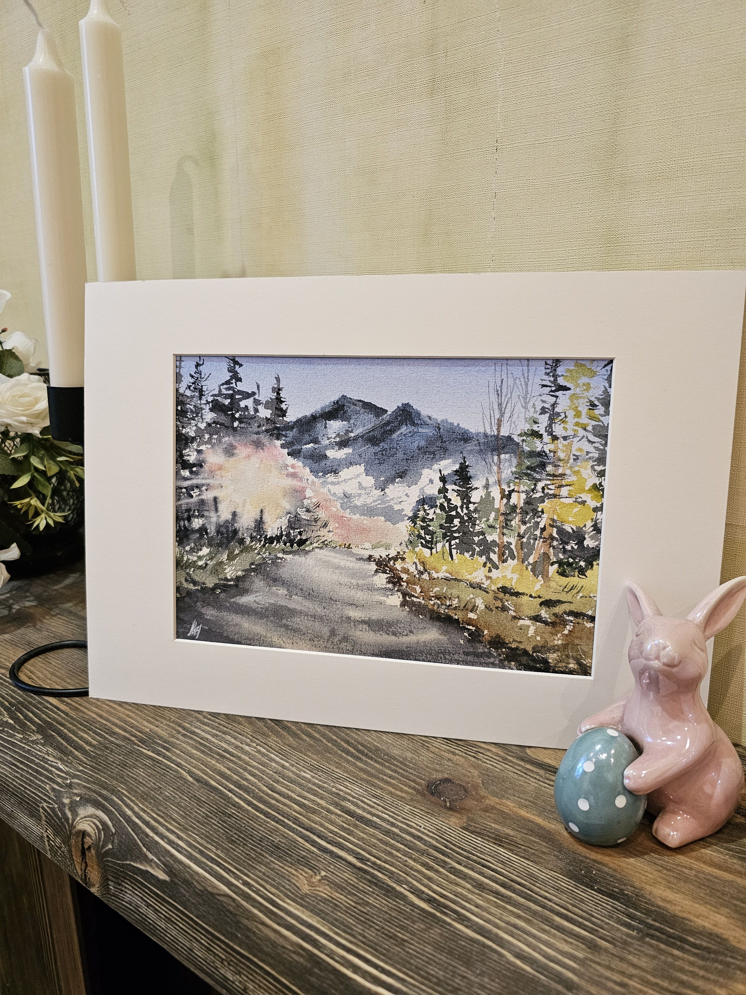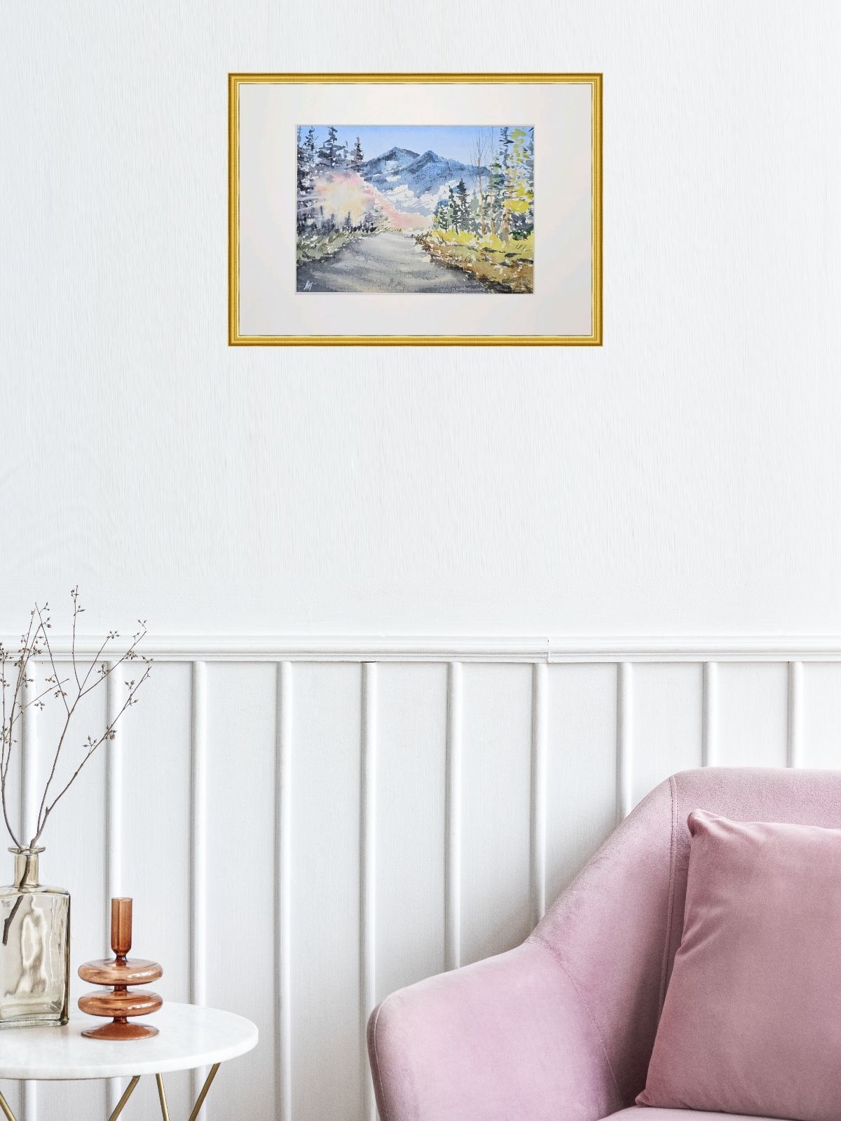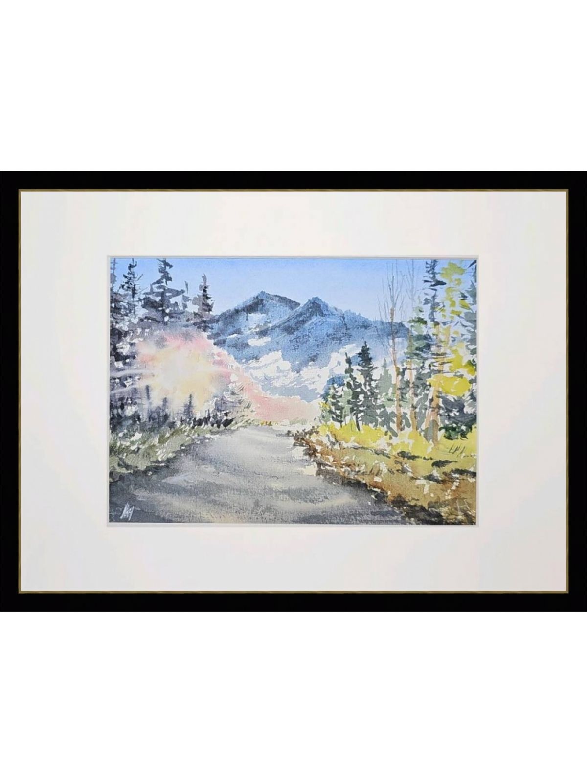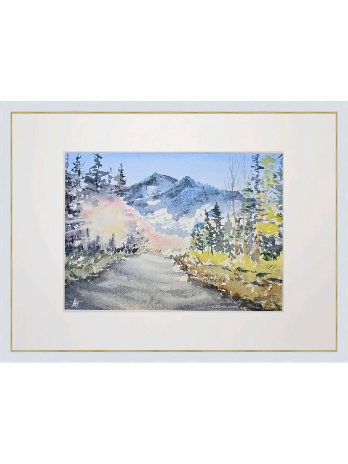 Нам представлен акварельный пейзаж. В центре извилистый путь, ведущий вдоль лесного пейзажа. По обе стороны дороги растут деревья, часть из которых покрыта зелёной листвой, а другая часть – тёмными хвойными иголками. В центре, на горизонте, виднеются горные вершины, покрытые снегом. Сквозь лес пробиваются лучи слепящего солнца. Цветовая гамма включает нежные оттенки синего, зелёного и жёлтого цветов. Общая атмосфера картины спокойная и умиротворяющая. Картина обрамлена в светлое паспарту и готова к размещению в раме 21*30 см.