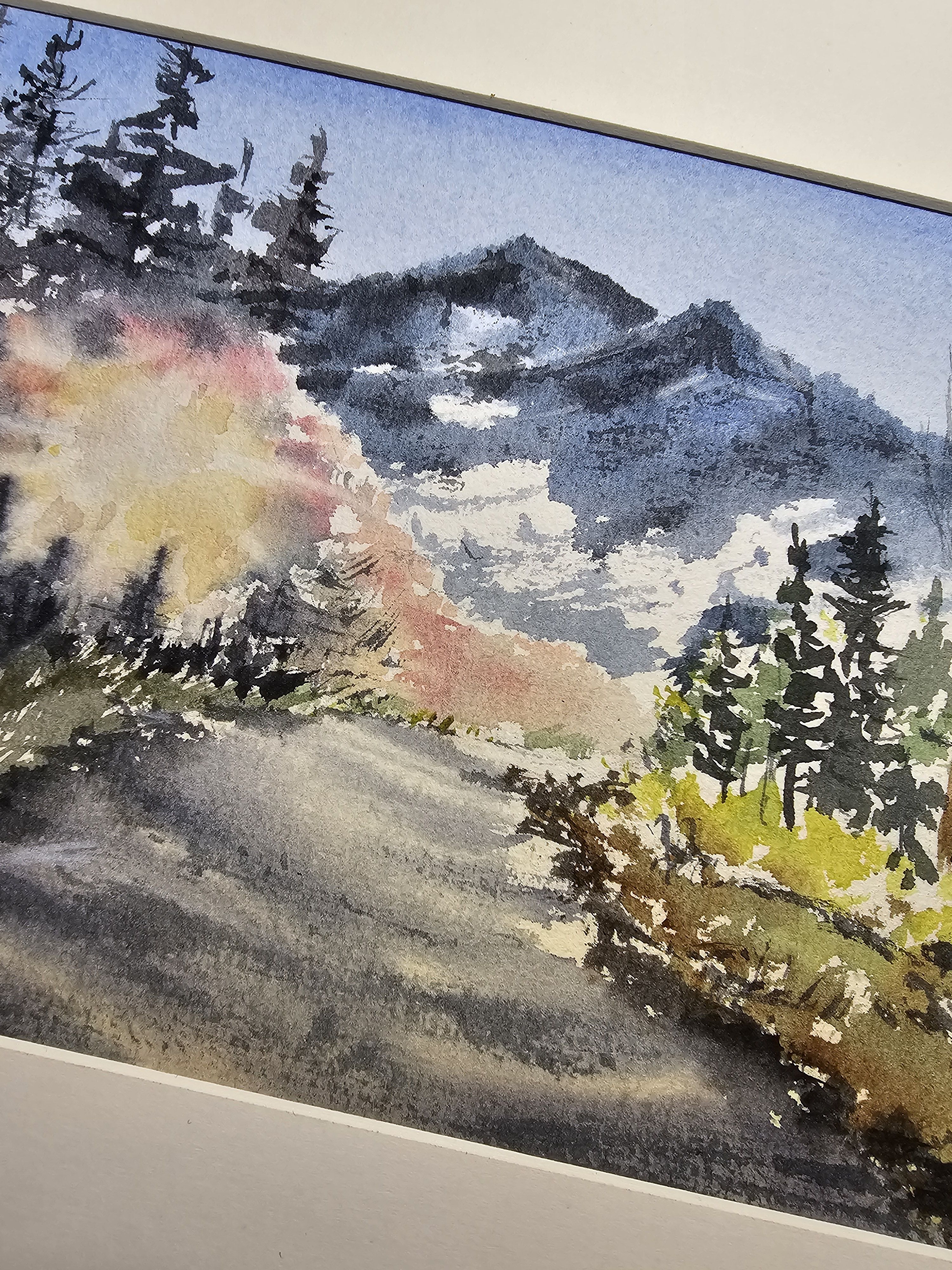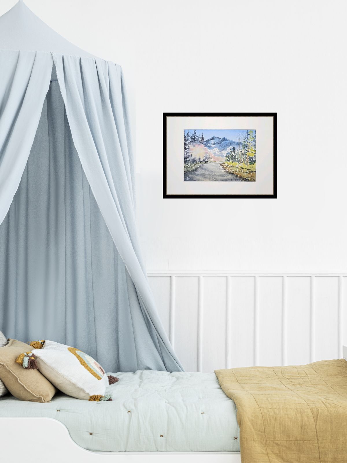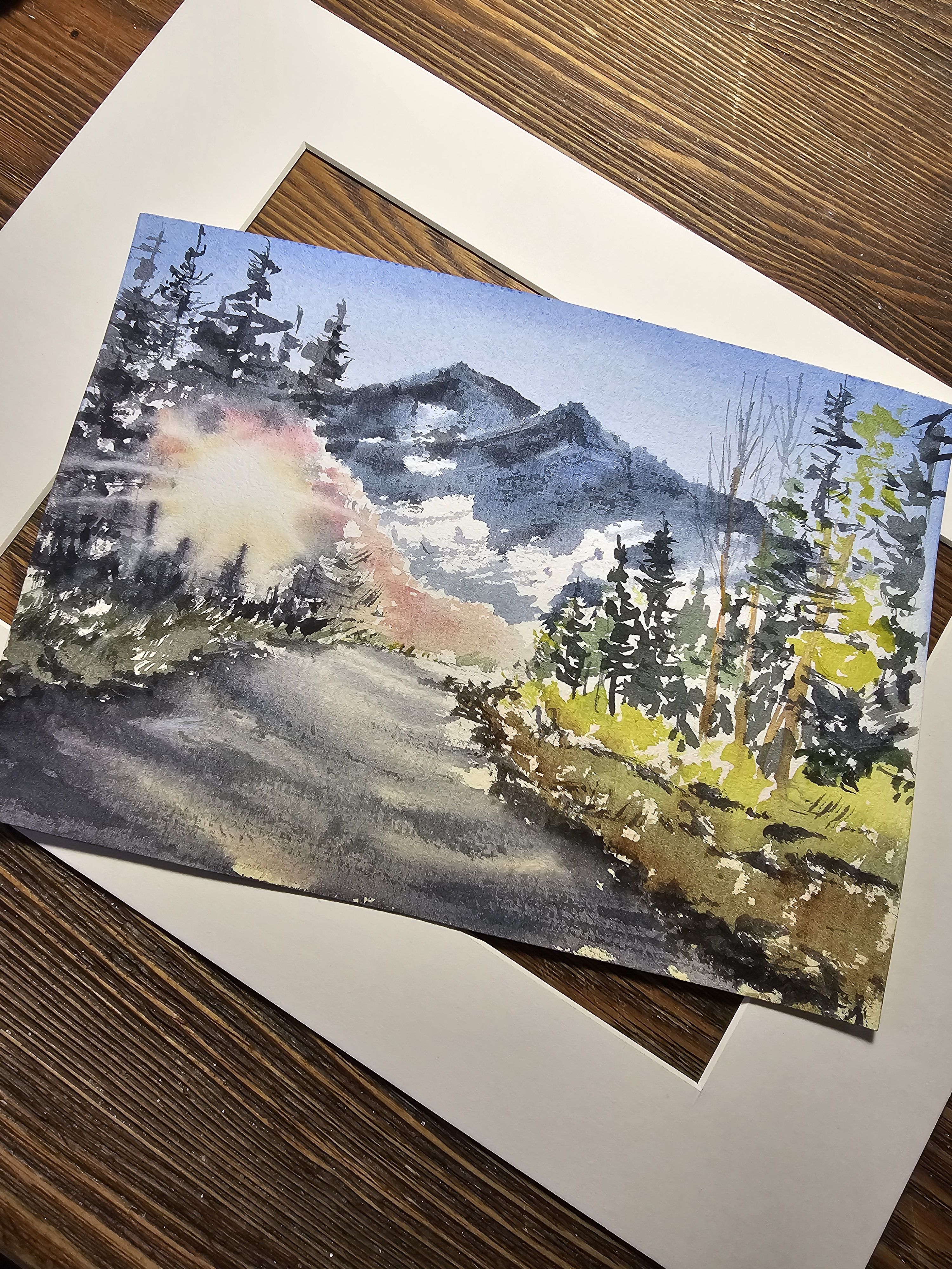 Нам представлен акварельный пейзаж. В центре извилистый путь, ведущий вдоль лесного пейзажа. По обе стороны дороги растут деревья, часть из которых покрыта зелёной листвой, а другая часть – тёмными хвойными иголками. В центре, на горизонте, виднеются горные вершины, покрытые снегом. Сквозь лес пробиваются лучи слепящего солнца. Цветовая гамма включает нежные оттенки синего, зелёного и жёлтого цветов. Общая атмосфера картины спокойная и умиротворяющая. Картина обрамлена в светлое паспарту и готова к размещению в раме 21*30 см.