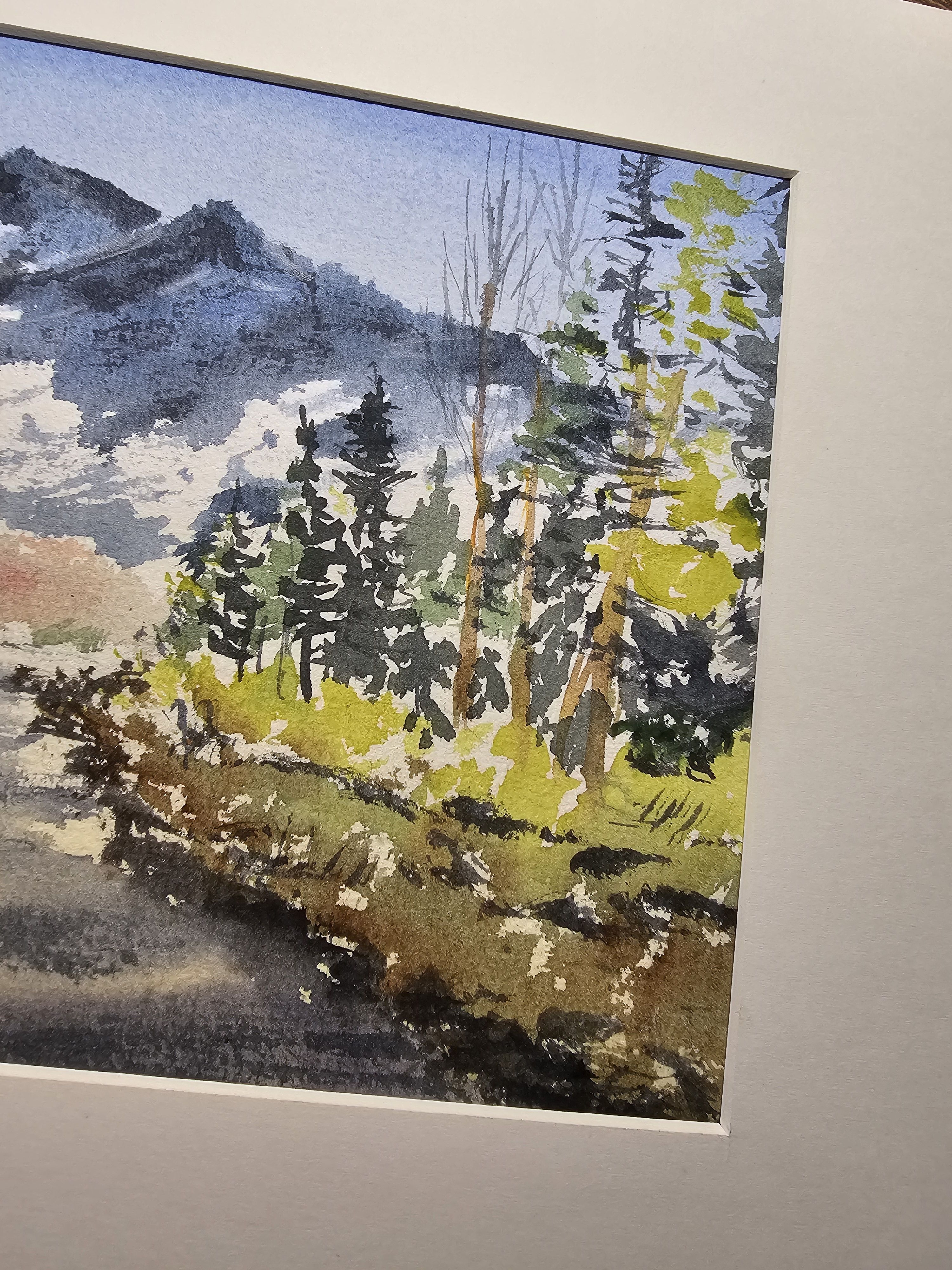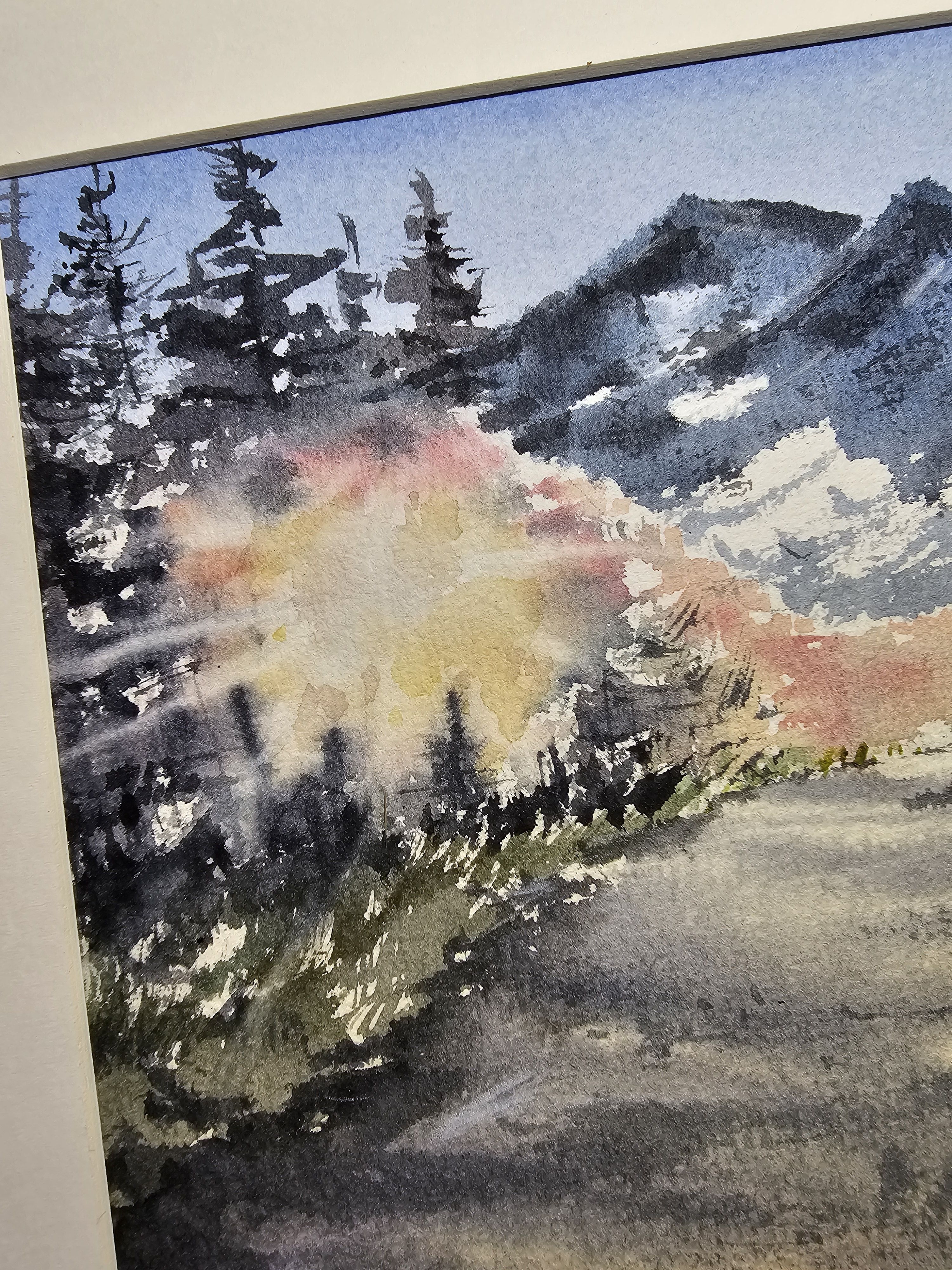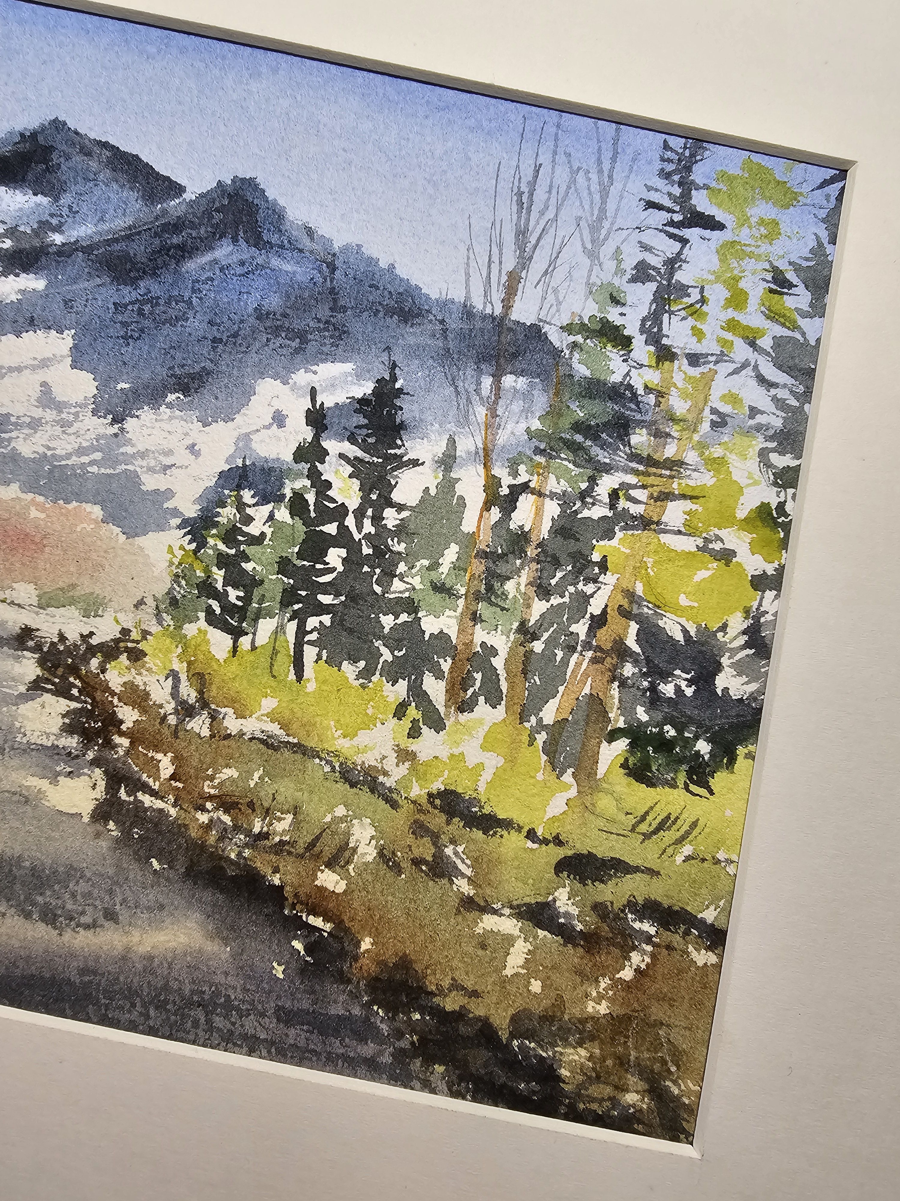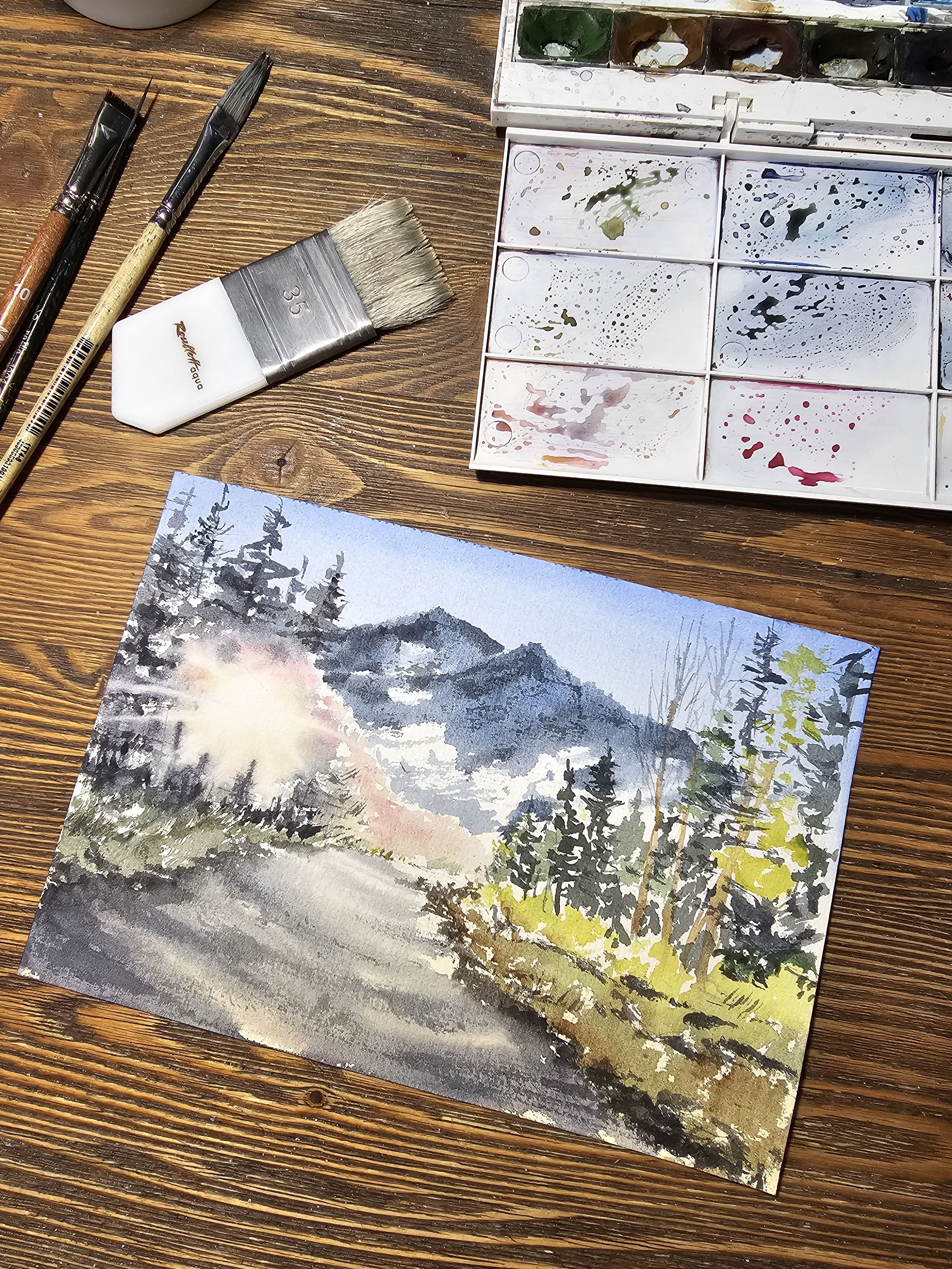Нам представлен акварельный пейзаж. В центре извилистый путь, ведущий вдоль лесного пейзажа. По обе стороны дороги растут деревья, часть из которых покрыта зелёной листвой, а другая часть – тёмными хвойными иголками. В центре, на горизонте, виднеются горные вершины, покрытые снегом. Сквозь лес пробиваются лучи слепящего солнца. Цветовая гамма включает нежные оттенки синего, зелёного и жёлтого цветов. Общая атмосфера картины спокойная и умиротворяющая. Картина обрамлена в светлое паспарту и готова к размещению в раме 21*30 см.