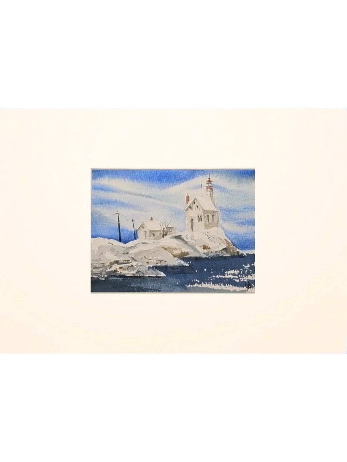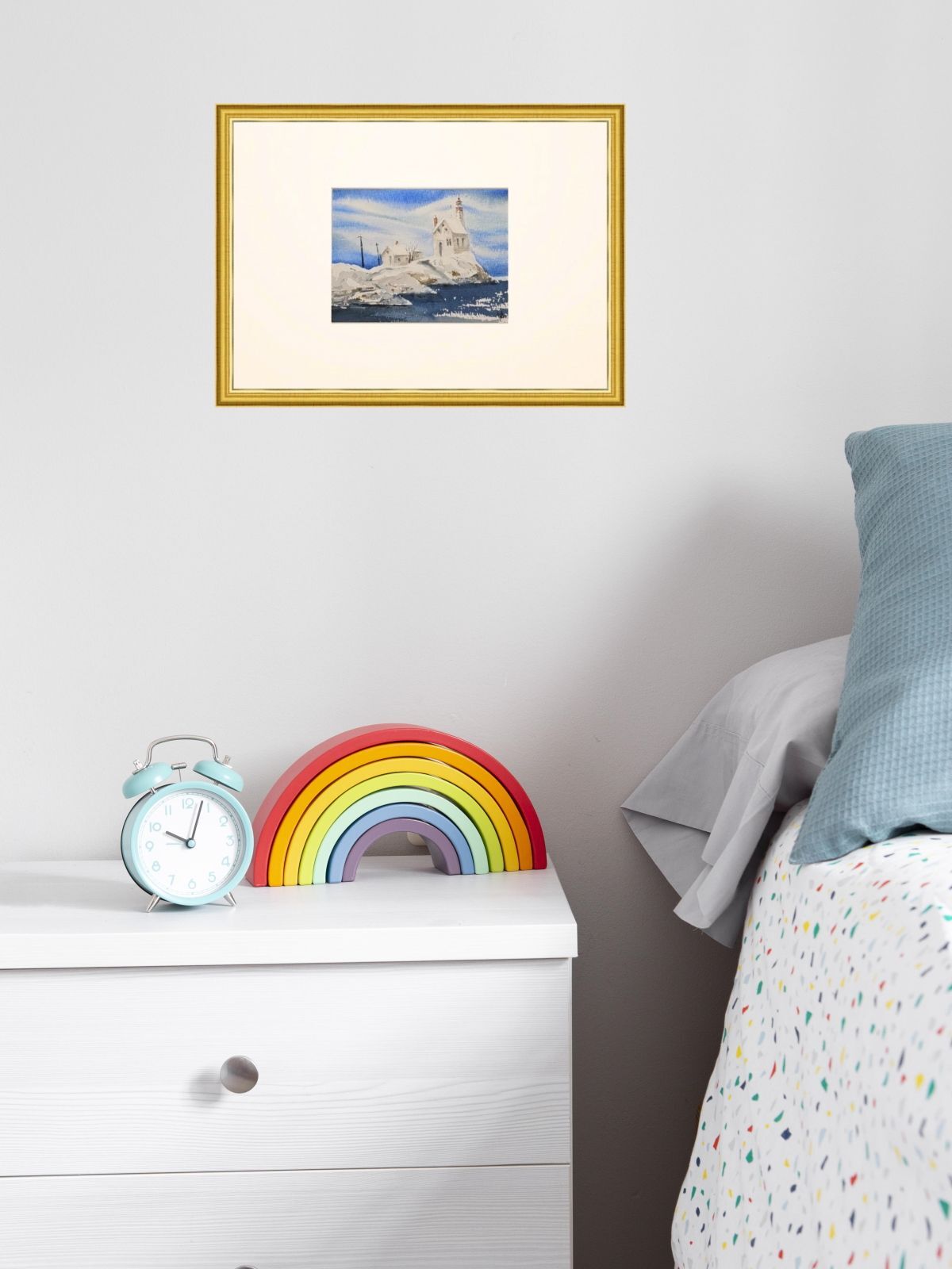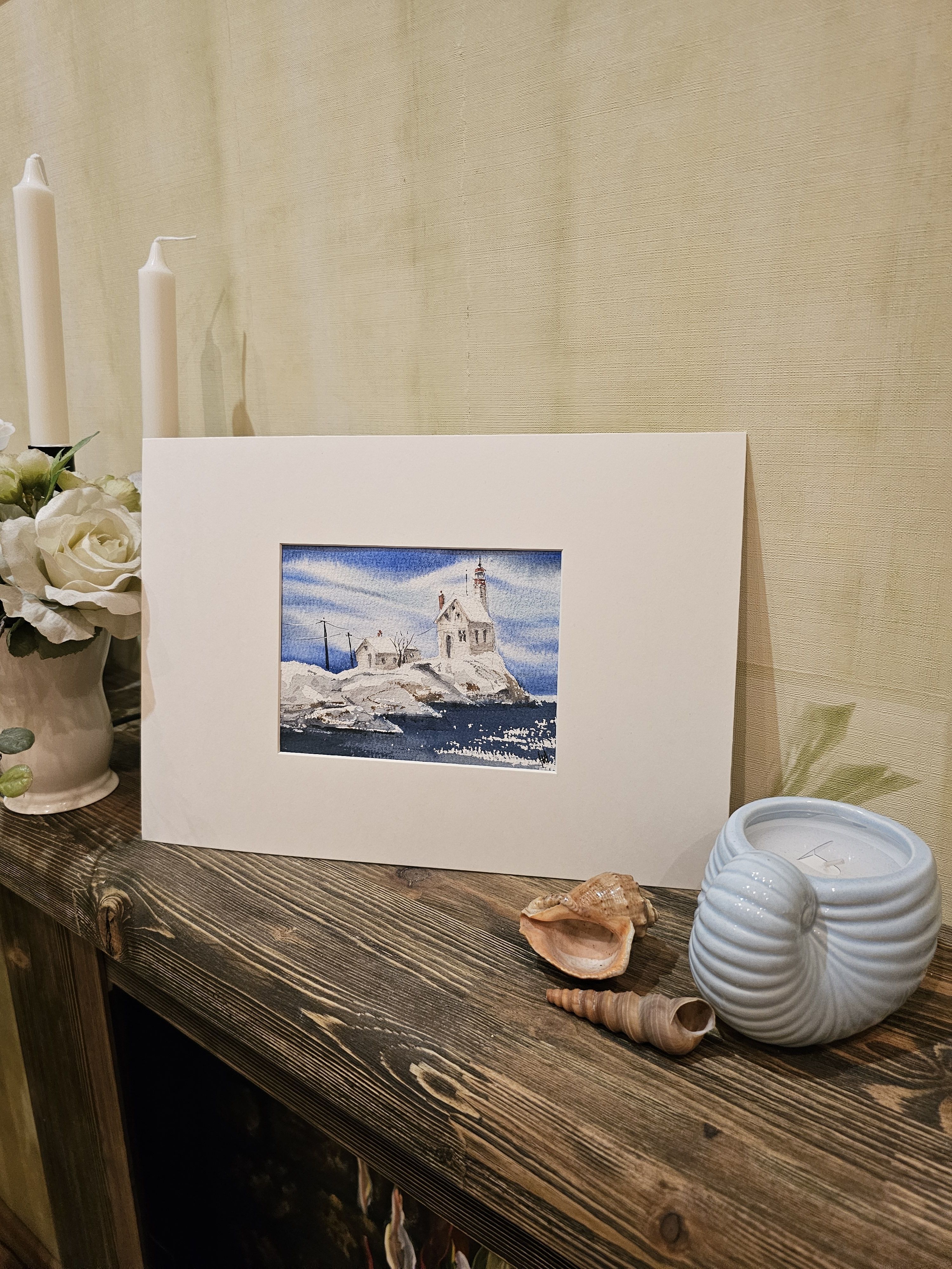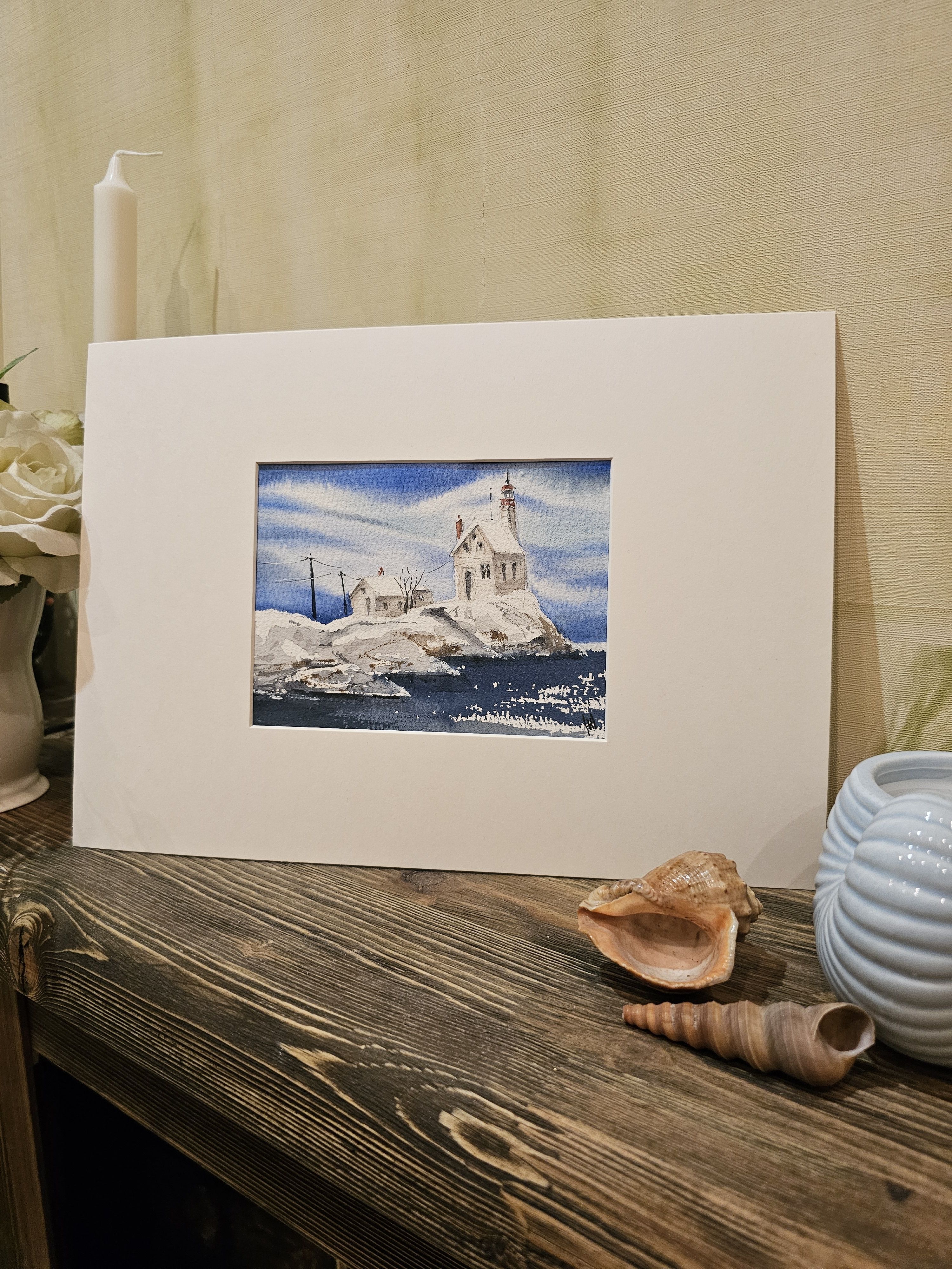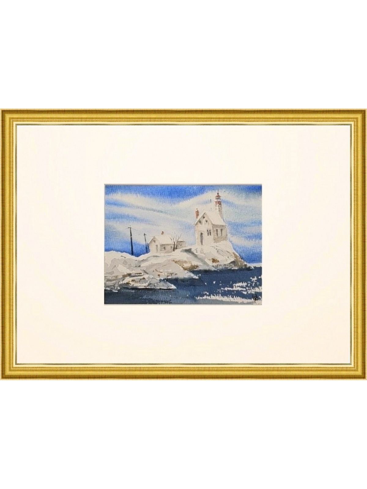 Нам представлена акварельная картина с маяком. Маяк и здание расположены на каменистом берегу, окруженном водой. Небо над ними ярко-синее с легкими облаками. Картина выполнена в светлых тонах, создающих атмосферу спокойствия и умиротворения. Картина оформлена в светлое паспарту и готова к размещению в раме 21*30 см.
