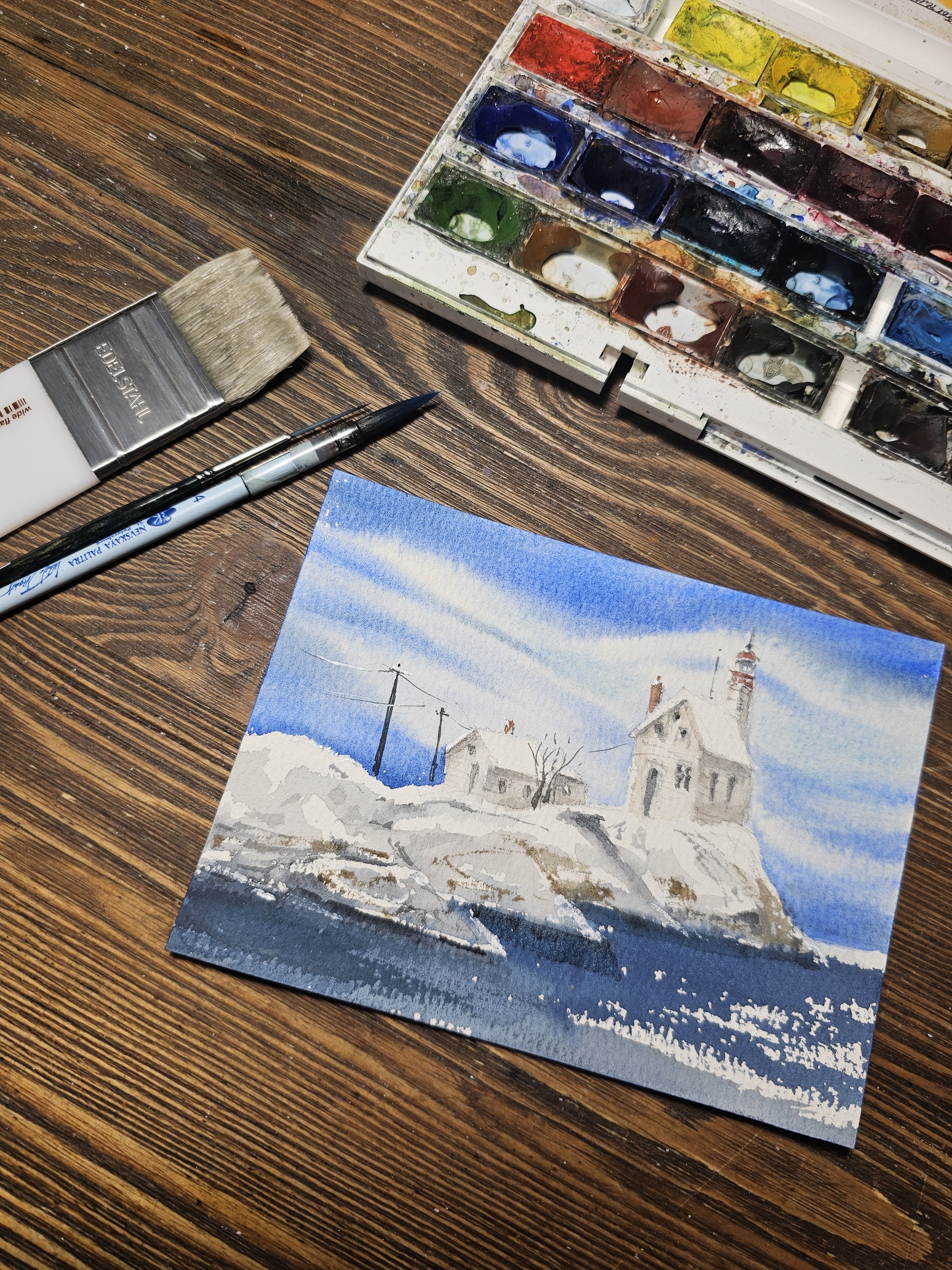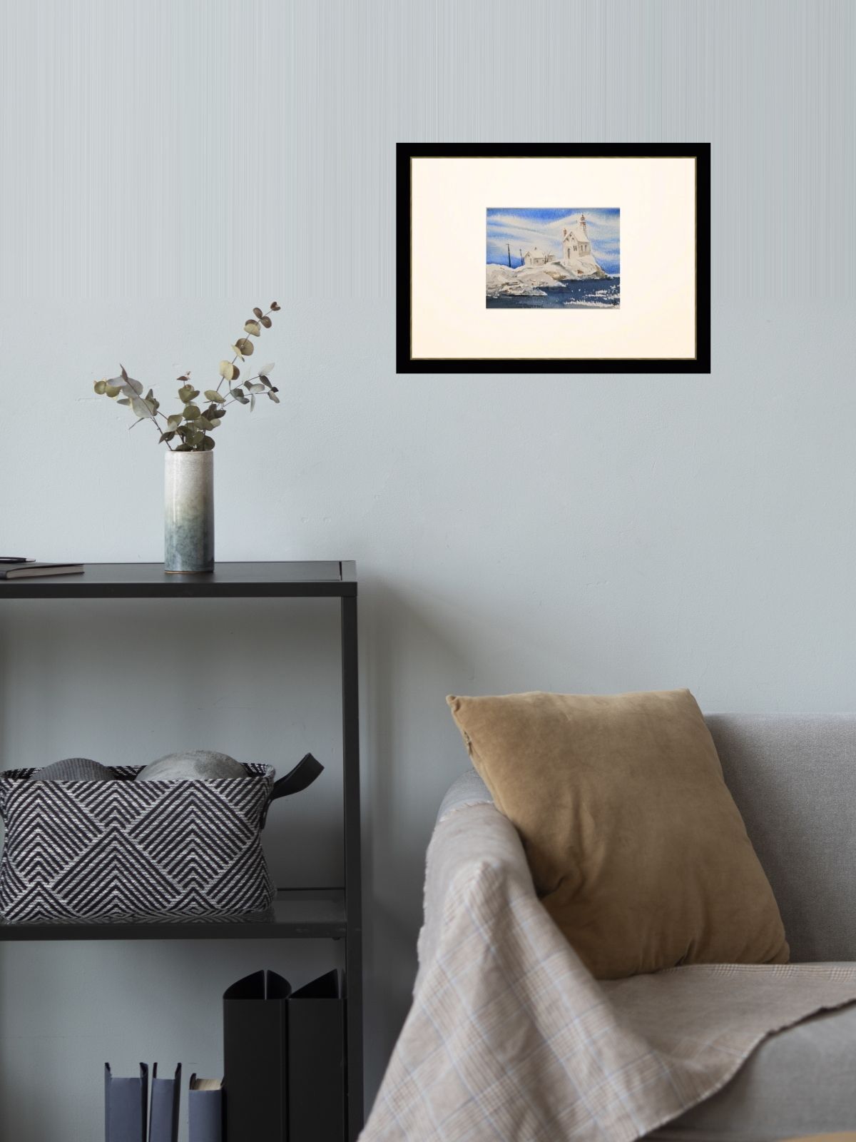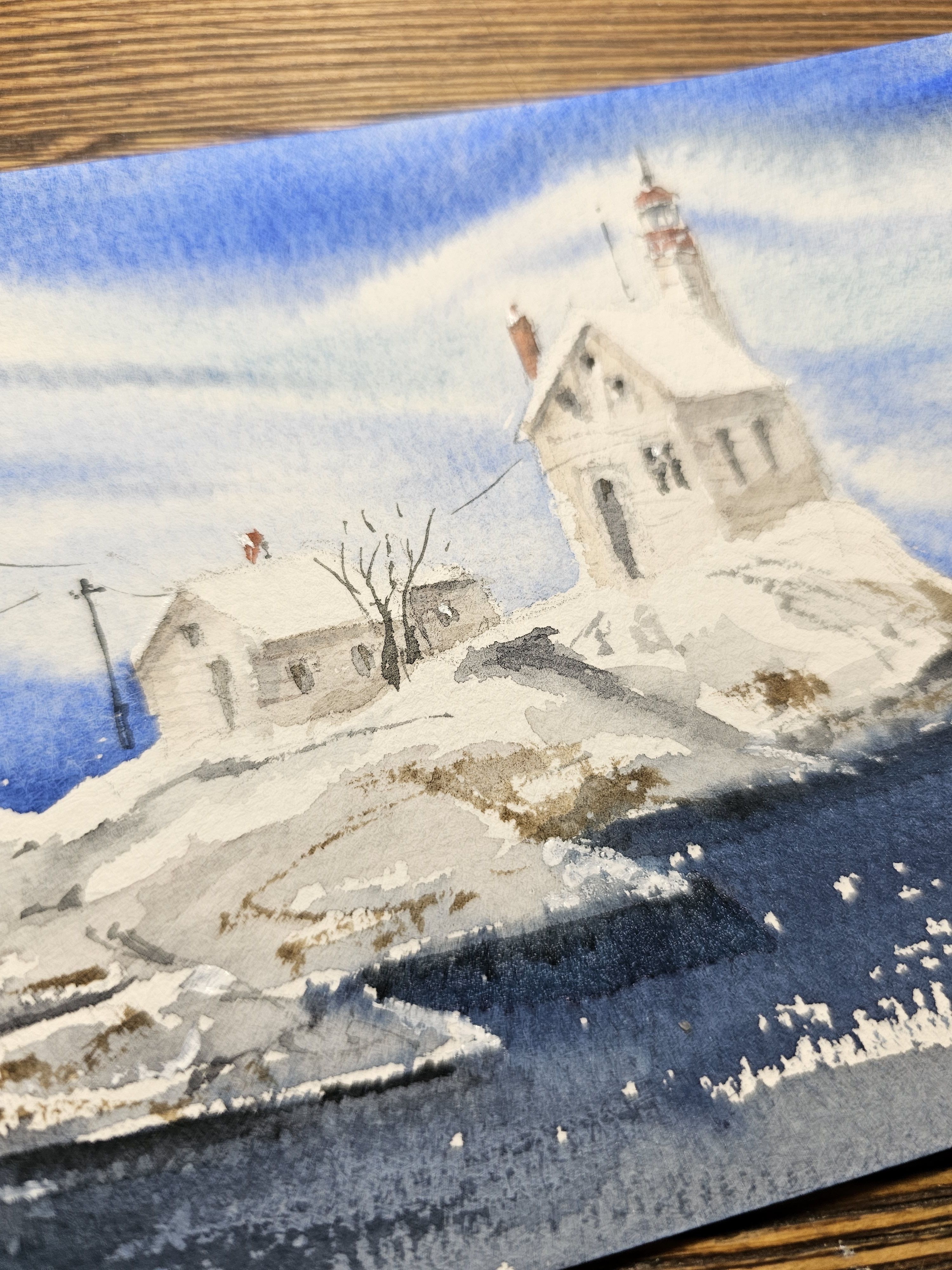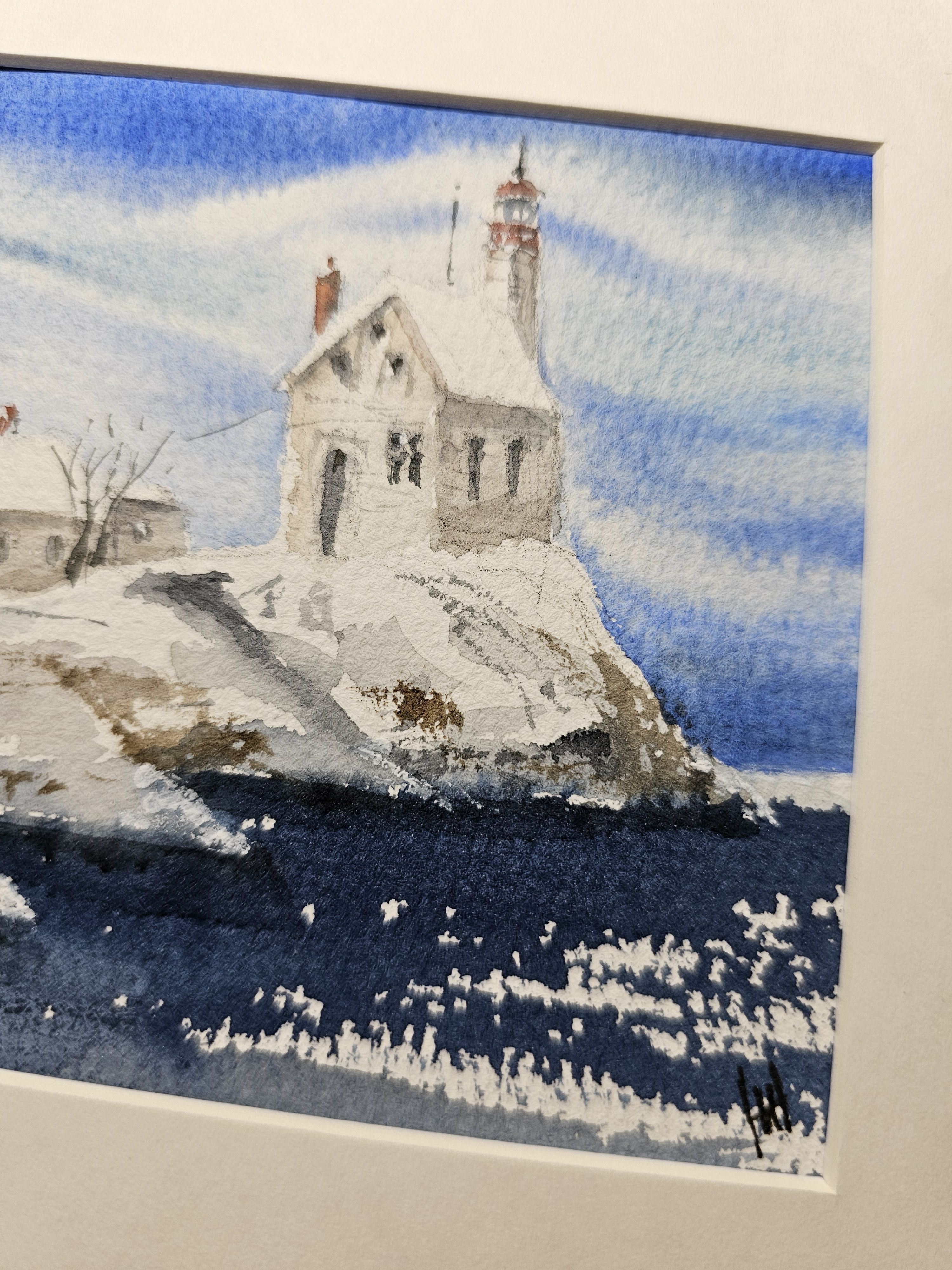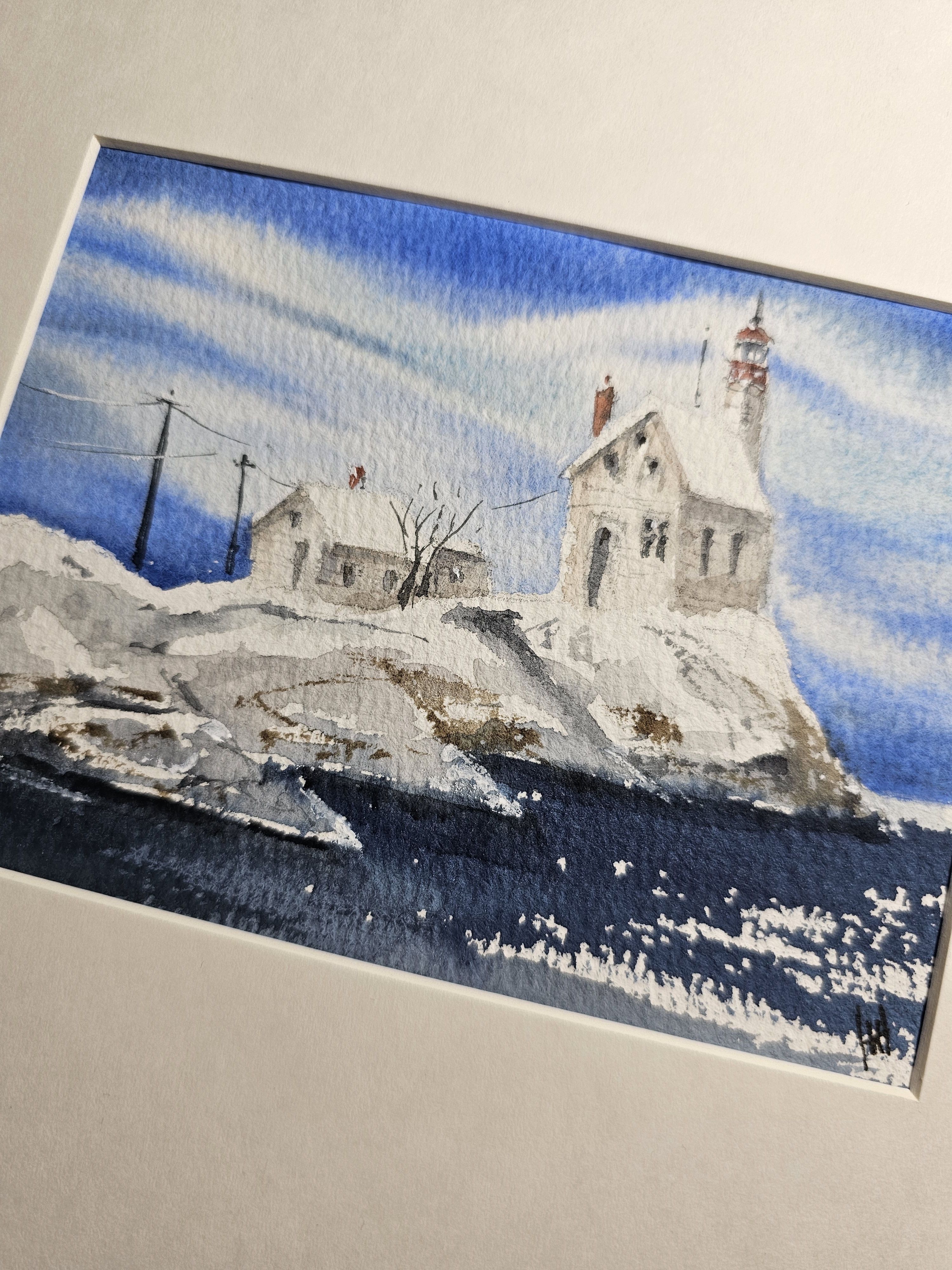 Нам представлена акварельная картина с маяком. Маяк и здание расположены на каменистом берегу, окруженном водой. Небо над ними ярко-синее с легкими облаками. Картина выполнена в светлых тонах, создающих атмосферу спокойствия и умиротворения. Картина оформлена в светлое паспарту и готова к размещению в раме 21*30 см.