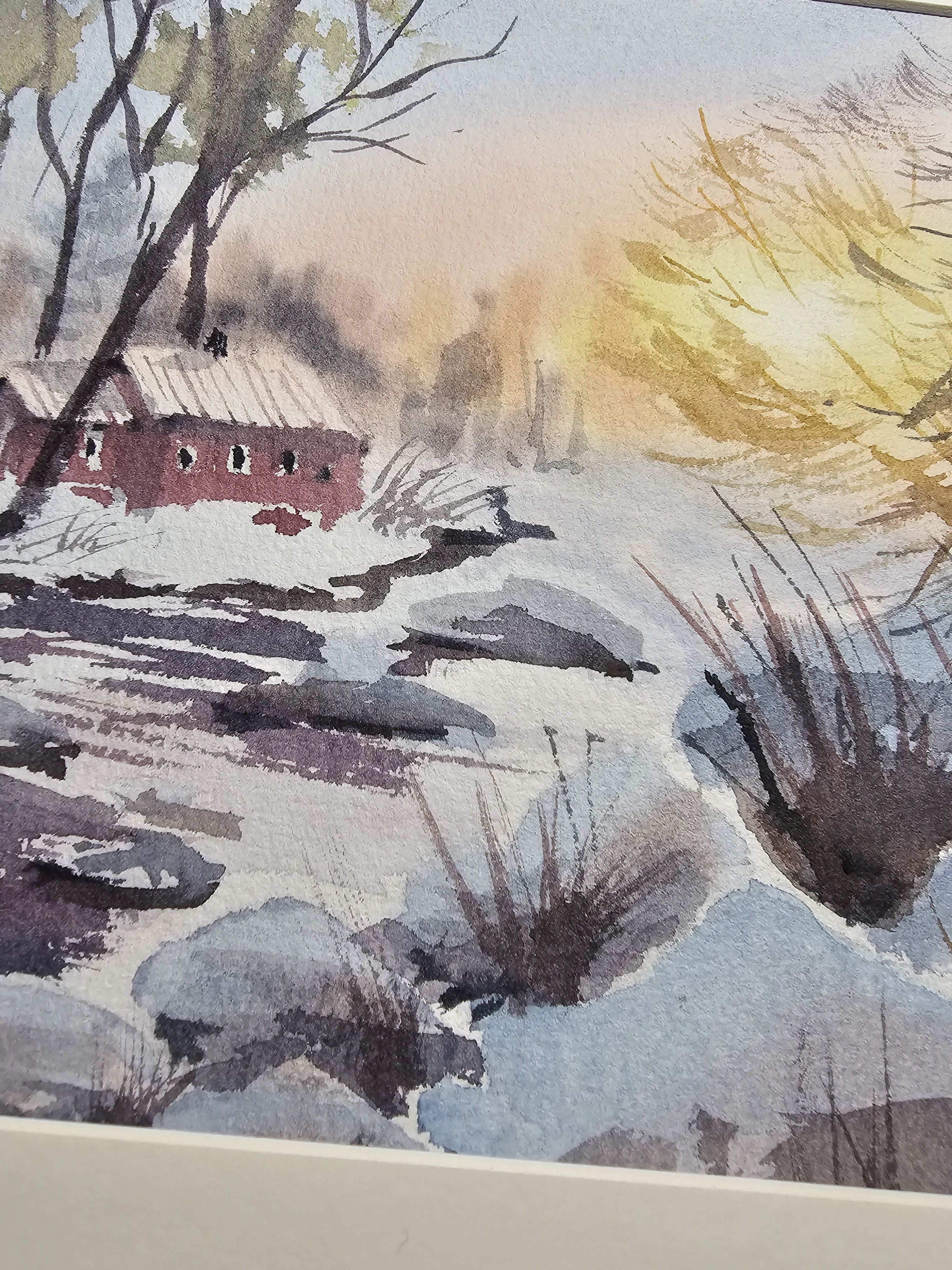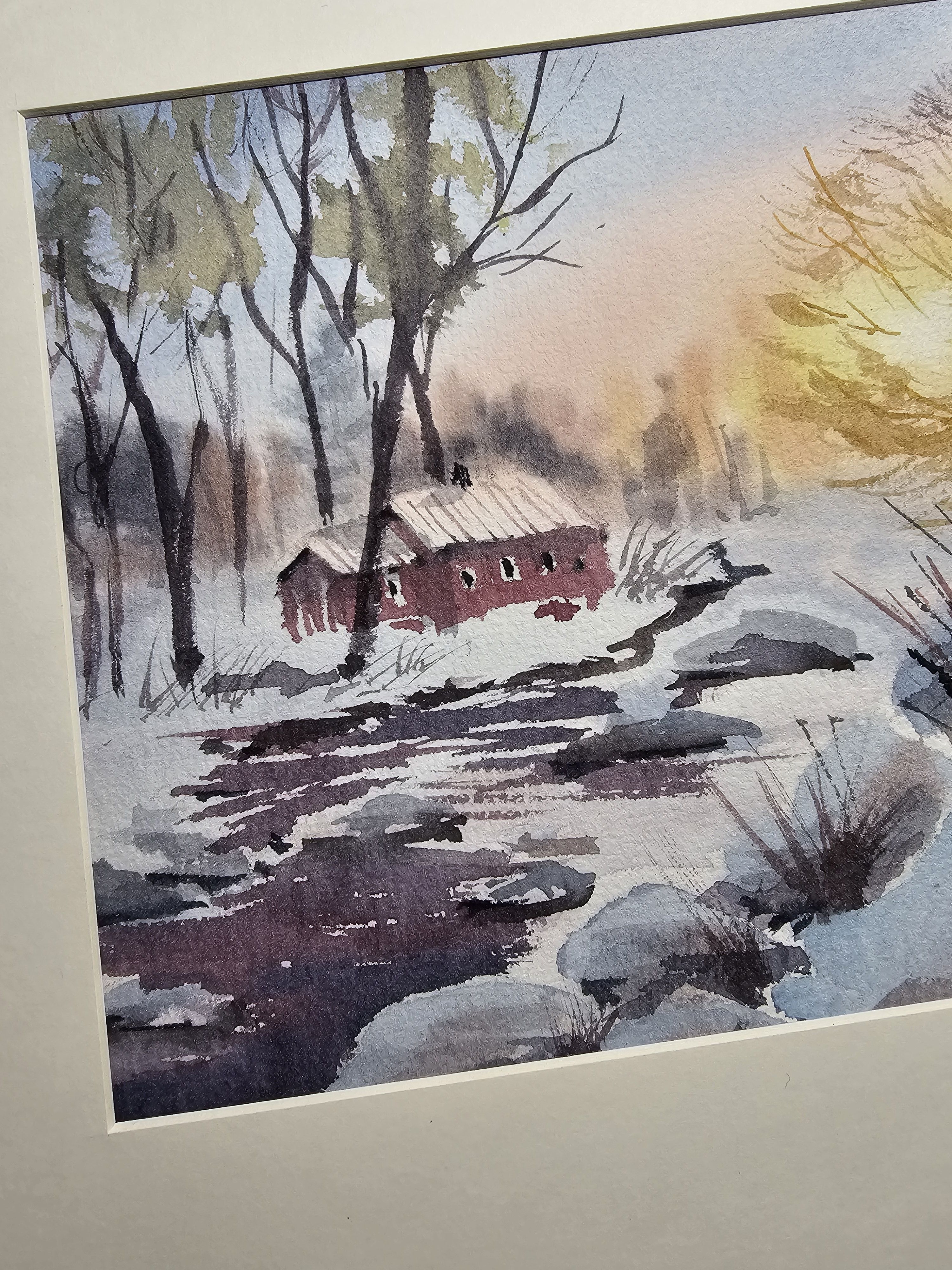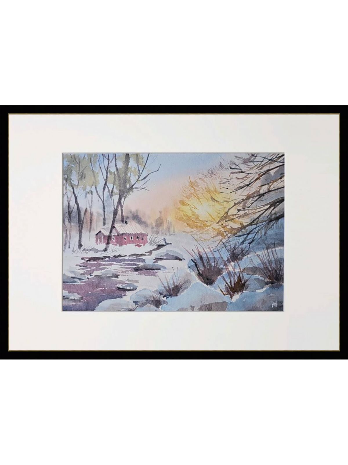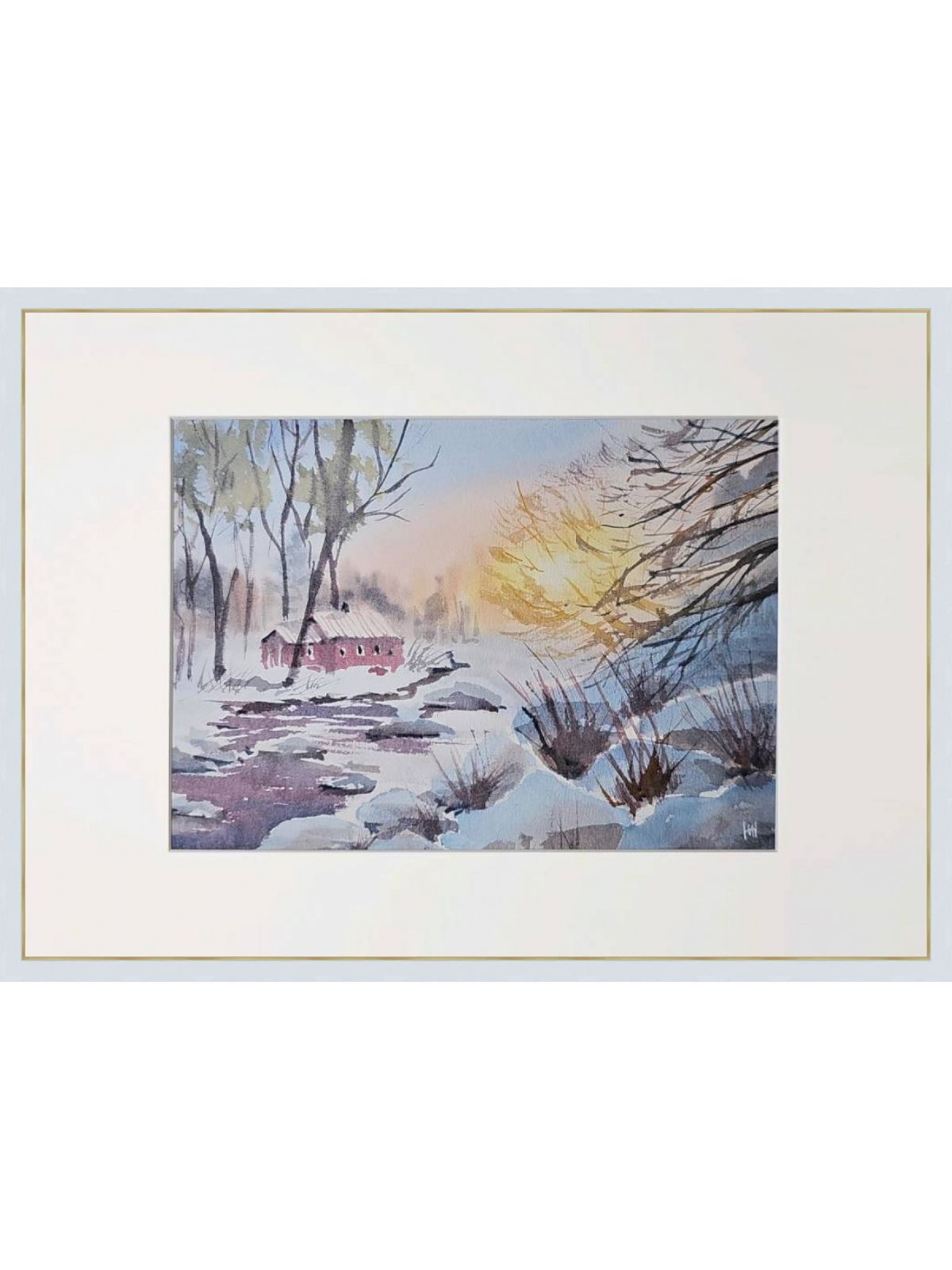Нам представлена акварельная картина зимнего пейзажа. На переднем плане видна заснеженная земля с кустарниками, из-под снега видно немного воды. На среднем плане изображён небольшой красный домик с заснеженной крышей. Вокруг домика растут высокие деревья без листвы. На заднем плане видны размытые контуры деревьев. В правой части картины появляется нежное свечение, вероятно, изображающее рассвет. Картина обрамлена в светлое паспарту и готова к размещению в раме 21*30 см.