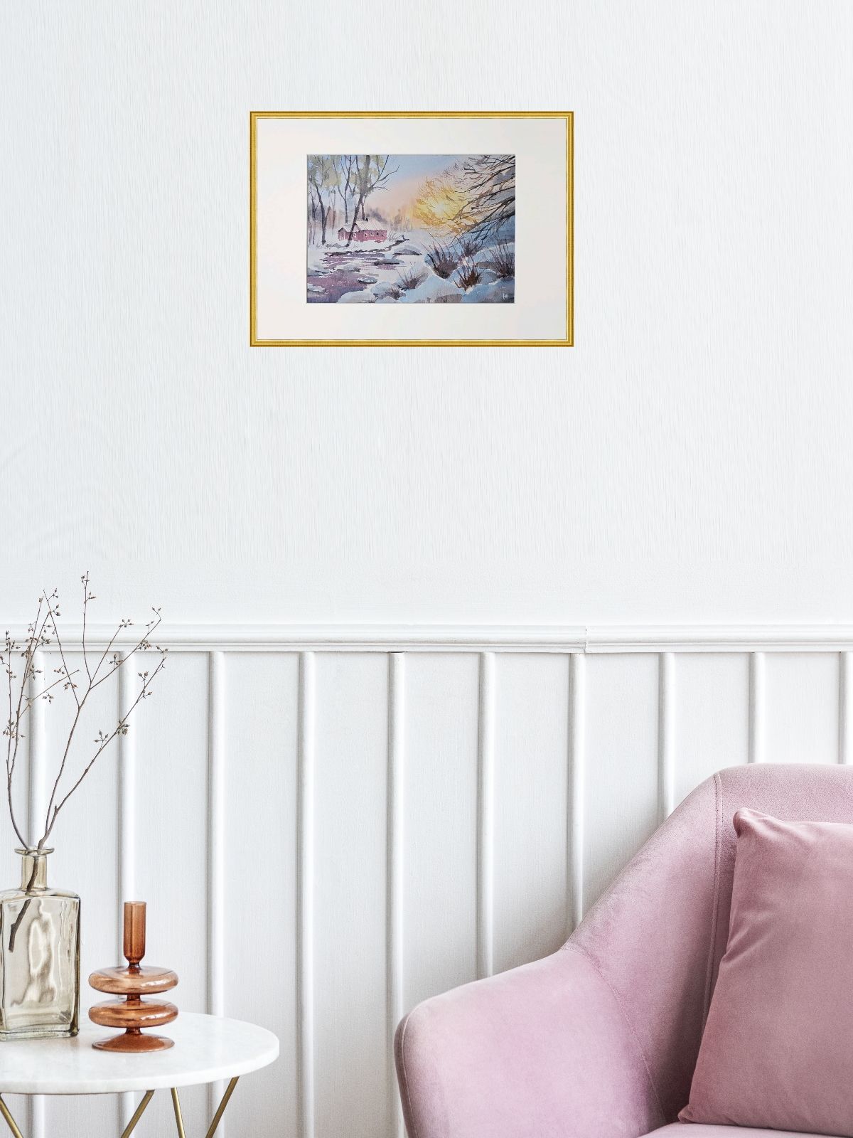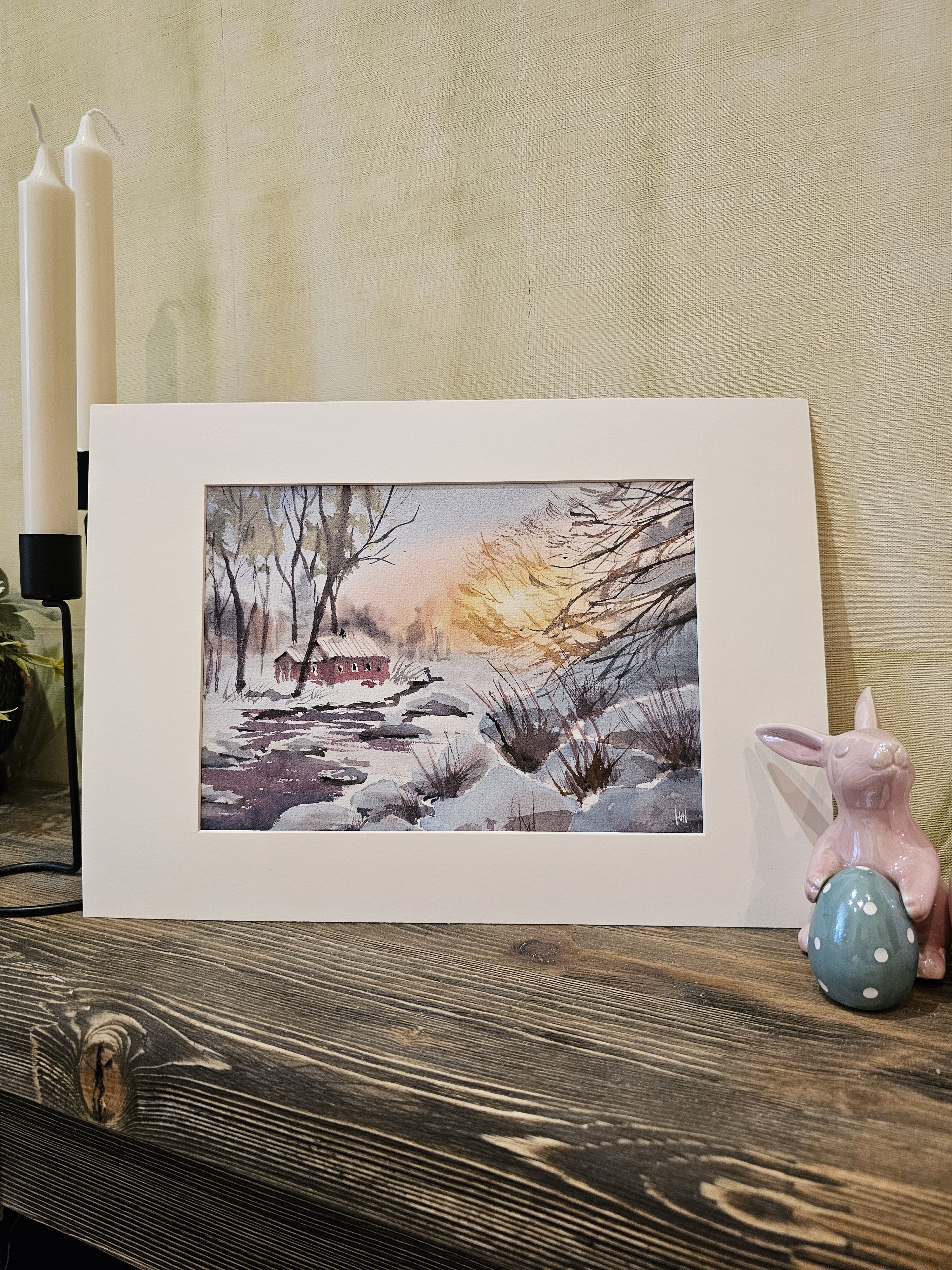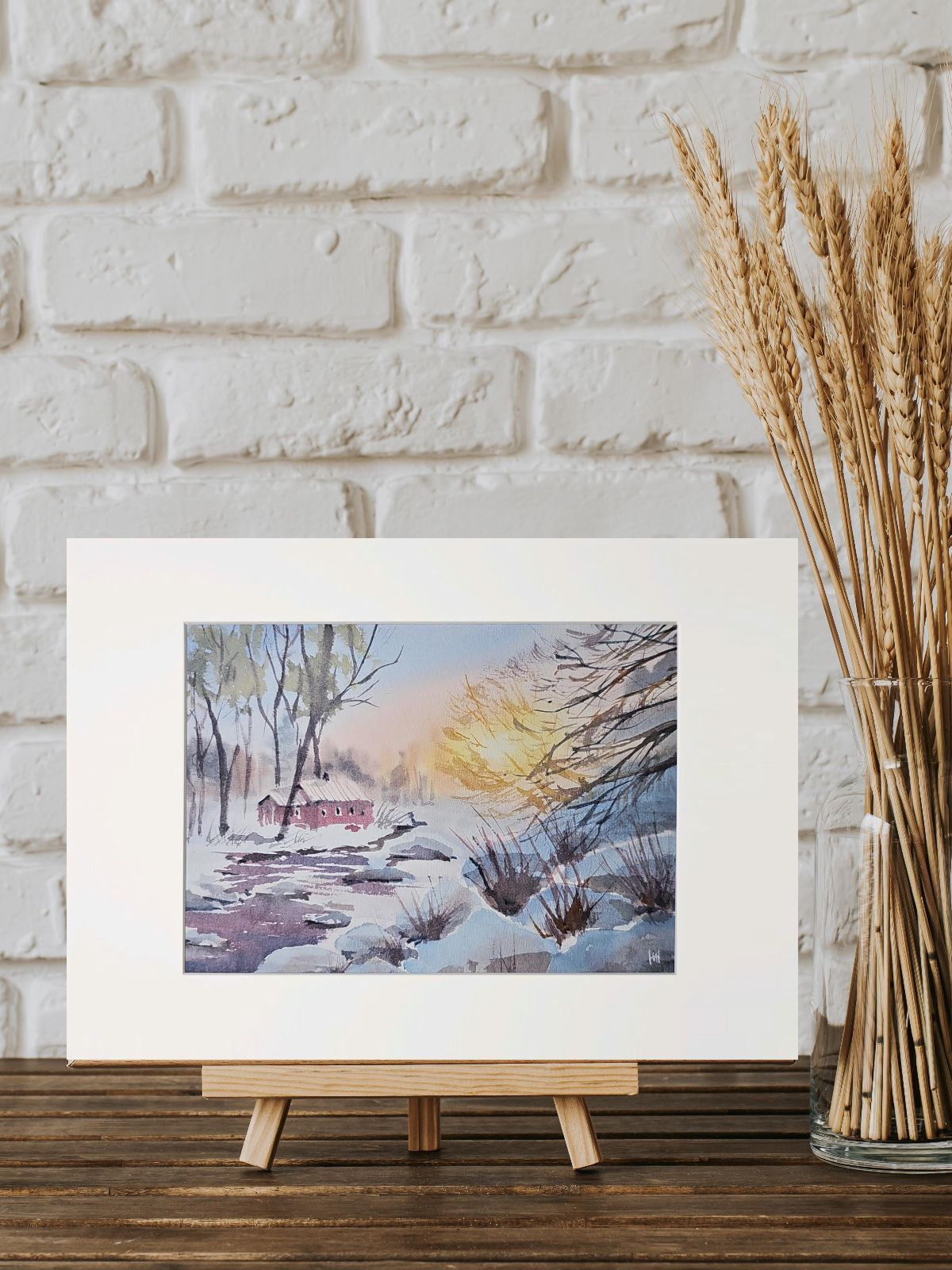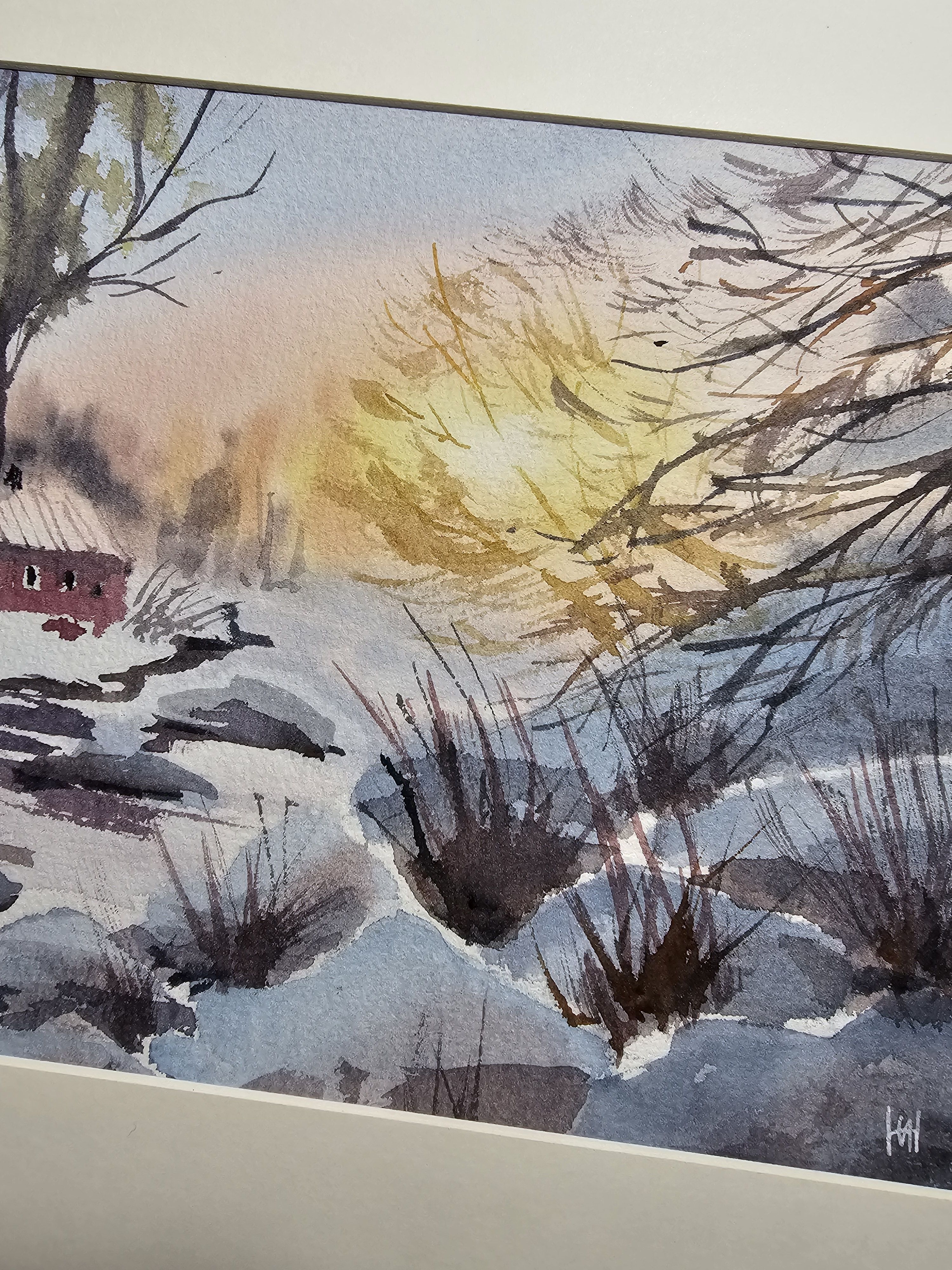Нам представлена акварельная картина зимнего пейзажа. На переднем плане видна заснеженная земля с кустарниками, из-под снега видно немного воды. На среднем плане изображён небольшой красный домик с заснеженной крышей. Вокруг домика растут высокие деревья без листвы. На заднем плане видны размытые контуры деревьев. В правой части картины появляется нежное свечение, вероятно, изображающее рассвет. Картина обрамлена в светлое паспарту и готова к размещению в раме 21*30 см.