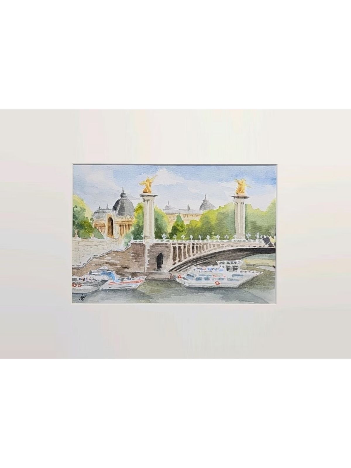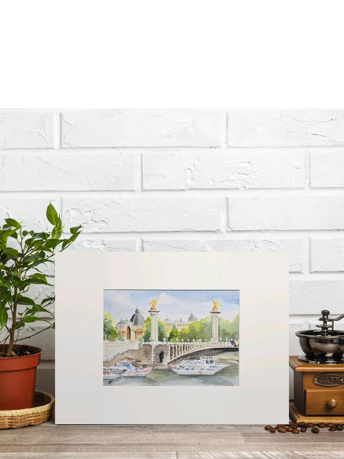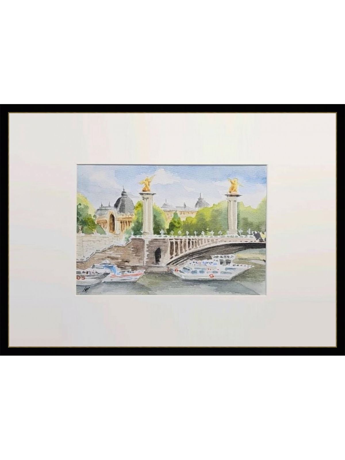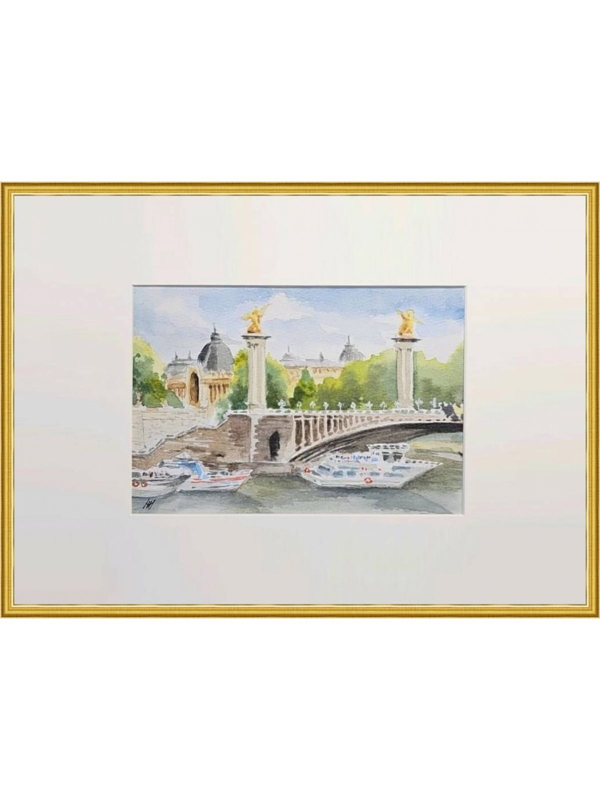 Нам представлена акварельная картина, изображающая известный мост Парижа - Мост Александра III. На переднем плане находятся лодки или суда, плывущие по реке. Вдали видны здания с куполами и деревьями. Композиция выполнена в мягких, пастельных тонах и оформлена в светлое паспарту и готова к размещению в раме 21*30 см.