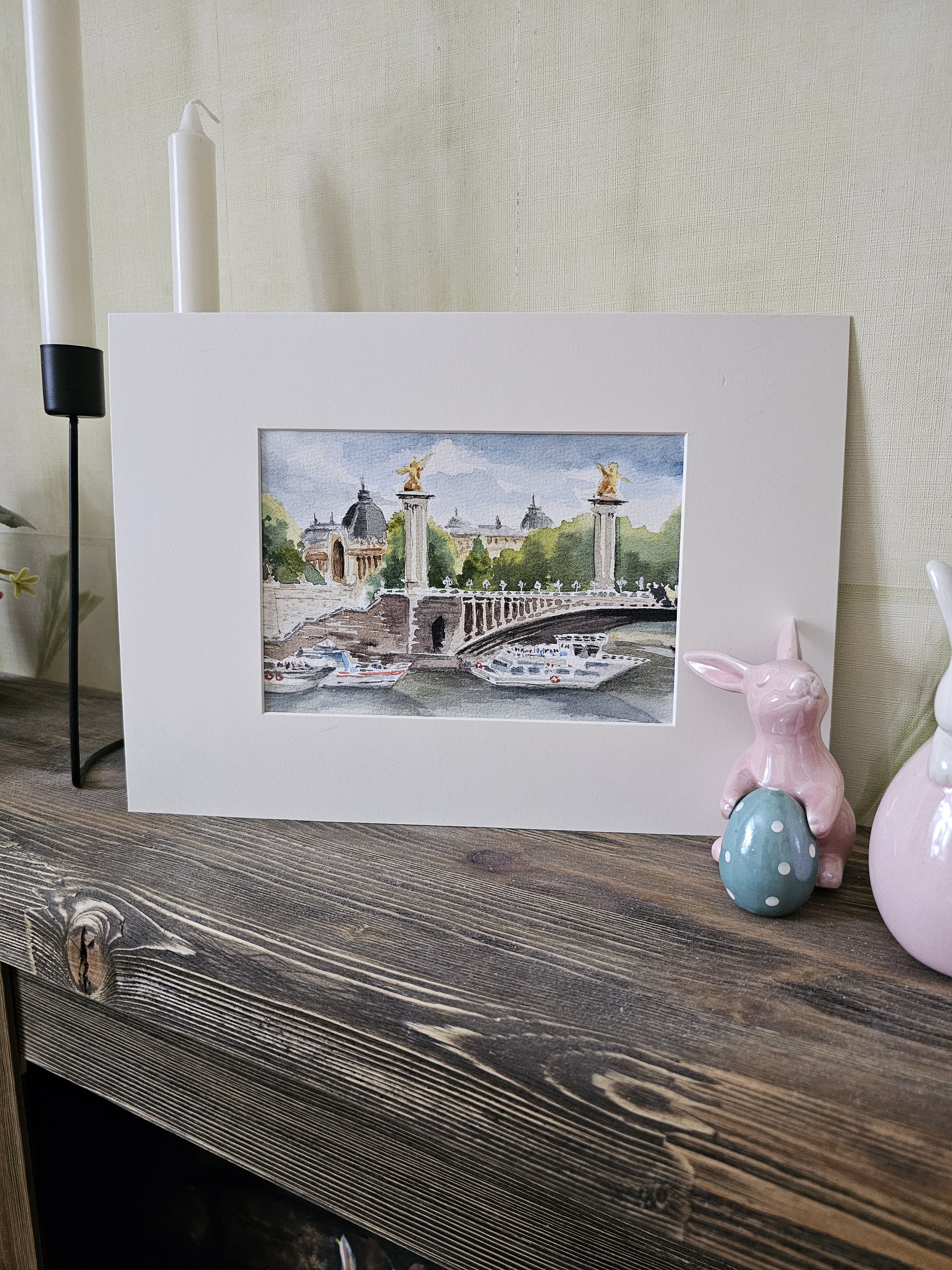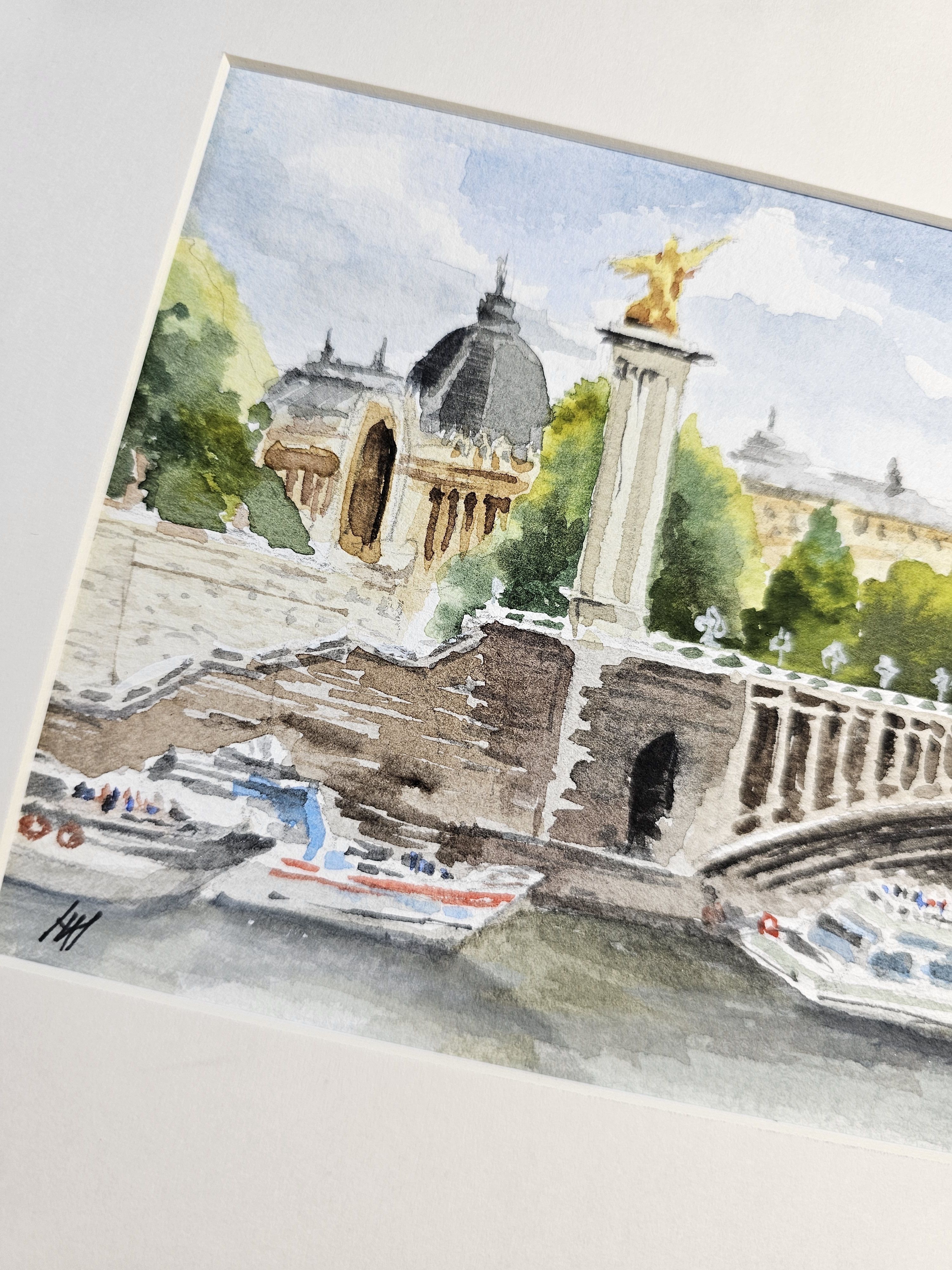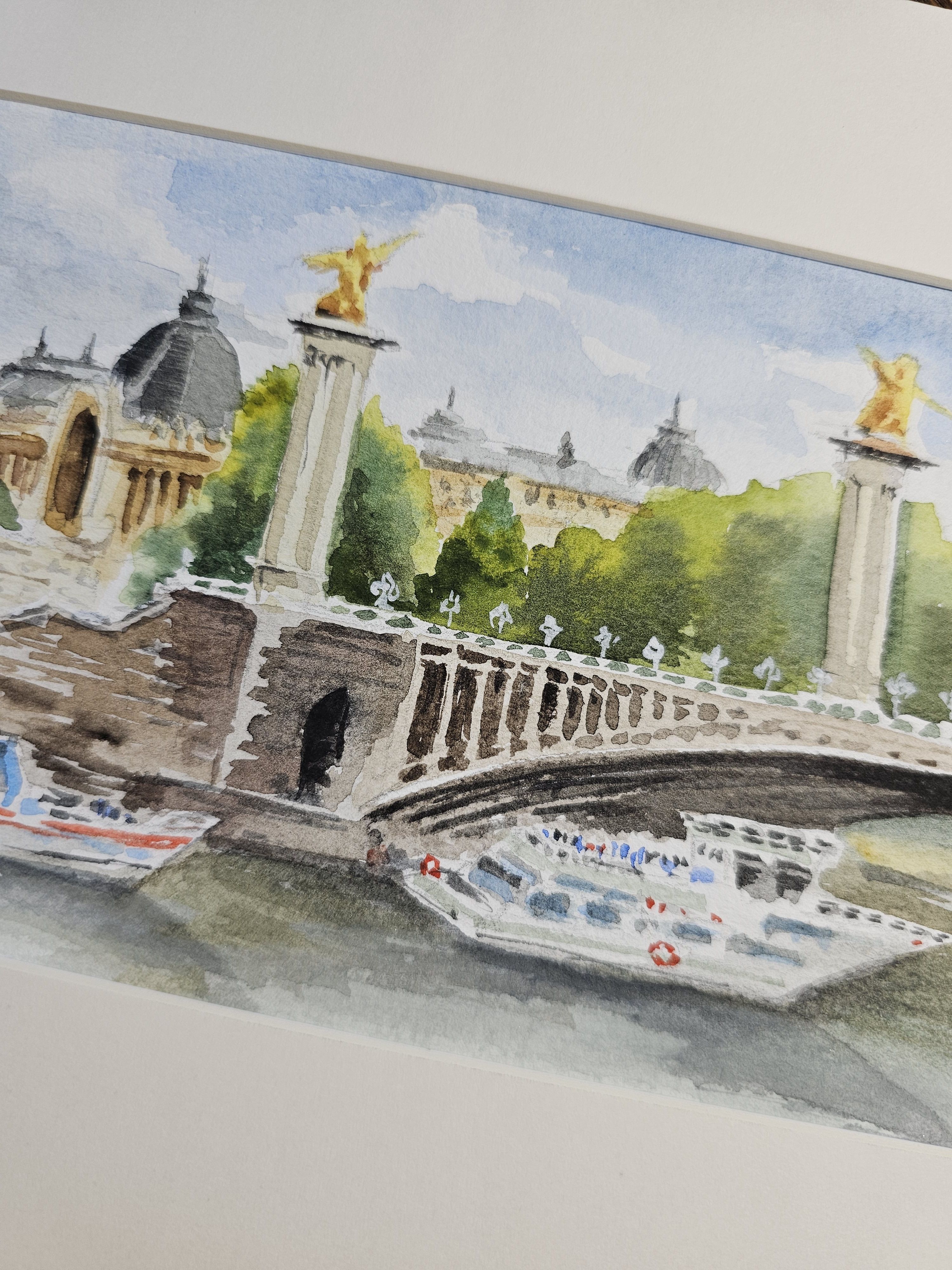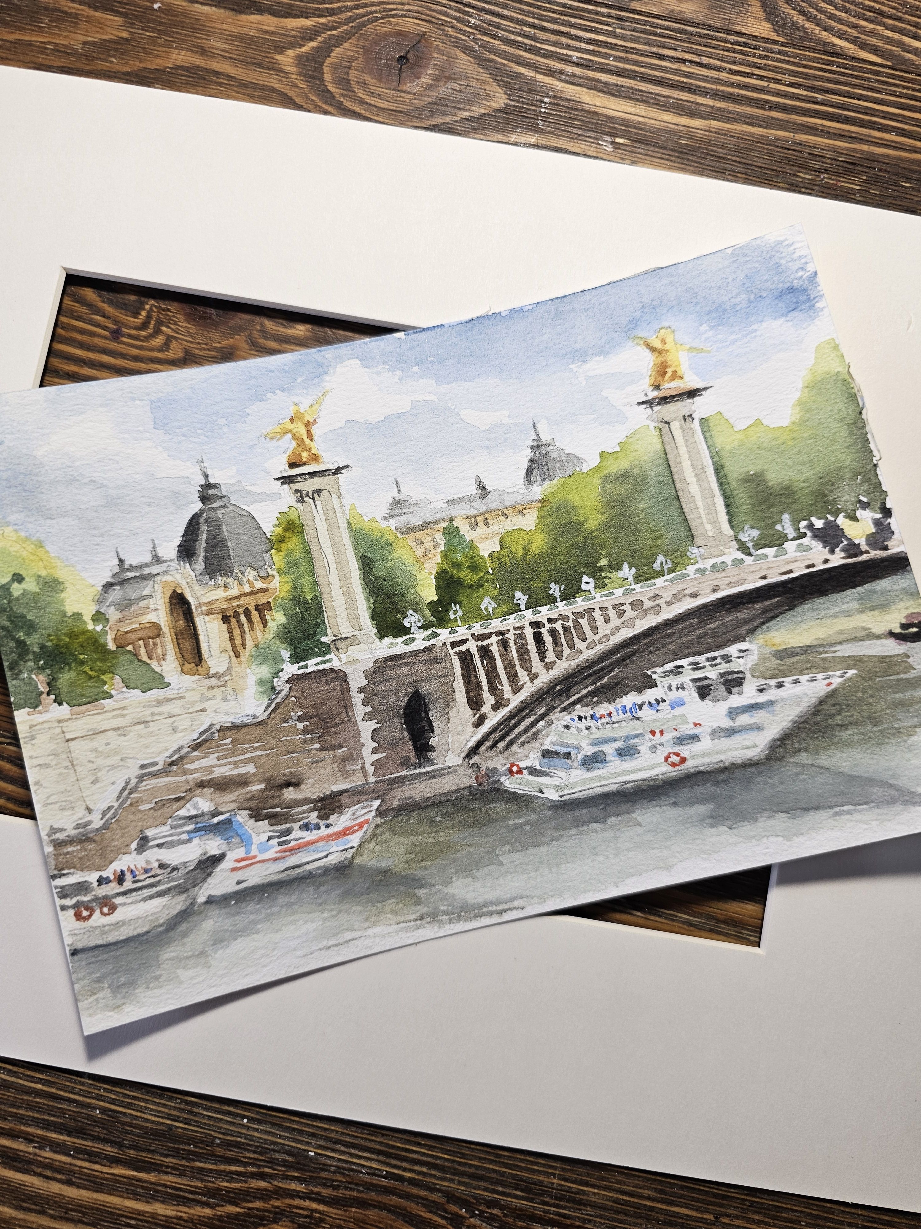 Нам представлена акварельная картина, изображающая известный мост Парижа - Мост Александра III. На переднем плане находятся лодки или суда, плывущие по реке. Вдали видны здания с куполами и деревьями. Композиция выполнена в мягких, пастельных тонах и оформлена в светлое паспарту и готова к размещению в раме 21*30 см.
