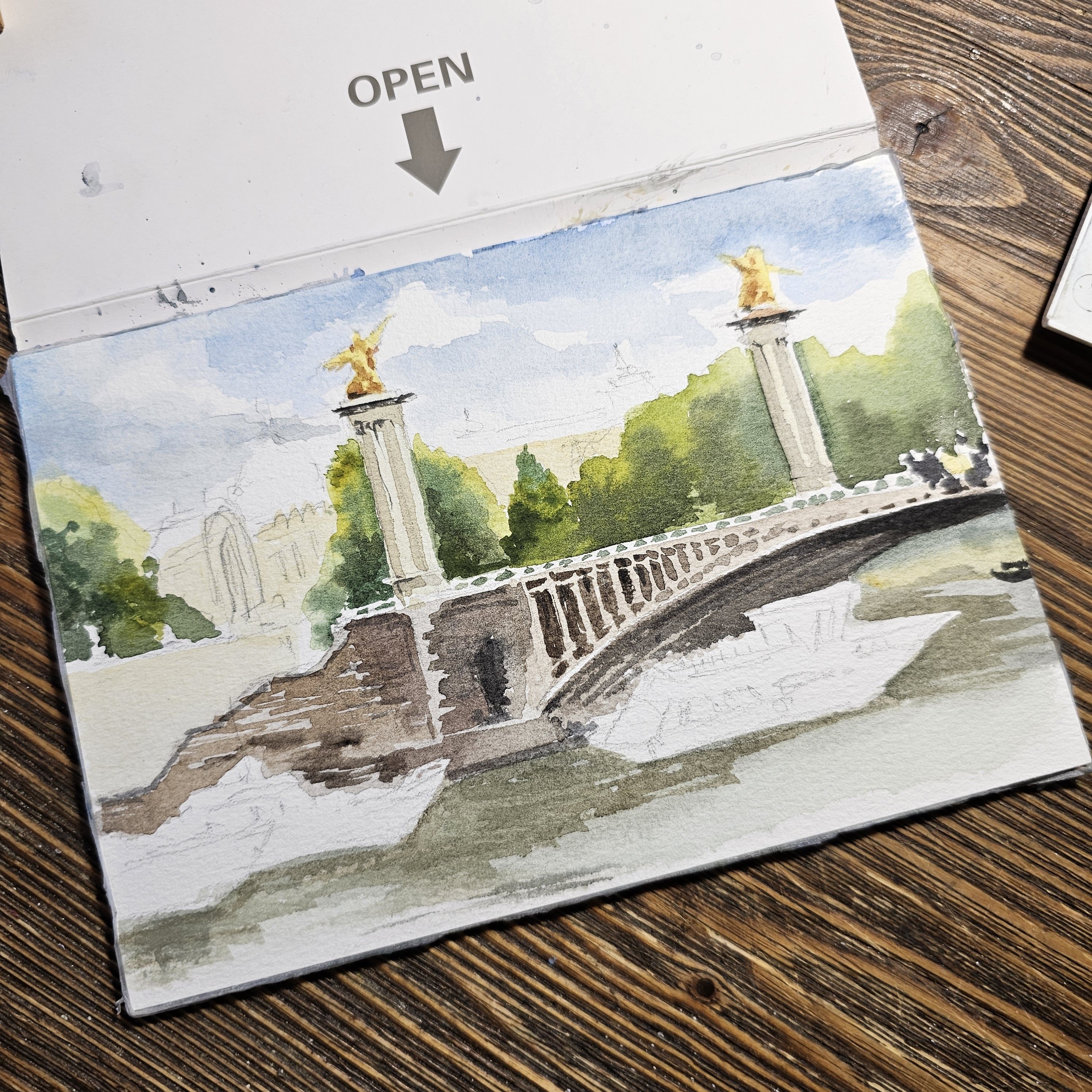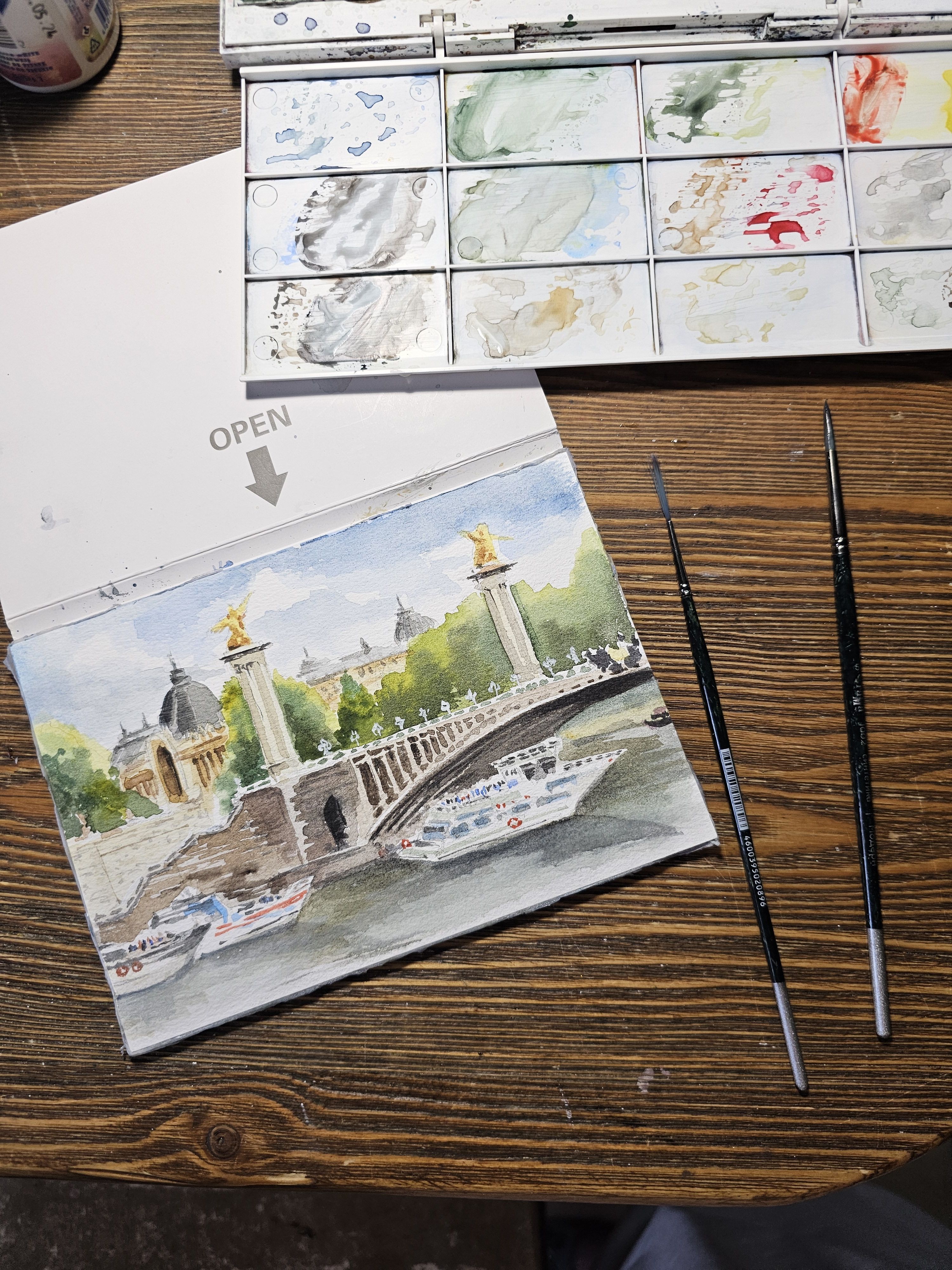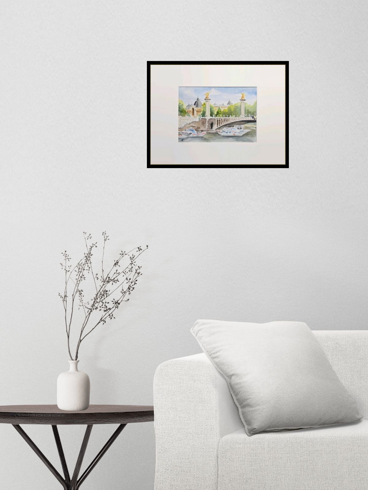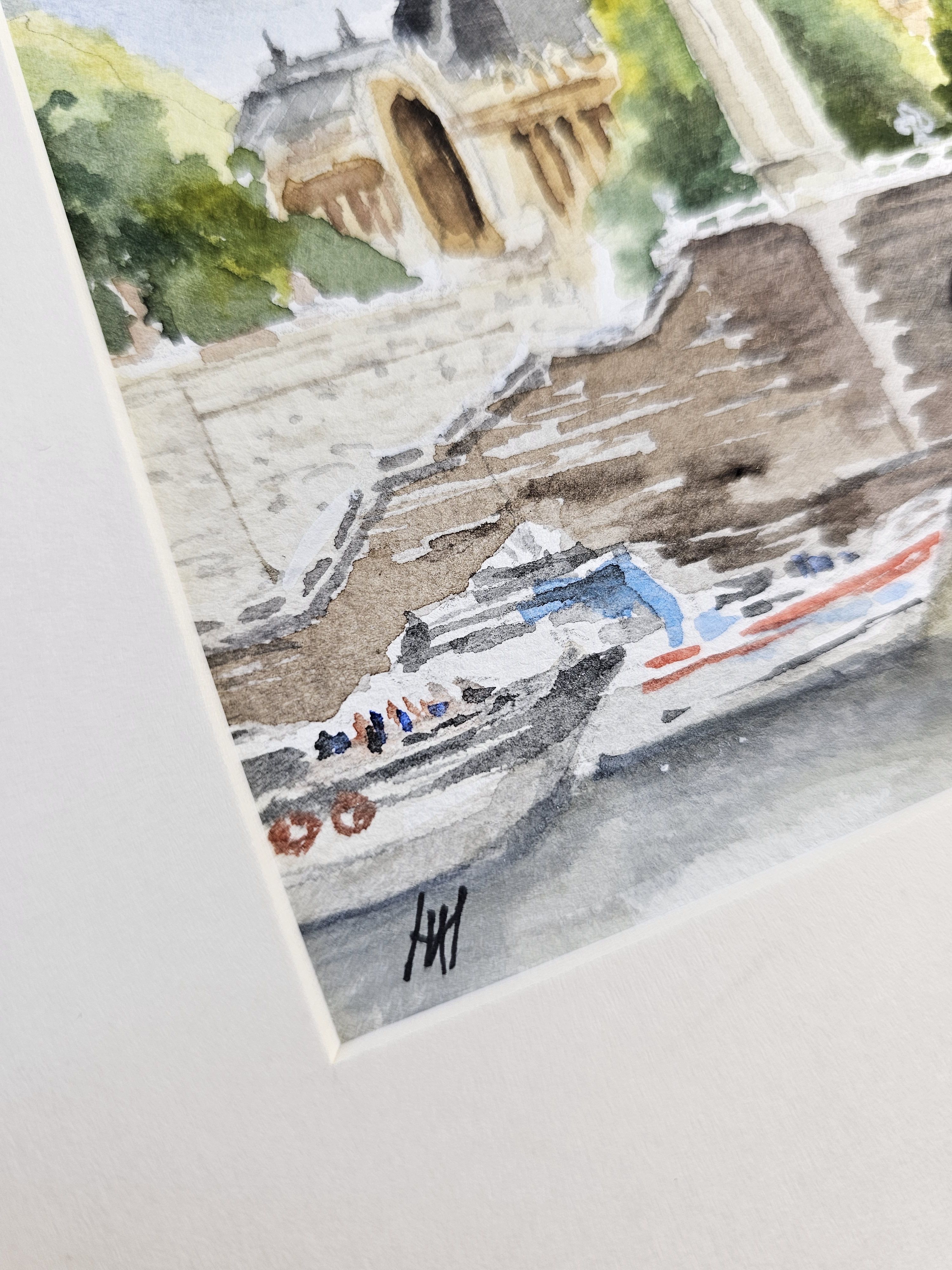 Нам представлена акварельная картина, изображающая известный мост Парижа - Мост Александра III. На переднем плане находятся лодки или суда, плывущие по реке. Вдали видны здания с куполами и деревьями. Композиция выполнена в мягких, пастельных тонах и оформлена в светлое паспарту и готова к размещению в раме 21*30 см.