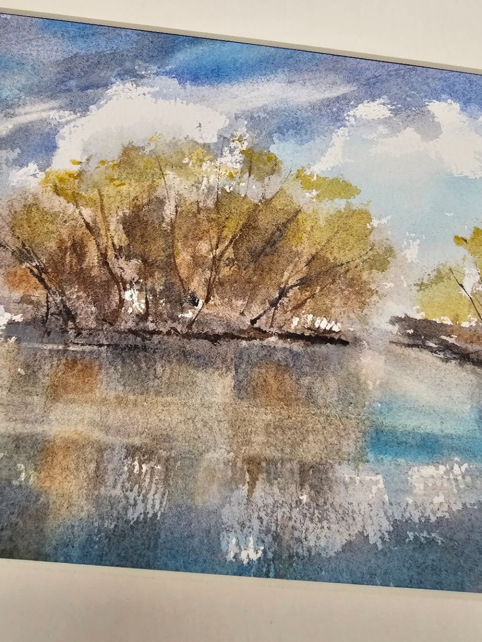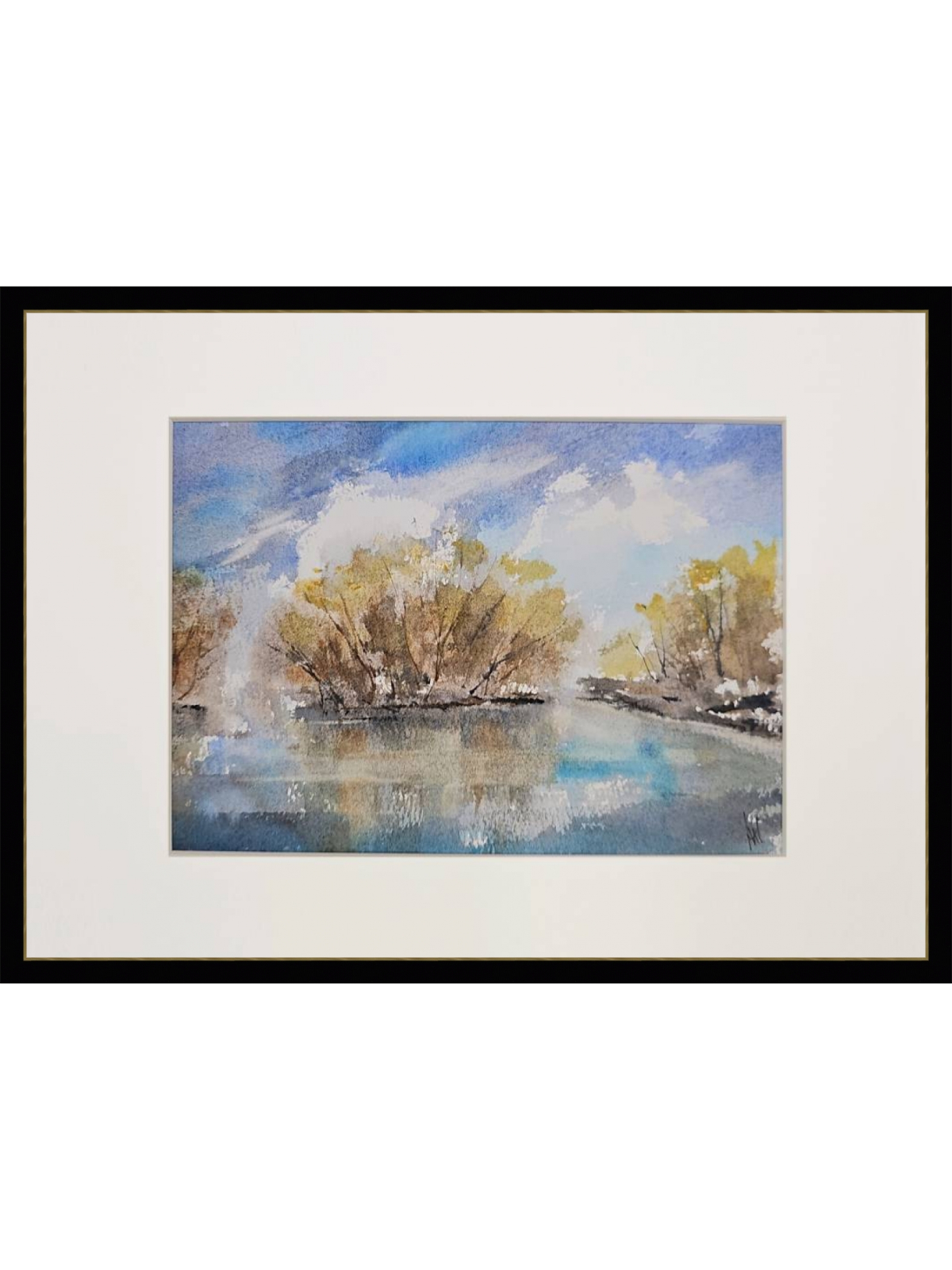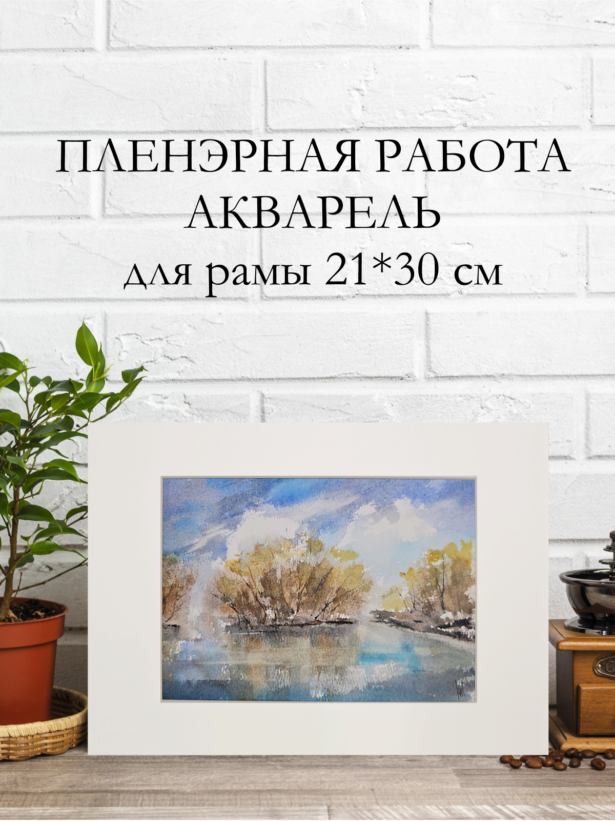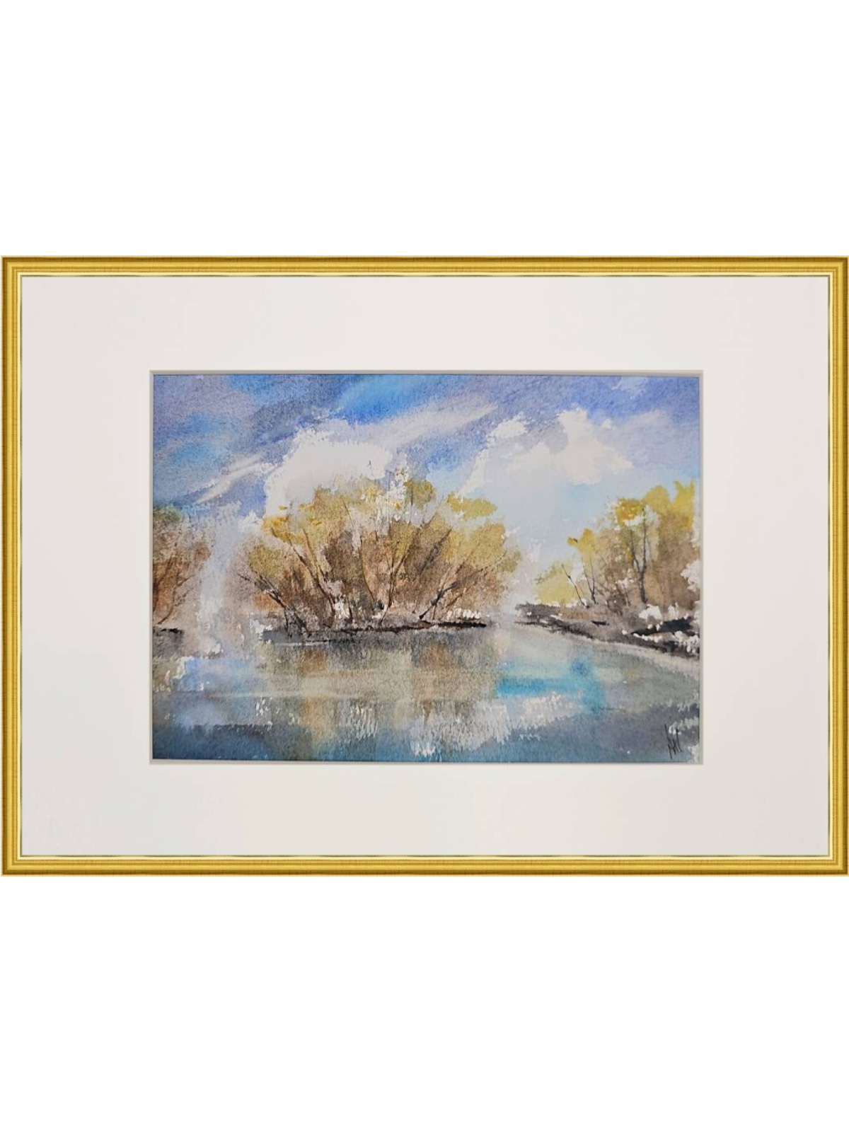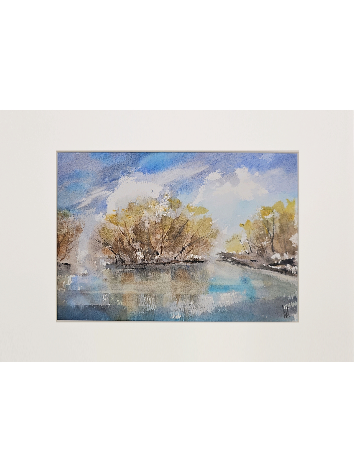 Нам представлена акварельная картина с пейзажем. В центре композиции изображены деревья с золотисто-коричневыми листьями, растущие вдоль берега водоема. Вода отражает небо и деревья, создавая эффект зеркальной поверхности. Небо голубое с белыми облаками, что придаёт картине светлое и спокойное настроение. Картина оформлена в паспарту, что подчёркивает её художественную ценность. Картина готова к размещению в раме 21*30 см.