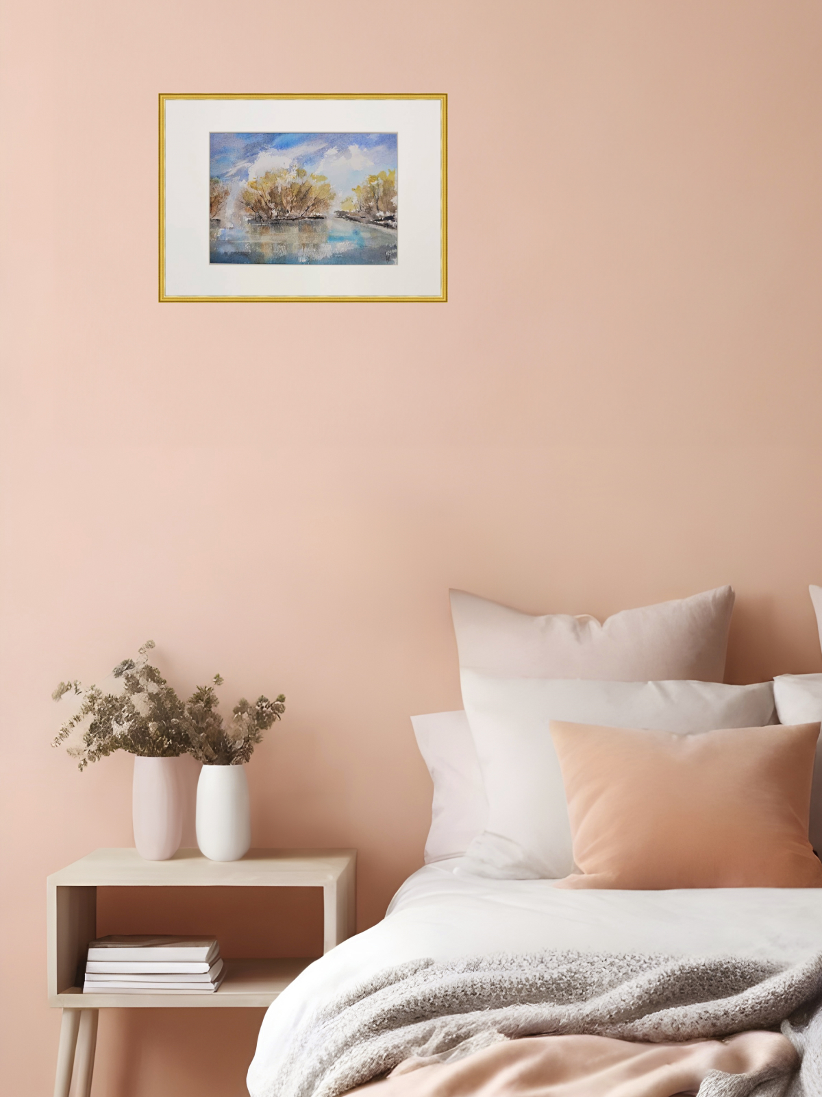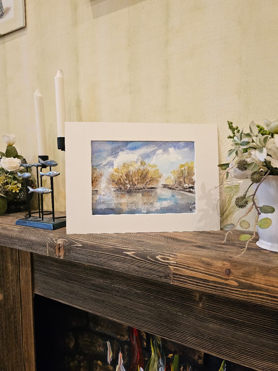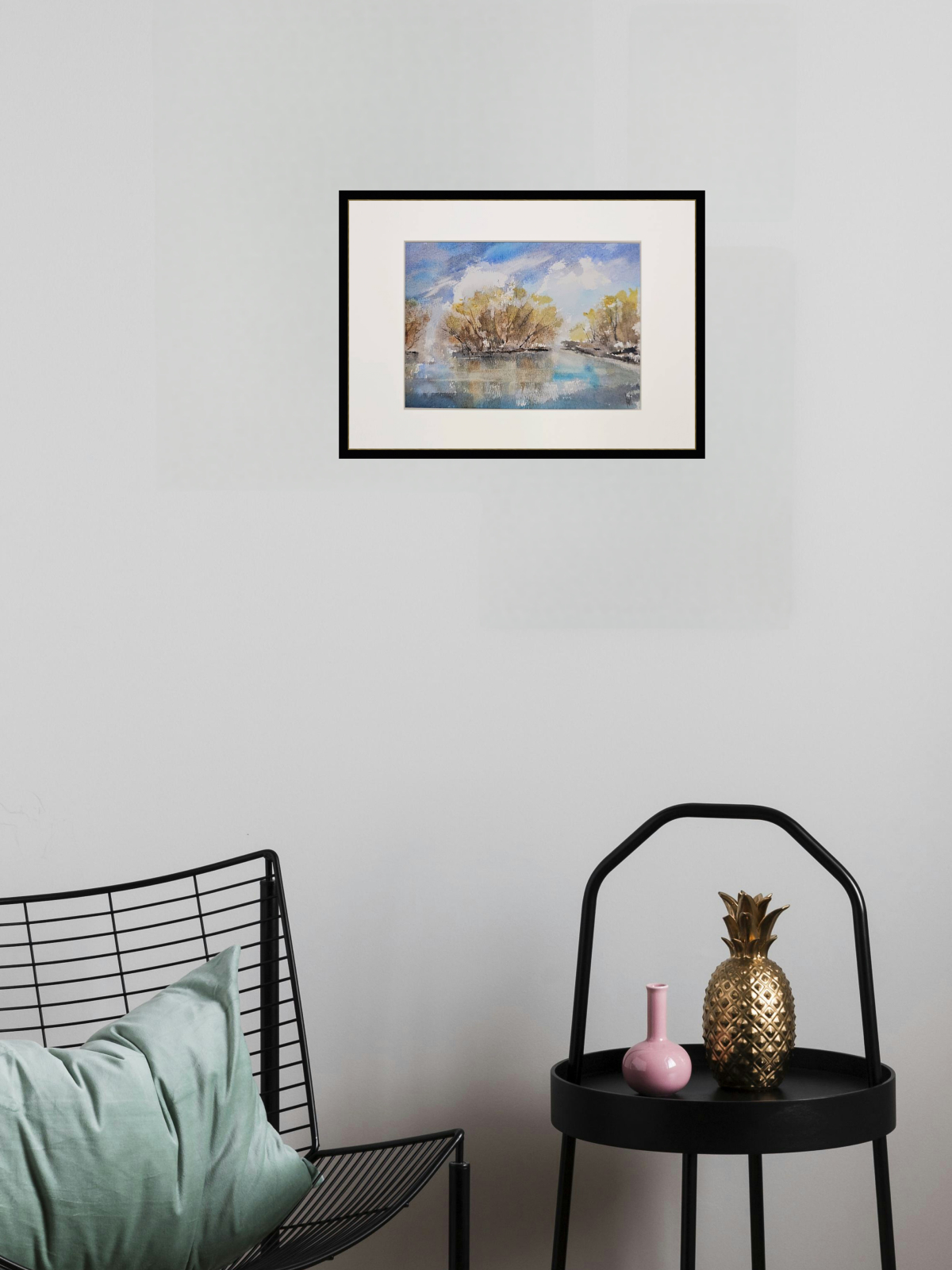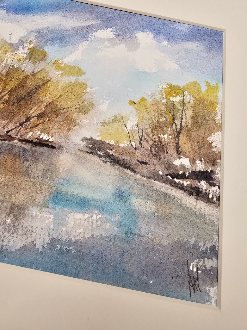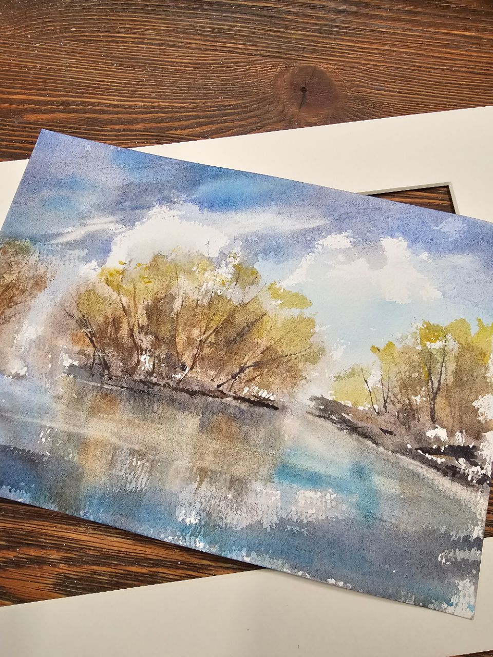 Нам представлена акварельная картина с пейзажем. В центре композиции изображены деревья с золотисто-коричневыми листьями, растущие вдоль берега водоема. Вода отражает небо и деревья, создавая эффект зеркальной поверхности. Небо голубое с белыми облаками, что придаёт картине светлое и спокойное настроение. Картина оформлена в паспарту, что подчёркивает её художественную ценность. Картина готова к размещению в раме 21*30 см.