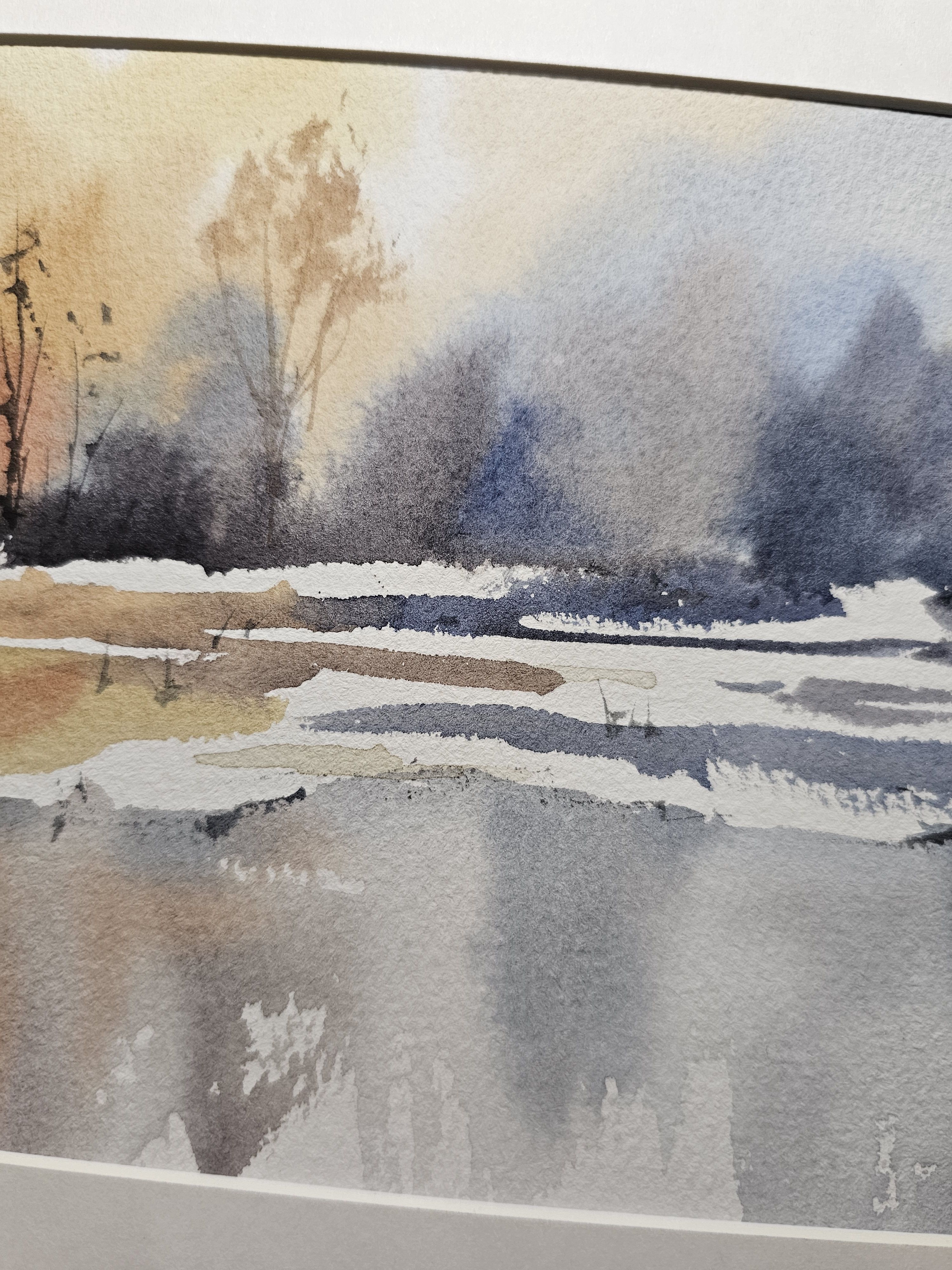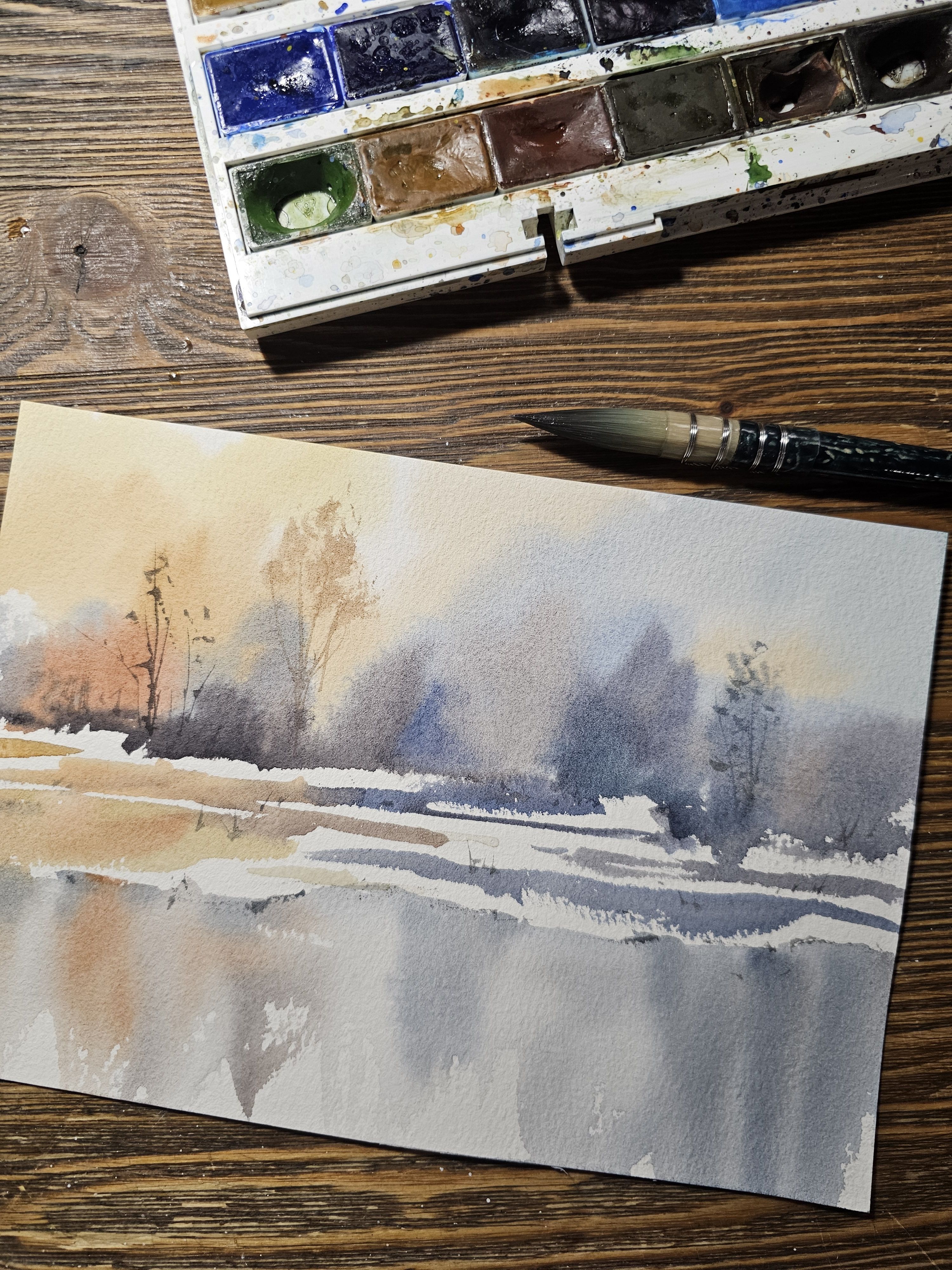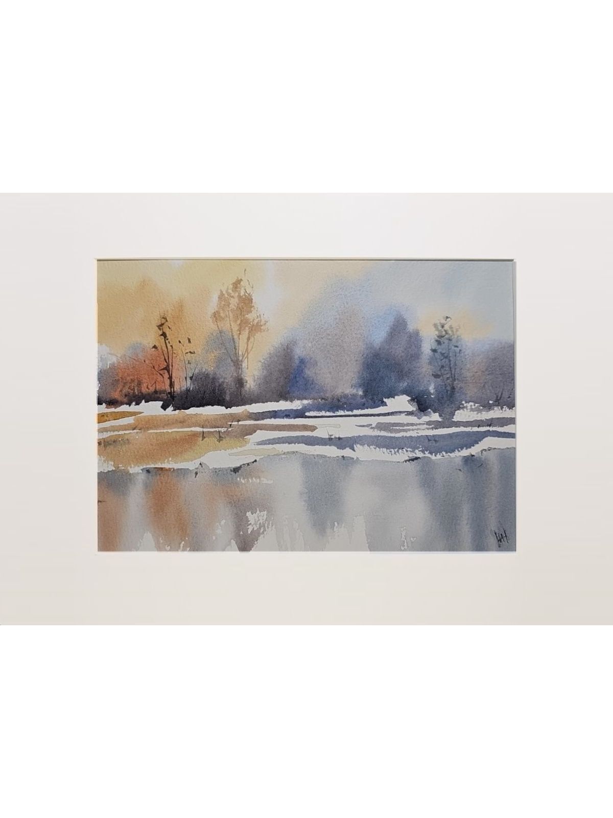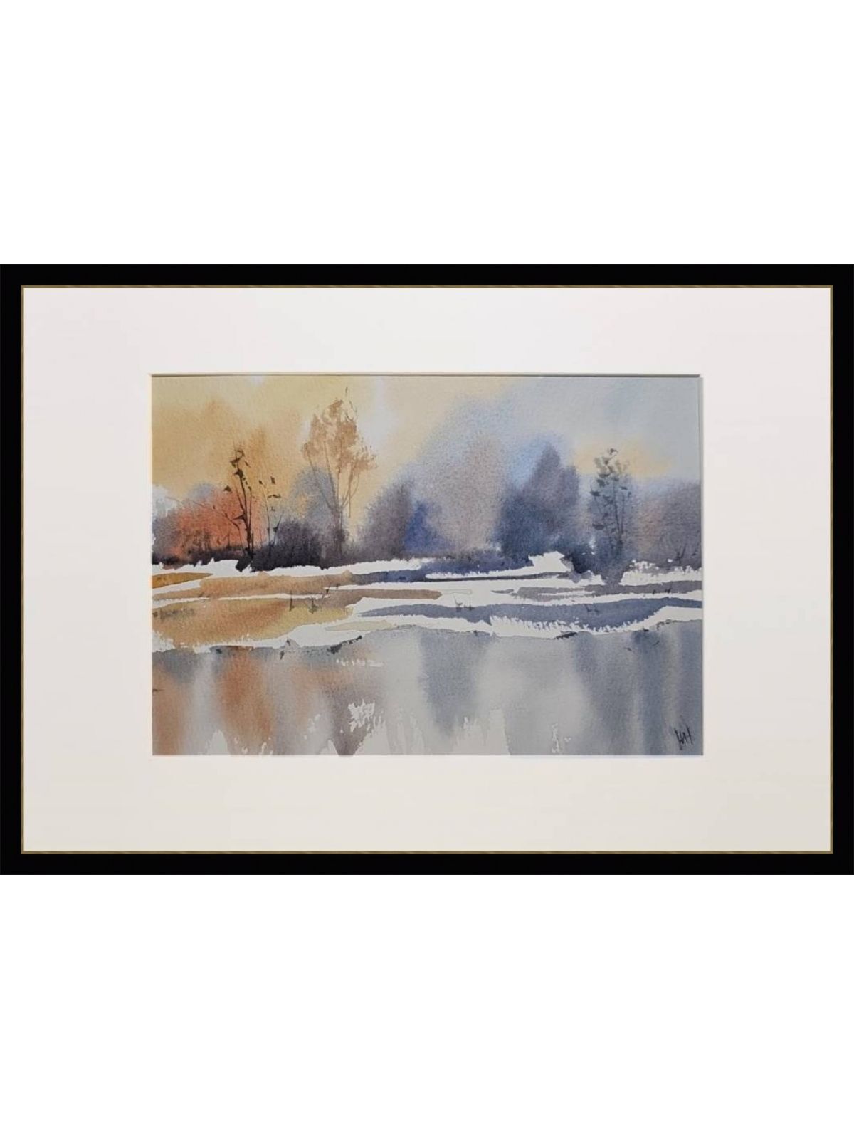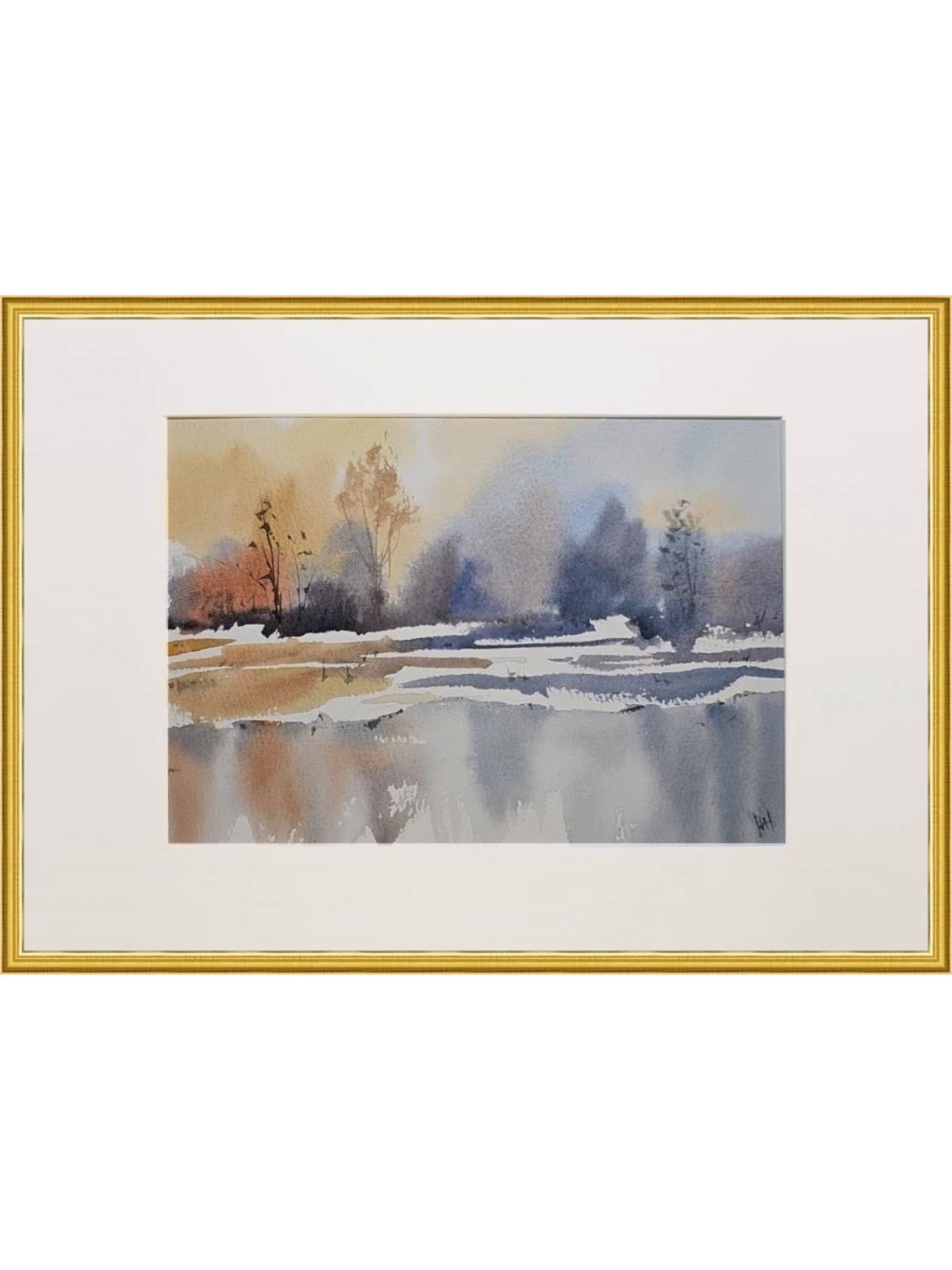 Нам представлена акварельная картина с пейзажем. Фоновая часть выполнена в мягких, пастельных тонах, создавая атмосферу раннего утра. На переднем плане можно увидеть водоем с отражениями деревьев и неба. В центре картины изображены деревья без листвы, что может указывать на позднюю осень. Иней покрывает землю и ветви деревьев создают ощущение холода. Картина выполнена в мягкой манере с плавными переходами цвета.