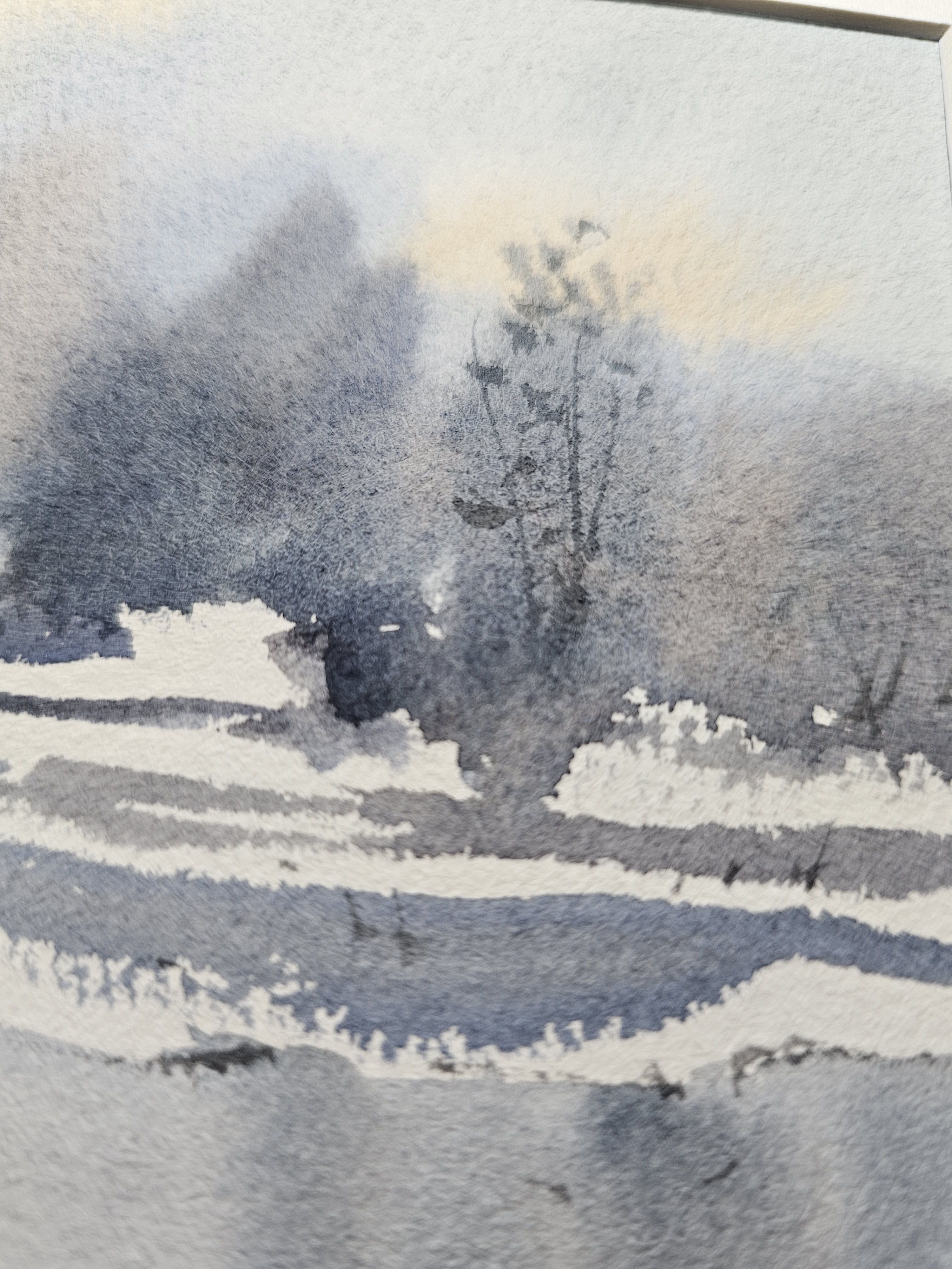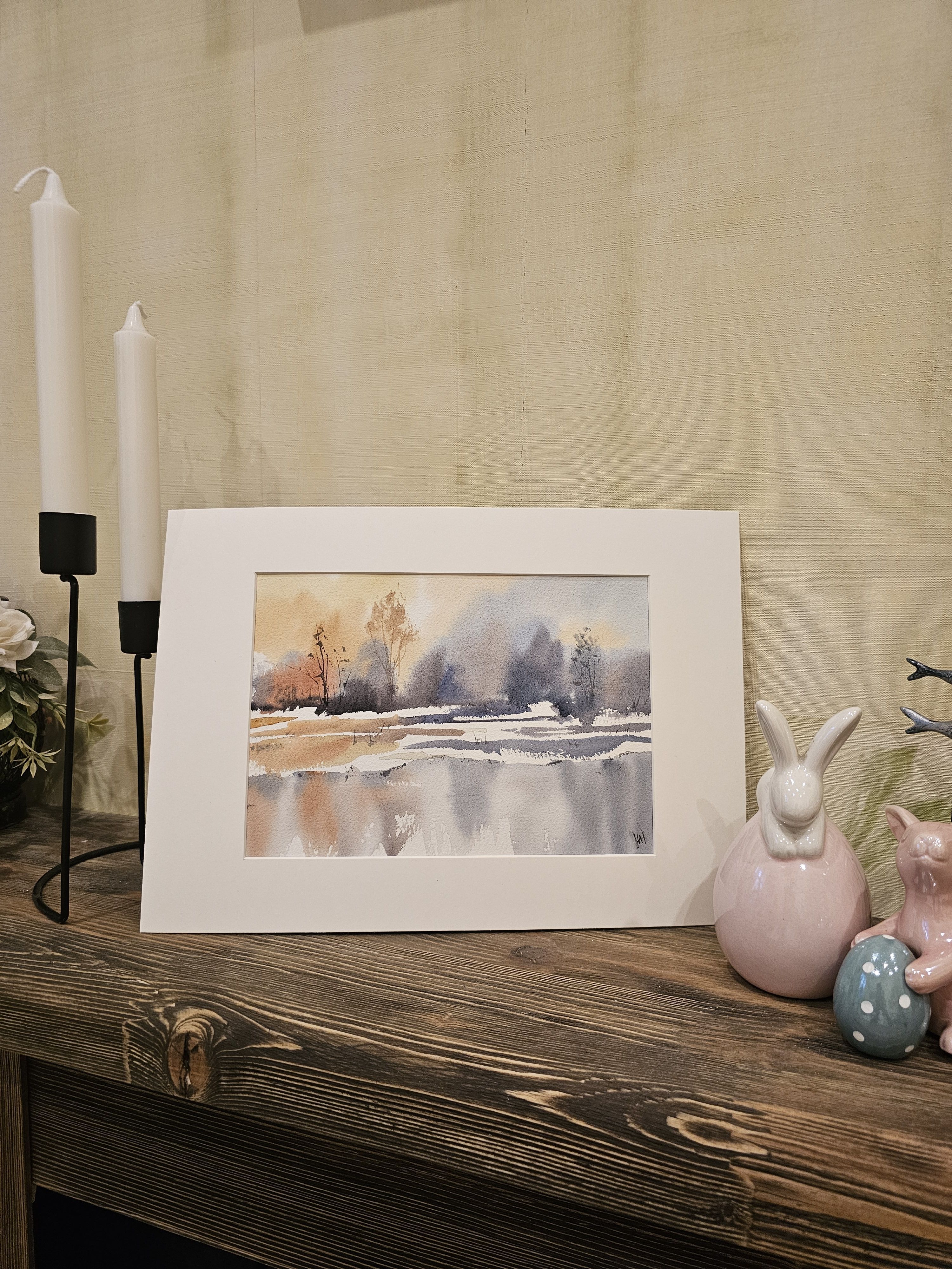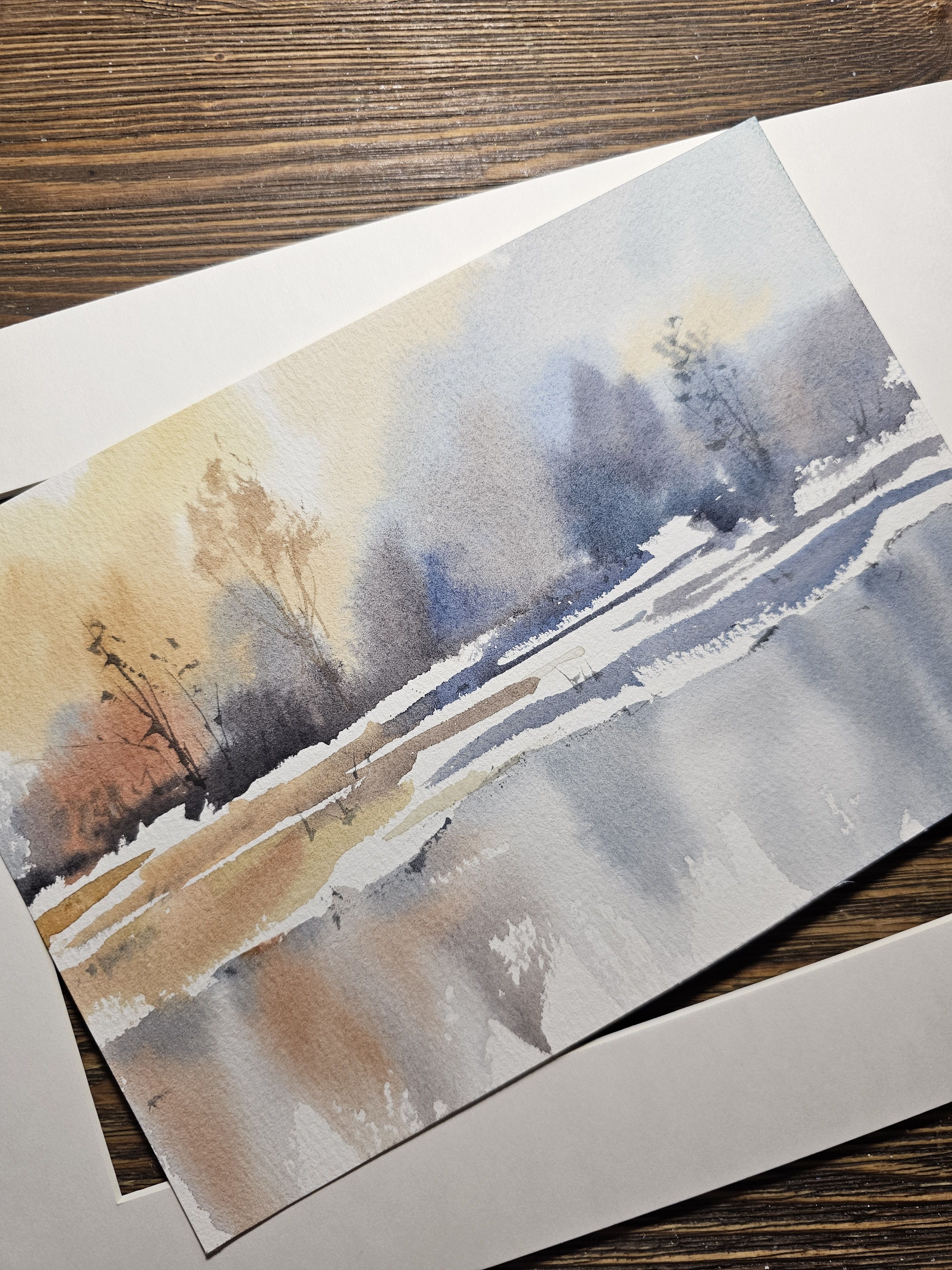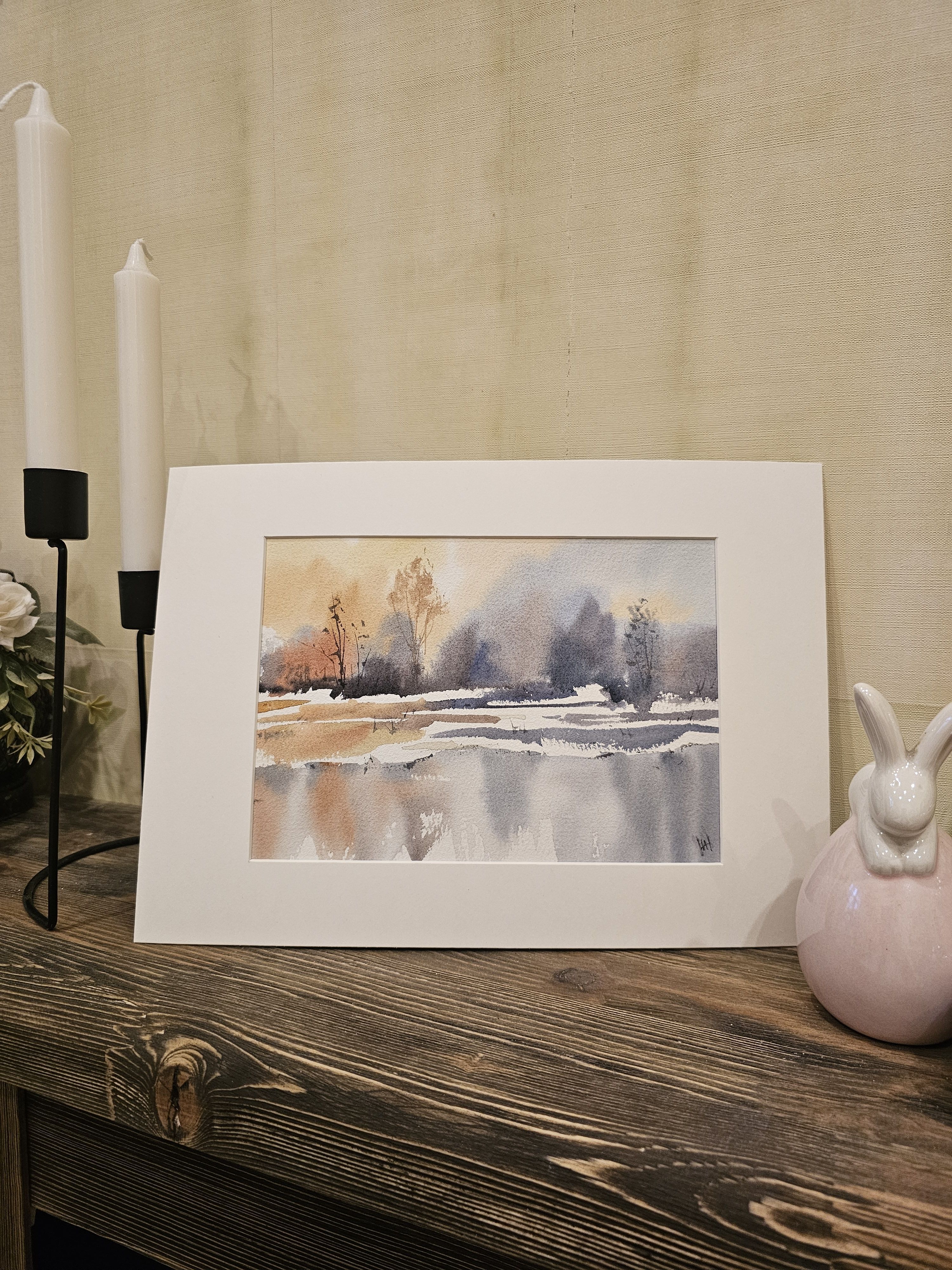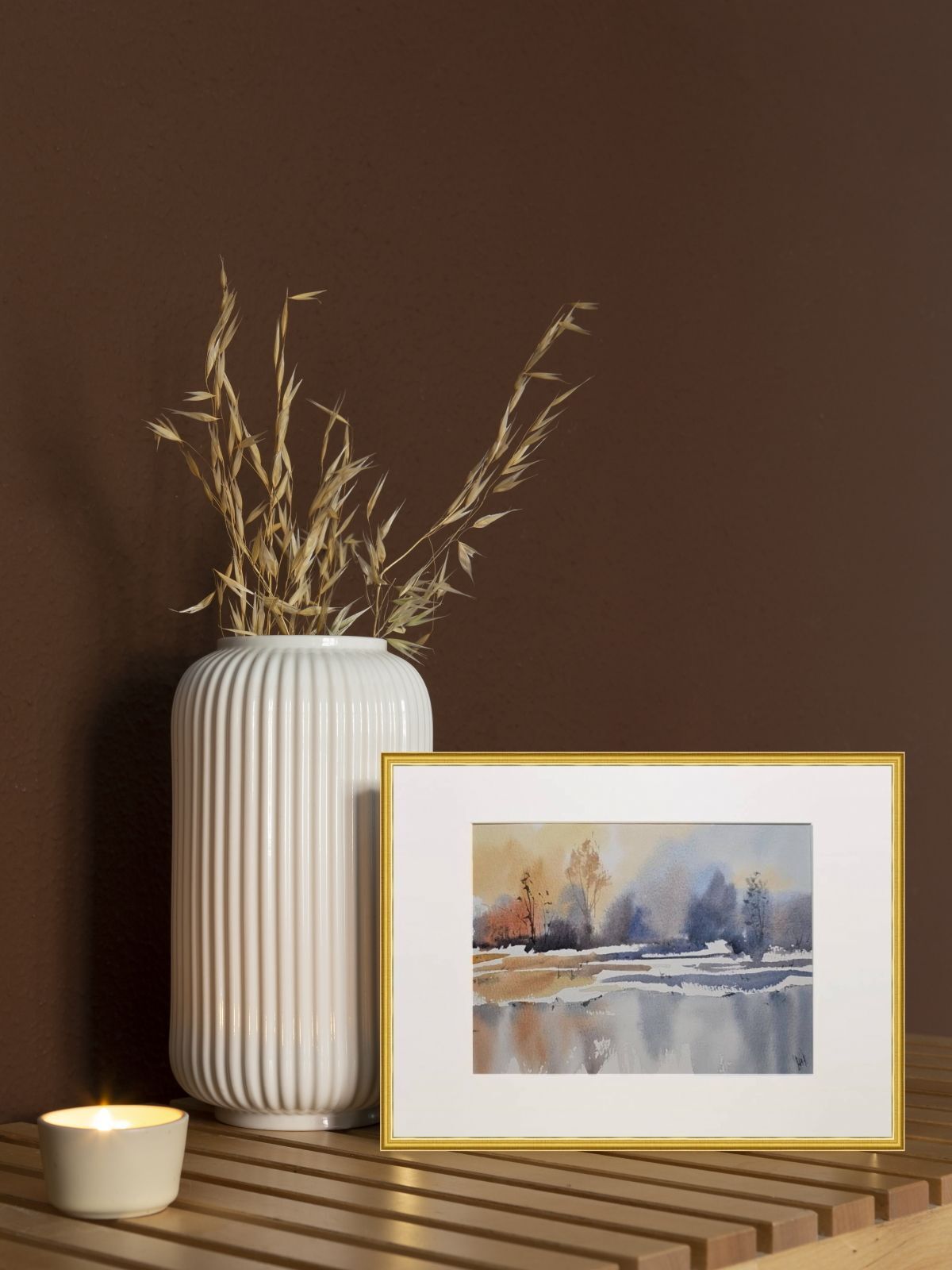 Нам представлена акварельная картина с пейзажем. Фоновая часть выполнена в мягких, пастельных тонах, создавая атмосферу раннего утра. На переднем плане можно увидеть водоем с отражениями деревьев и неба. В центре картины изображены деревья без листвы, что может указывать на позднюю осень. Иней покрывает землю и ветви деревьев создают ощущение холода. Картина выполнена в мягкой манере с плавными переходами цвета.