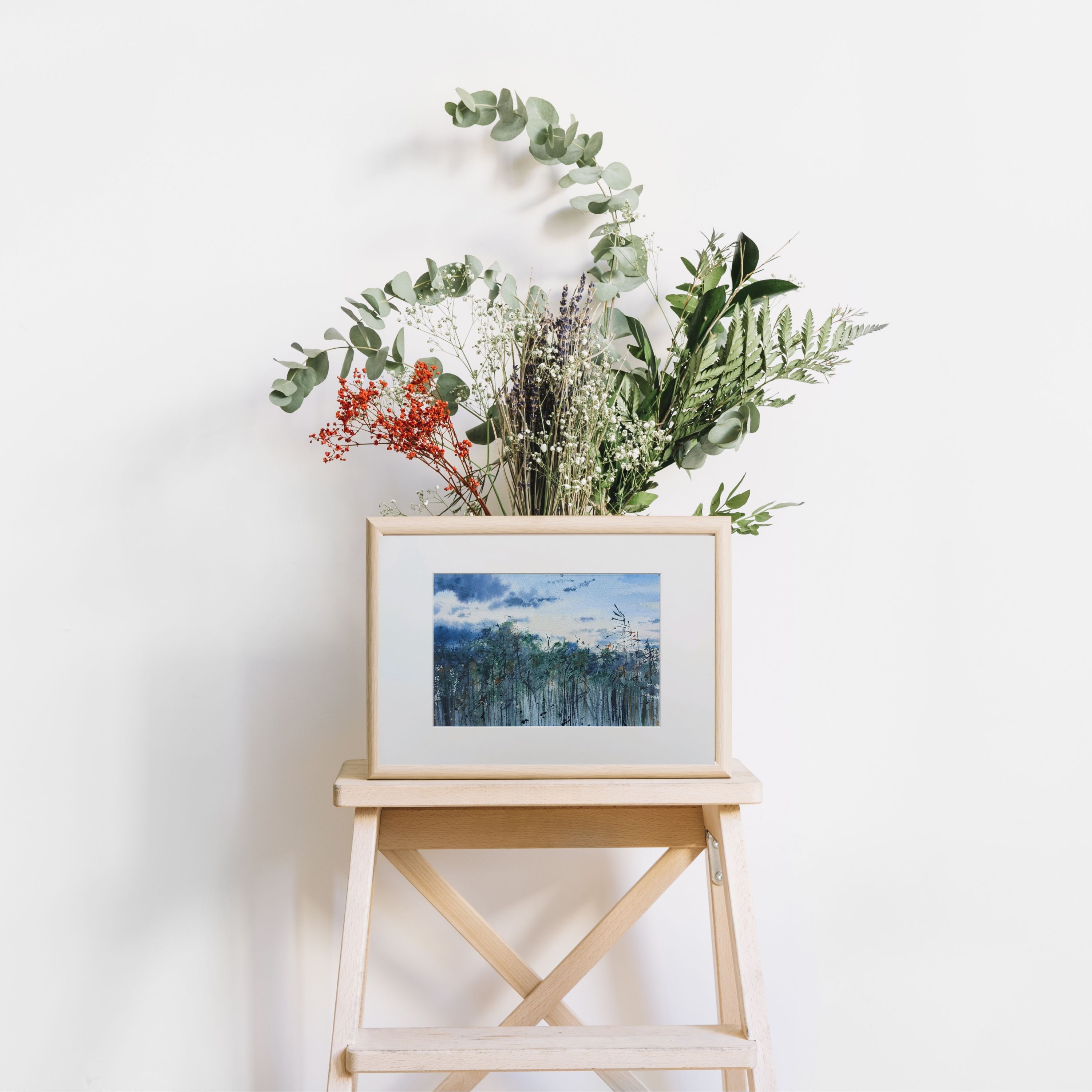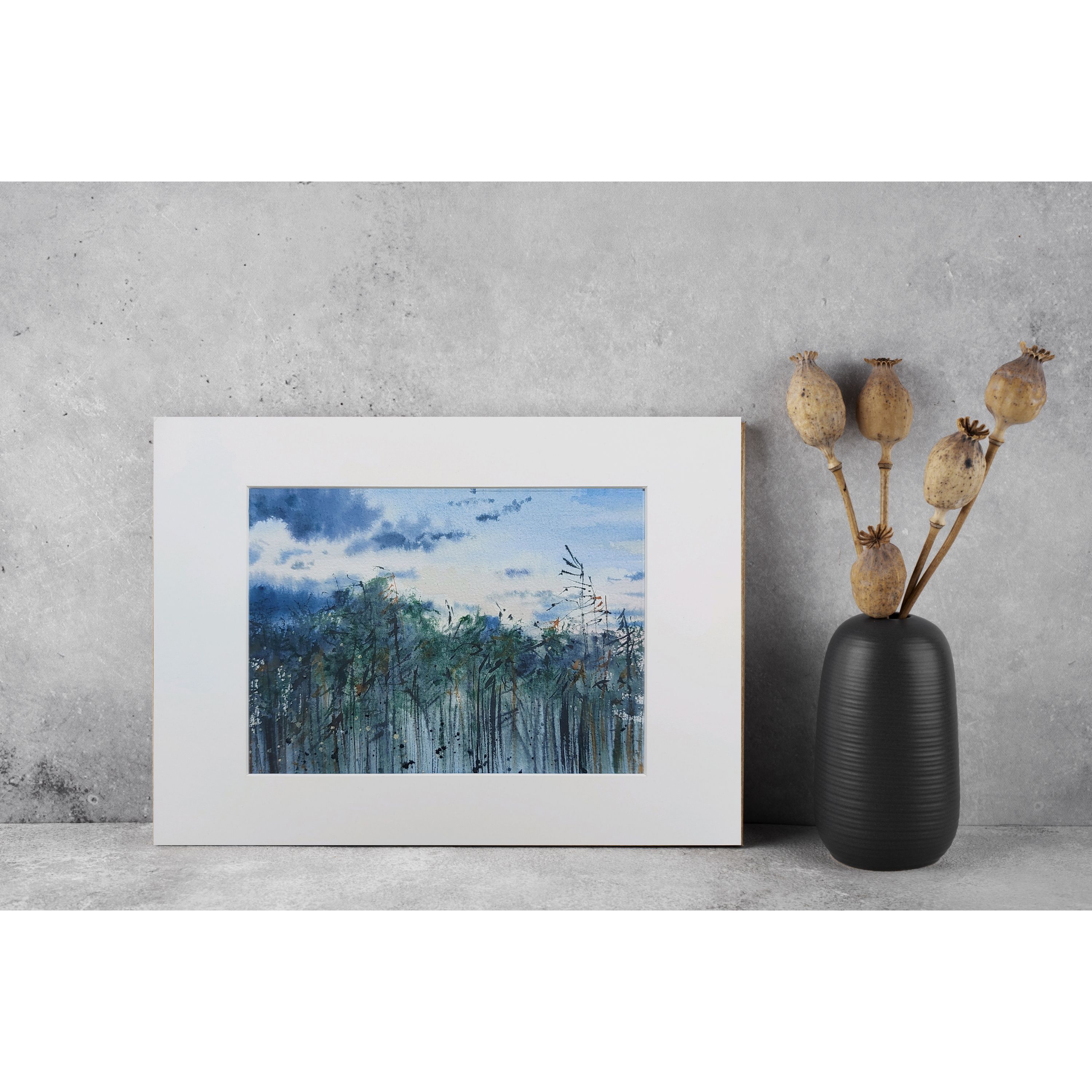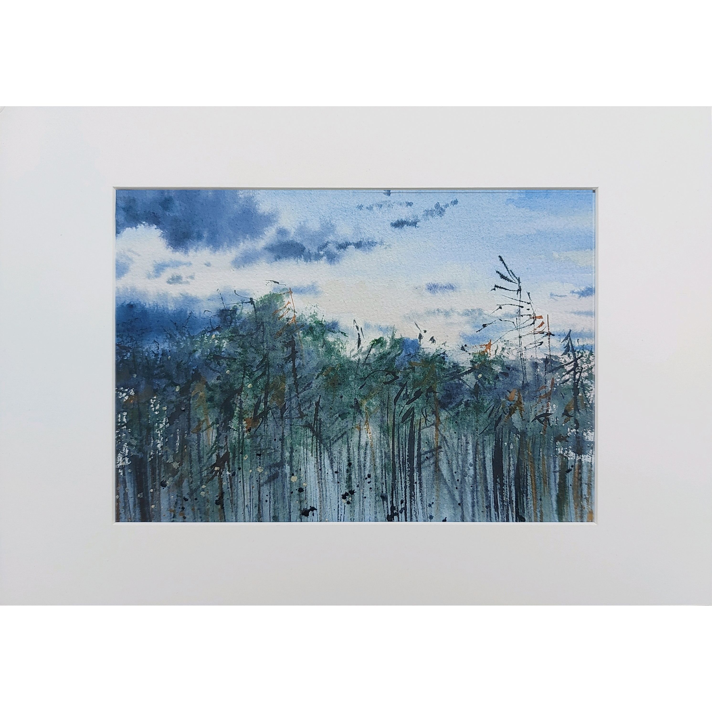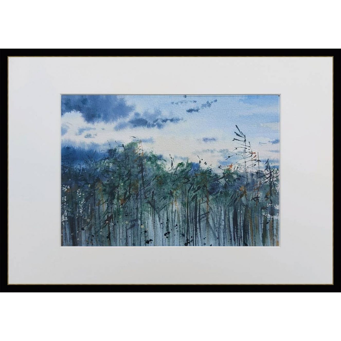На изображении представлена картина, выполненная акварелью. На ней изображён озерный пейзаж с густыми зарослями травы на переднем плане. Верхняя часть картины занята небом с облаками, окрашенными в голубые и белые оттенки. Картина оформлена в светлом паспарту.
