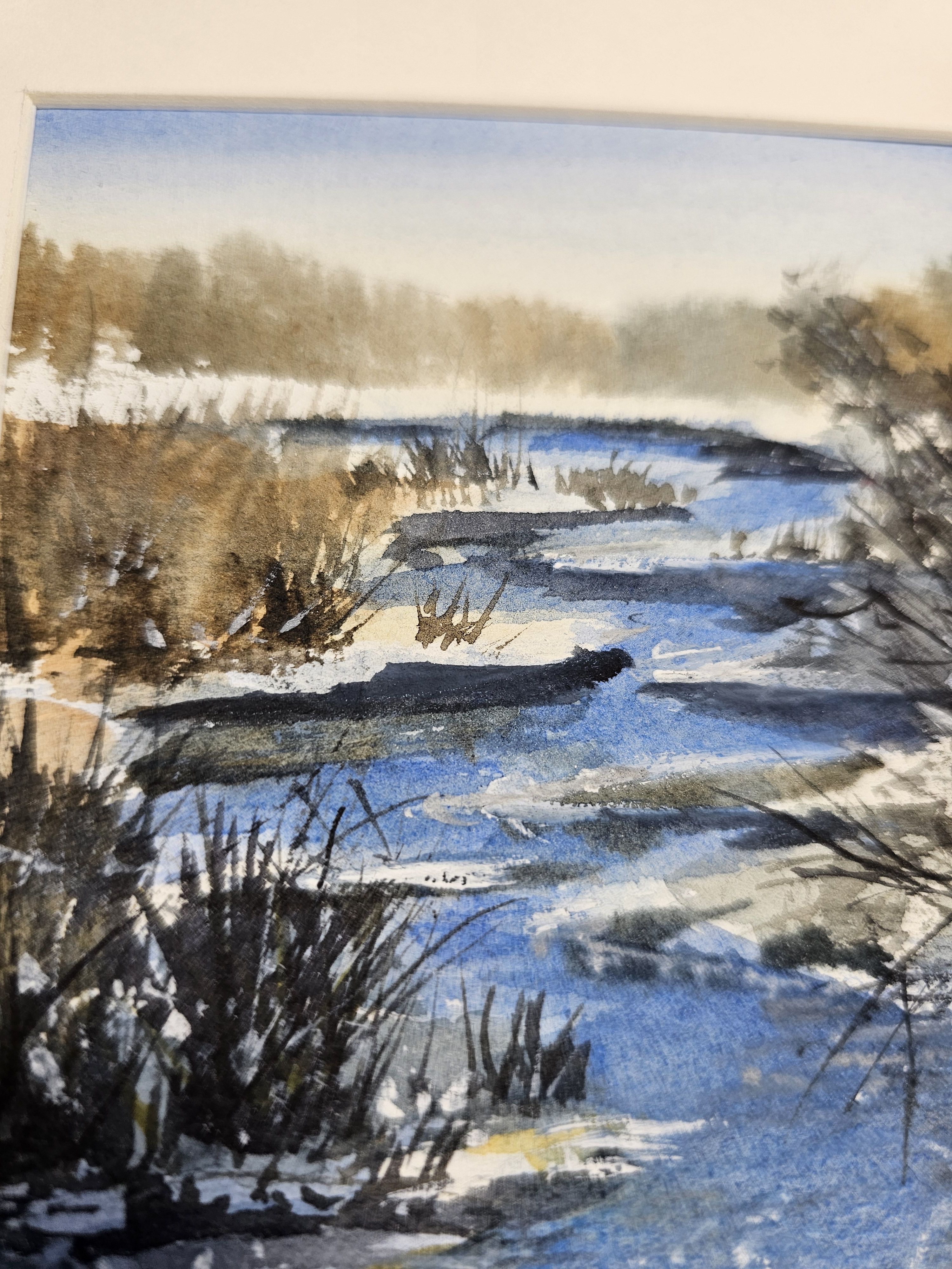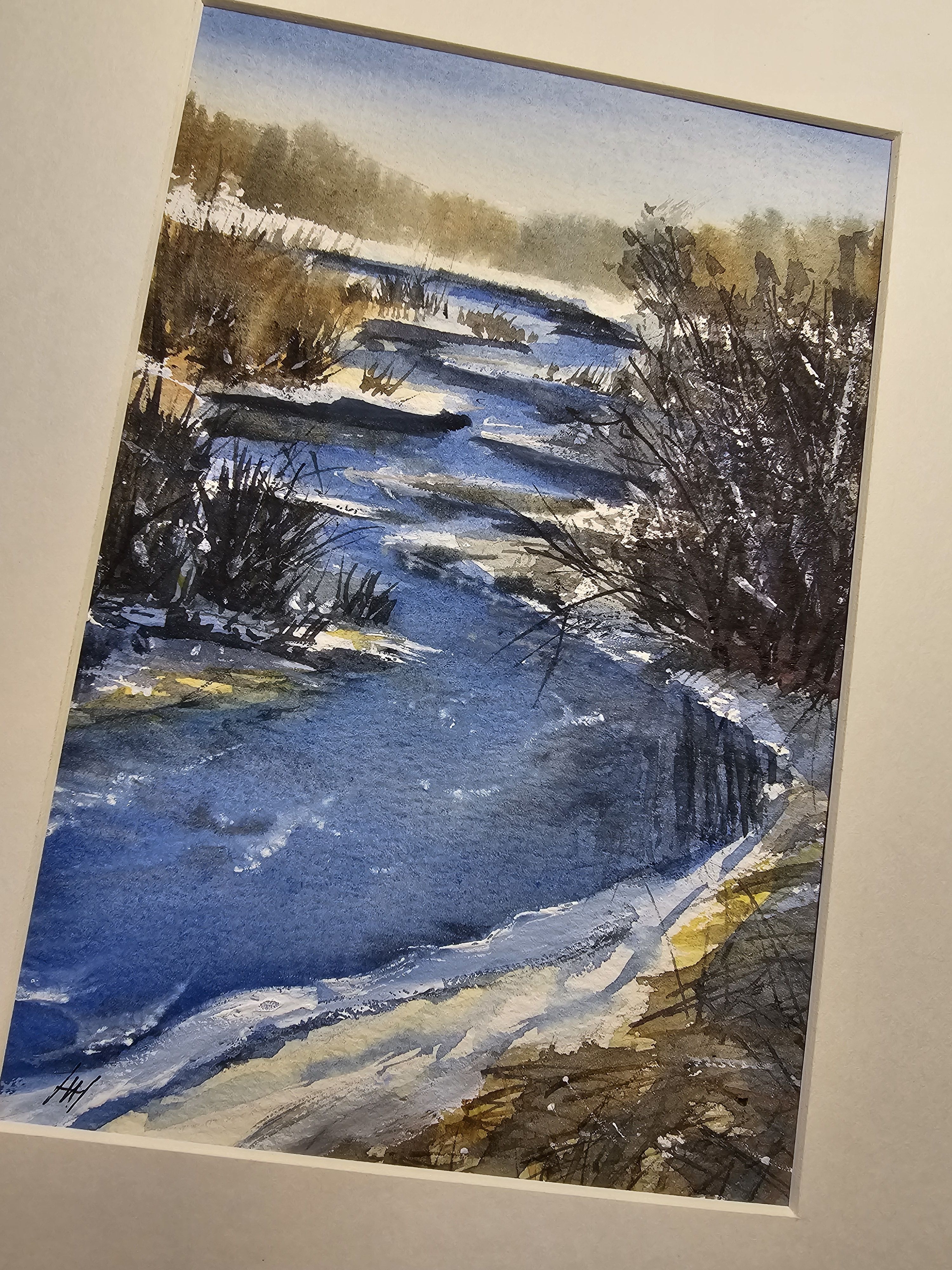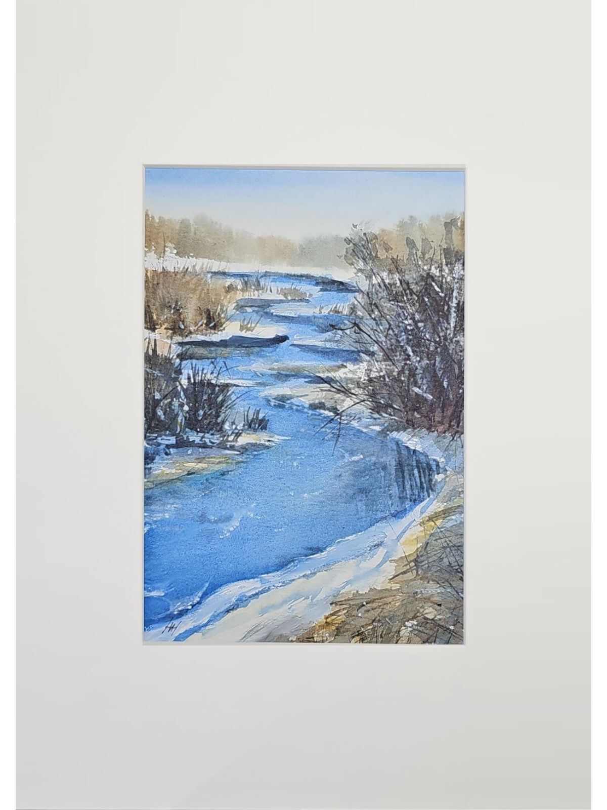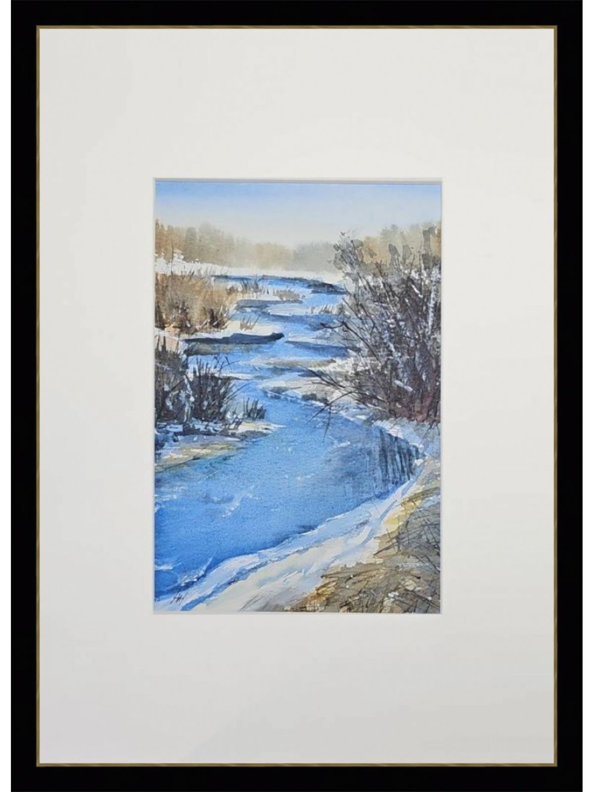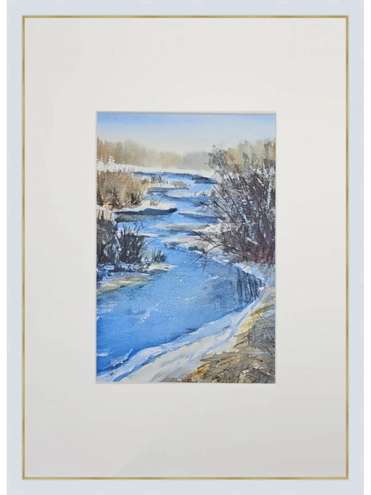 Нам представлена акварельная картина. Передан весенний пейзаж. В центре картины находится извилистая река, частично покрытая льдом и снегом. Вдоль берегов заметна еще зимняя растительность, кусты и деревья без листвы. Фон выполнен в светлых тонах, создавая ощущение холодного, но солнечного утра . Картина обладает спокойной и умиротворяющей атмосферой.