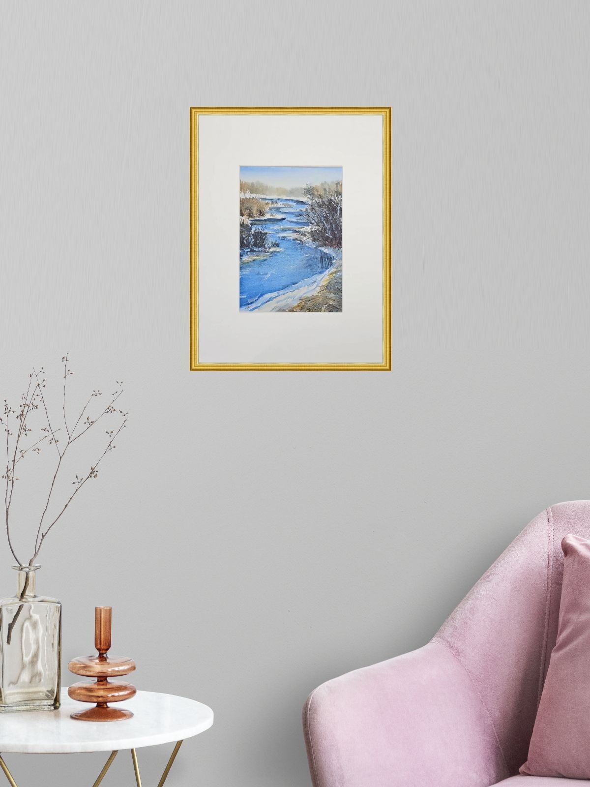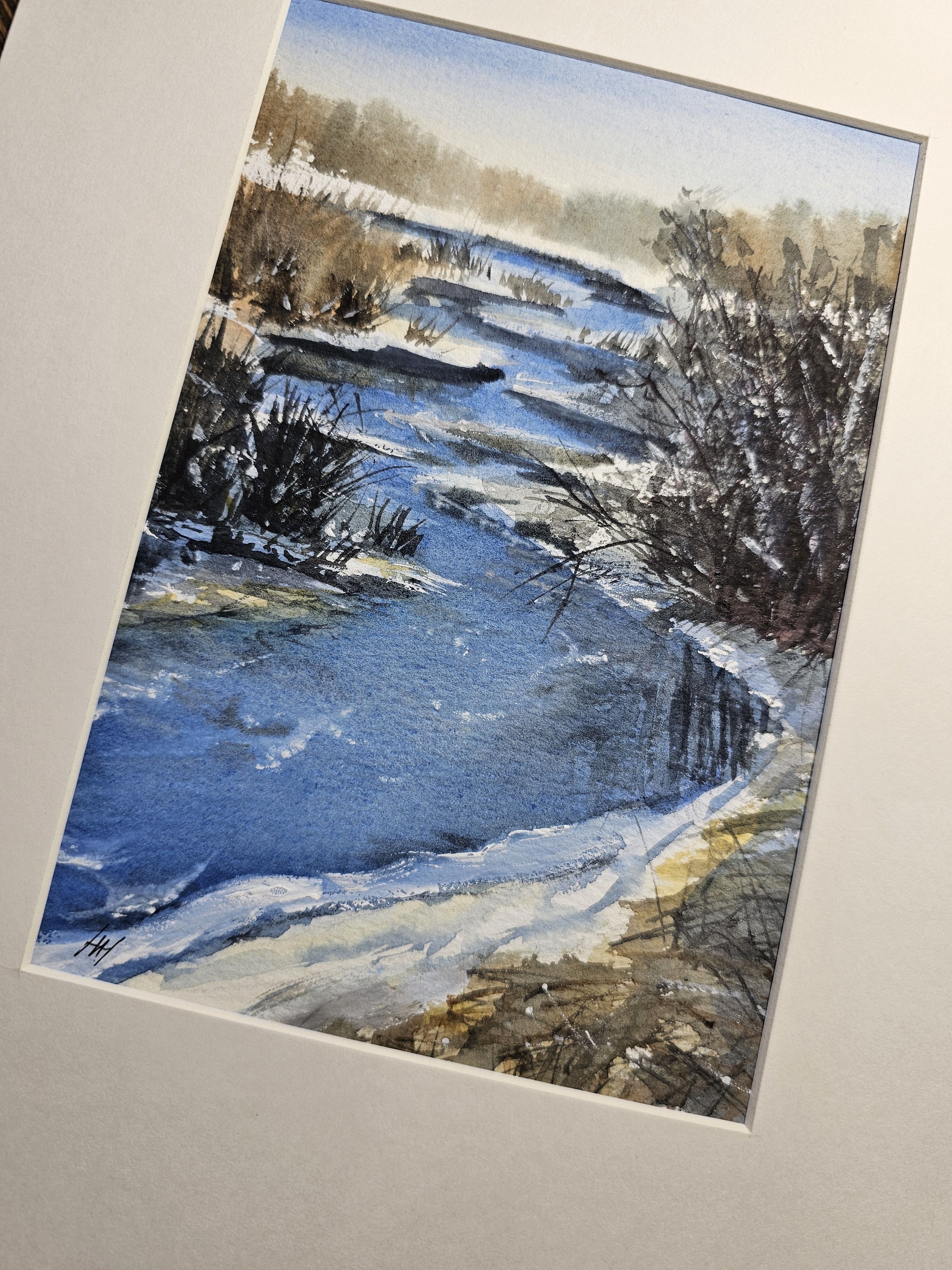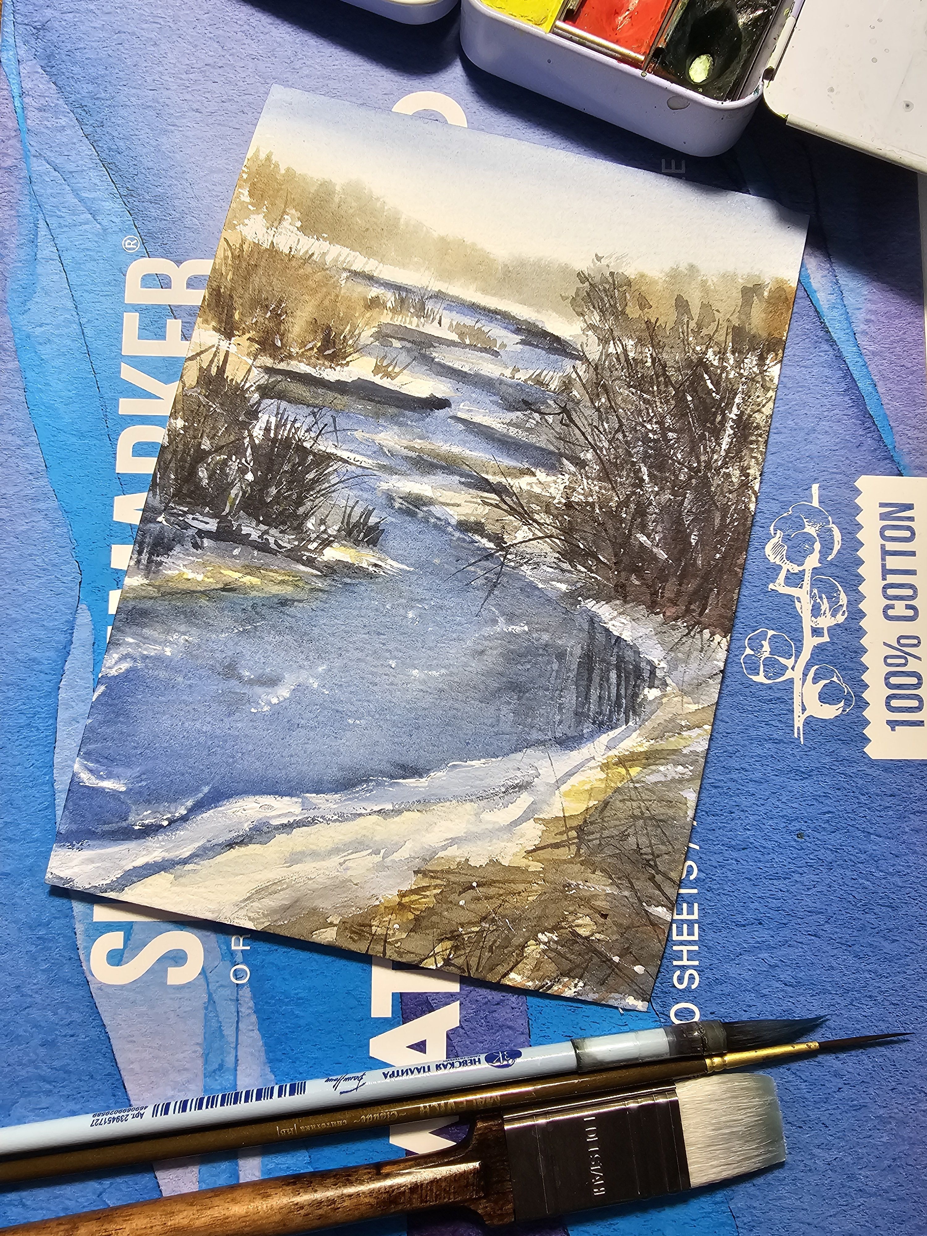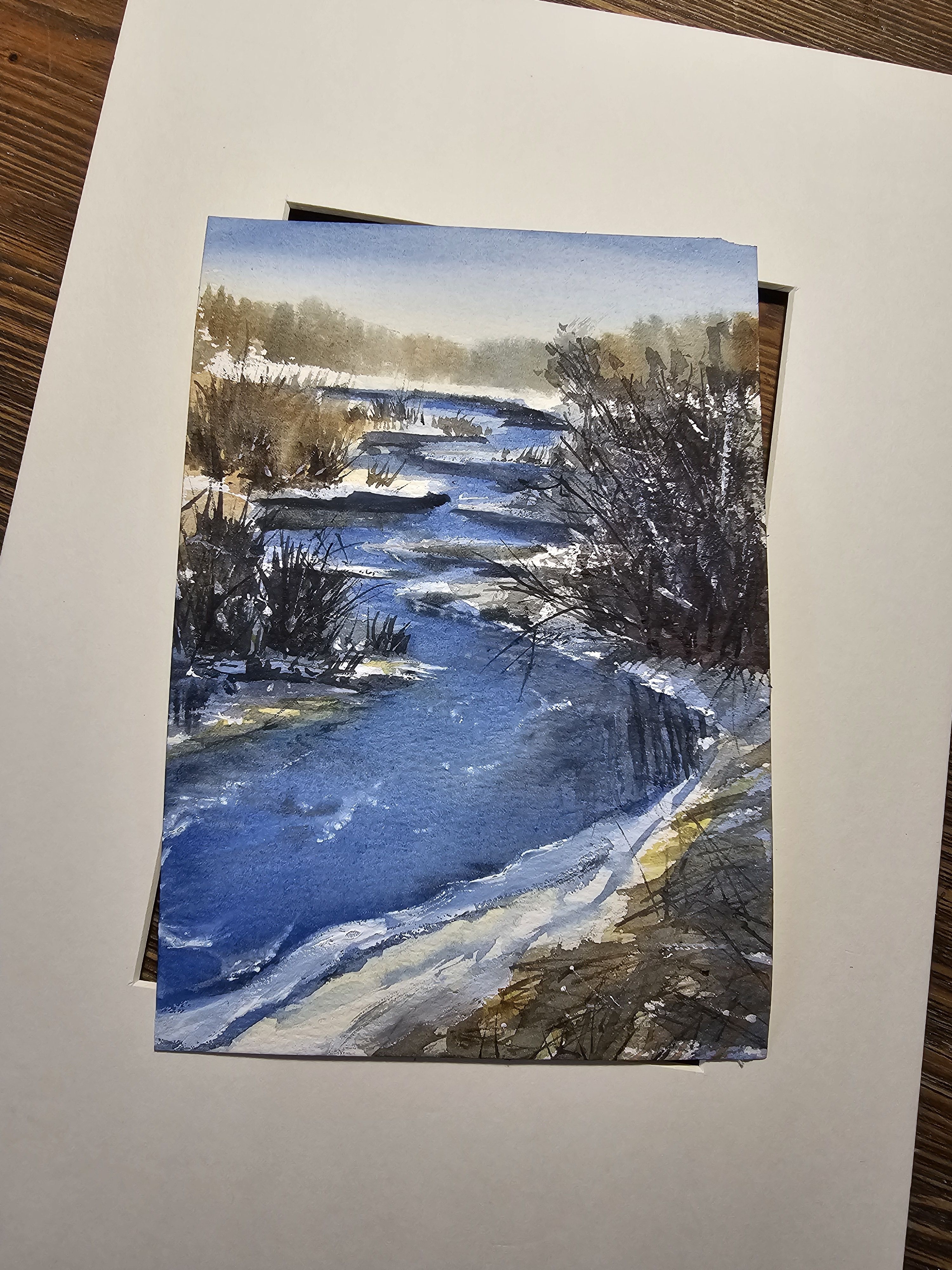 Нам представлена акварельная картина. Передан весенний пейзаж. В центре картины находится извилистая река, частично покрытая льдом и снегом. Вдоль берегов заметна еще зимняя растительность, кусты и деревья без листвы. Фон выполнен в светлых тонах, создавая ощущение холодного, но солнечного утра . Картина обладает спокойной и умиротворяющей атмосферой.