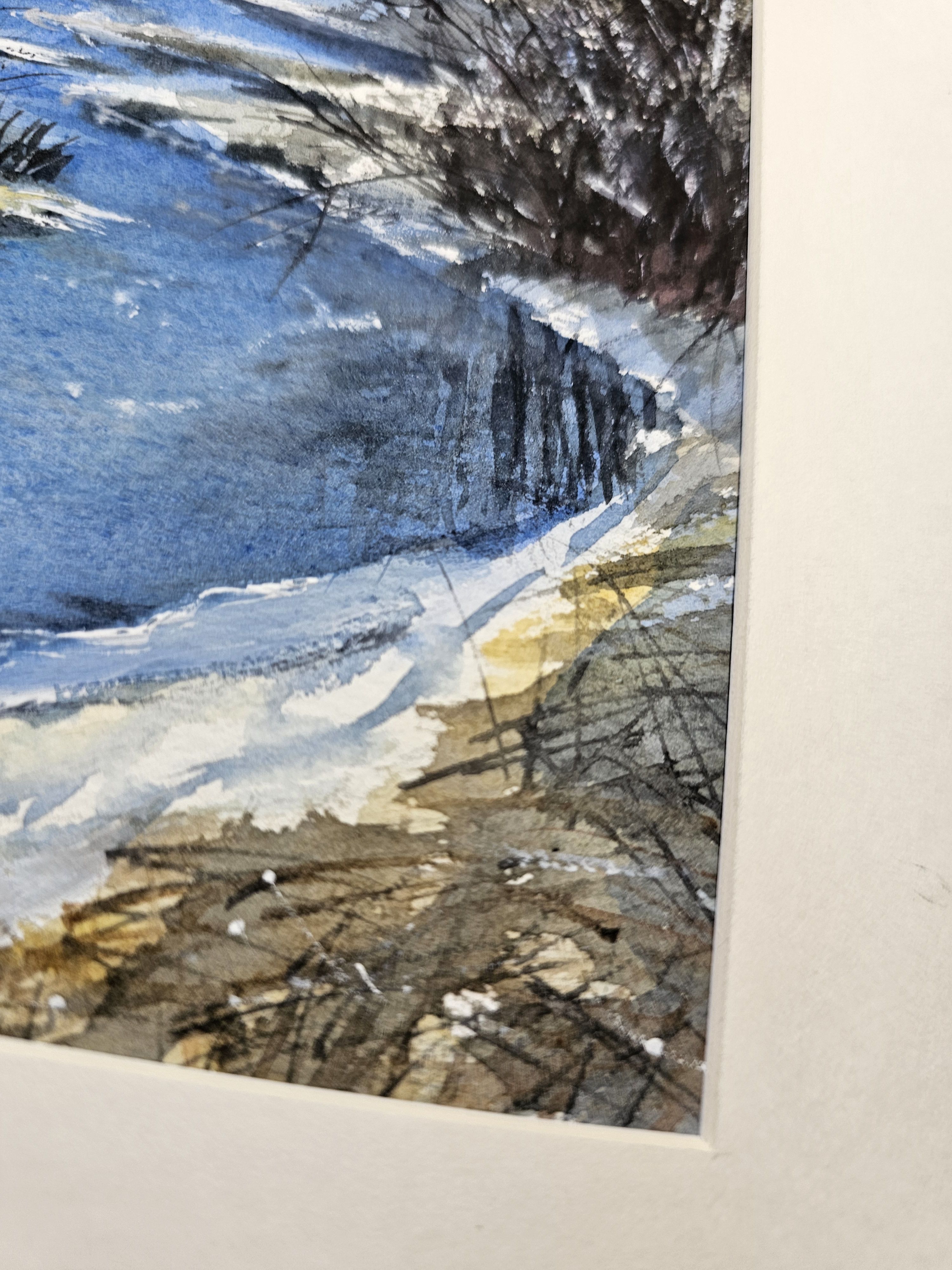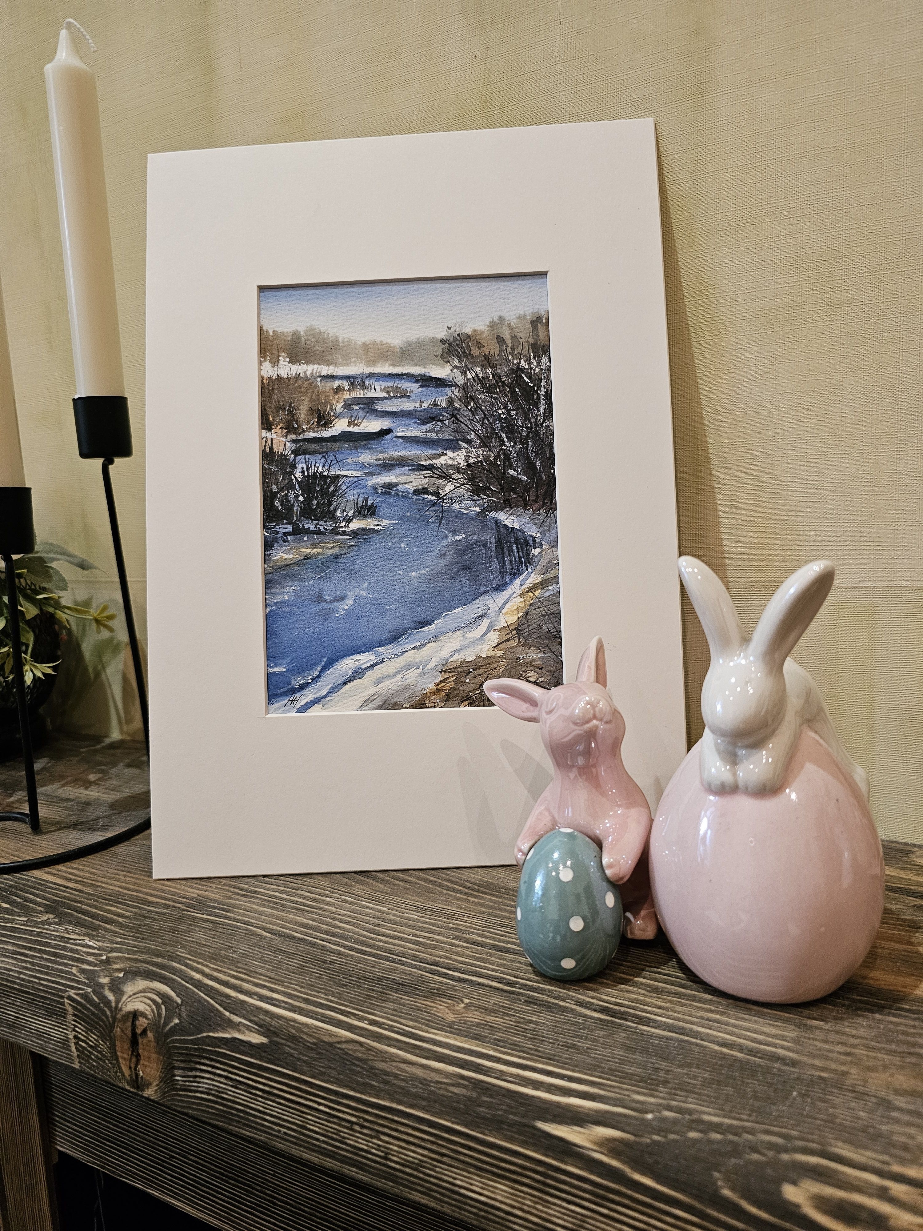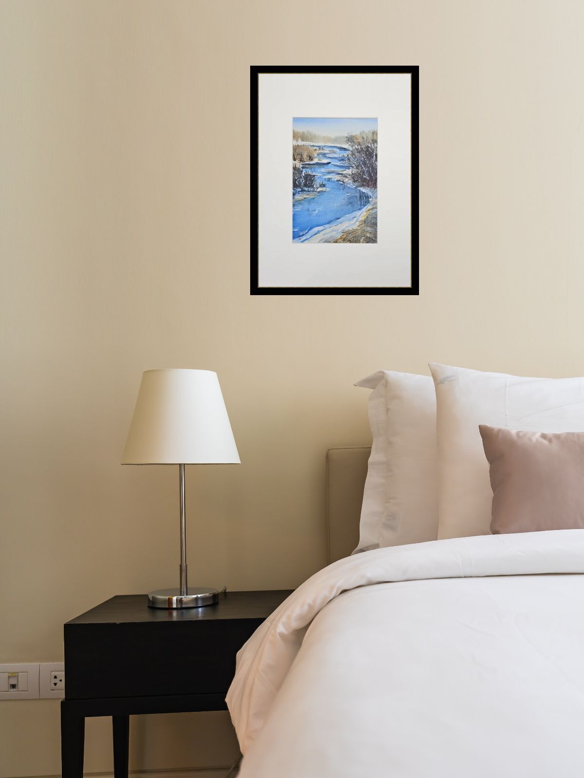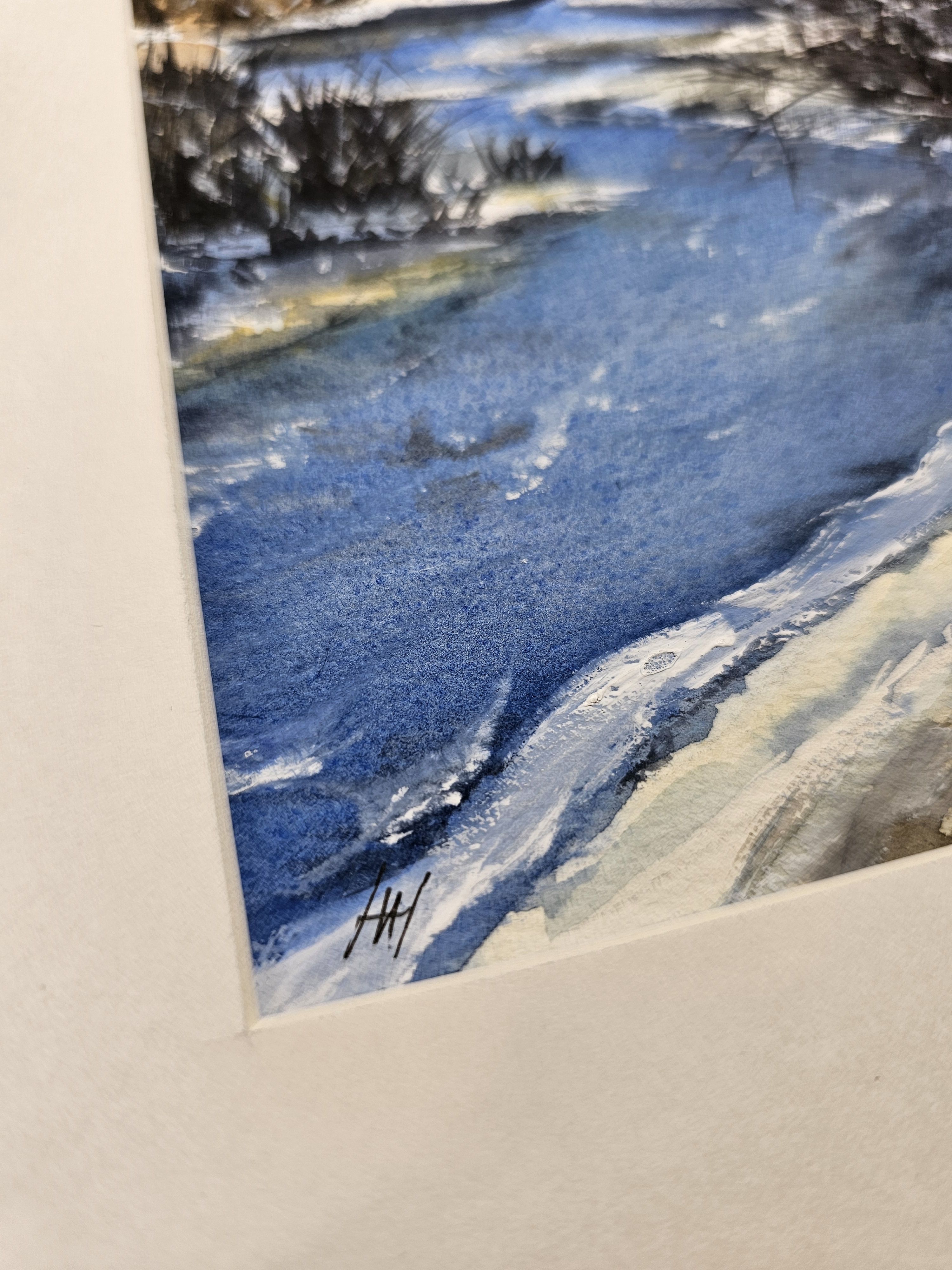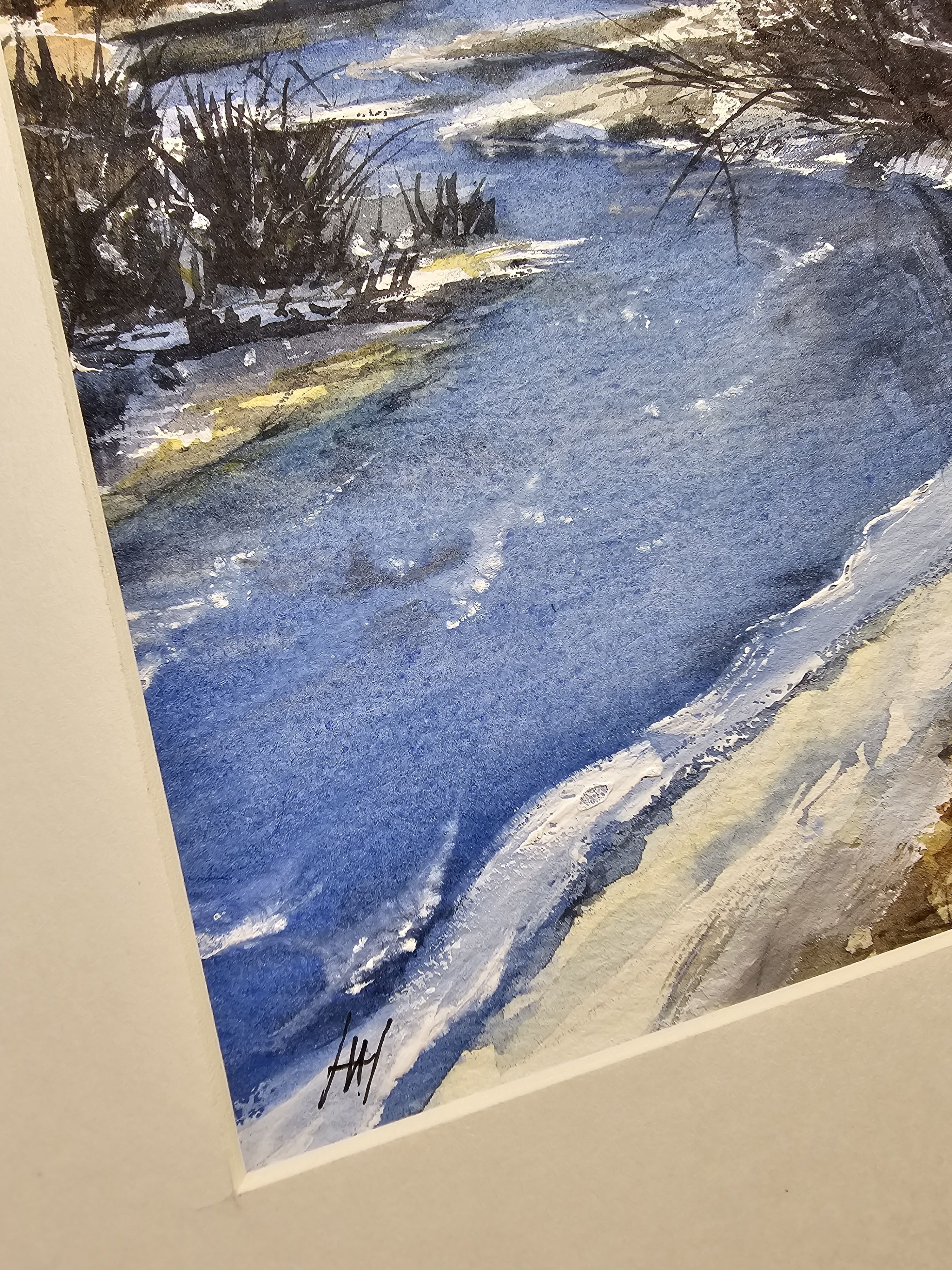 Нам представлена акварельная картина. Передан весенний пейзаж. В центре картины находится извилистая река, частично покрытая льдом и снегом. Вдоль берегов заметна еще зимняя растительность, кусты и деревья без листвы. Фон выполнен в светлых тонах, создавая ощущение холодного, но солнечного утра . Картина обладает спокойной и умиротворяющей атмосферой.