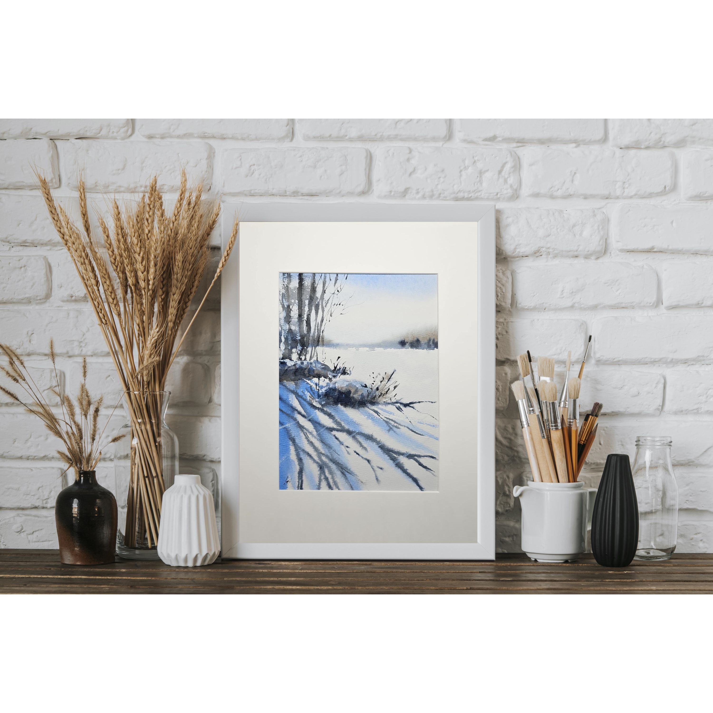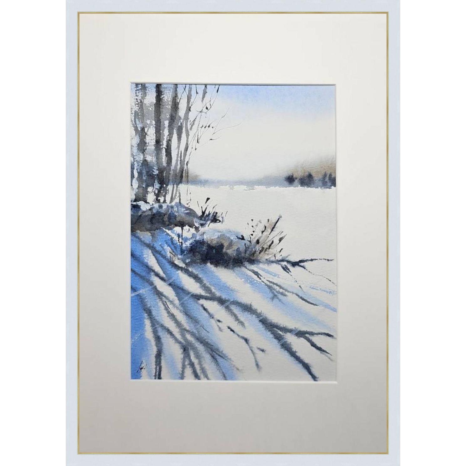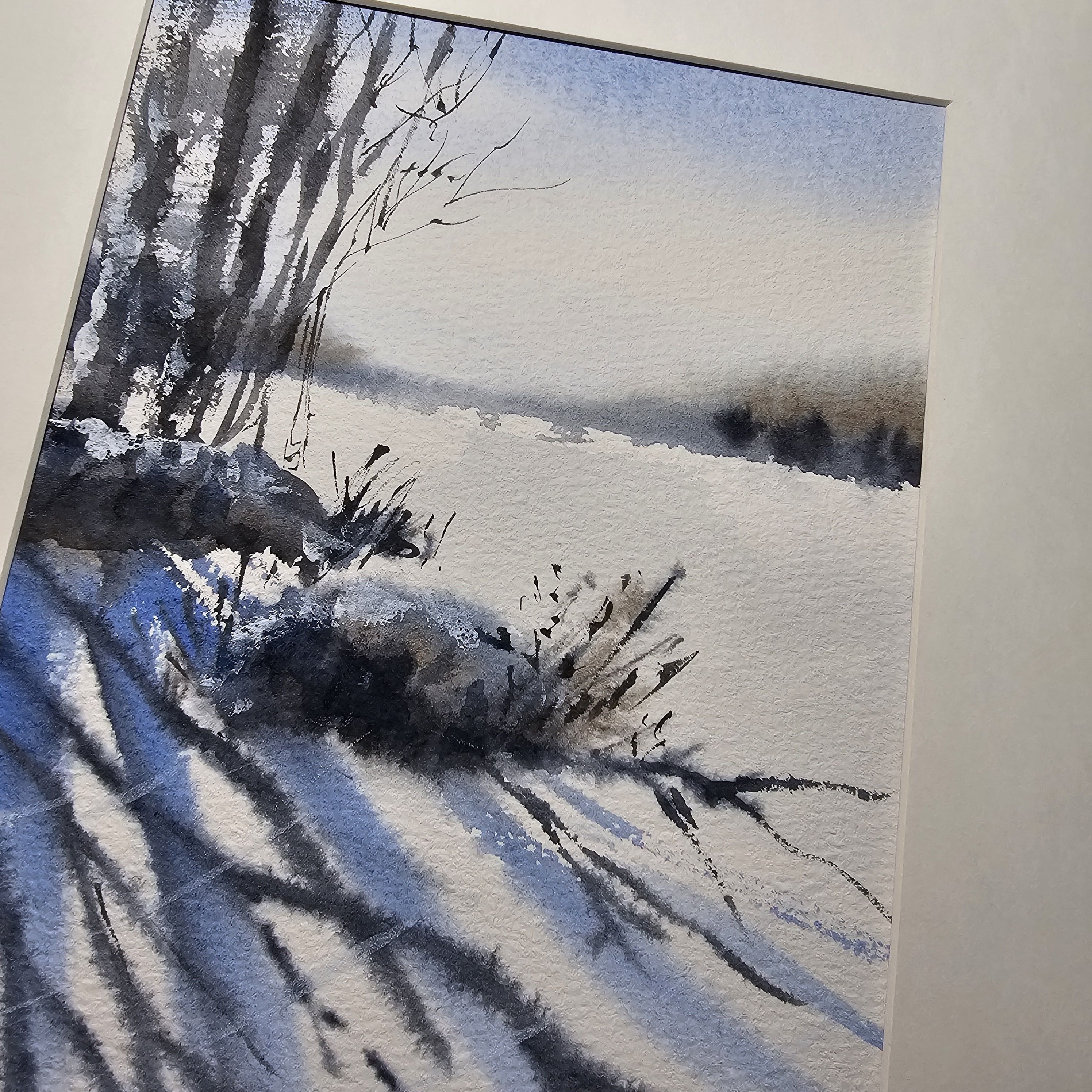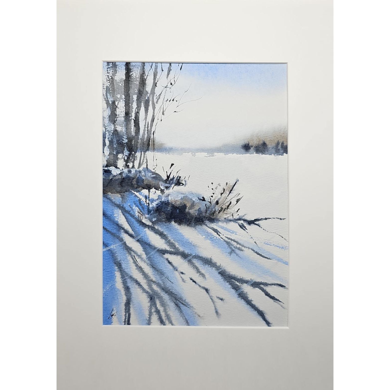 Нам представлена акварельная зимняя сцена. В левой части картины видны деревья, покрытые инеем или снегом, их стволы и ветви создают тени на земле. Снег изображен мягкими голубыми и серыми тонами, что передает холодную атмосферу. Дальний план с деревьями, вероятно, находящимися вдоль берега водоема. Картина выполнена в нежных пастельных тонах, передающих спокойствие и безмятежность зимнего пейзажа. Картина оформлена в светлое паспарту, что подчеркивает яркость пейзажа и готова к размещению в раме 21*30 см.