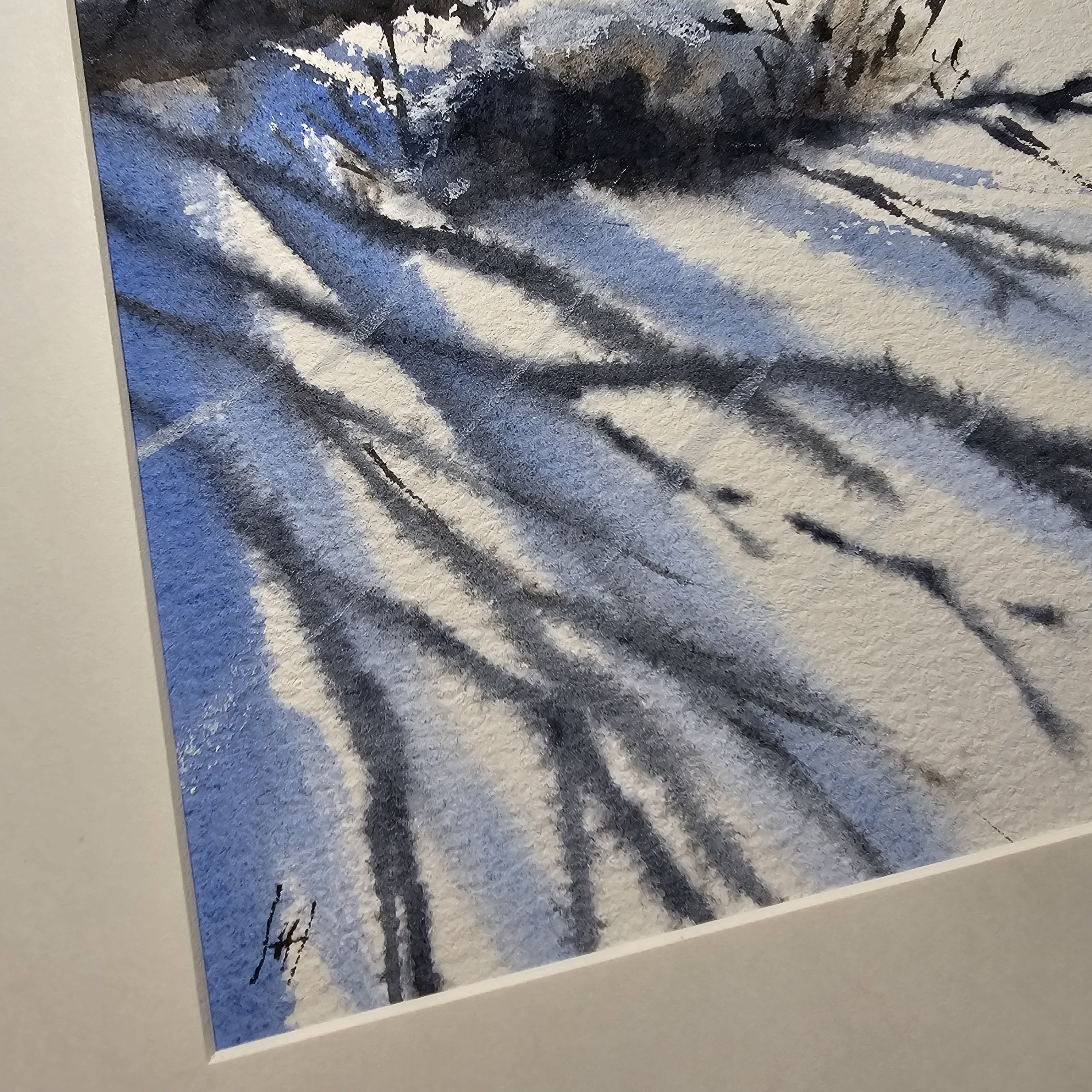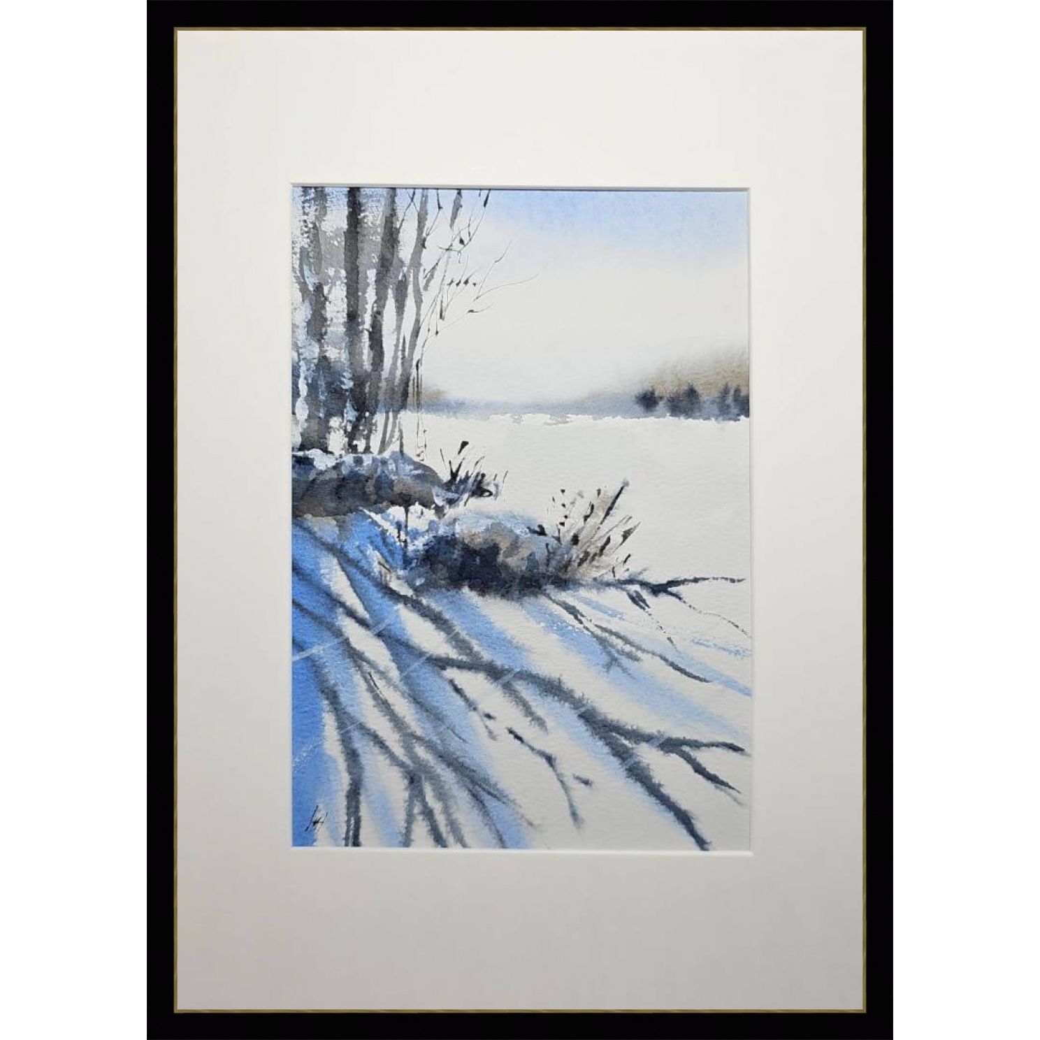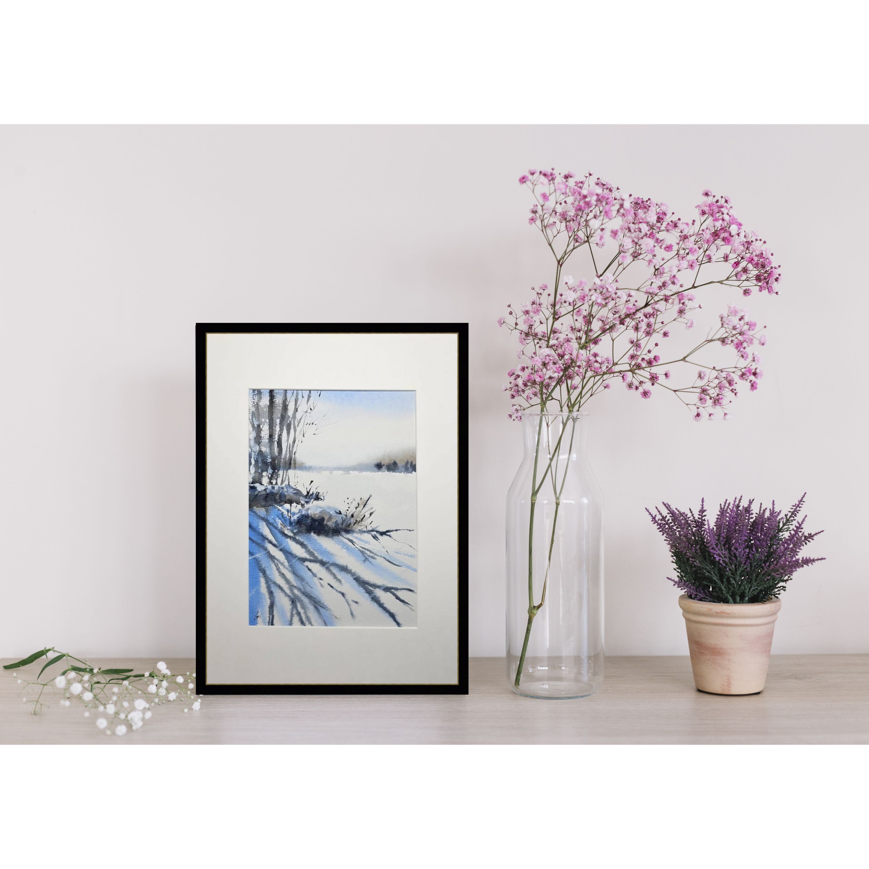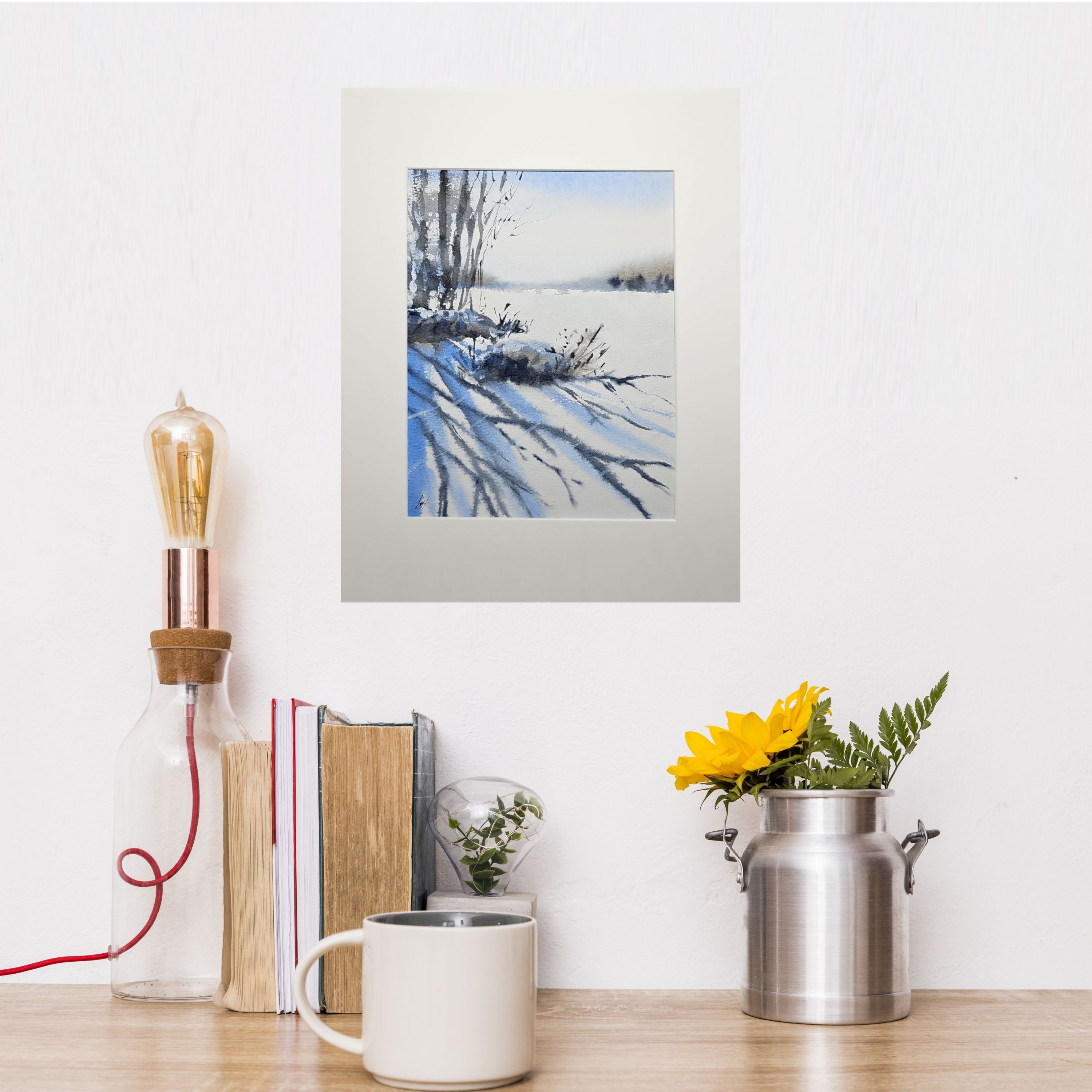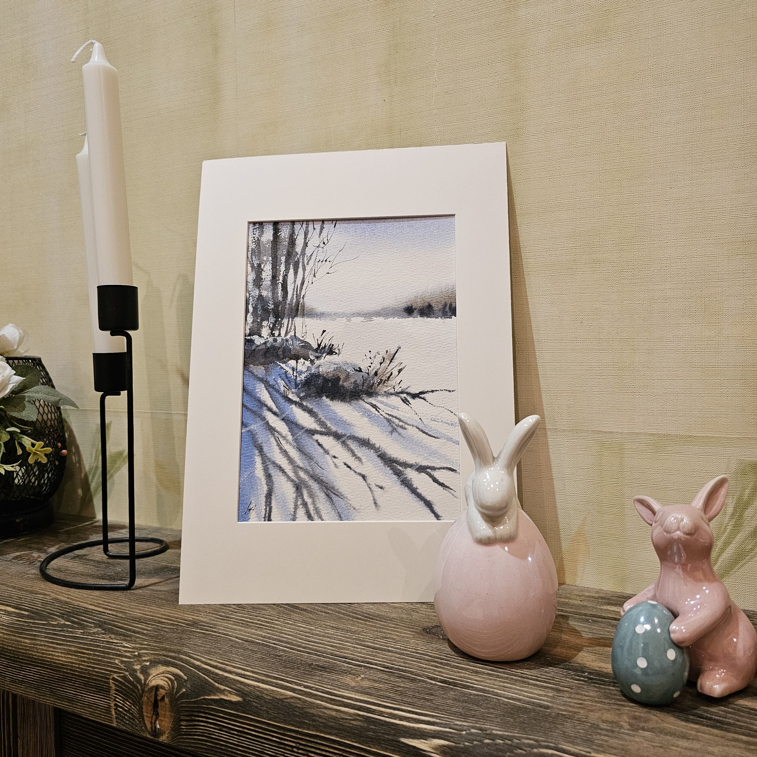 Нам представлена акварельная зимняя сцена. В левой части картины видны деревья, покрытые инеем или снегом, их стволы и ветви создают тени на земле. Снег изображен мягкими голубыми и серыми тонами, что передает холодную атмосферу. Дальний план с деревьями, вероятно, находящимися вдоль берега водоема. Картина выполнена в нежных пастельных тонах, передающих спокойствие и безмятежность зимнего пейзажа. Картина оформлена в светлое паспарту, что подчеркивает яркость пейзажа и готова к размещению в раме 21*30 см.