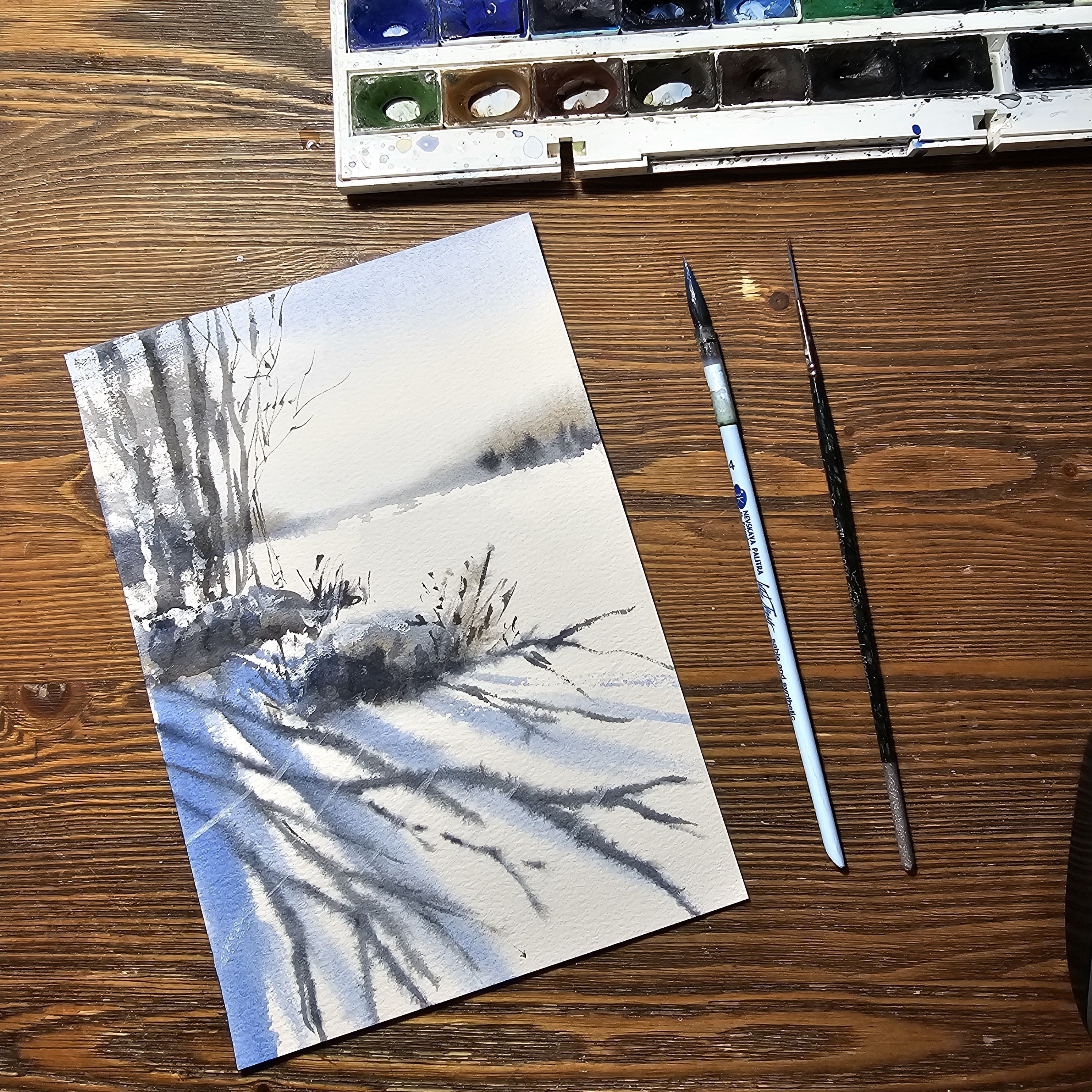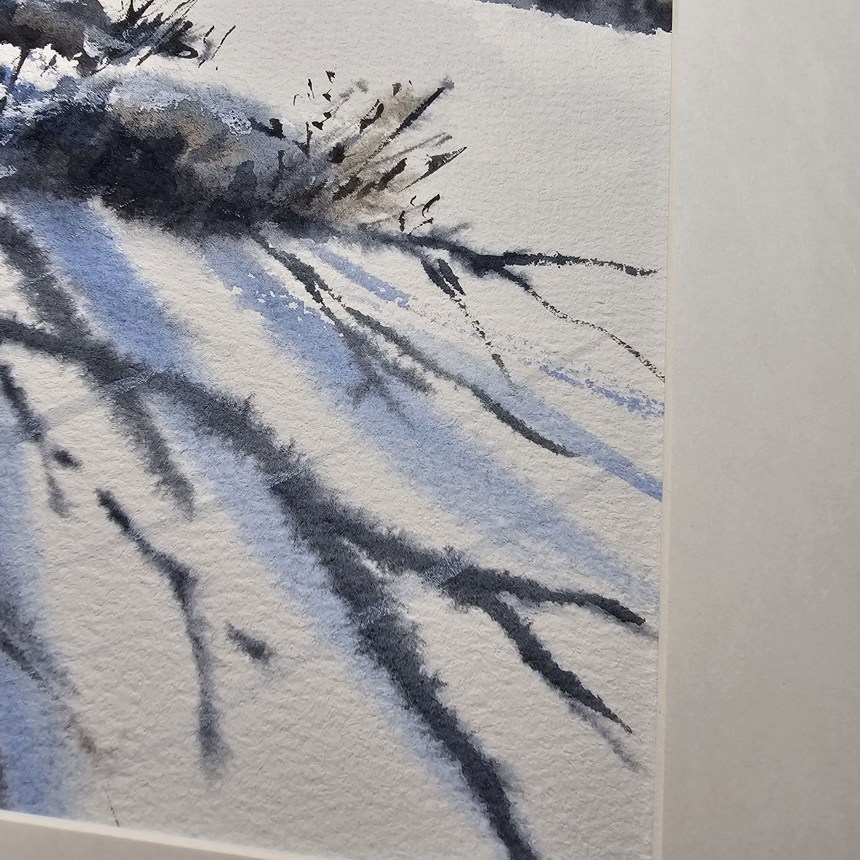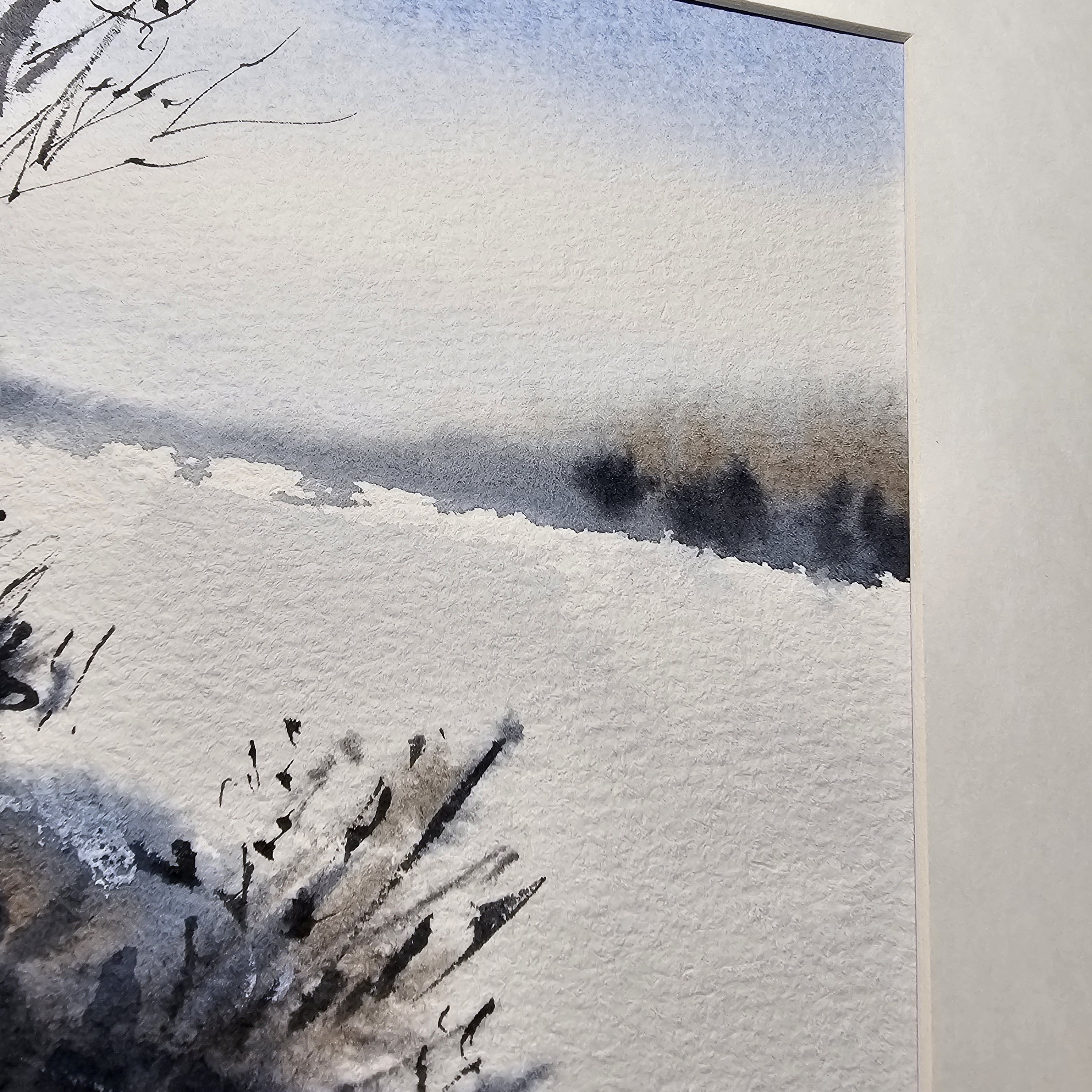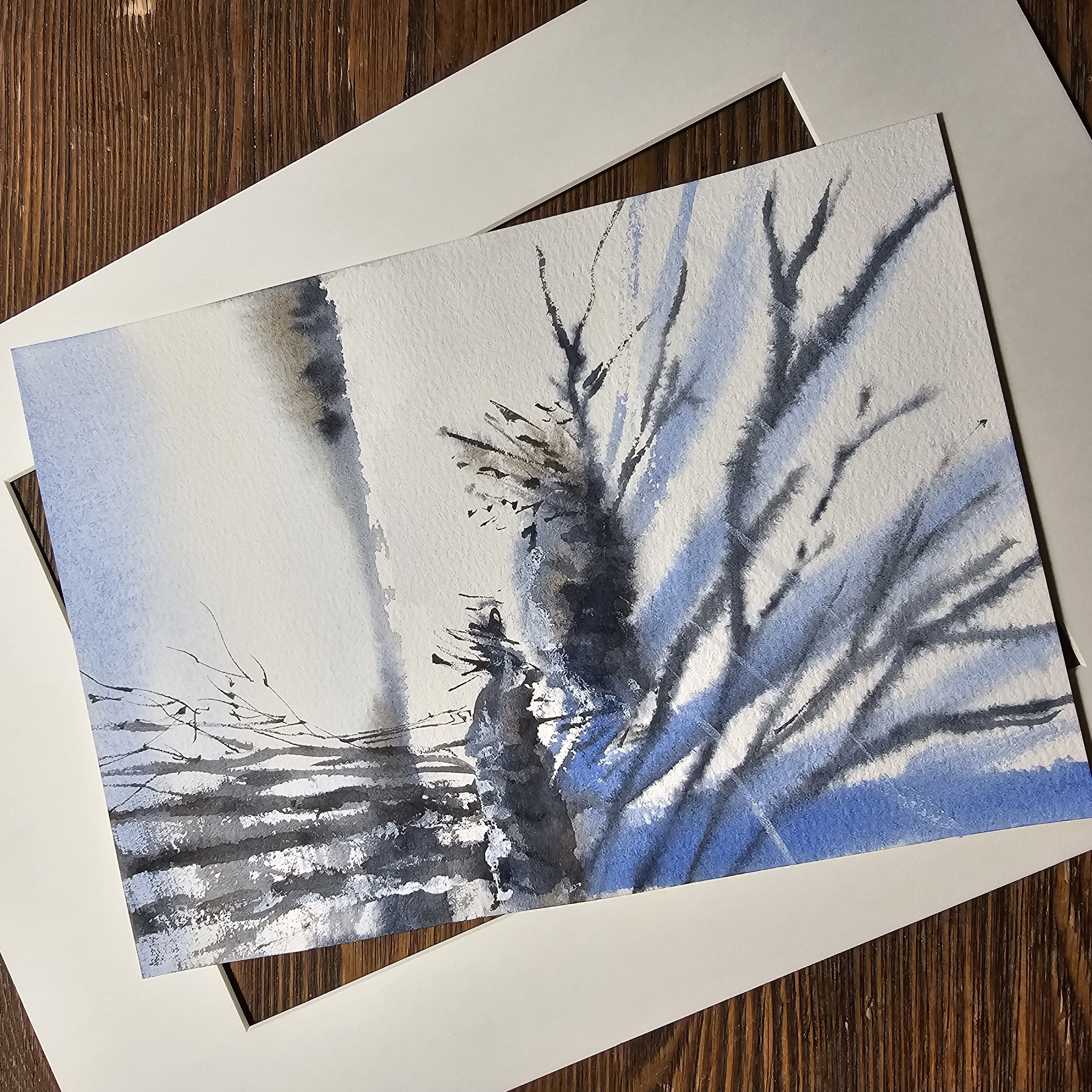 Нам представлена акварельная зимняя сцена. В левой части картины видны деревья, покрытые инеем или снегом, их стволы и ветви создают тени на земле. Снег изображен мягкими голубыми и серыми тонами, что передает холодную атмосферу. Дальний план с деревьями, вероятно, находящимися вдоль берега водоема. Картина выполнена в нежных пастельных тонах, передающих спокойствие и безмятежность зимнего пейзажа. Картина оформлена в светлое паспарту, что подчеркивает яркость пейзажа и готова к размещению в раме 21*30 см.