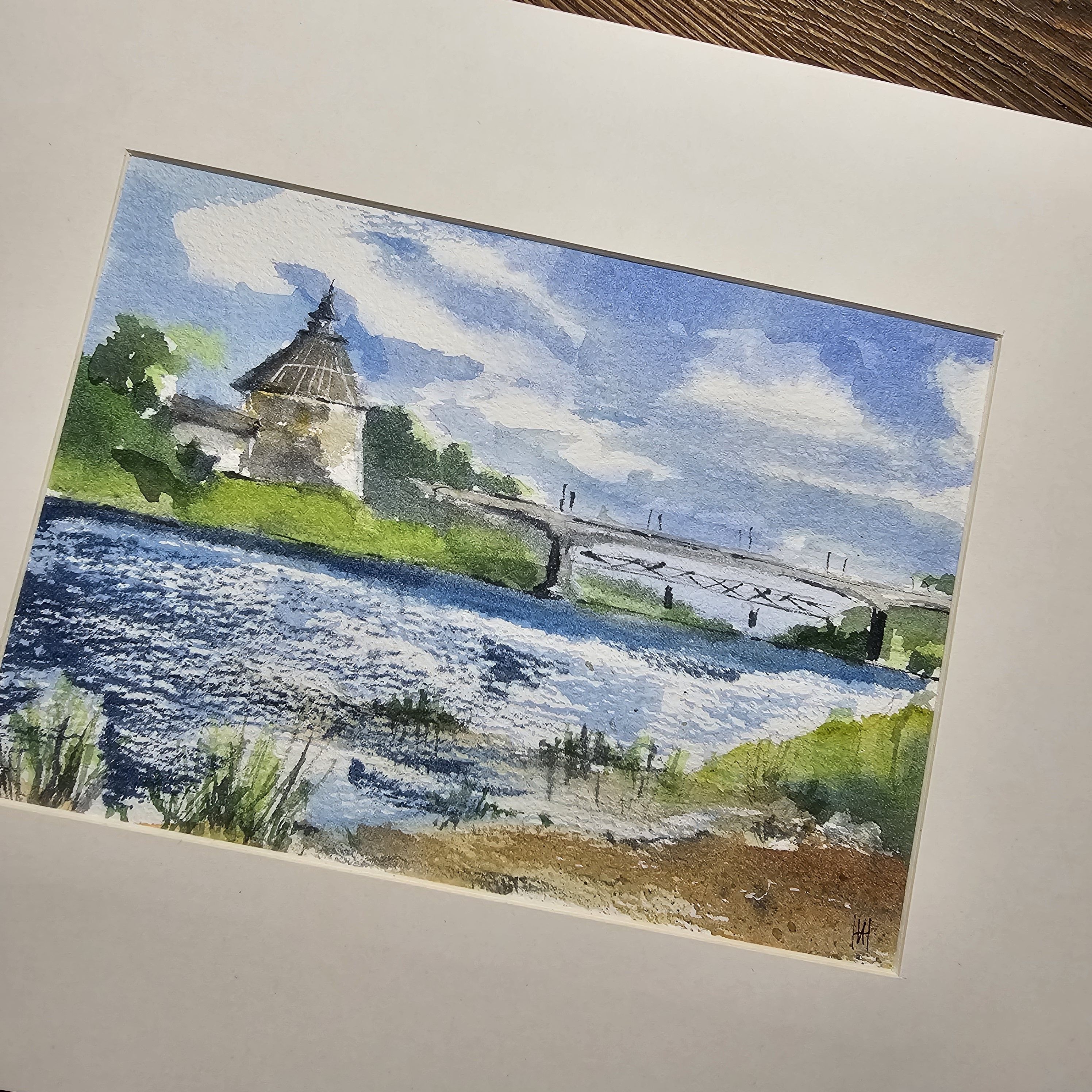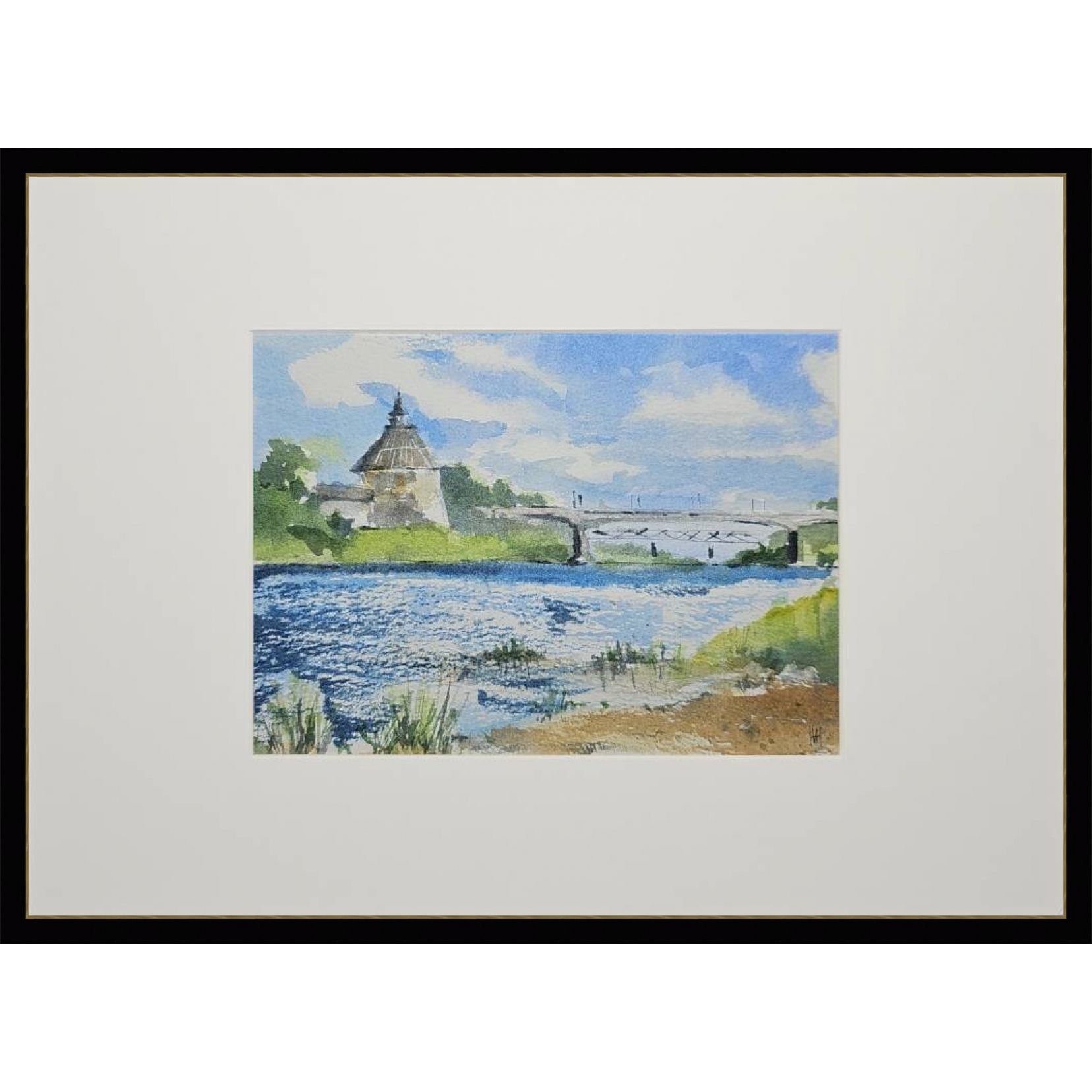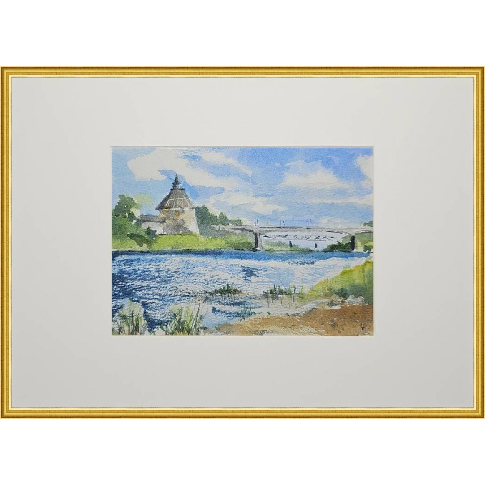 Нам представлен пейзаж, выполненный акварелью. На переднем плане река Великая с небольшими волнами. По берегам растет трава и кустарники. В центре слева расположена старинная каменная башня с высоким острым куполом. На заднем плане видны мосты. Небо на картине голубое с белыми облаками. Картина оформлена в светлое паспарту и готова к размещению в раме 21*30 см.
