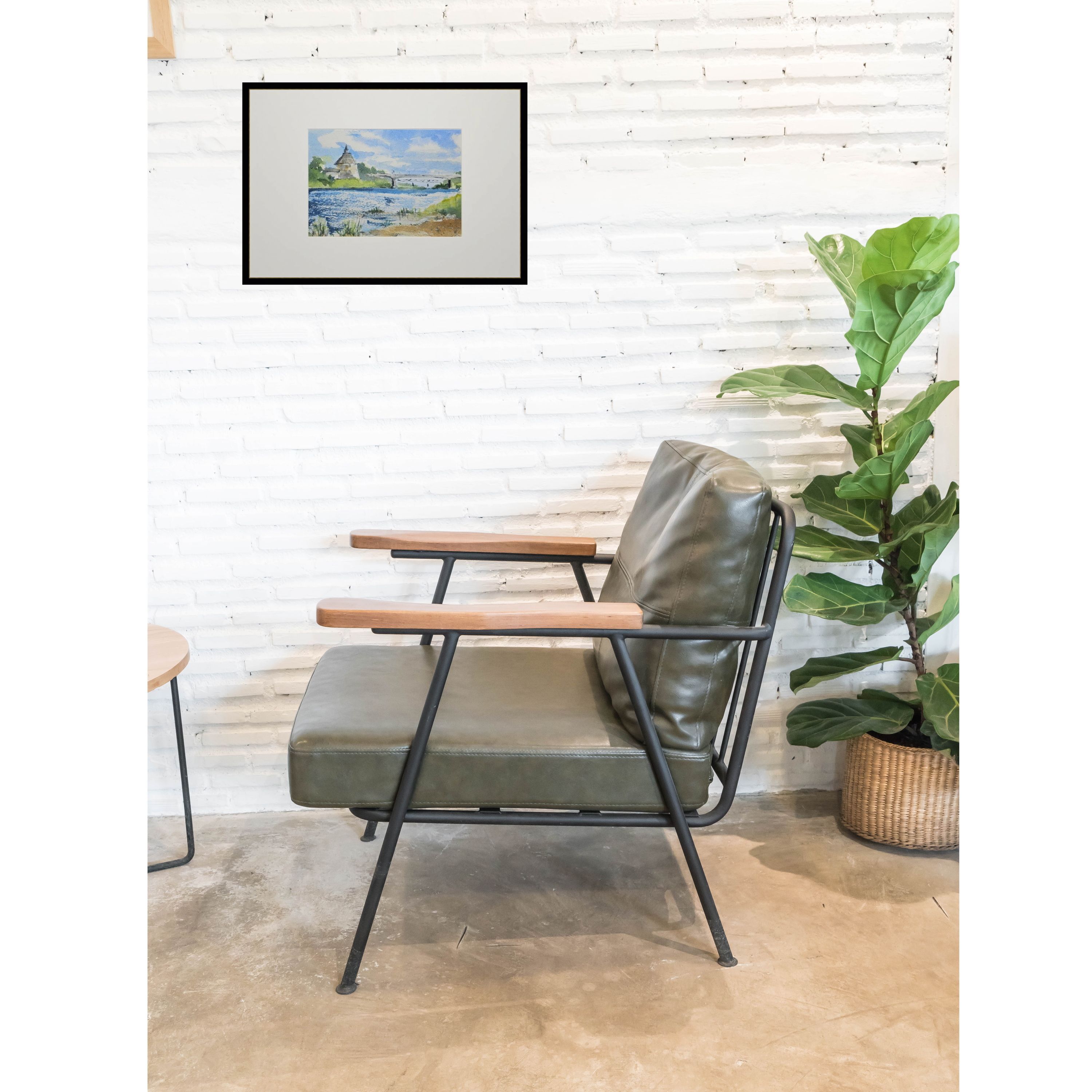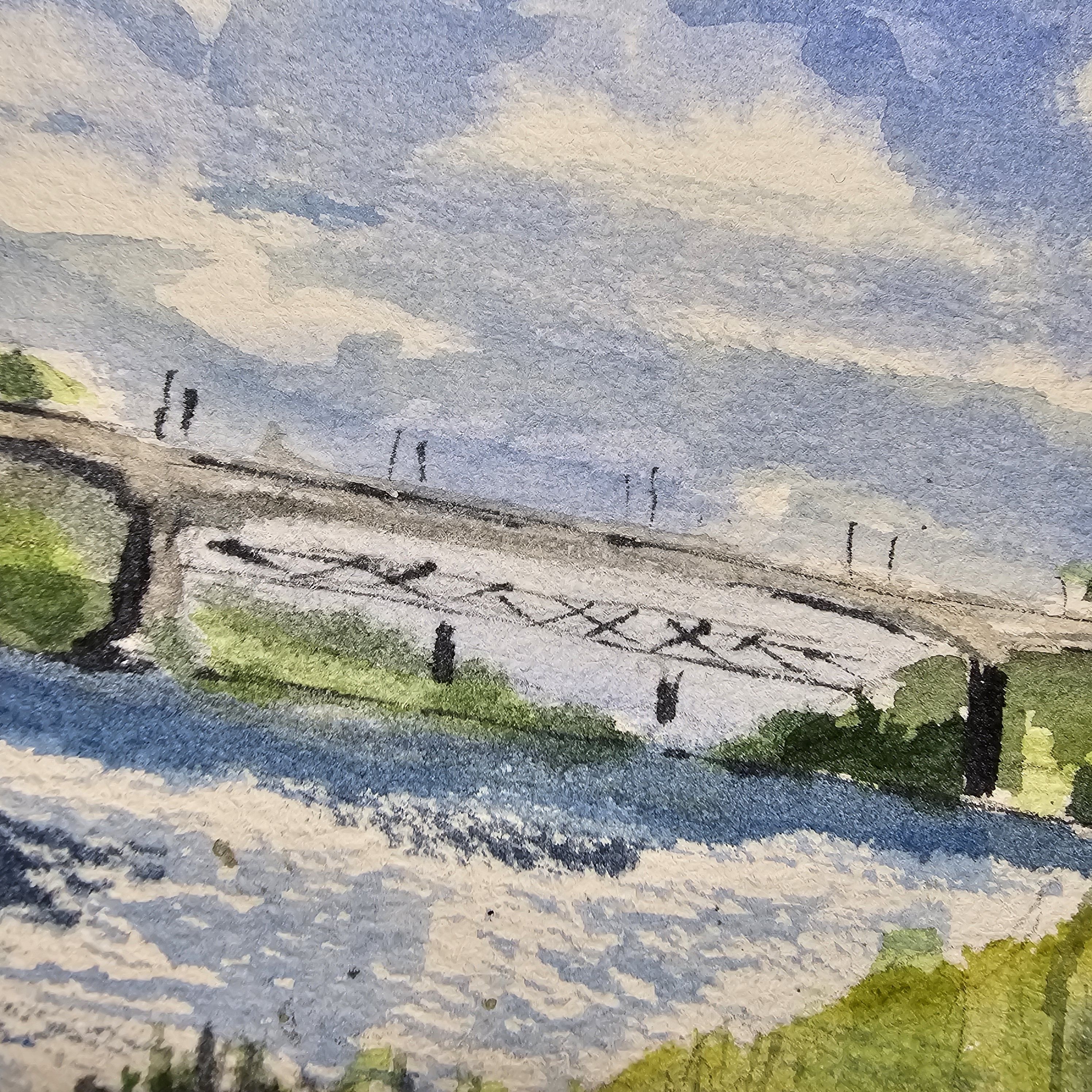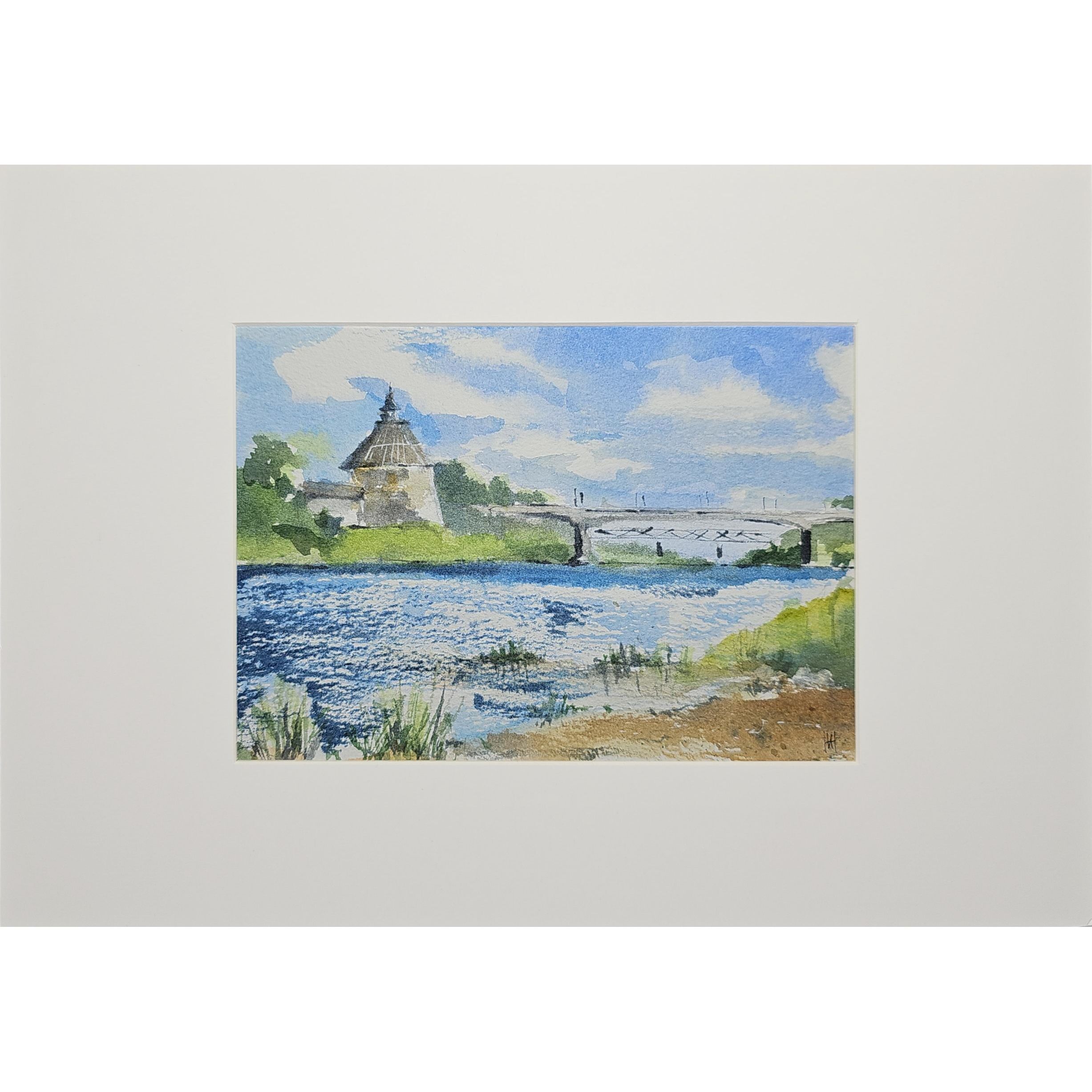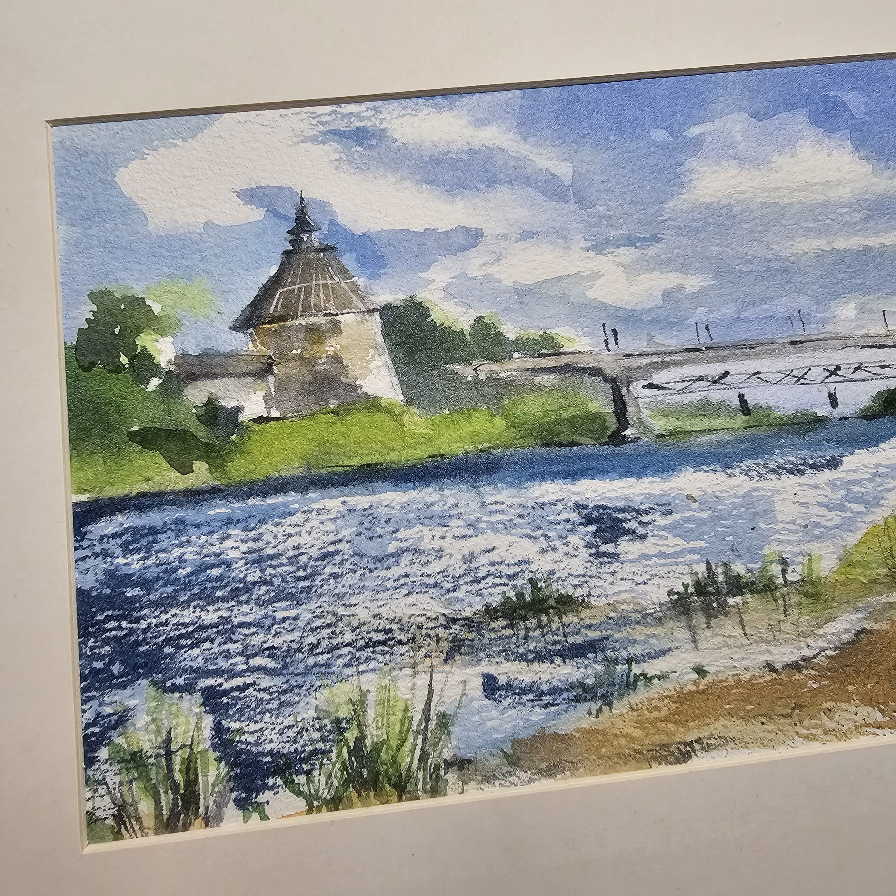 Нам представлен пейзаж, выполненный акварелью. На переднем плане река Великая с небольшими волнами. По берегам растет трава и кустарники. В центре слева расположена старинная каменная башня с высоким острым куполом. На заднем плане видны мосты. Небо на картине голубое с белыми облаками. Картина оформлена в светлое паспарту и готова к размещению в раме 21*30 см.