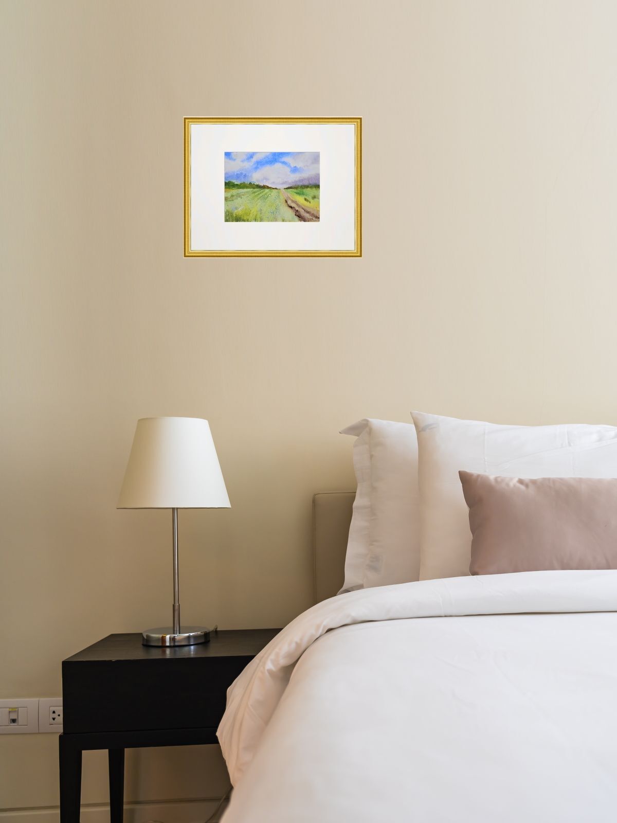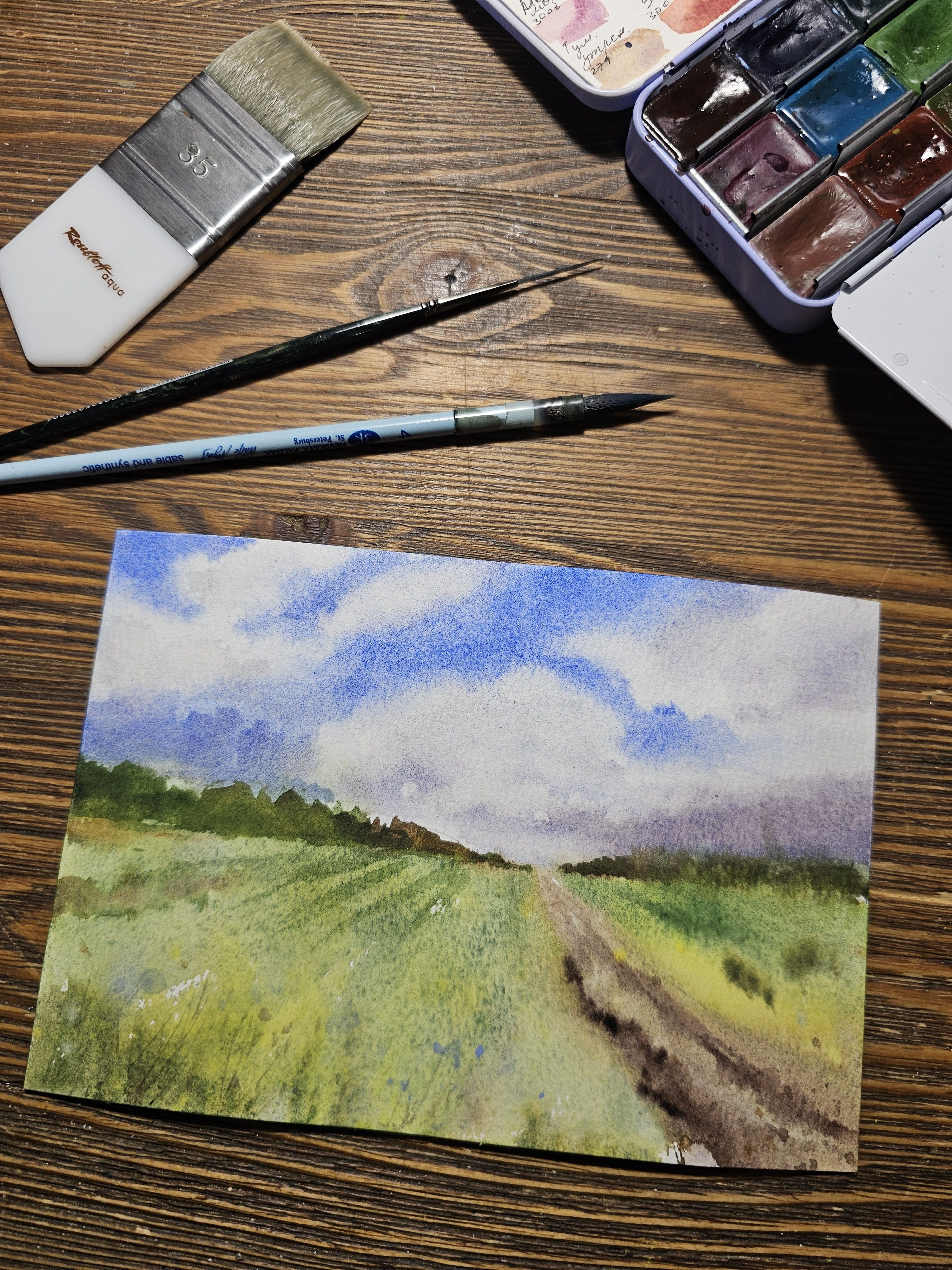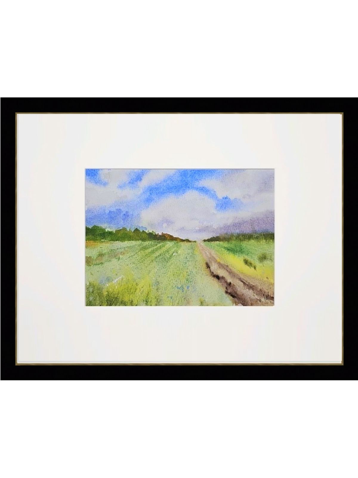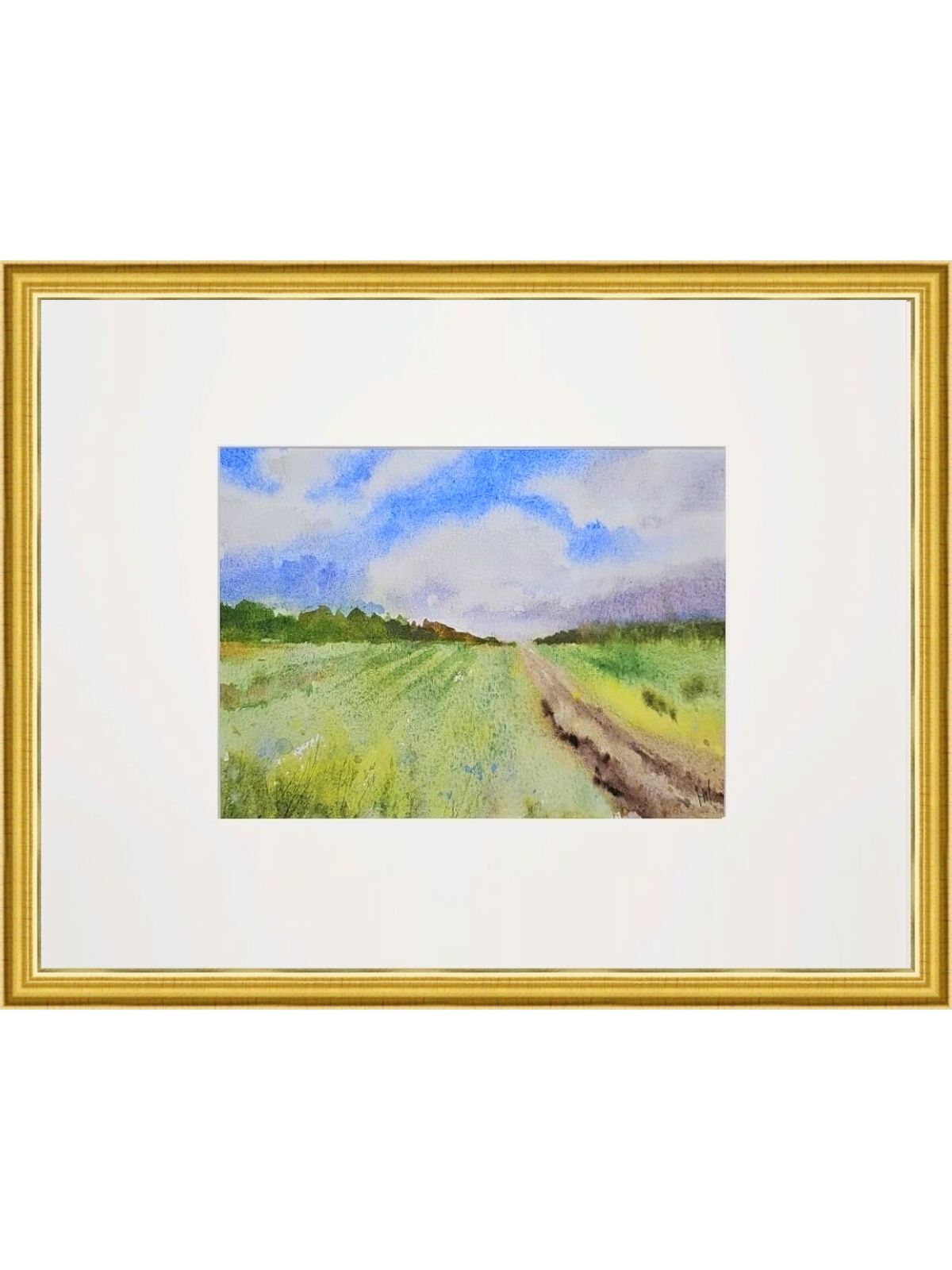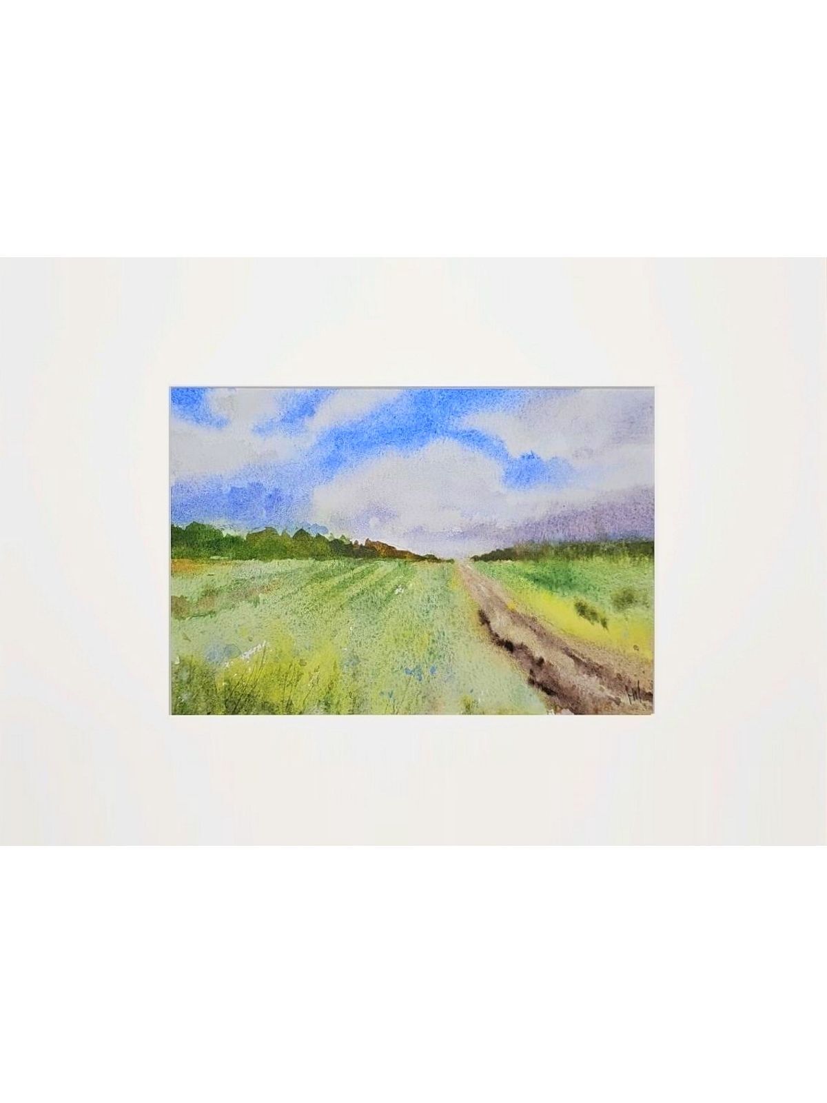 Нам представлена живописная сцена с полем и дорогой. На переднем плане можно видеть широкое зелёное поле с различными растениями и травой. Справа проходит грунтовая дорога, которая уходит вглубь картины, создавая ощущение перспективы. На горизонте виден лес или кустарник. Небо занимает верхнюю часть изображения и окрашено в синие и белые тона, с облаками, плавно плывущими по небу. Картина выполнена в пастельных, спокойных тонах, что придаёт ей умиротворяющий вид.