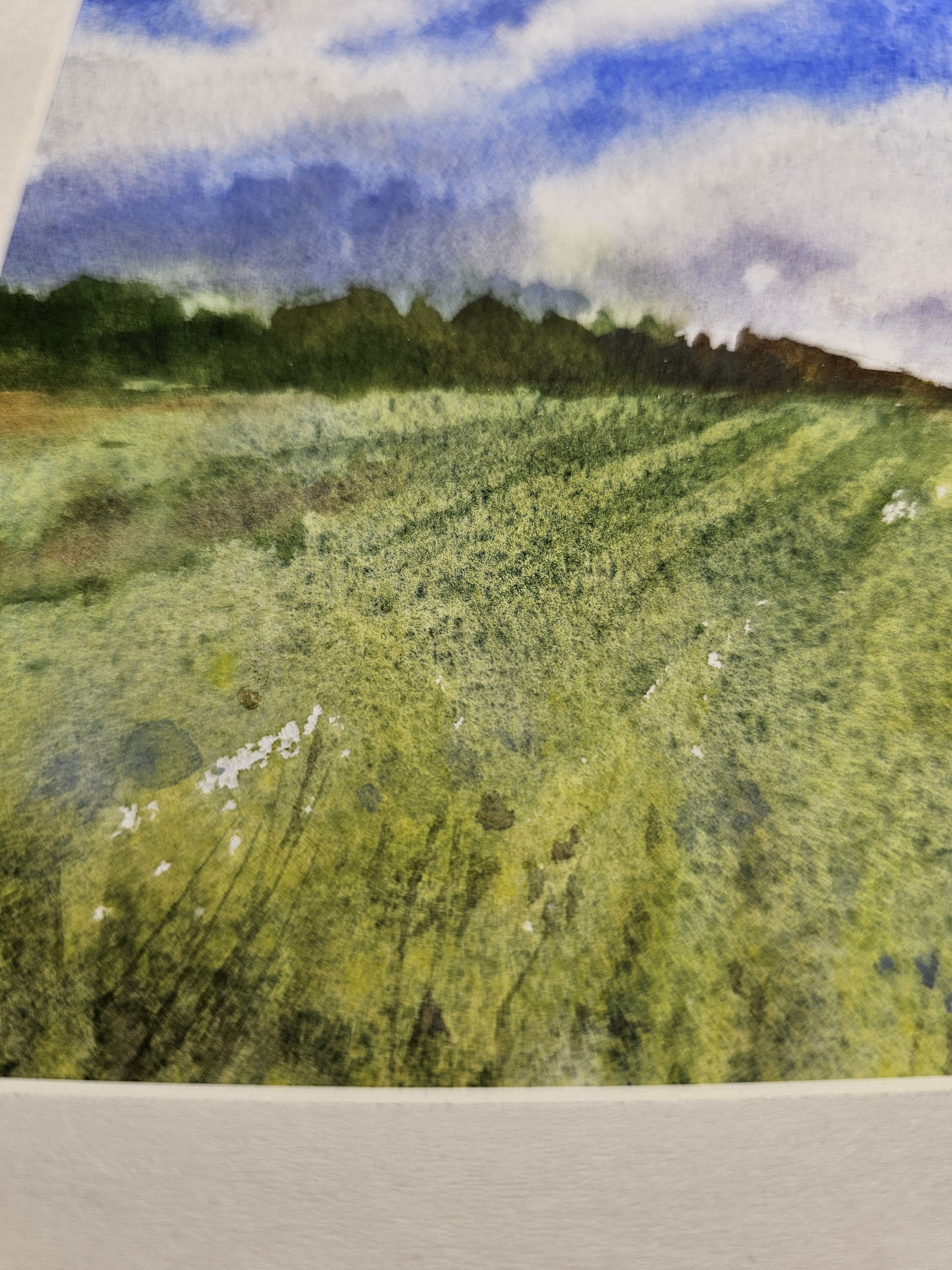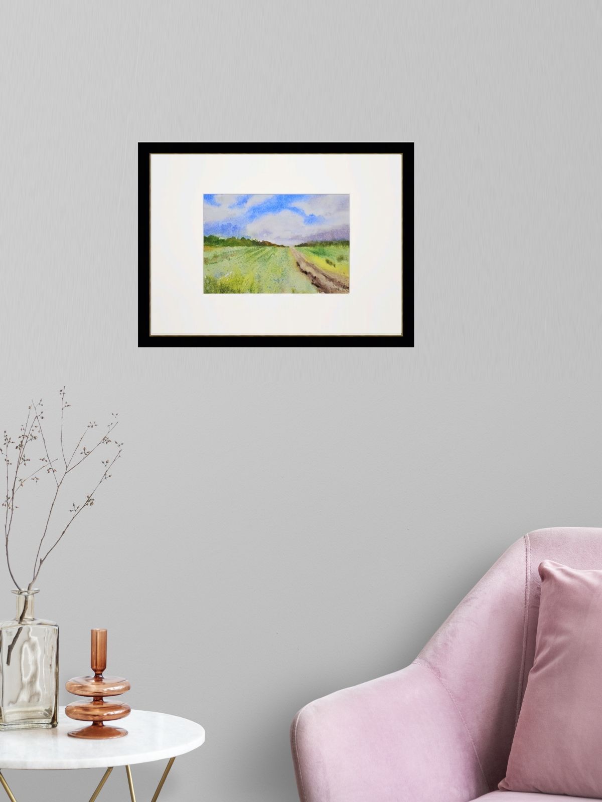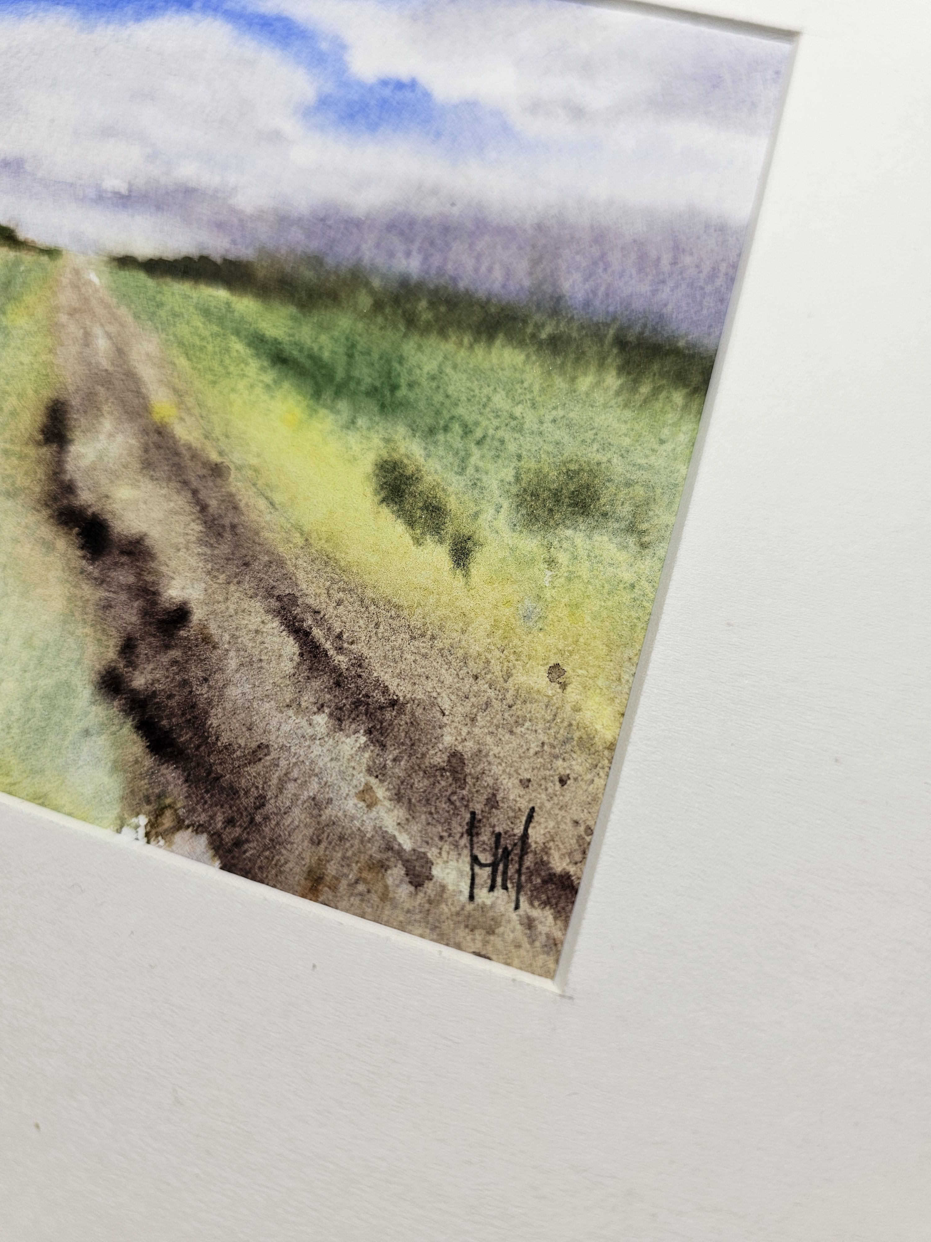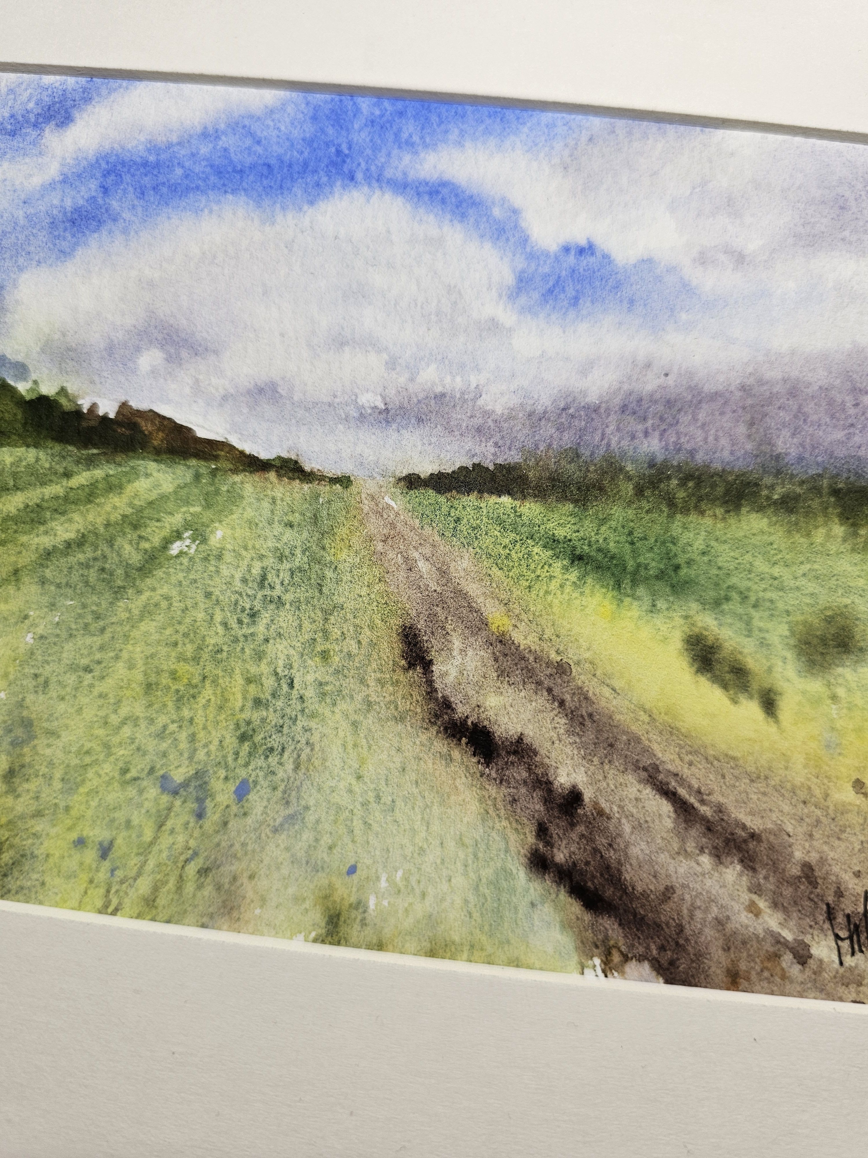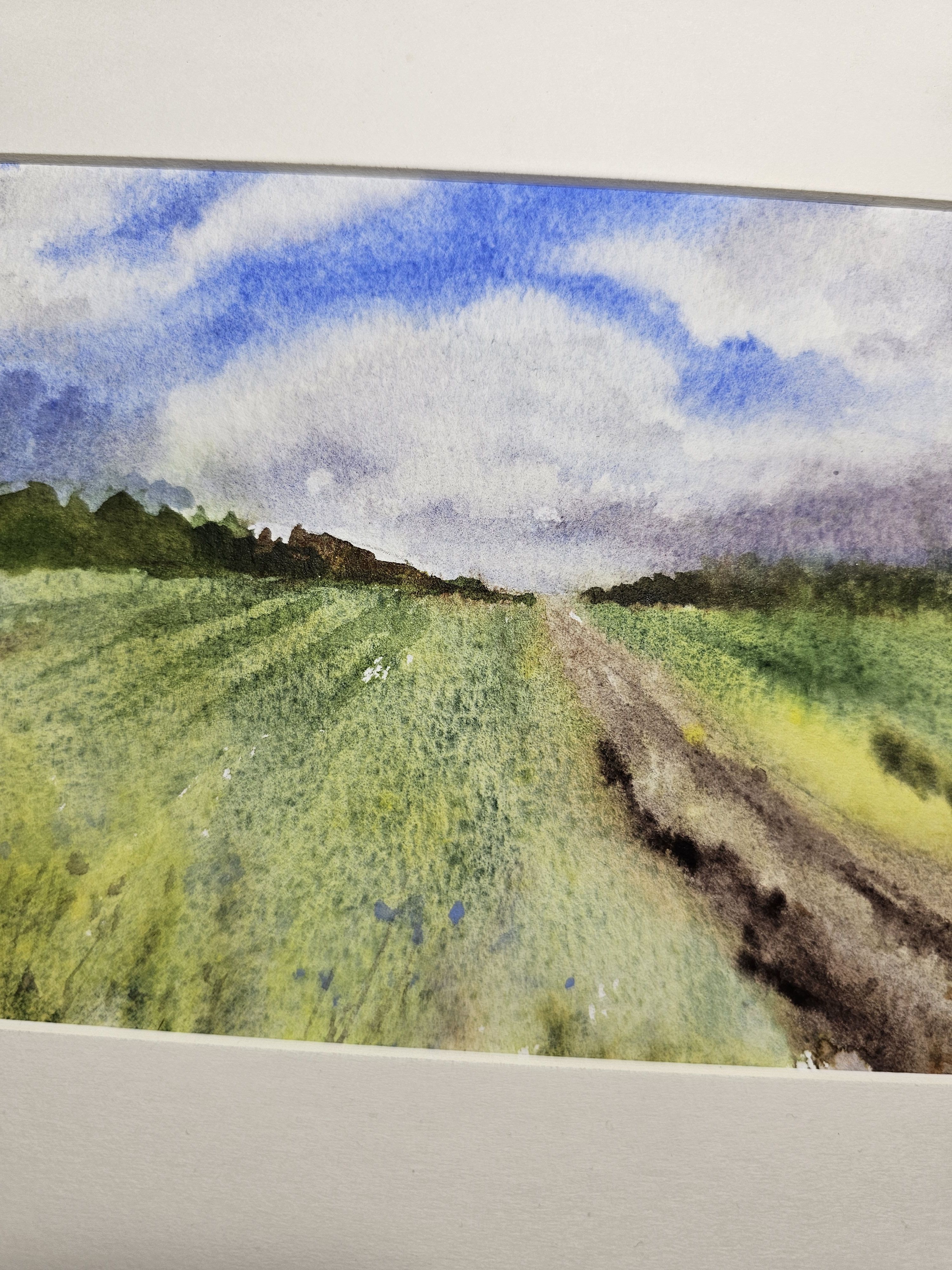 Нам представлена живописная сцена с полем и дорогой. На переднем плане можно видеть широкое зелёное поле с различными растениями и травой. Справа проходит грунтовая дорога, которая уходит вглубь картины, создавая ощущение перспективы. На горизонте виден лес или кустарник. Небо занимает верхнюю часть изображения и окрашено в синие и белые тона, с облаками, плавно плывущими по небу. Картина выполнена в пастельных, спокойных тонах, что придаёт ей умиротворяющий вид.
