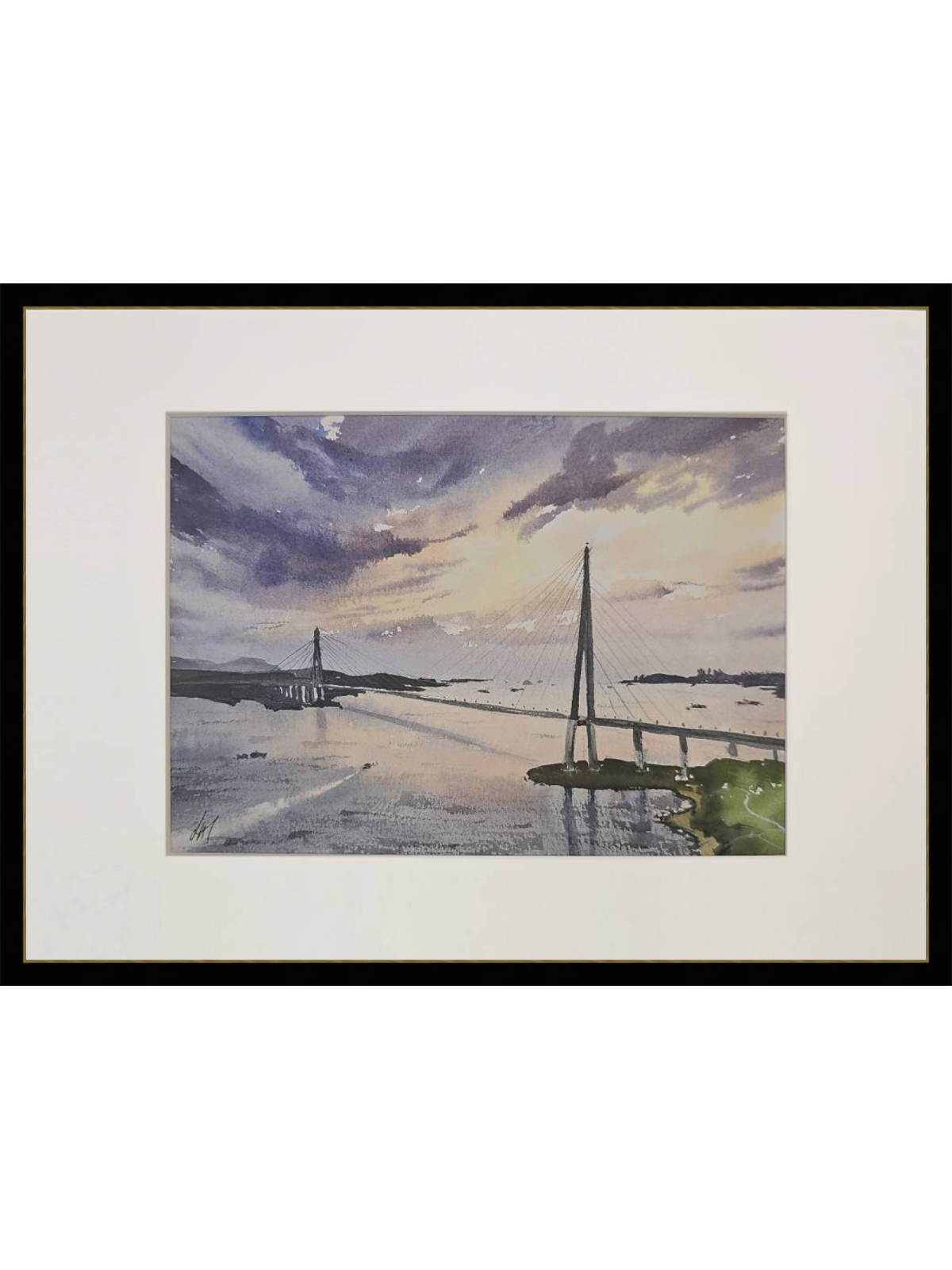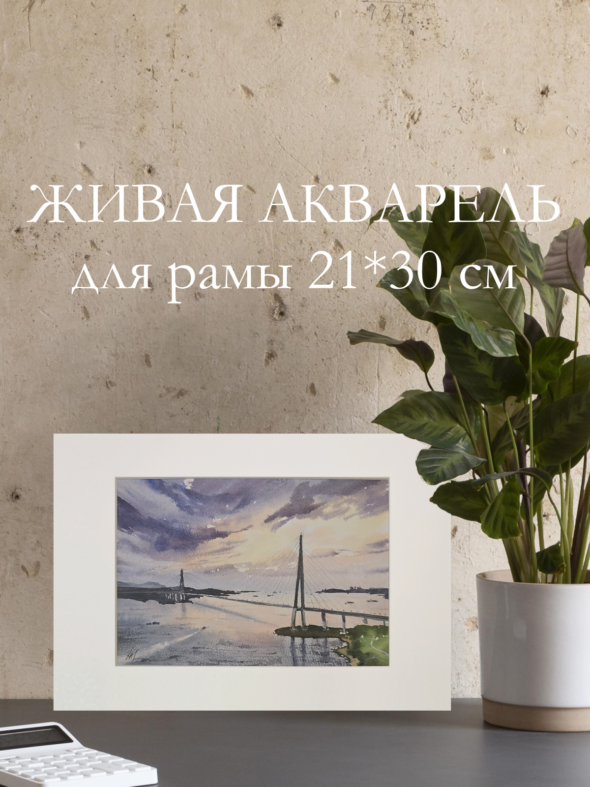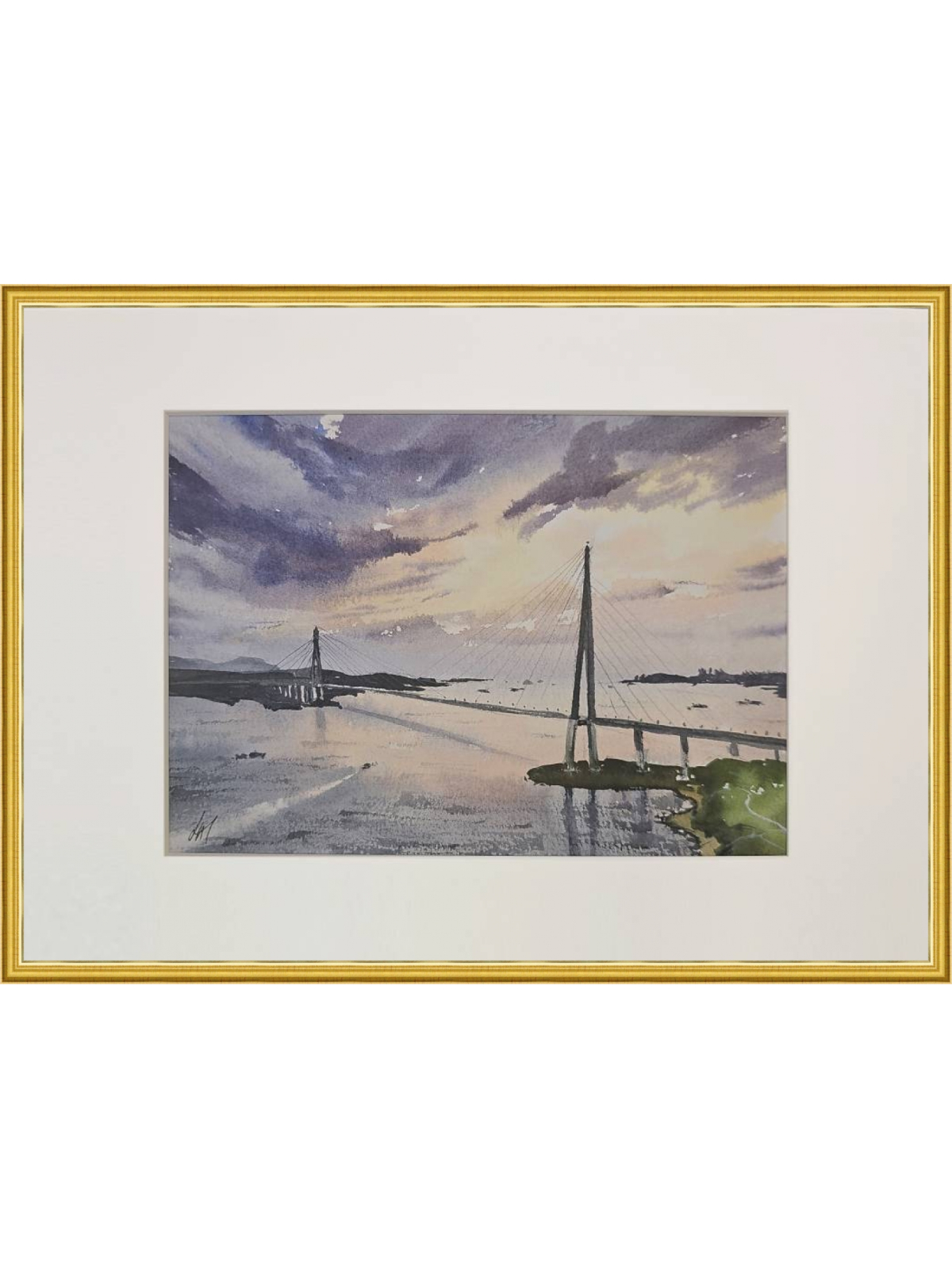 Нам представлена акварельная картина, изображающая мост, пересекающий водную гладь. Мост является вантовым с высокими опорами и натянутыми тросами. На заднем плане виднеются холмы и береговая линия. Вода отражает небо, которое окрашено в мягкие оттенки синего, фиолетового и розового, создавая атмосферу заката. Картина заключена в светлую рамку, что придаёт ей законченный вид. Картина создает атмосферу спокойствия и умиротворения. Работа оформлена в светлое паспарту и готова к размещению в раме 21*30 см.