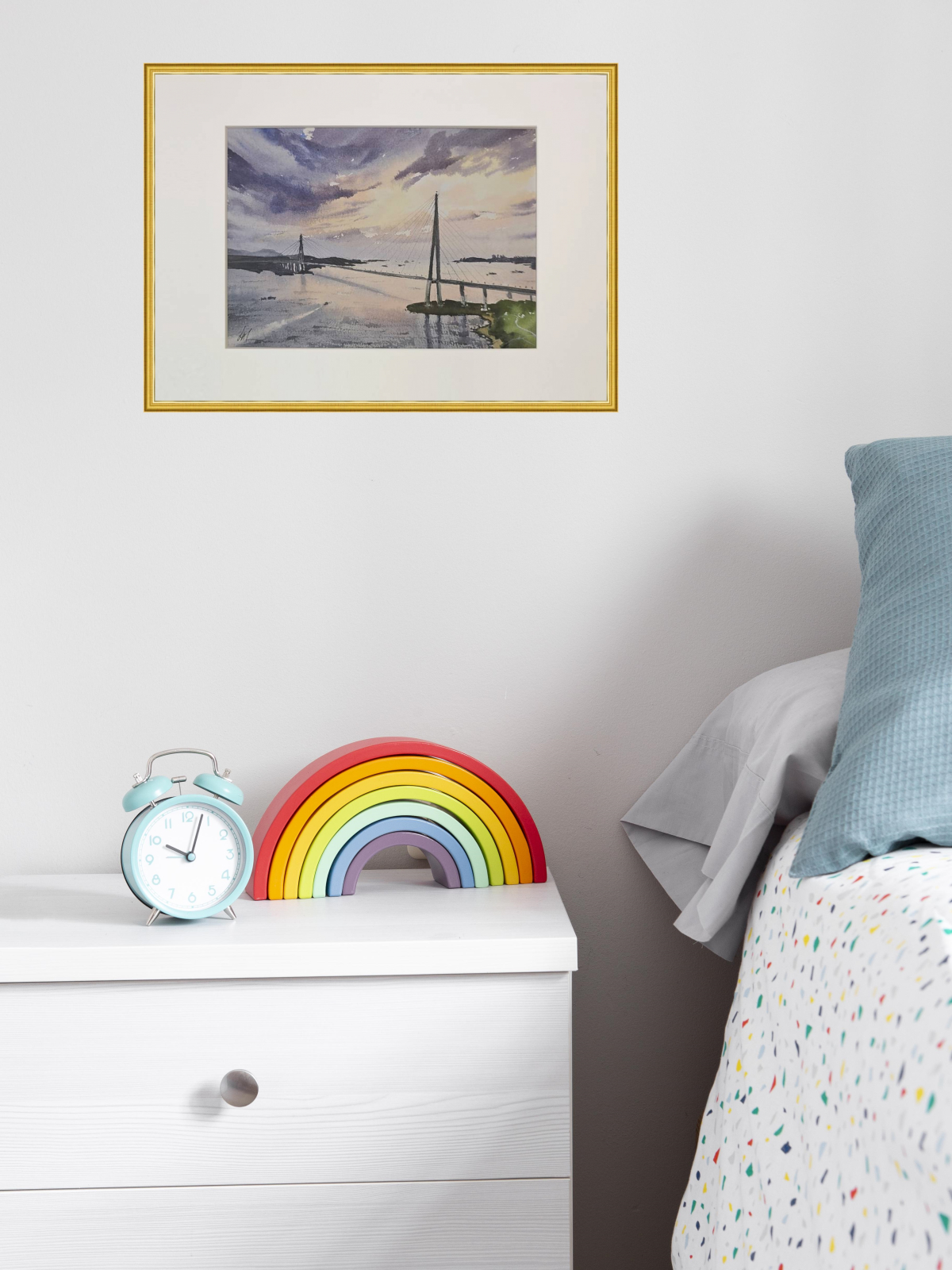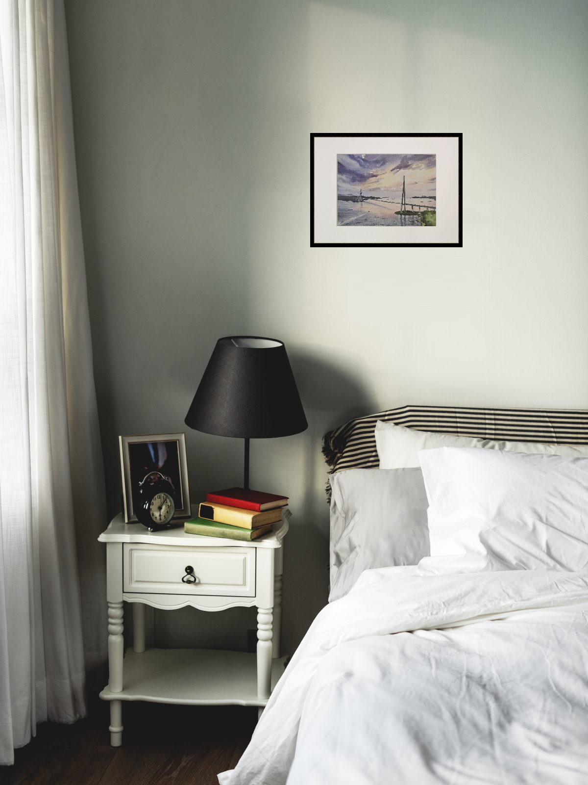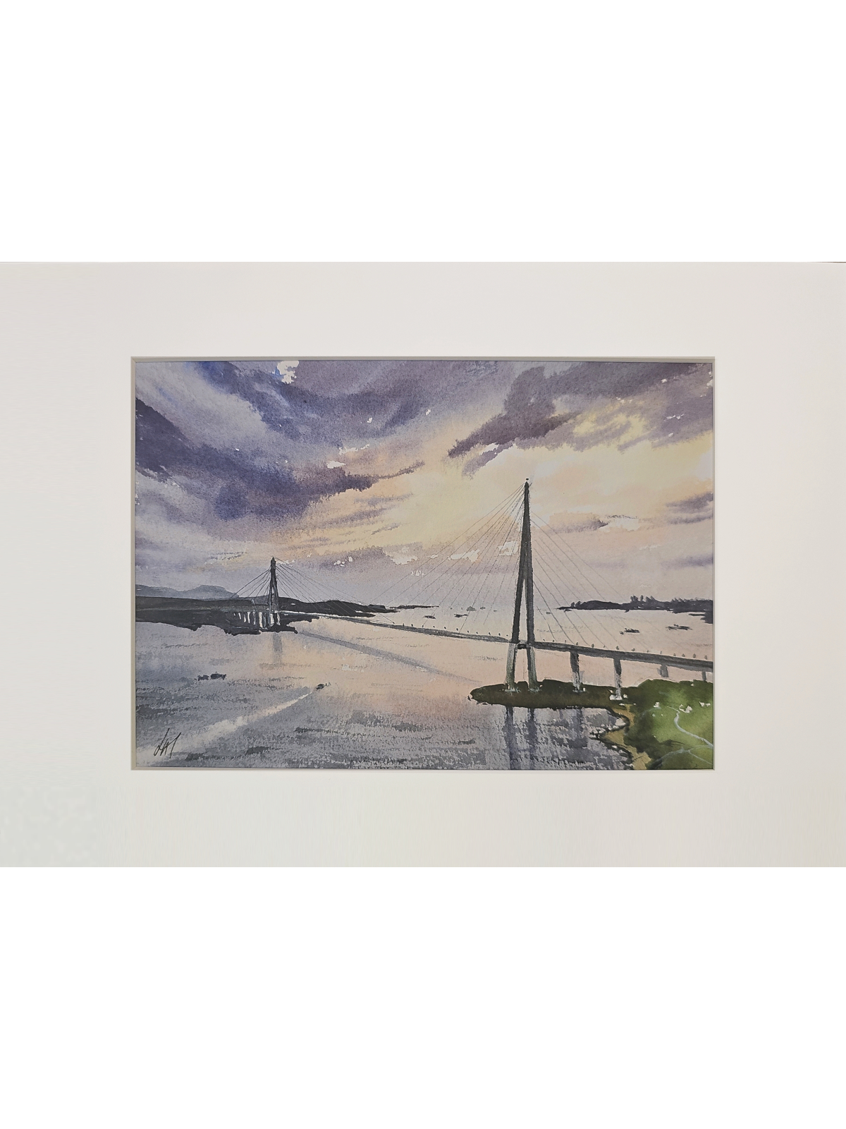 Нам представлена акварельная картина, изображающая мост, пересекающий водную гладь. Мост является вантовым с высокими опорами и натянутыми тросами. На заднем плане виднеются холмы и береговая линия. Вода отражает небо, которое окрашено в мягкие оттенки синего, фиолетового и розового, создавая атмосферу заката. Картина заключена в светлую рамку, что придаёт ей законченный вид. Картина создает атмосферу спокойствия и умиротворения. Работа оформлена в светлое паспарту и готова к размещению в раме 21*30 см.