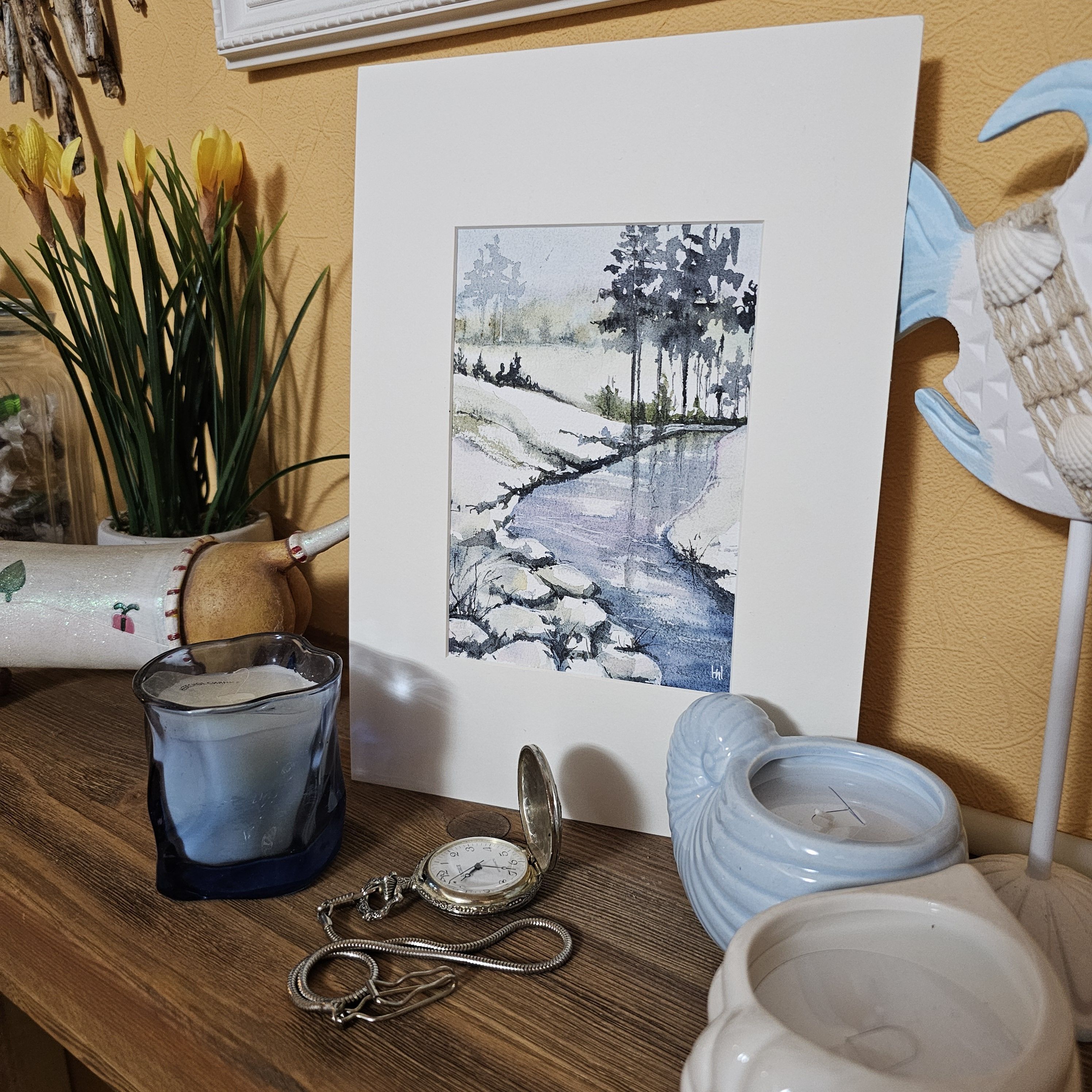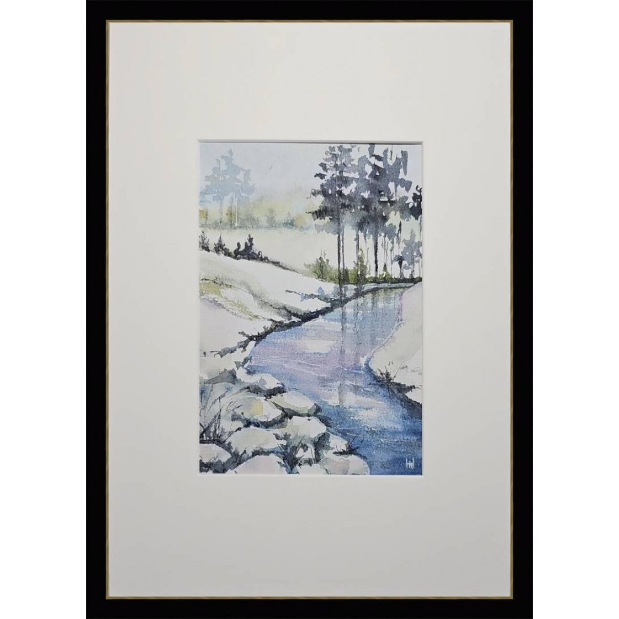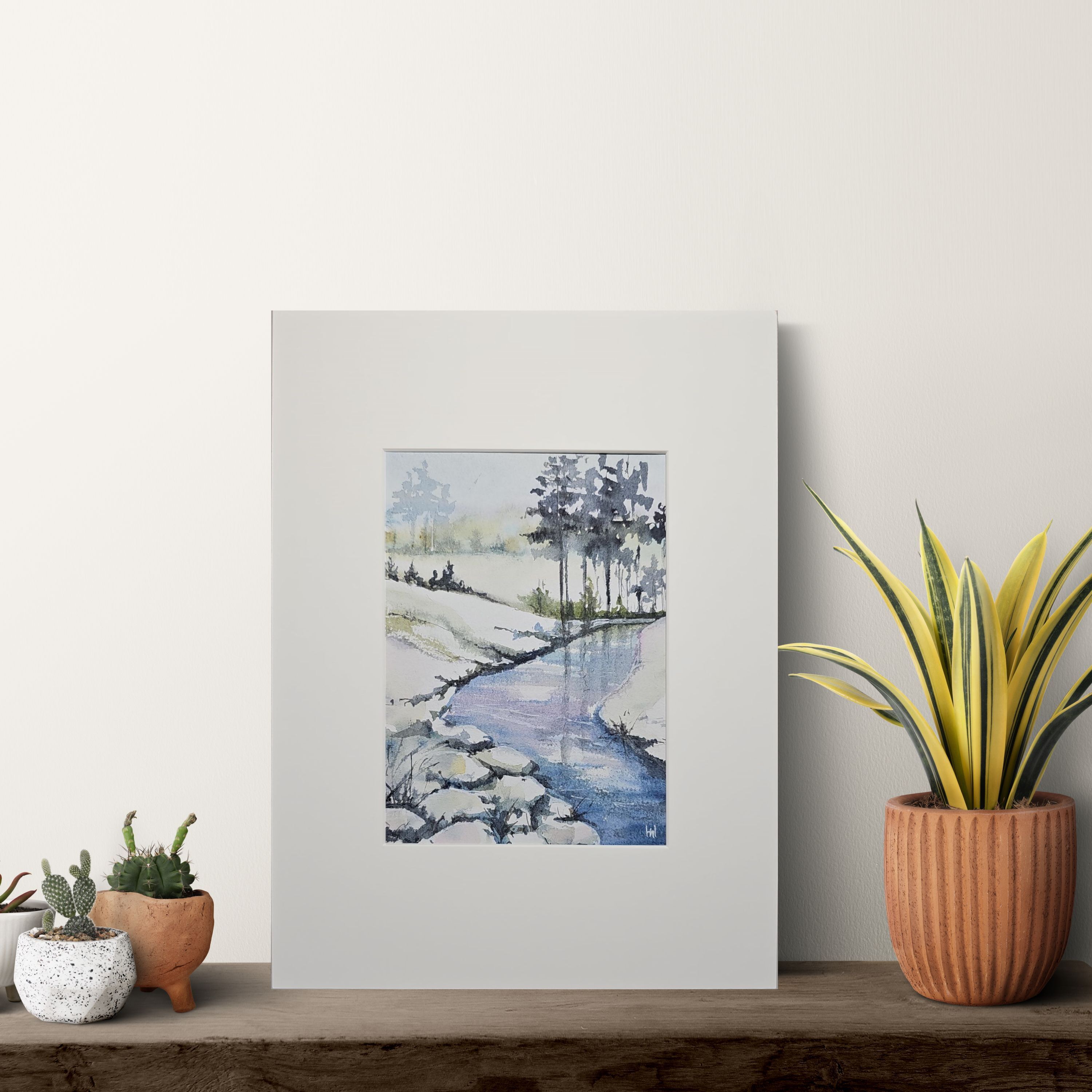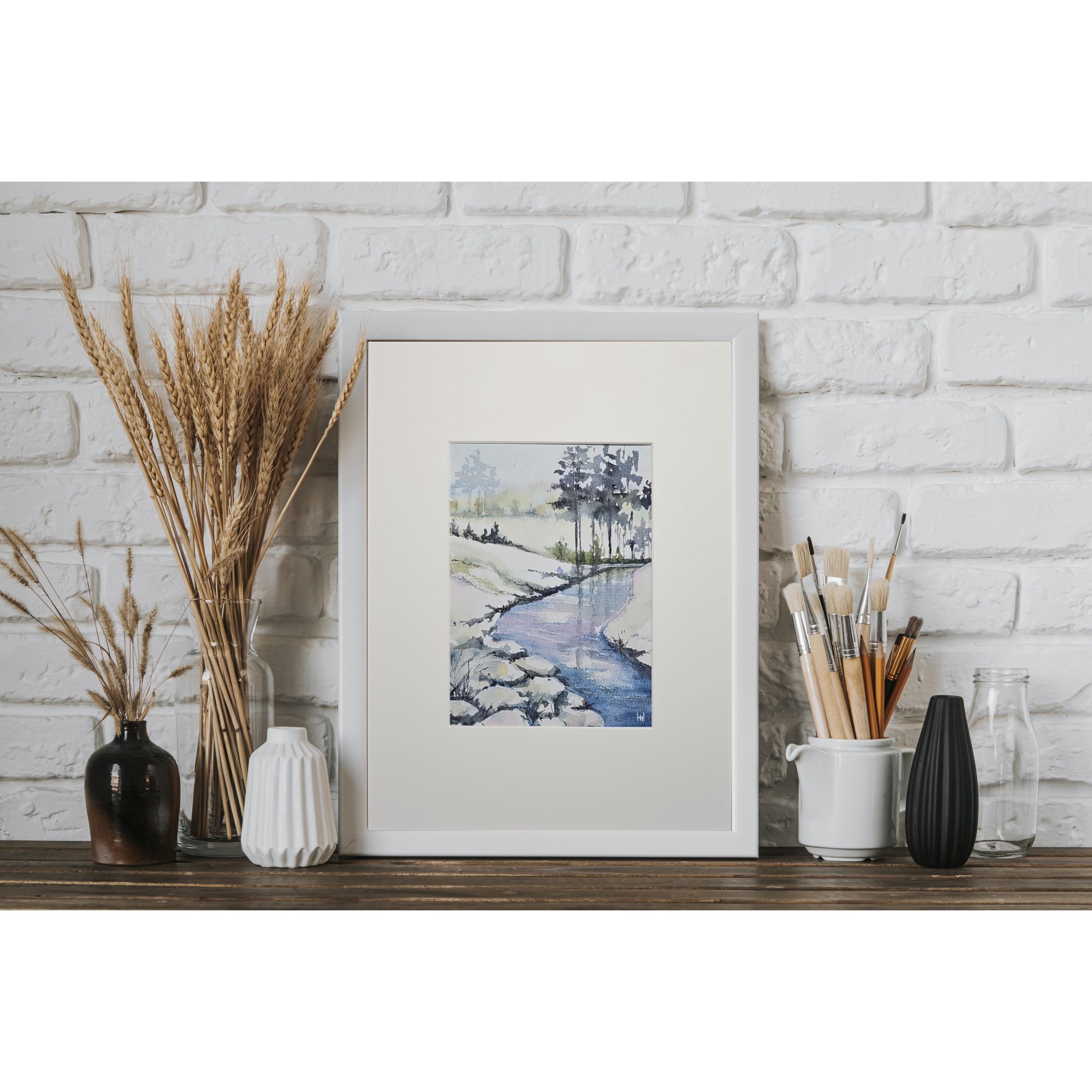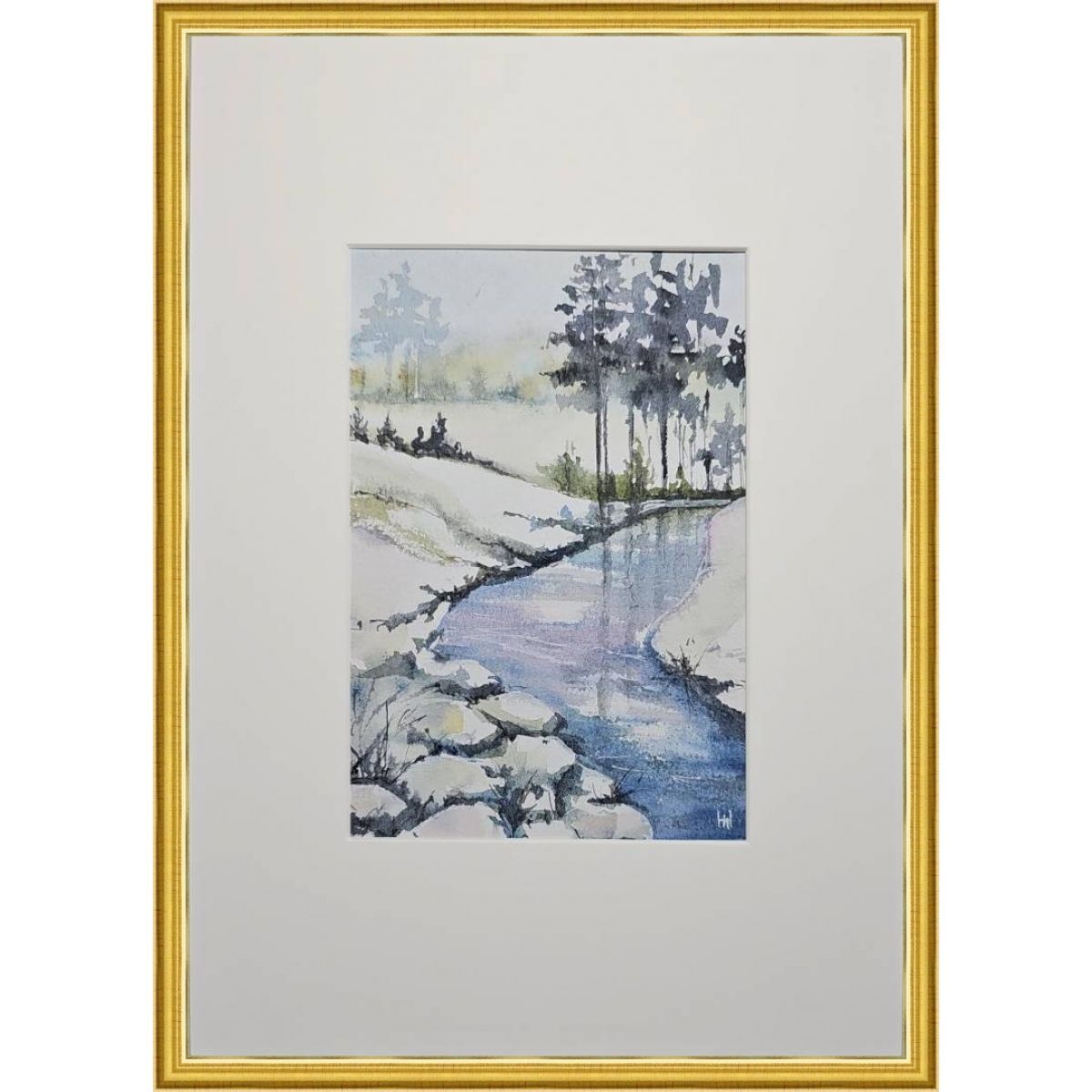 Нам представлена представлена акварельная картина зимнего пейзажа. На переднем плане изображён небольшой ручей или речка, покрытая льдом и снегом по берегам. Вдоль реки тянутся заснеженные берега с деревьями, некоторые из которых хвойные. Картина выполнена в холодных тонах, создающих ощущение зимней свежести и покоя. Фон слегка размытый, что добавляет глубину и акцентирует внимание на центральной части с водоёмом и деревьями. Работа оформлена в светлое паспарту, что подчеркивает её зимнюю тематику и готова к размещению в раме 21*30 см.