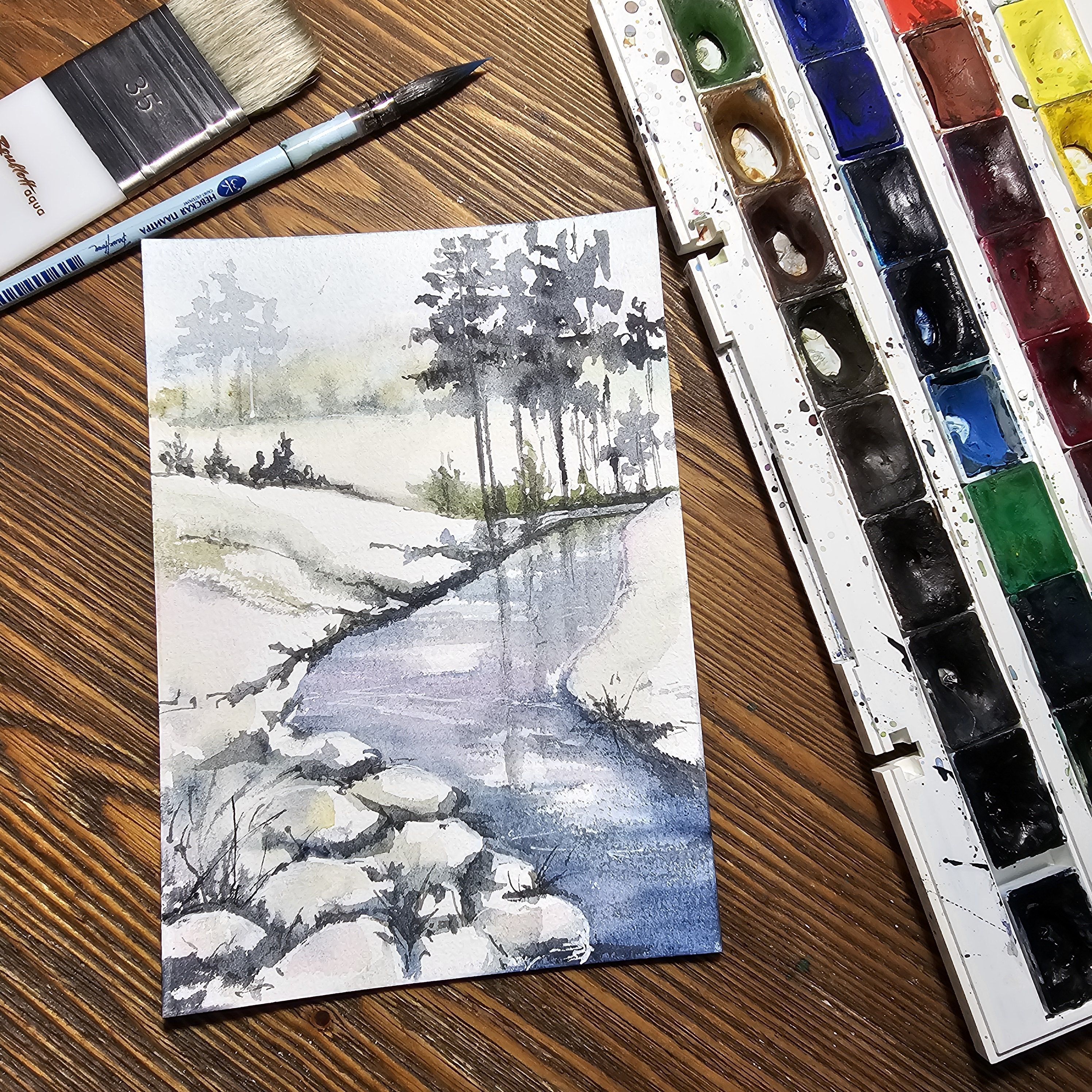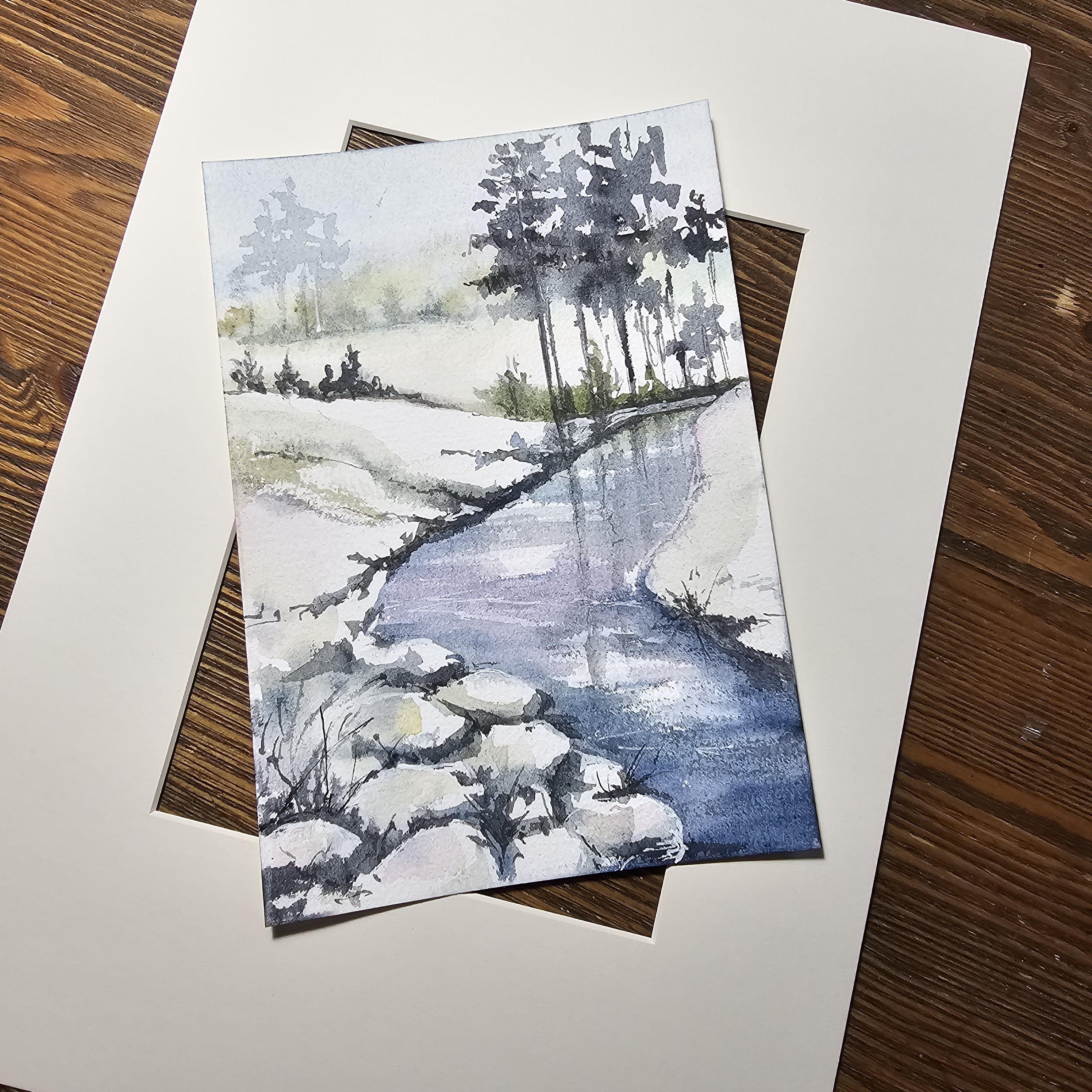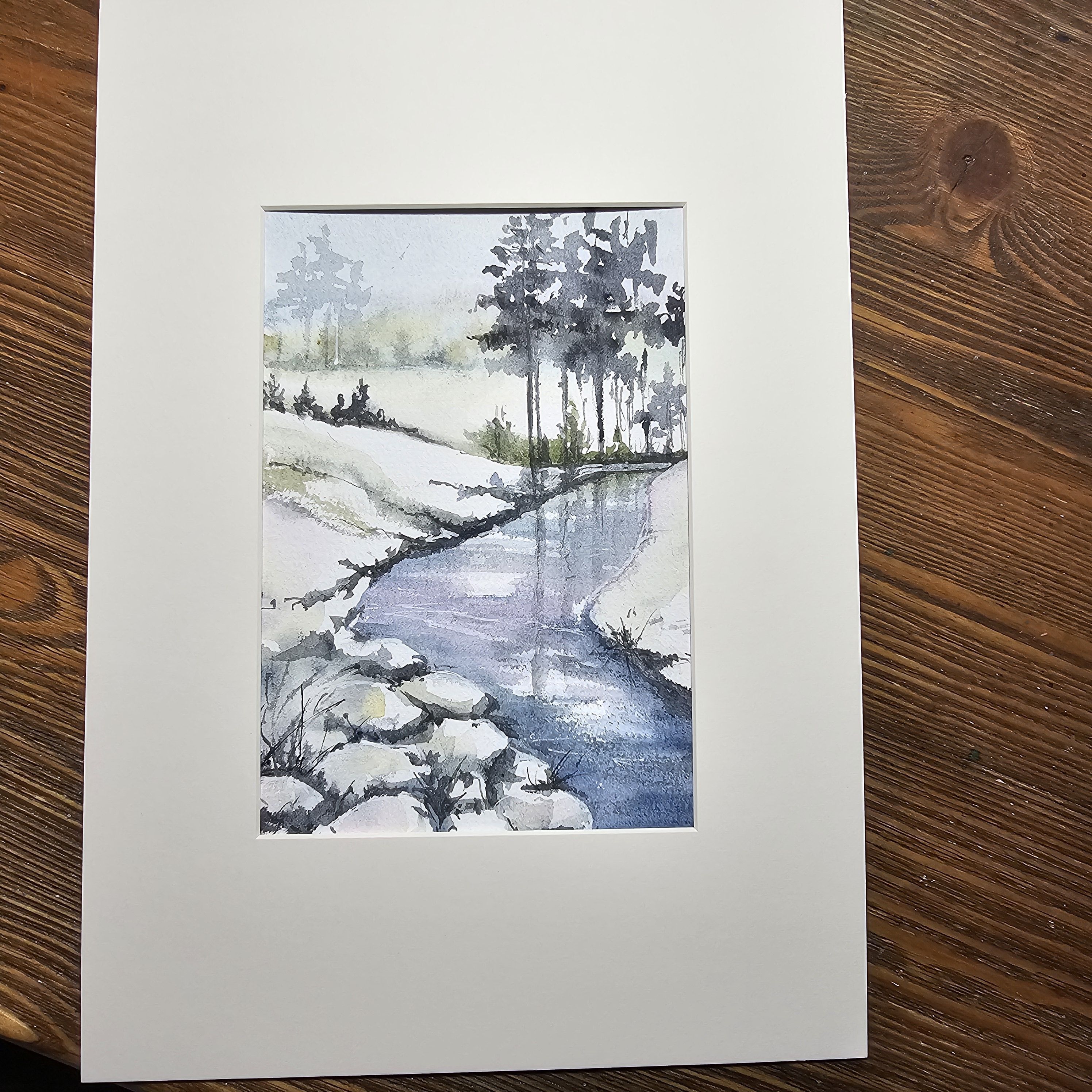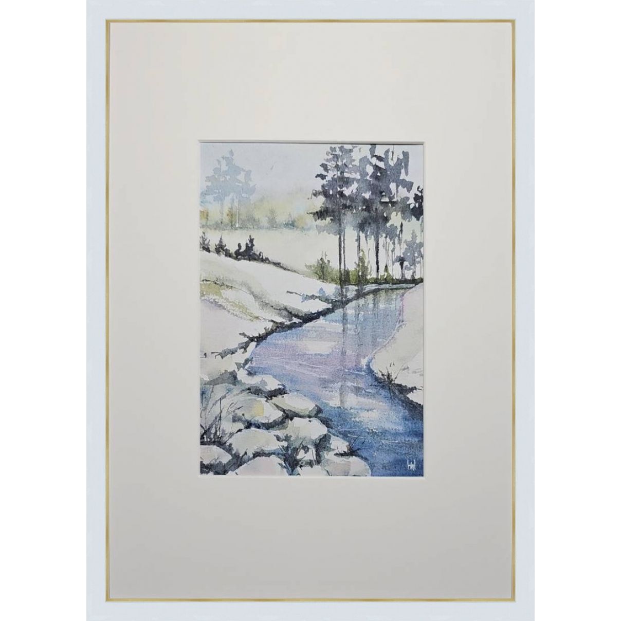 Нам представлена представлена акварельная картина зимнего пейзажа. На переднем плане изображён небольшой ручей или речка, покрытая льдом и снегом по берегам. Вдоль реки тянутся заснеженные берега с деревьями, некоторые из которых хвойные. Картина выполнена в холодных тонах, создающих ощущение зимней свежести и покоя. Фон слегка размытый, что добавляет глубину и акцентирует внимание на центральной части с водоёмом и деревьями. Работа оформлена в светлое паспарту, что подчеркивает её зимнюю тематику и готова к размещению в раме 21*30 см.