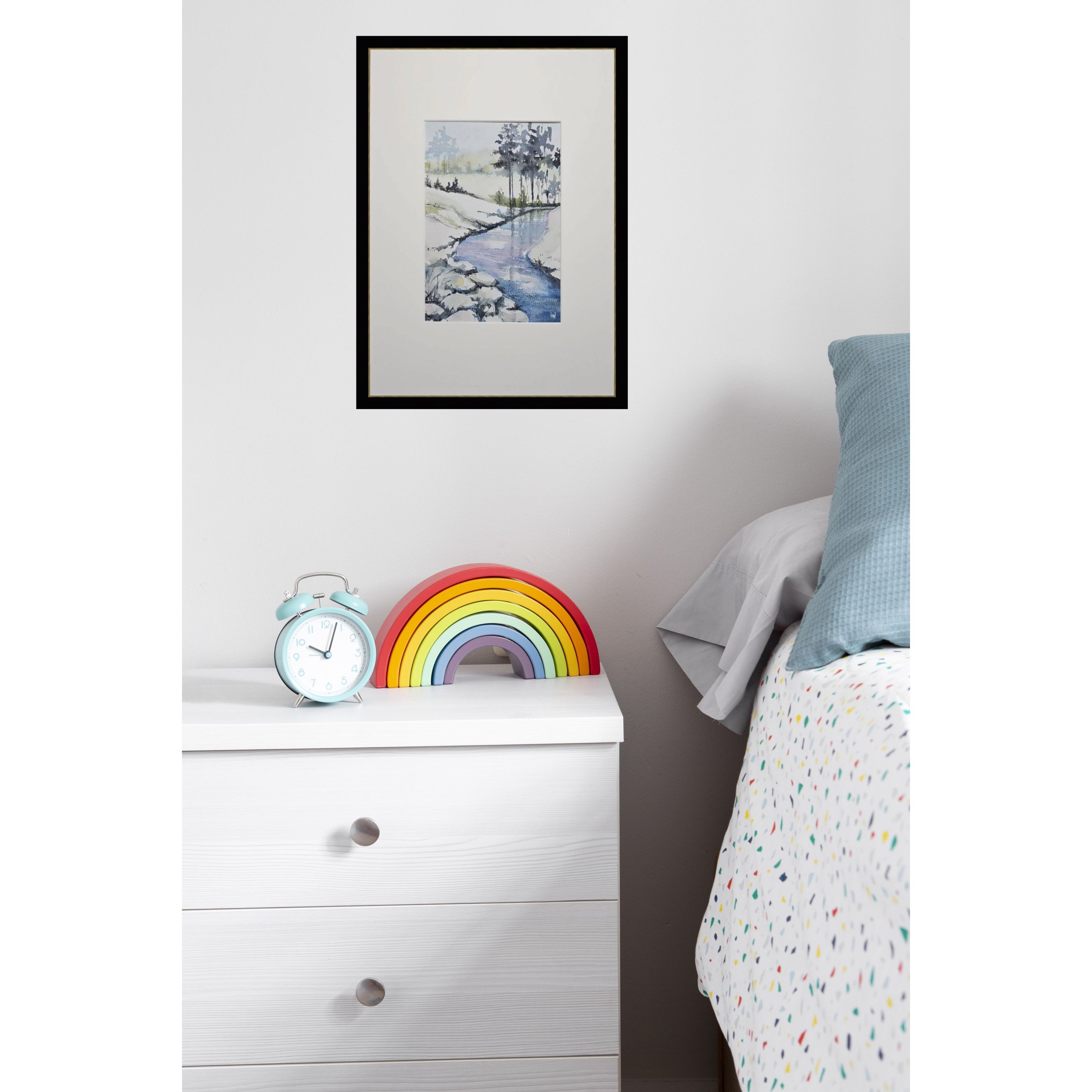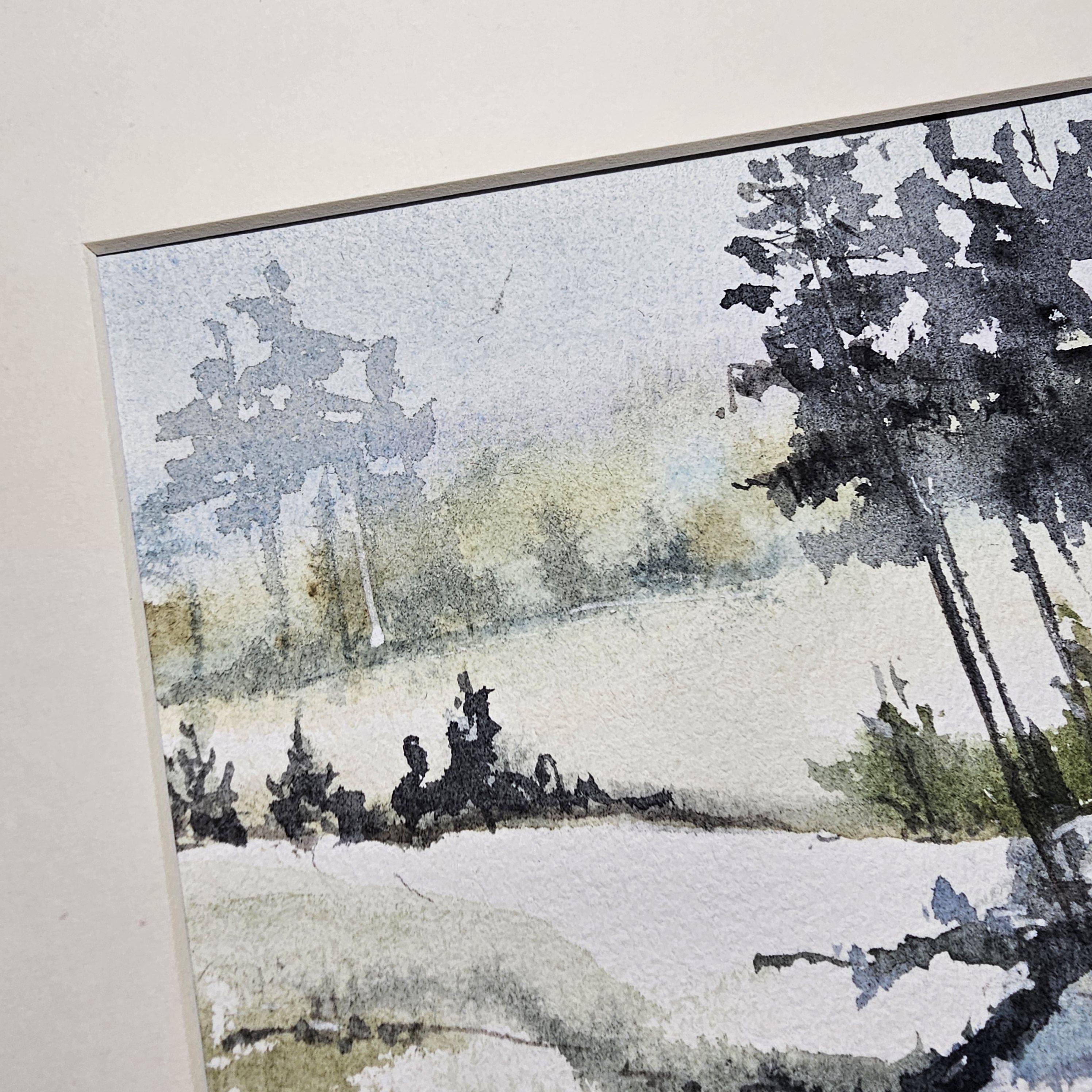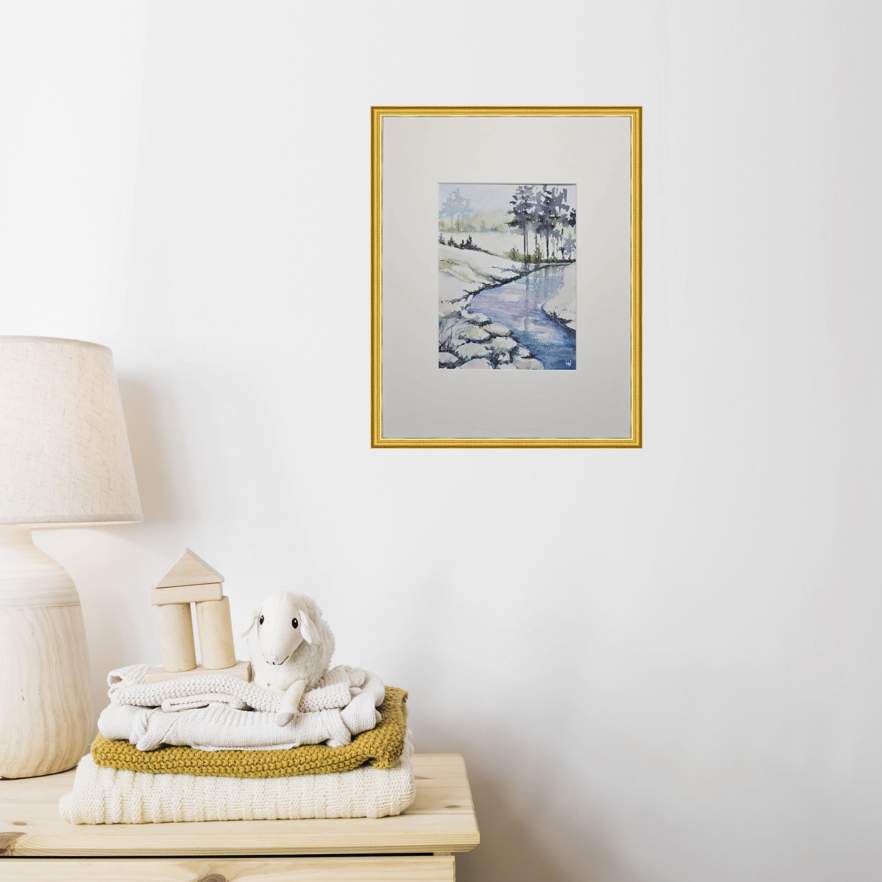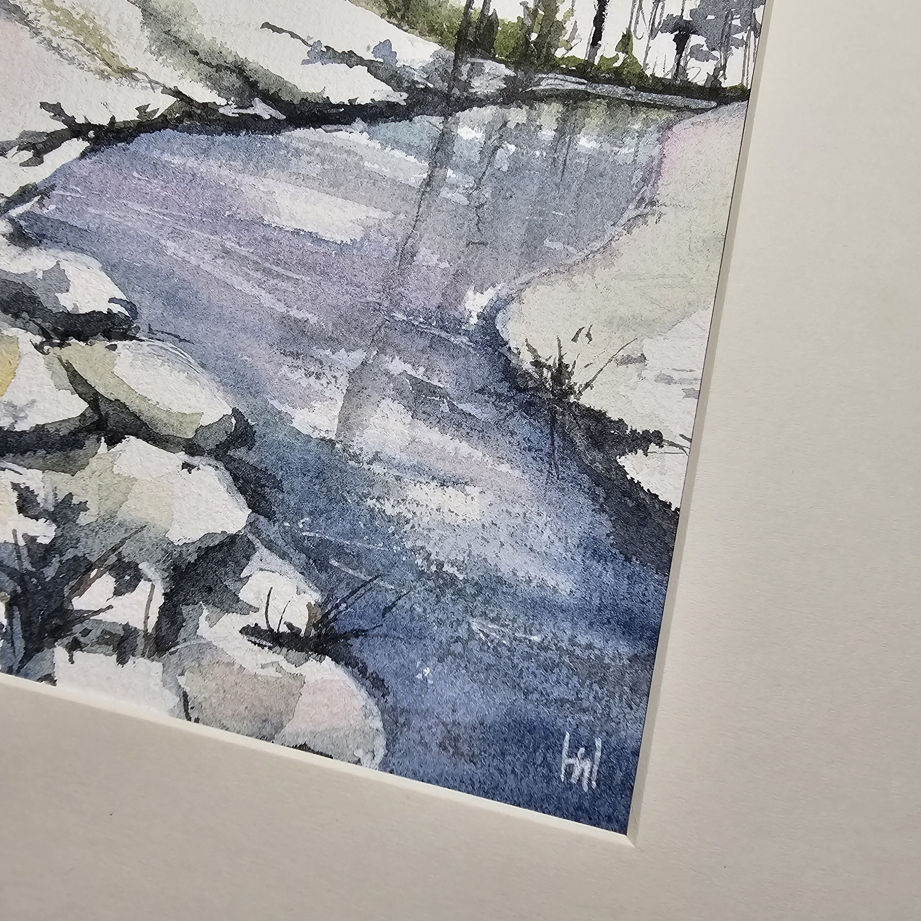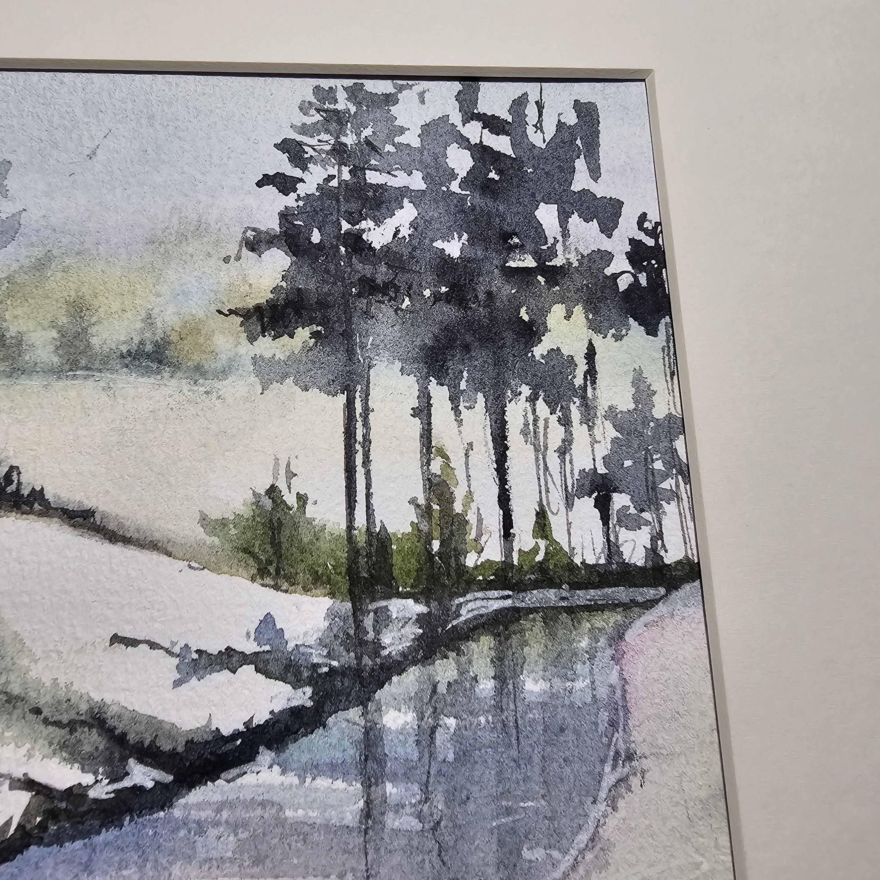 Нам представлена представлена акварельная картина зимнего пейзажа. На переднем плане изображён небольшой ручей или речка, покрытая льдом и снегом по берегам. Вдоль реки тянутся заснеженные берега с деревьями, некоторые из которых хвойные. Картина выполнена в холодных тонах, создающих ощущение зимней свежести и покоя. Фон слегка размытый, что добавляет глубину и акцентирует внимание на центральной части с водоёмом и деревьями. Работа оформлена в светлое паспарту, что подчеркивает её зимнюю тематику и готова к размещению в раме 21*30 см.