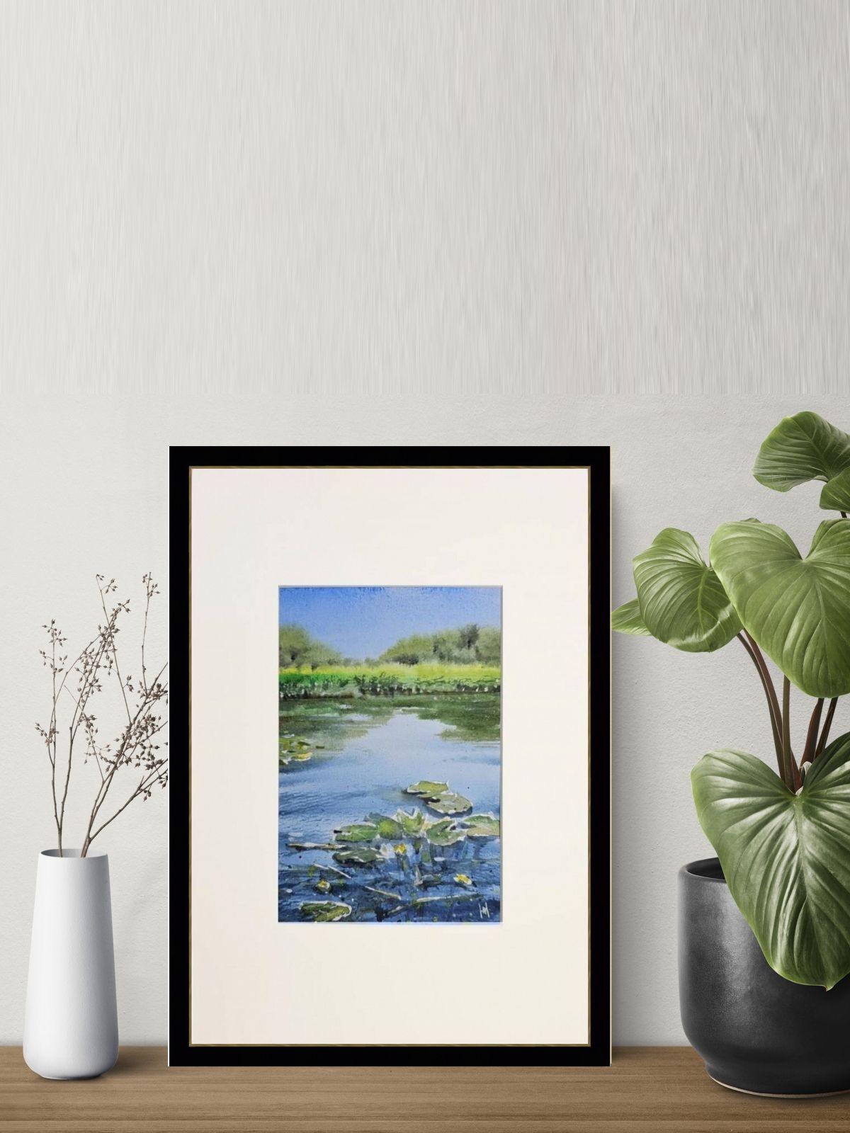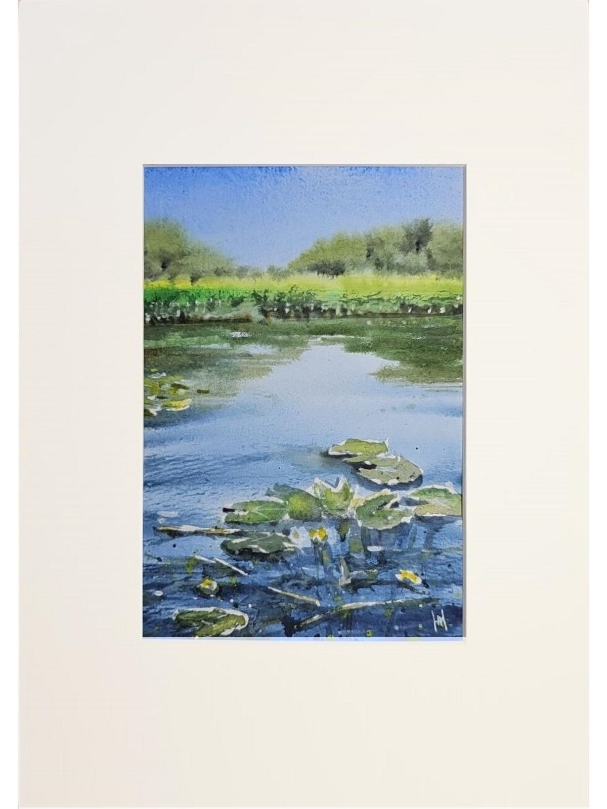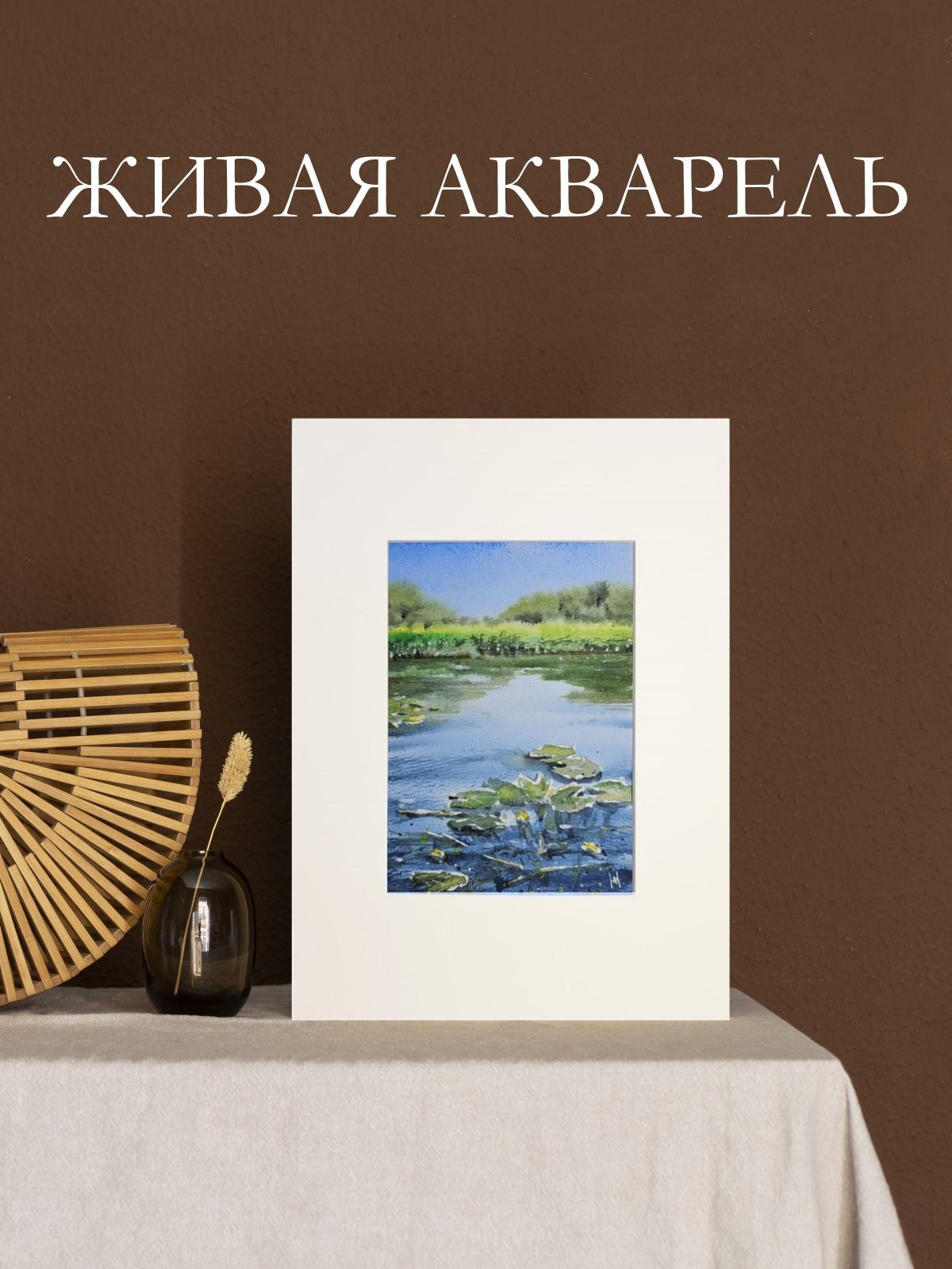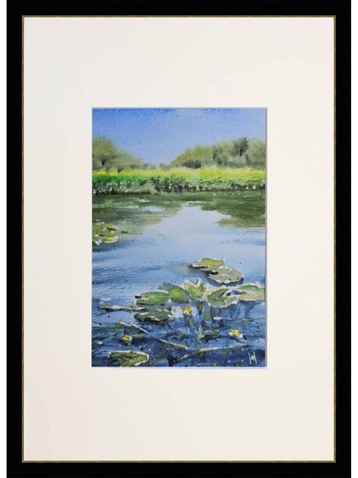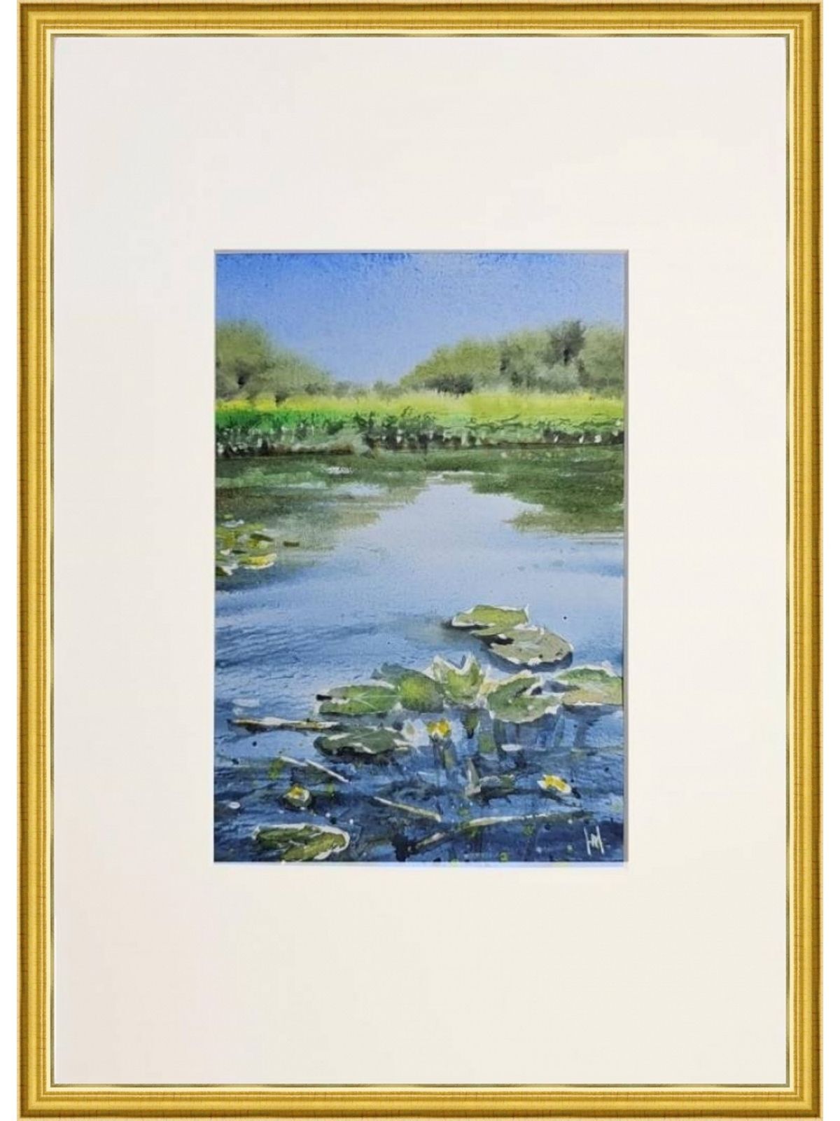 Нам представлена акварельная картина с пейзажем. В центре изображен водоём с кувшинками и отражением растительности на воде. Видны зелёные листья кувшинок, некоторые из которых с цветами. Вдали на заднем плане изображены густые зелёные деревья и кусты. Небо ясное и голубое, что указывает на солнечную погоду. Картина окружена широким светлым паспарту, подчеркивающей центральный рисунок и готова к размещению в раме 21*30 см.