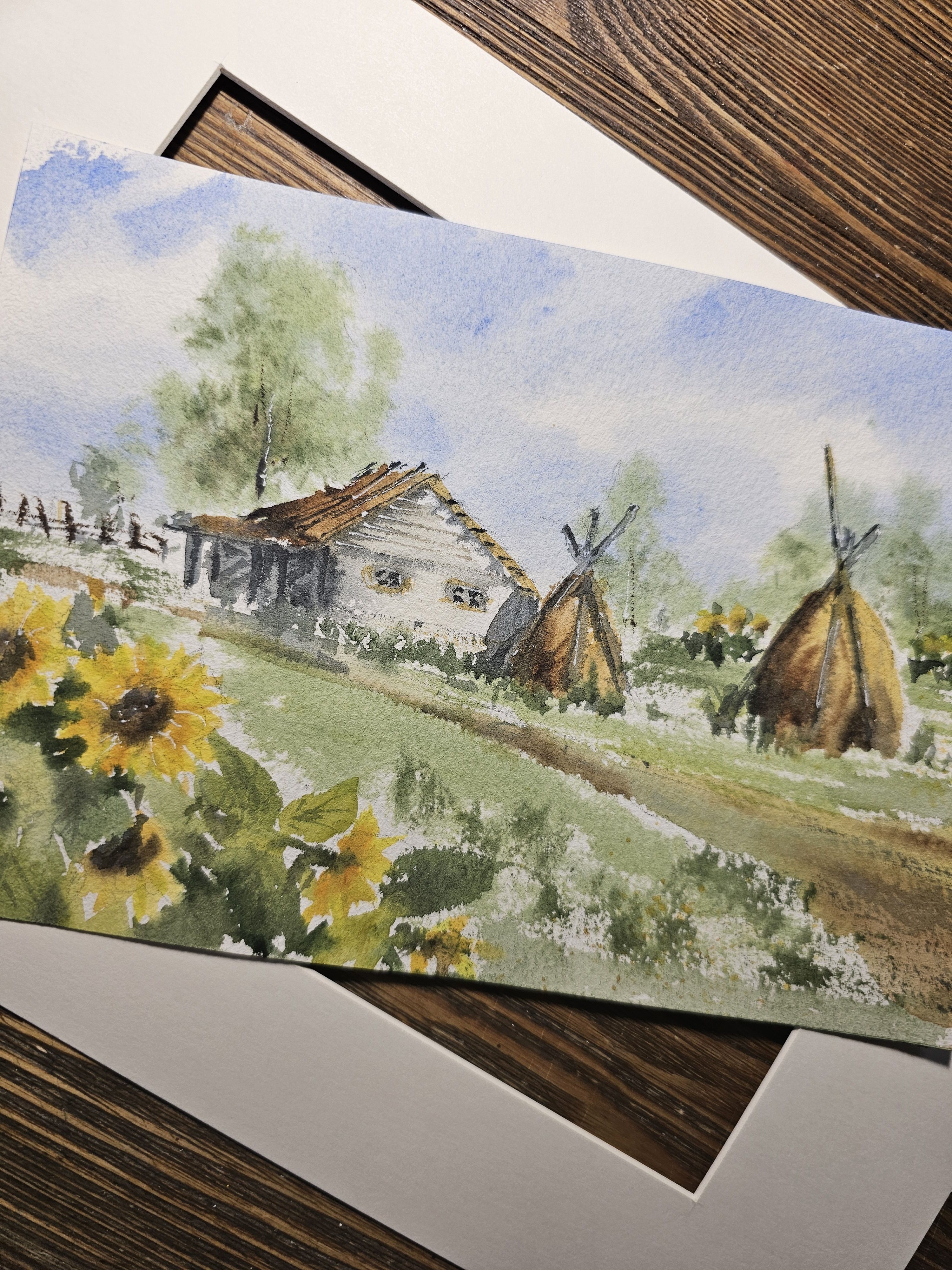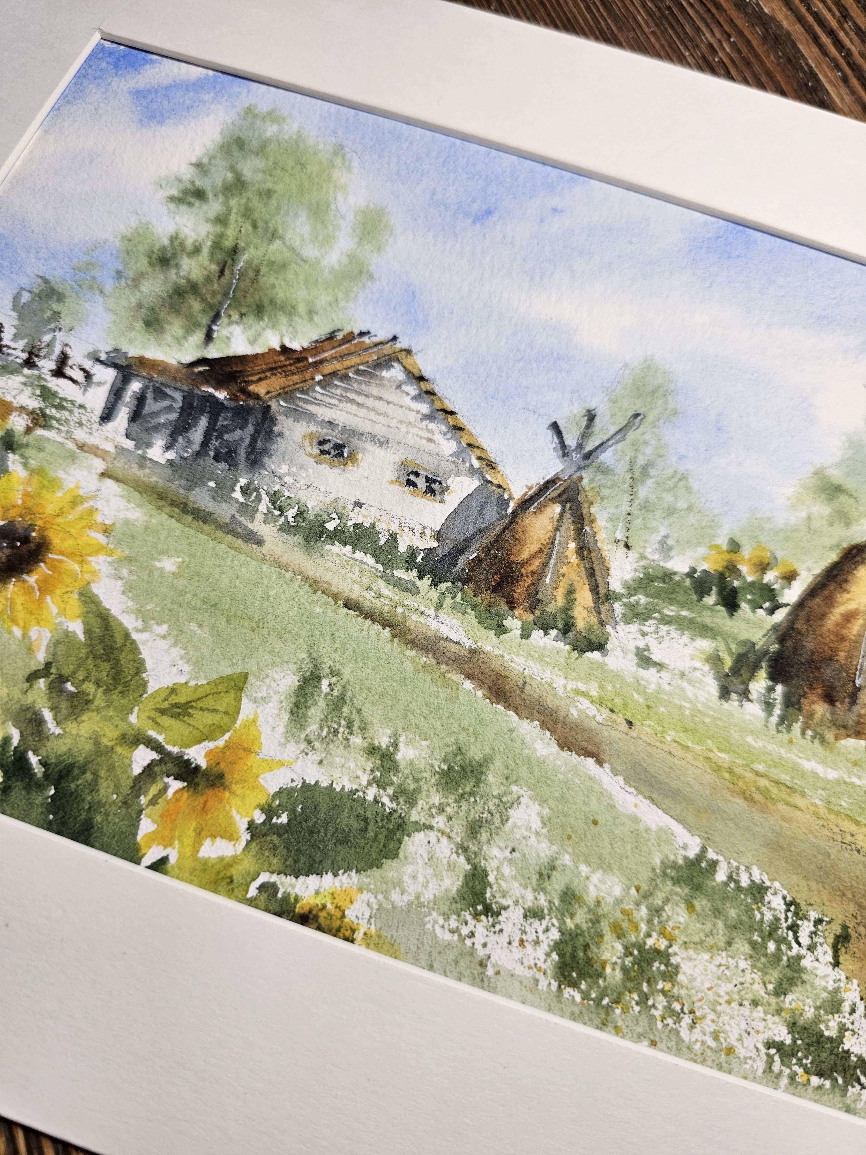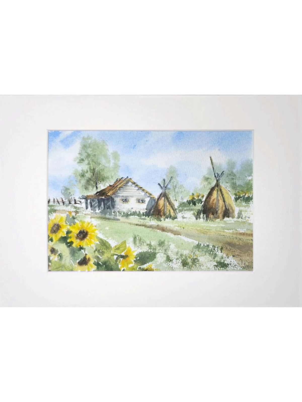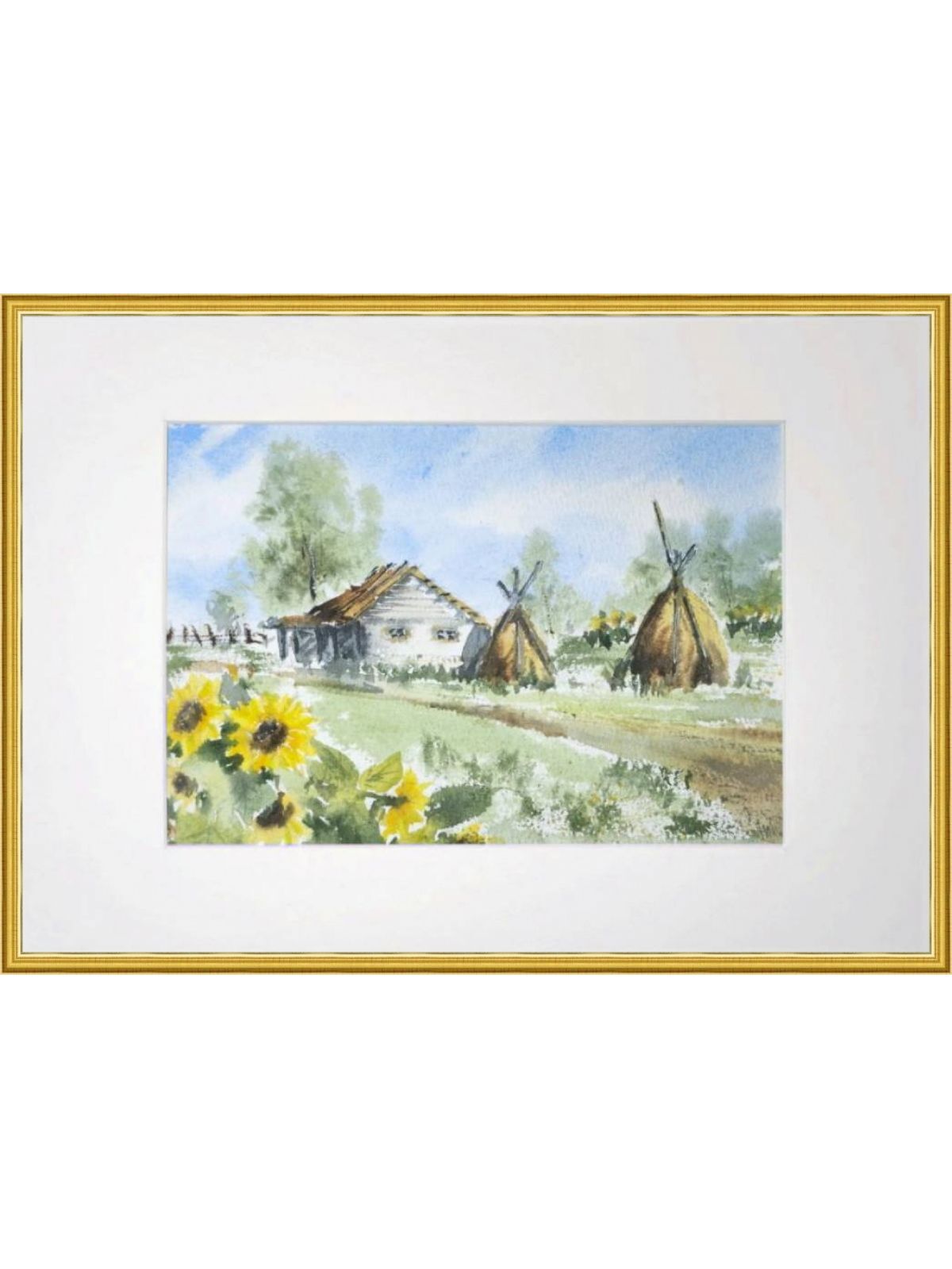 Нам представлена акварельная картина сельского пейзажа. На переднем плане видно несколько ярких подсолнухов. Центральный элемент композиции - деревянный дом с соломенной крышей. Рядом с домом находятся две стога сена, которые стоят на зеленой траве. На заднем плане видны деревья, создающие основу для фона. Небо на картине ясное, с лёгкими облаками, что придаёт сцене спокойное и живописное ощущение.