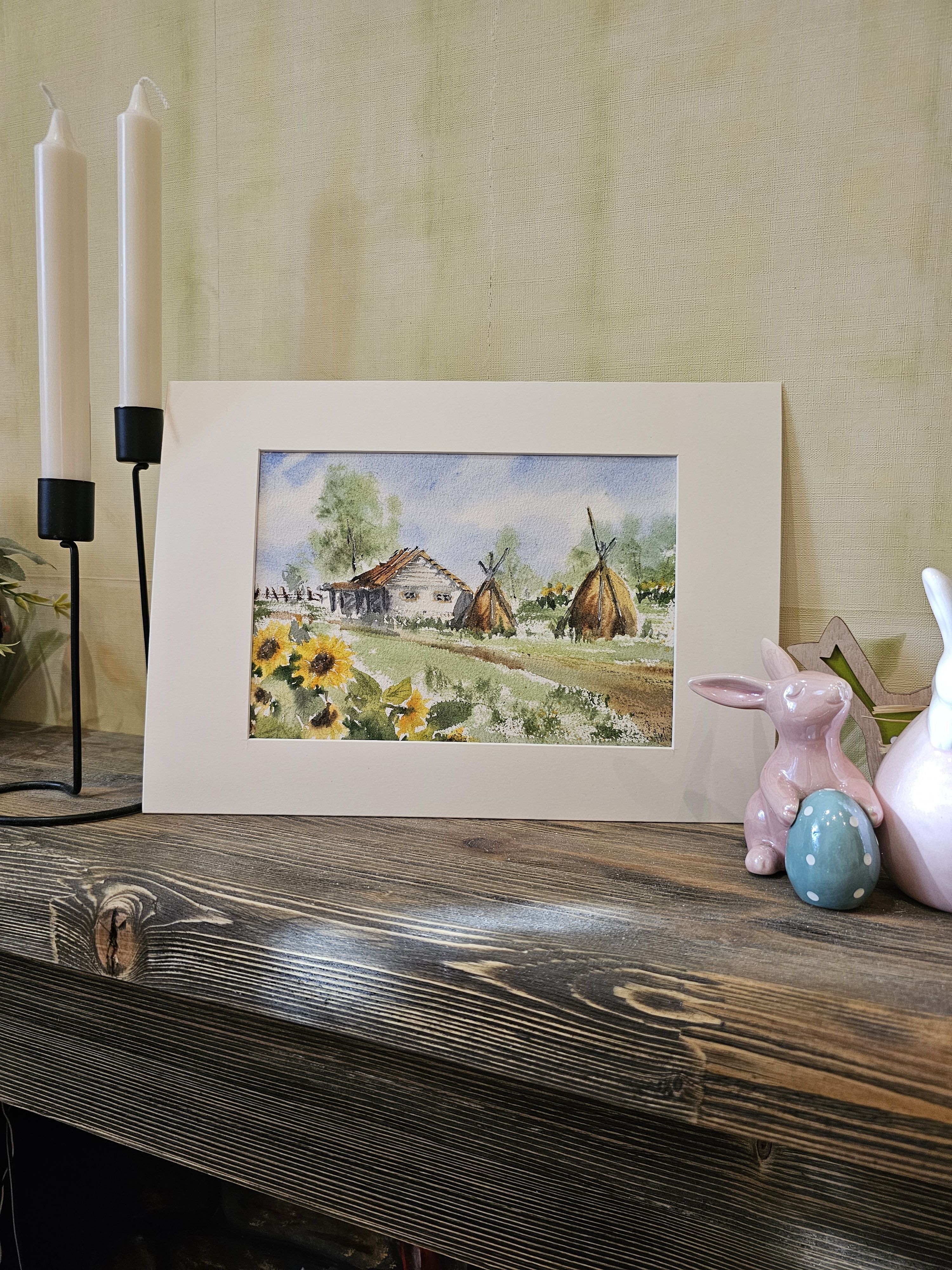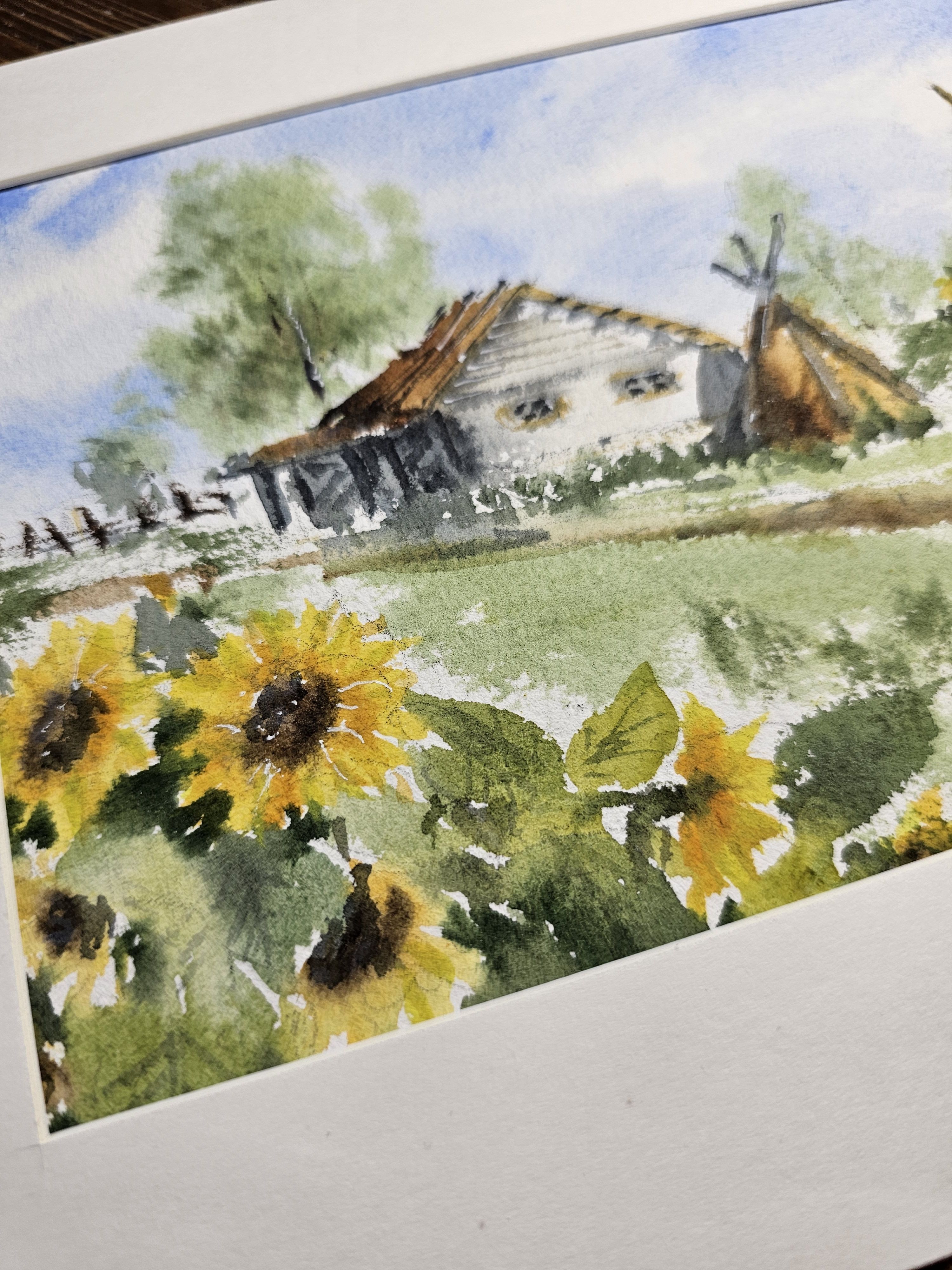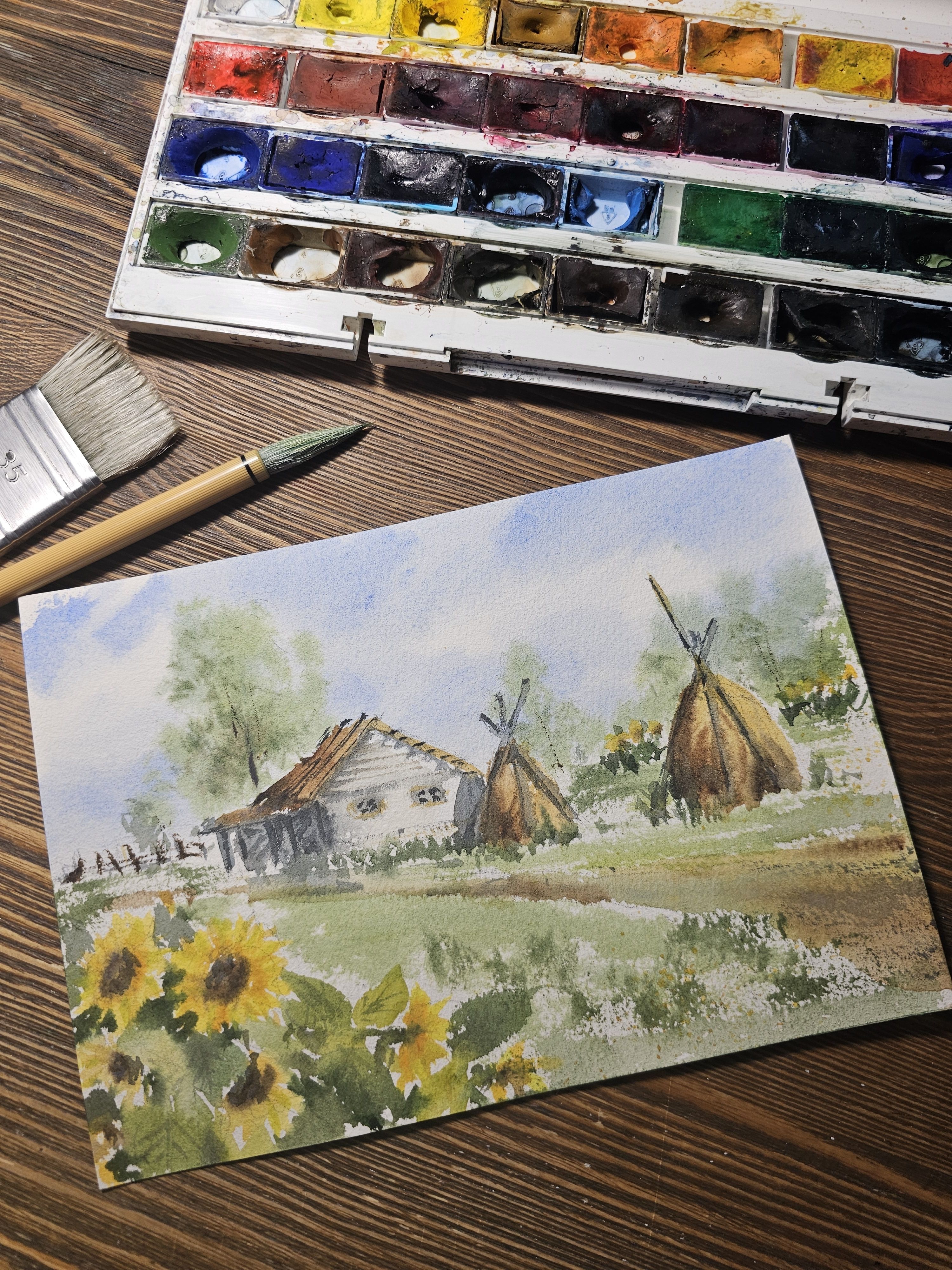 Нам представлена акварельная картина сельского пейзажа. На переднем плане видно несколько ярких подсолнухов. Центральный элемент композиции - деревянный дом с соломенной крышей. Рядом с домом находятся две стога сена, которые стоят на зеленой траве. На заднем плане видны деревья, создающие основу для фона. Небо на картине ясное, с лёгкими облаками, что придаёт сцене спокойное и живописное ощущение.