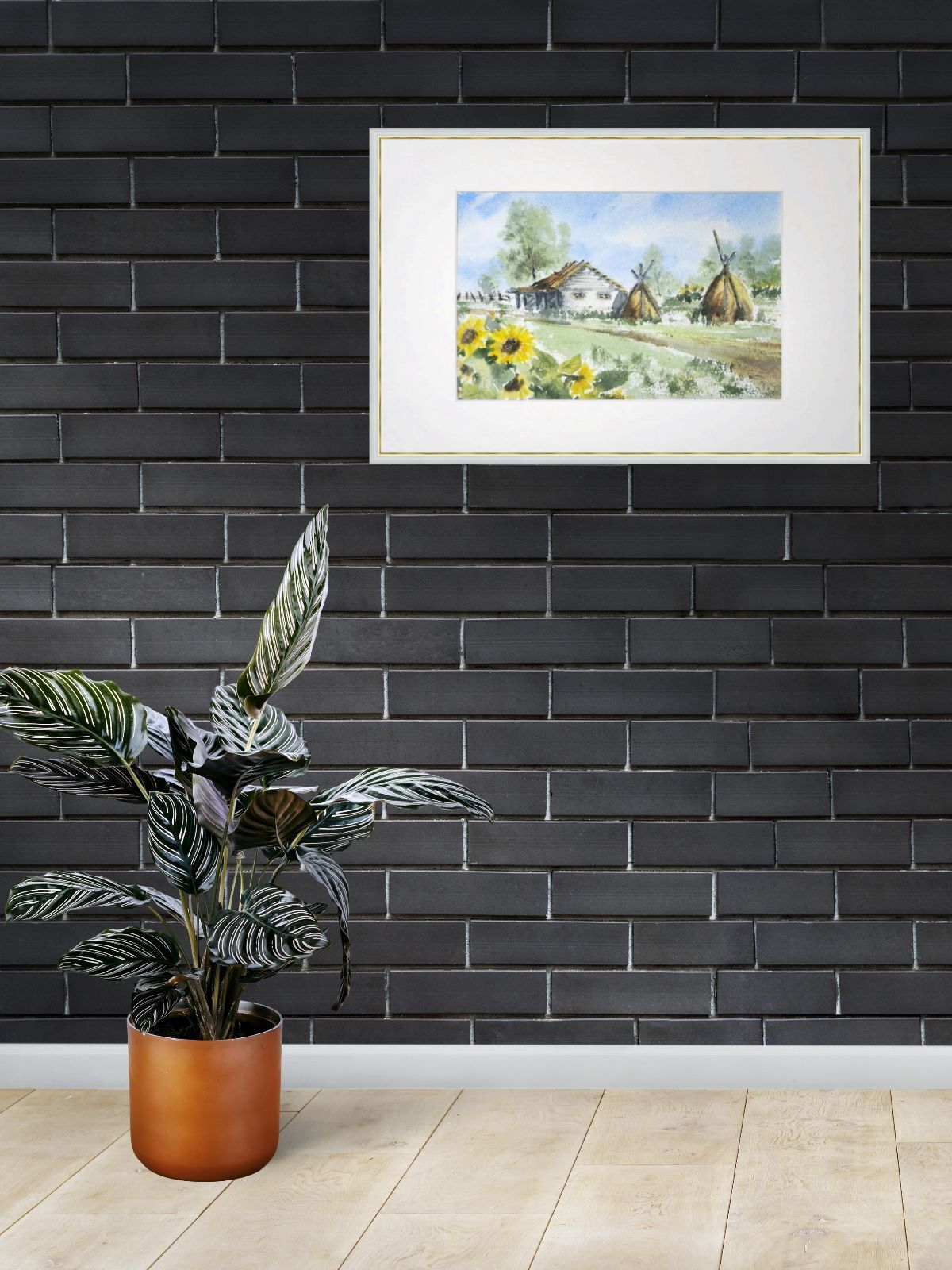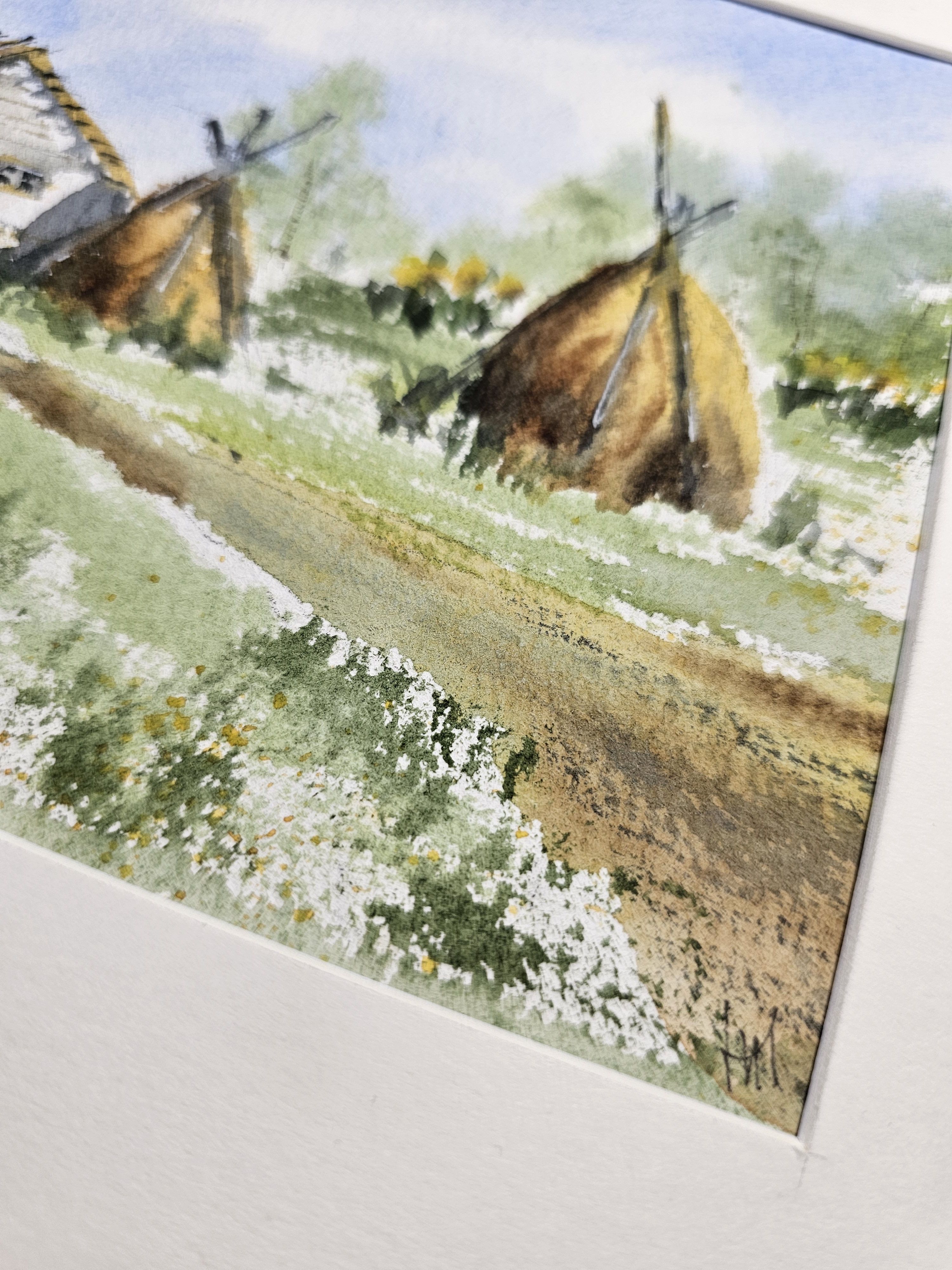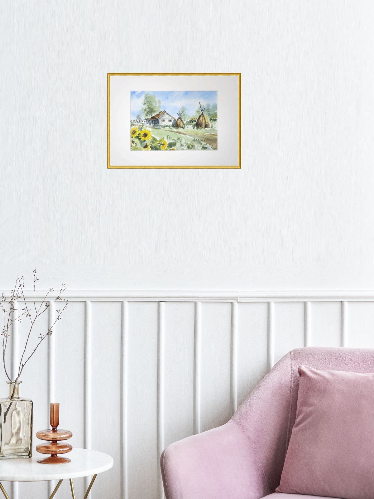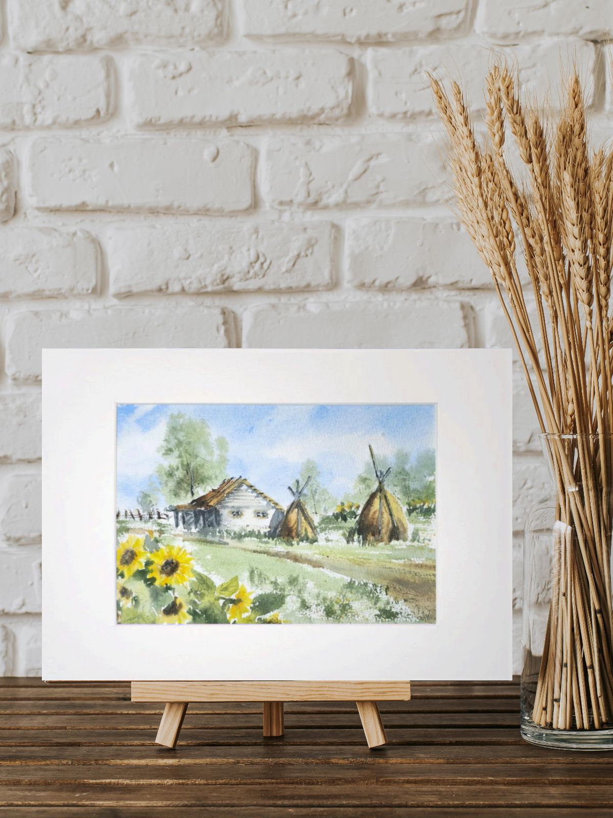 Нам представлена акварельная картина сельского пейзажа. На переднем плане видно несколько ярких подсолнухов. Центральный элемент композиции - деревянный дом с соломенной крышей. Рядом с домом находятся две стога сена, которые стоят на зеленой траве. На заднем плане видны деревья, создающие основу для фона. Небо на картине ясное, с лёгкими облаками, что придаёт сцене спокойное и живописное ощущение.