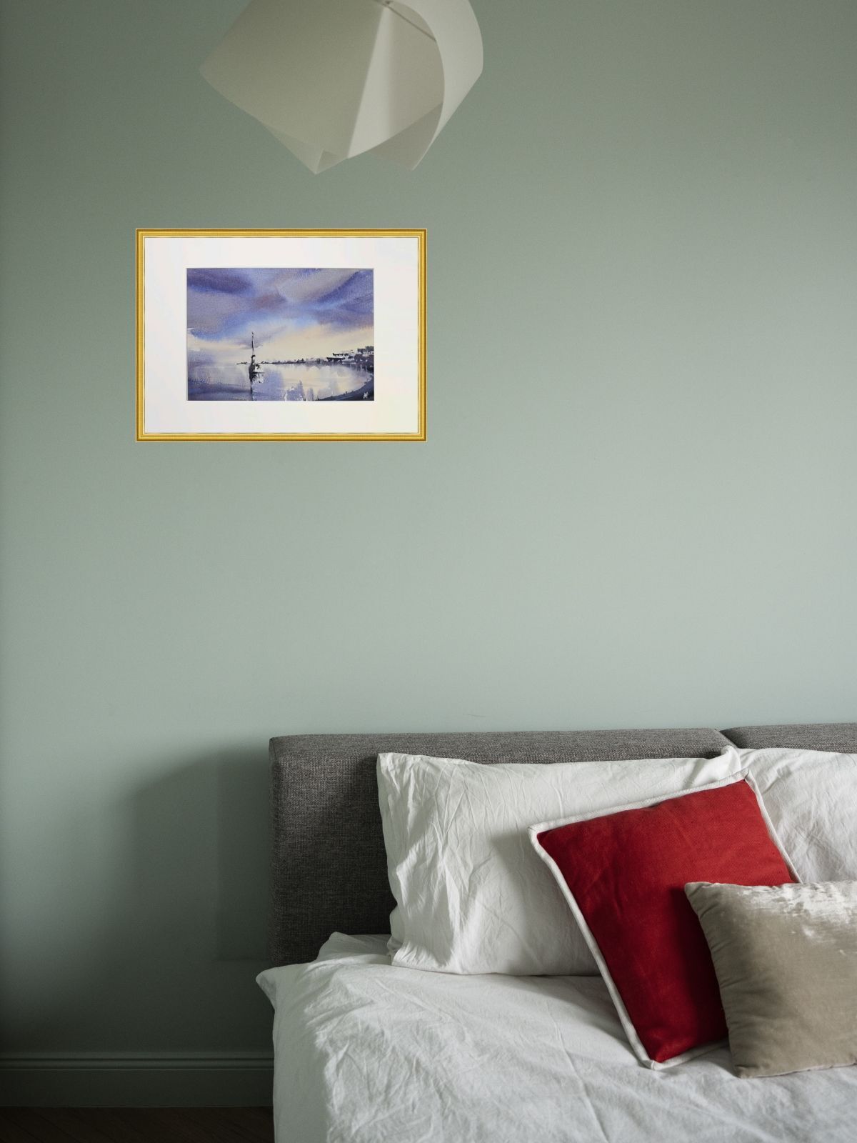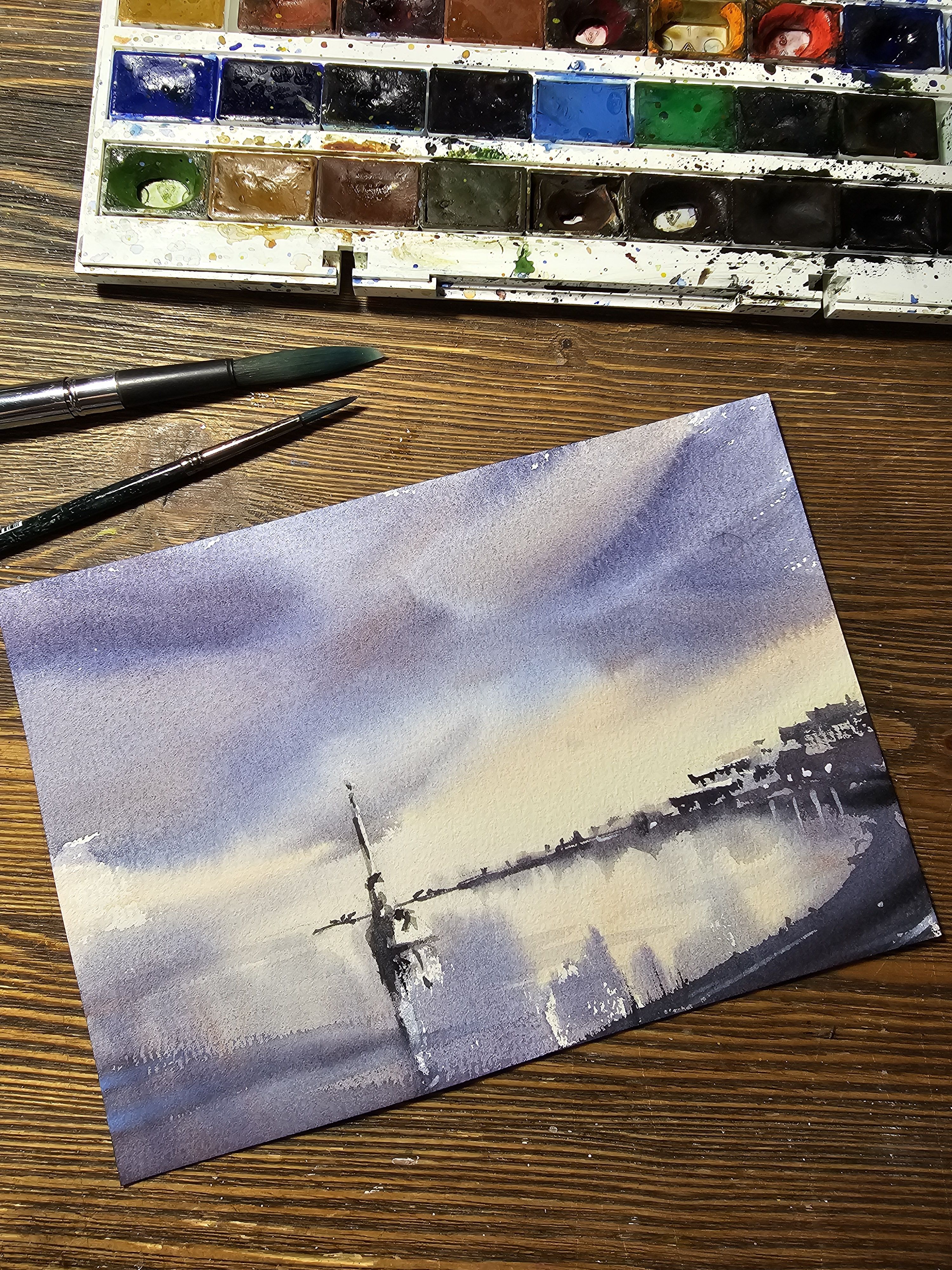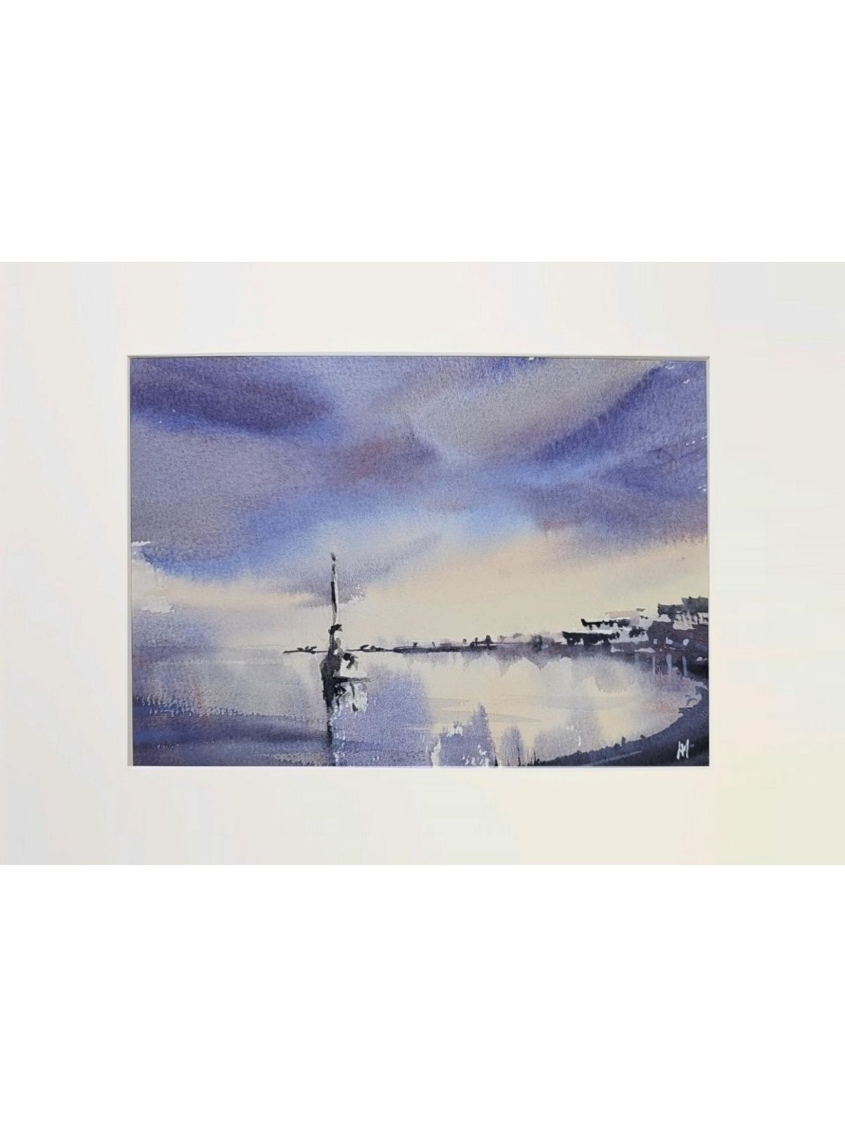 Нам представлена акварельная картина, выполненная в синих и фиолетовых оттенках. Она изображает вечернюю бухту Севастополя с отражением неба и окружающего ландшафта на поверхности воды. На среднем плане виднеется памятник Затопленным кораблям, возвышающееся над водой. На заднем плане видны темные силуэты береговой линии. Общая атмосфера картины спокойная и гармоничная.