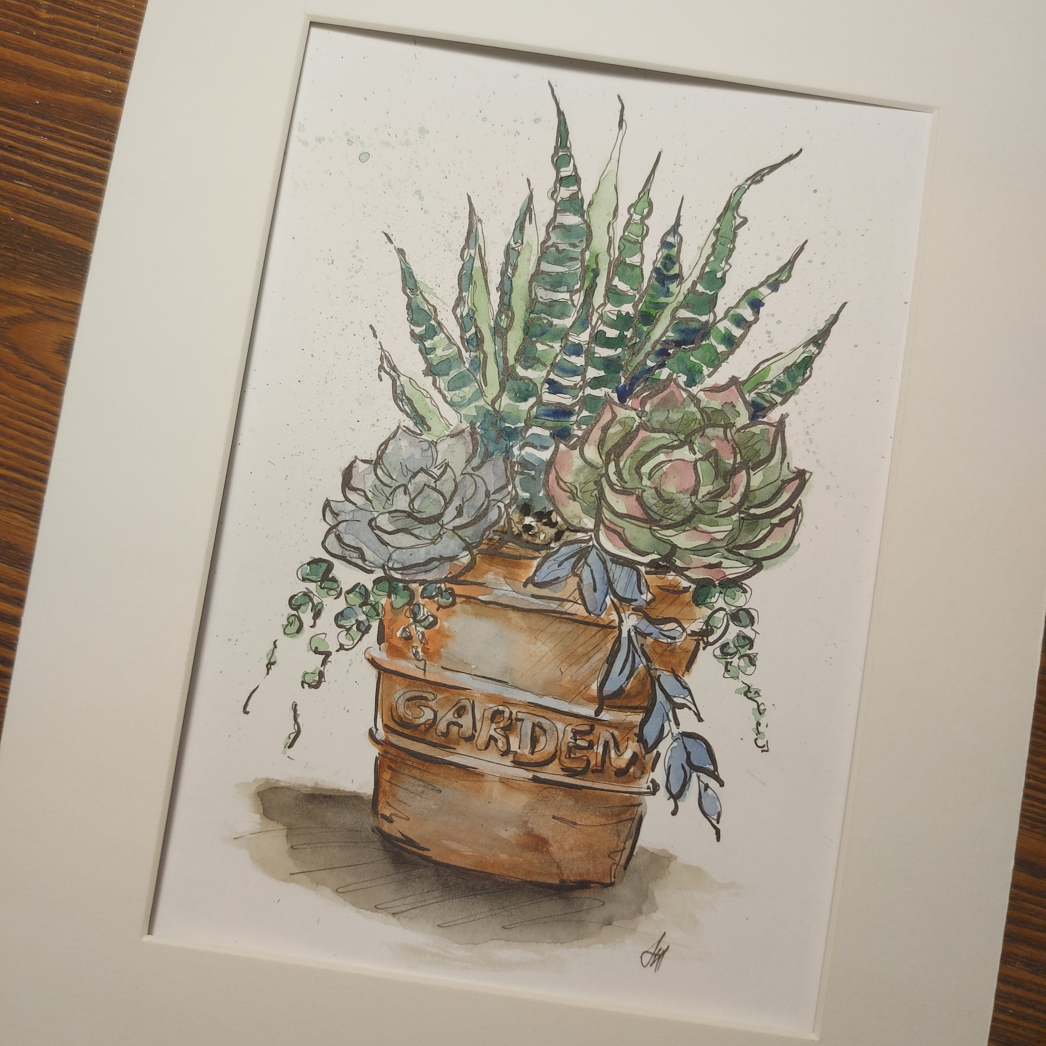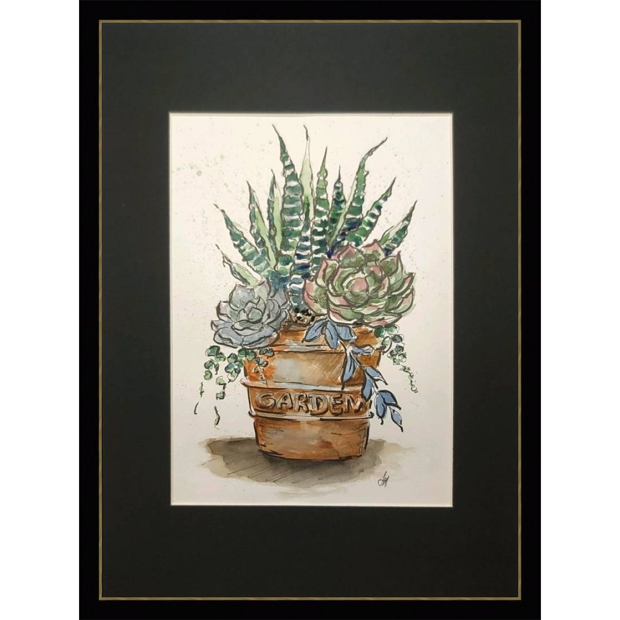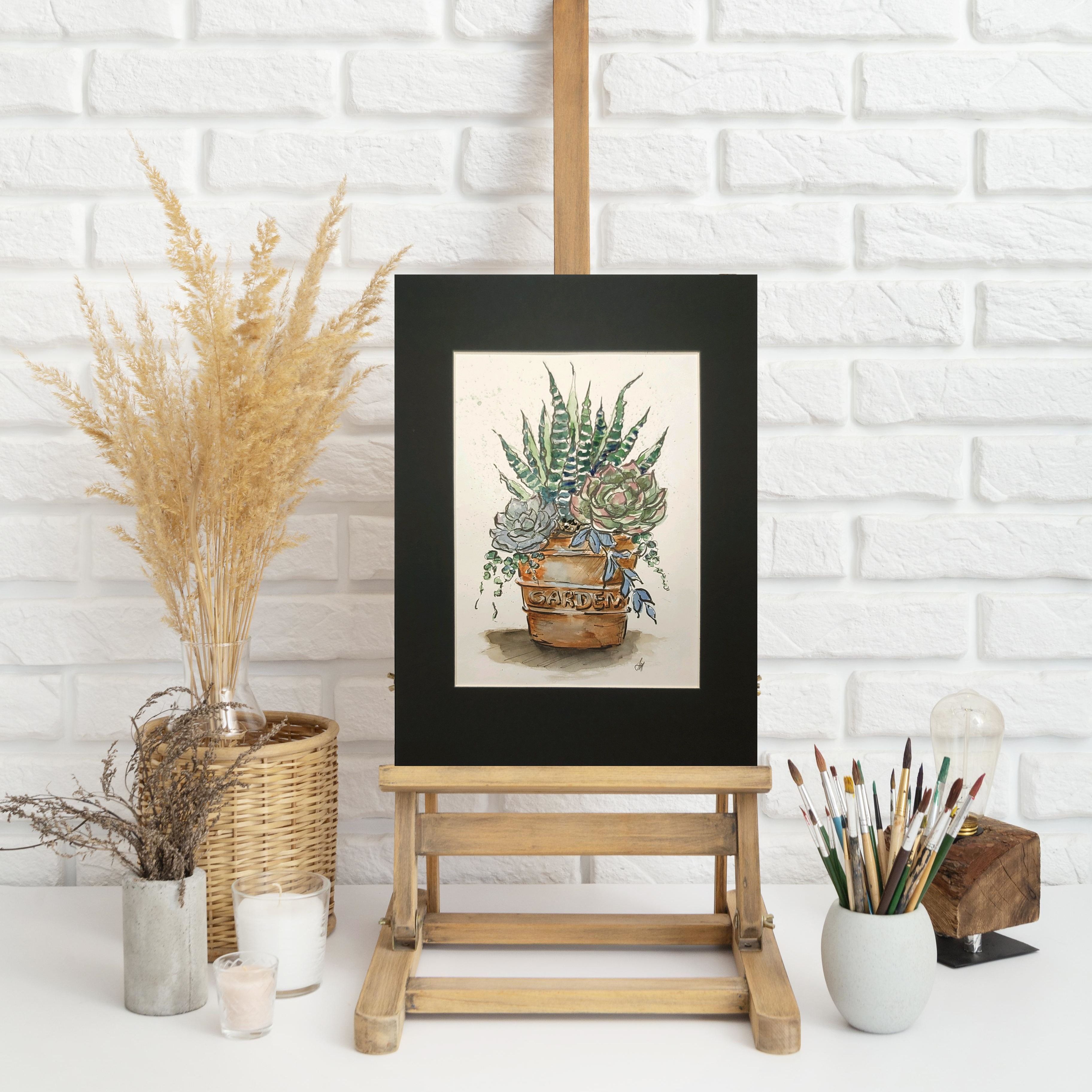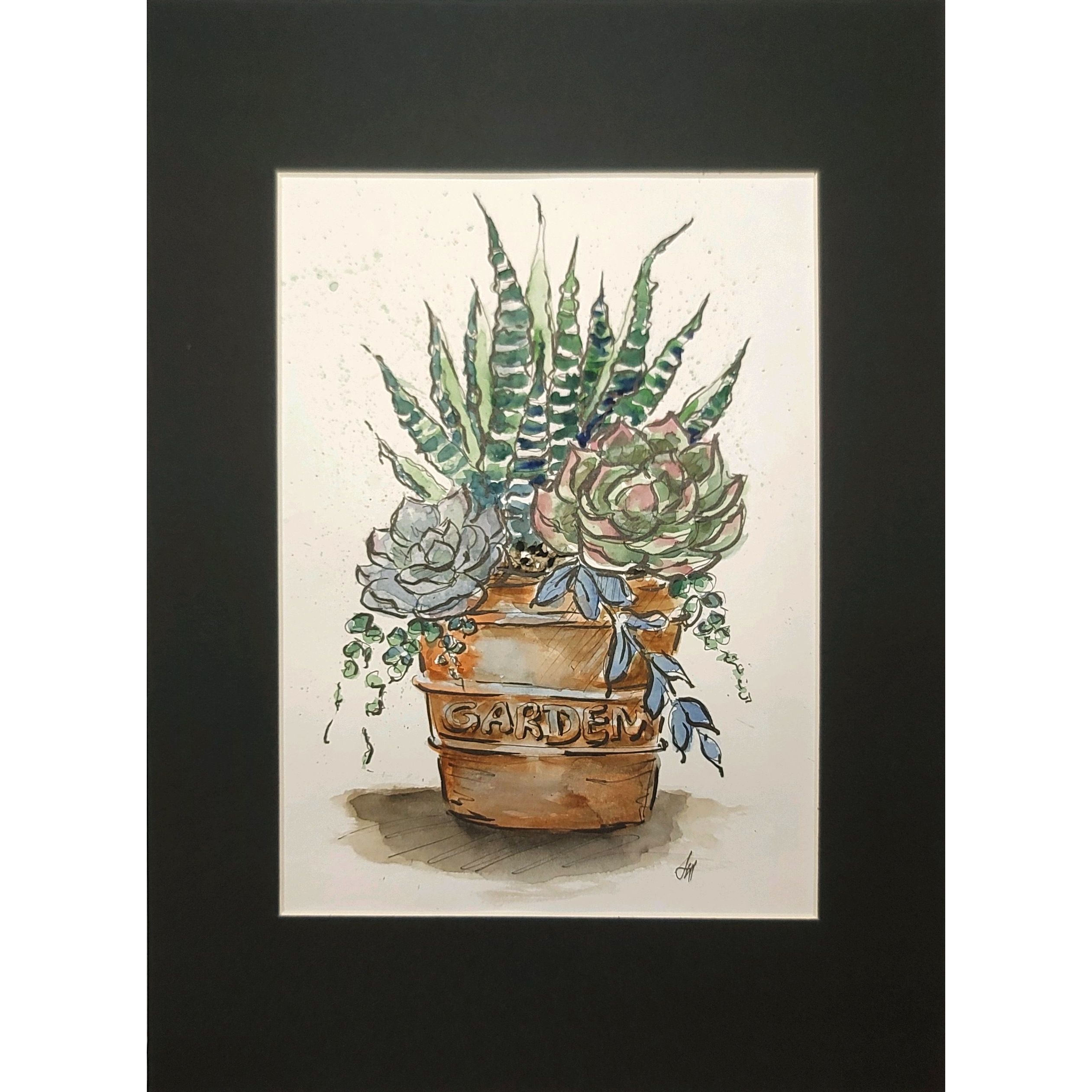 На картине представлено художественное изображение горшка с растениями. Горшок земляного цвета, на нём имеется надпись "GARDEN”. В горшке растут различные суккуленты, такие как зебрина и эхеверия. Растения имеют зелёные листья с рисунками и оттенки розового. Рисунок обрамлен в чёрное паспарту рамку с белой окантовкой между рисунком и рамой.