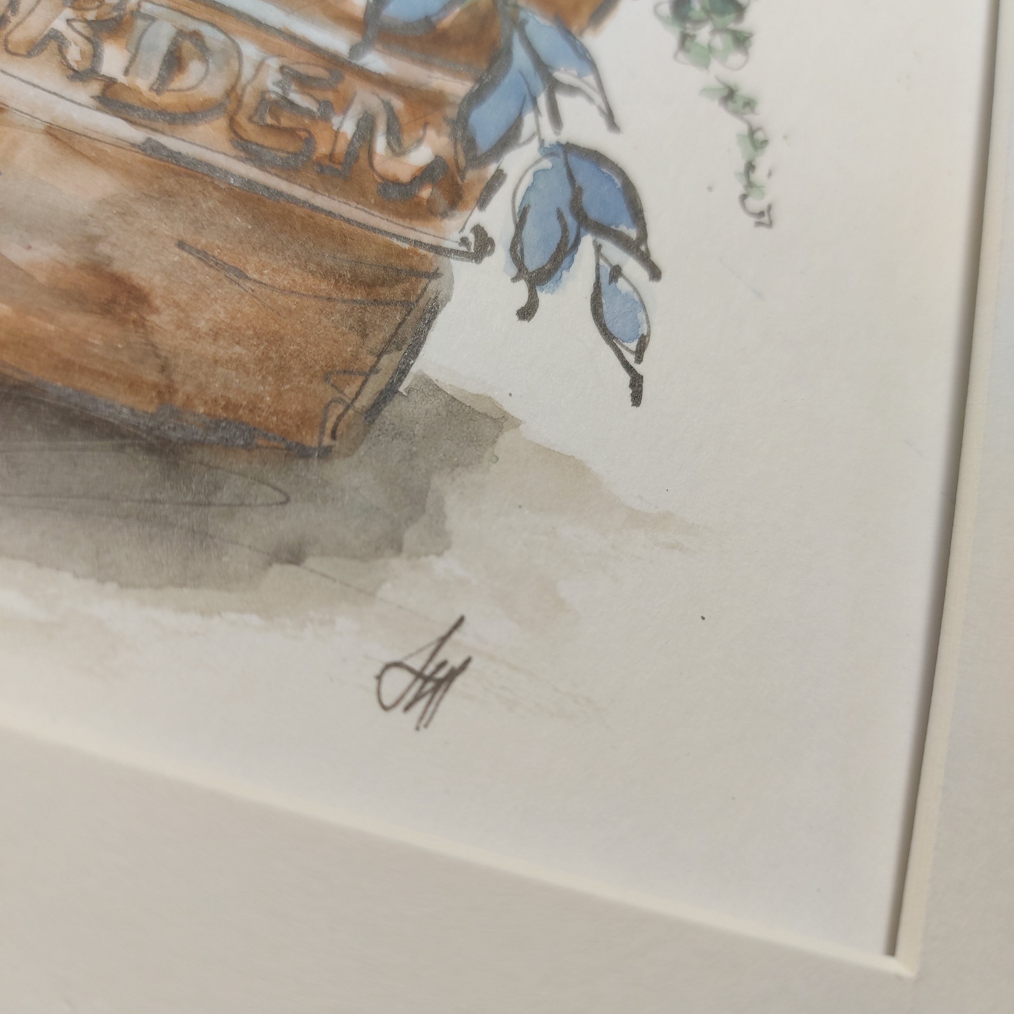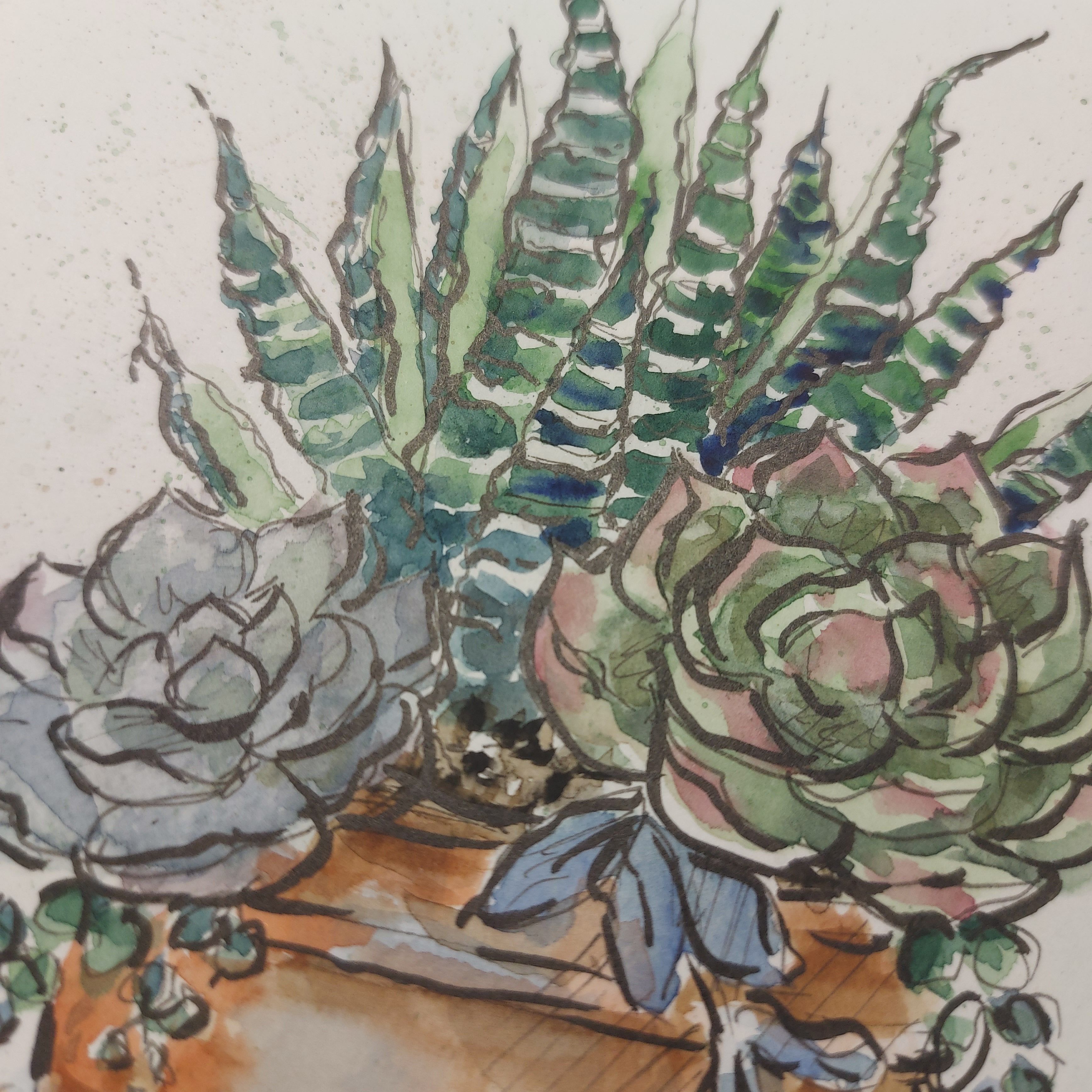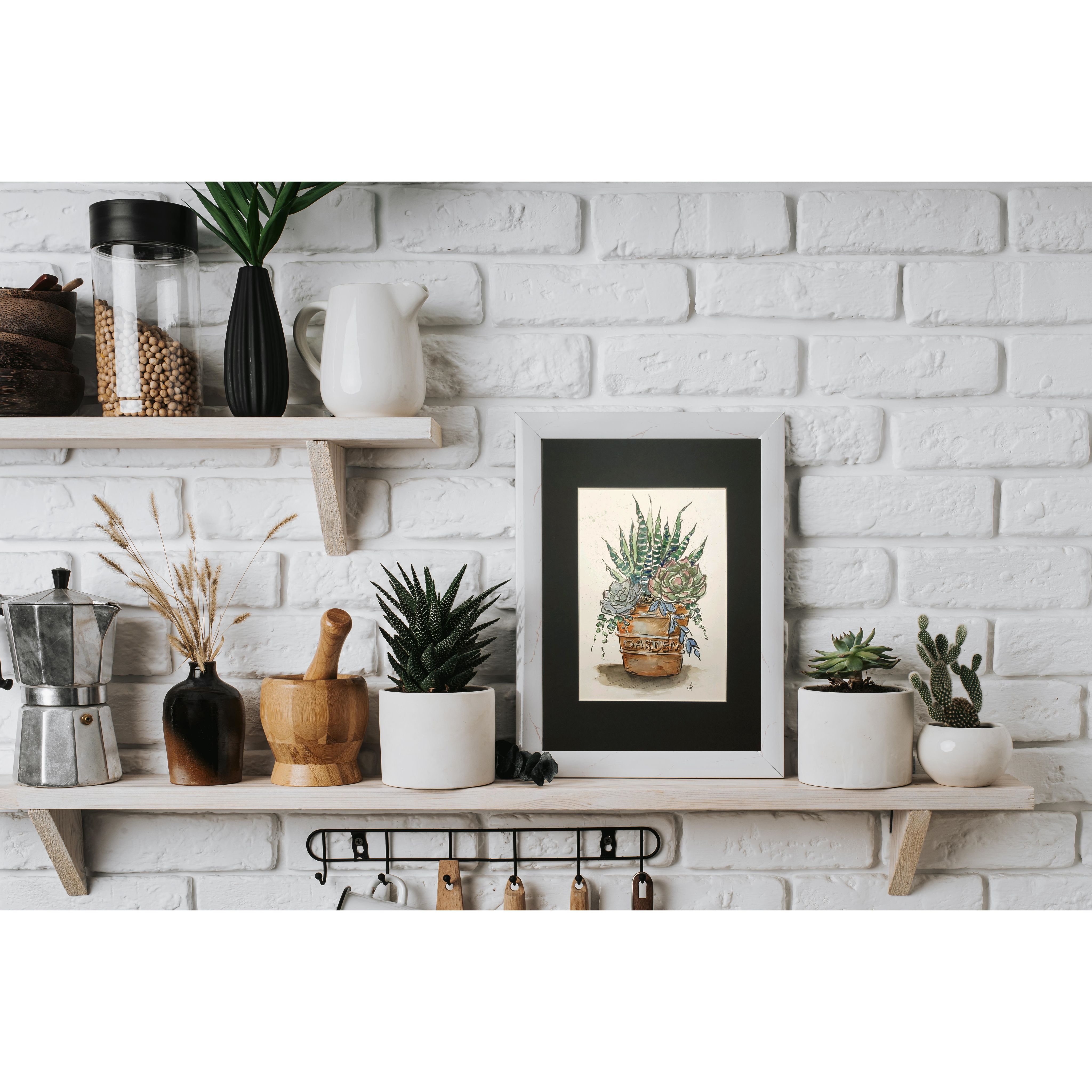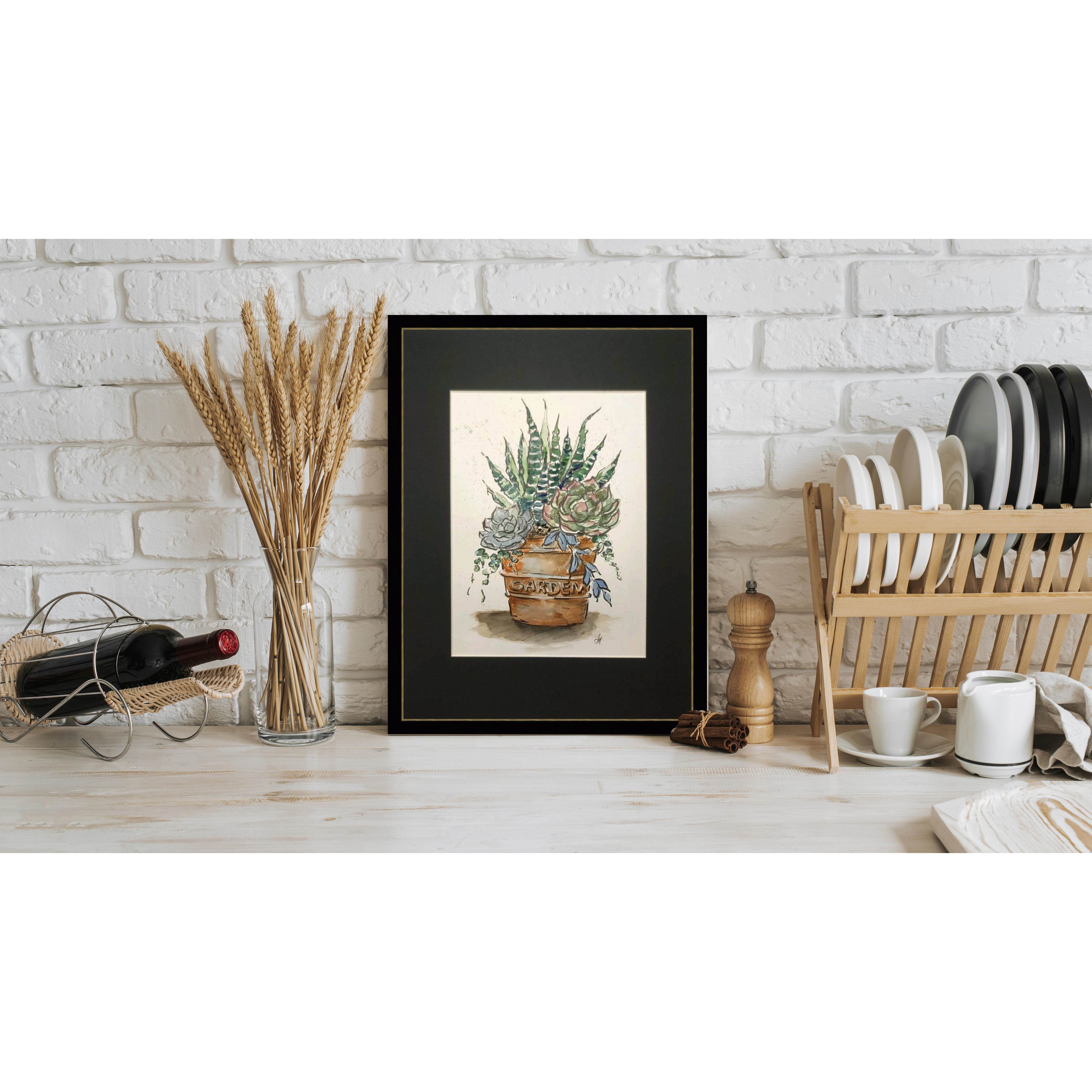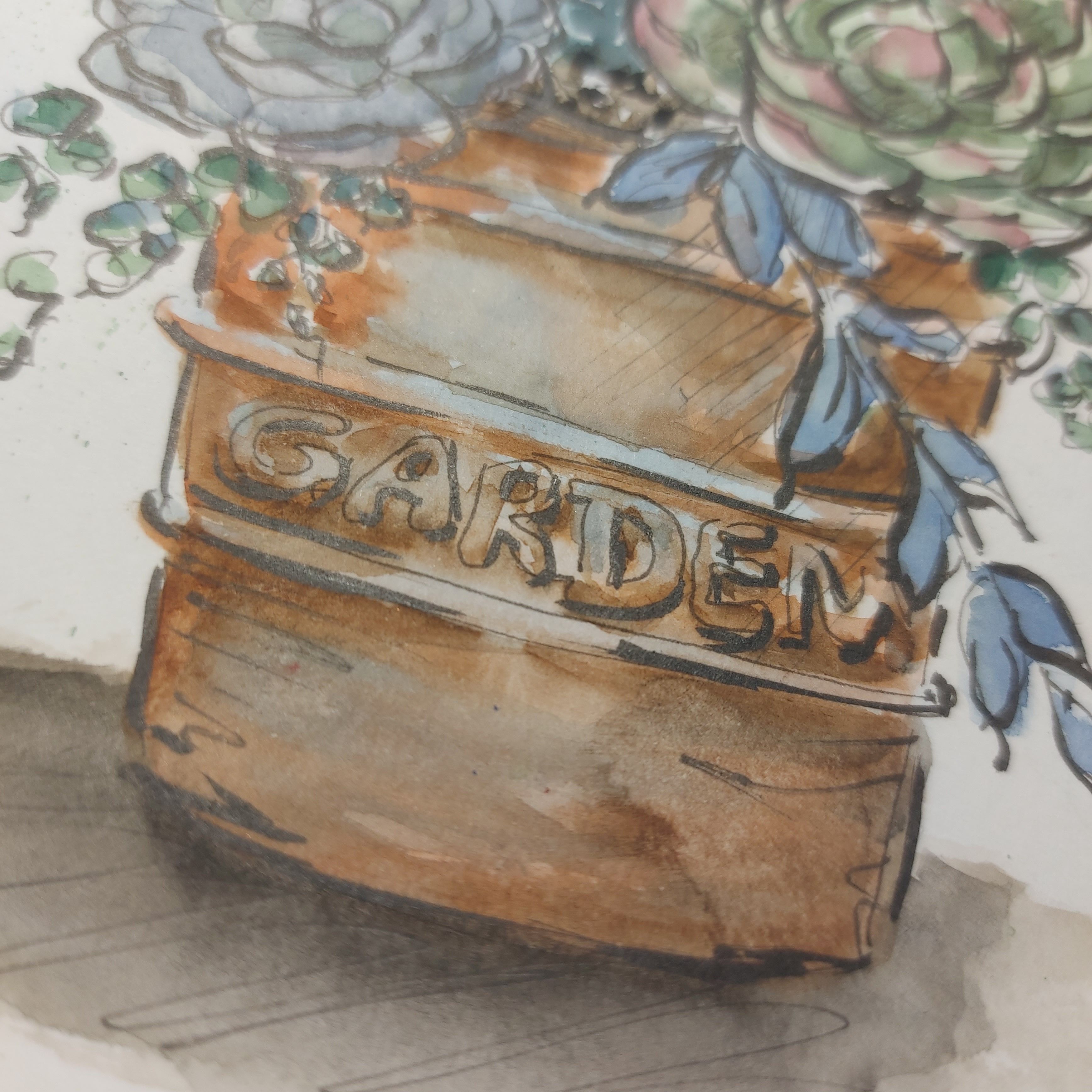 На картине представлено художественное изображение горшка с растениями. Горшок земляного цвета, на нём имеется надпись "GARDEN”. В горшке растут различные суккуленты, такие как зебрина и эхеверия. Растения имеют зелёные листья с рисунками и оттенки розового. Рисунок обрамлен в чёрное паспарту рамку с белой окантовкой между рисунком и рамой.