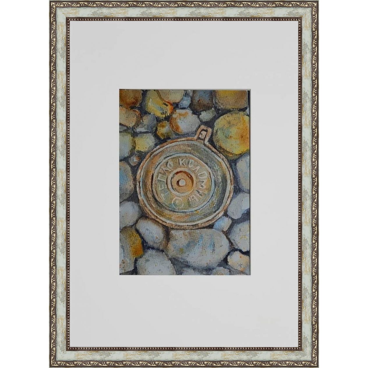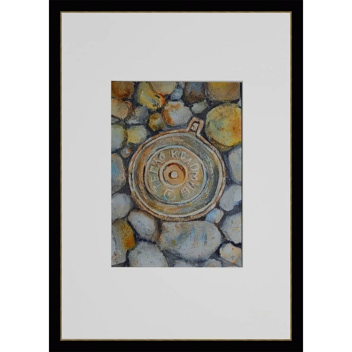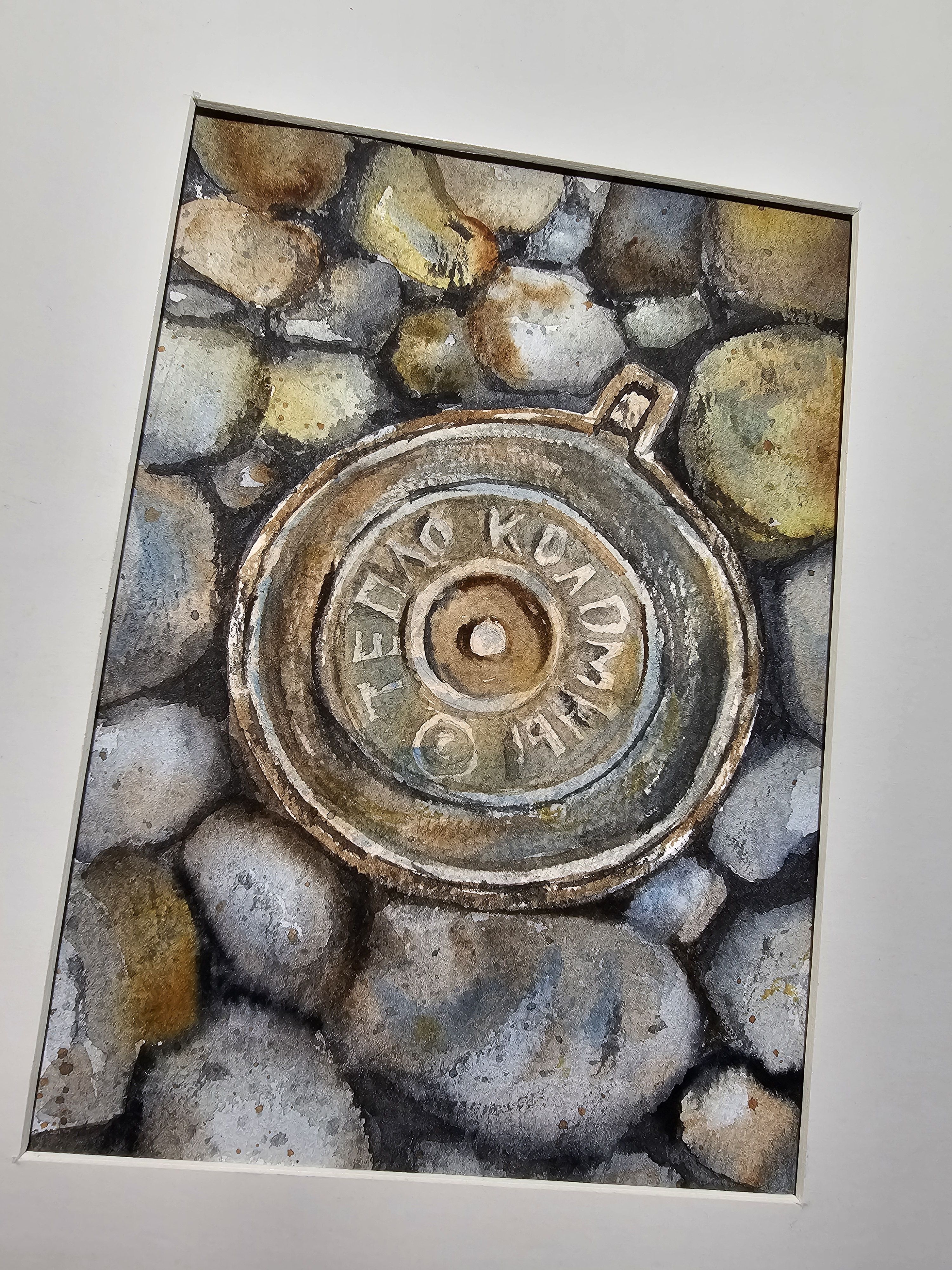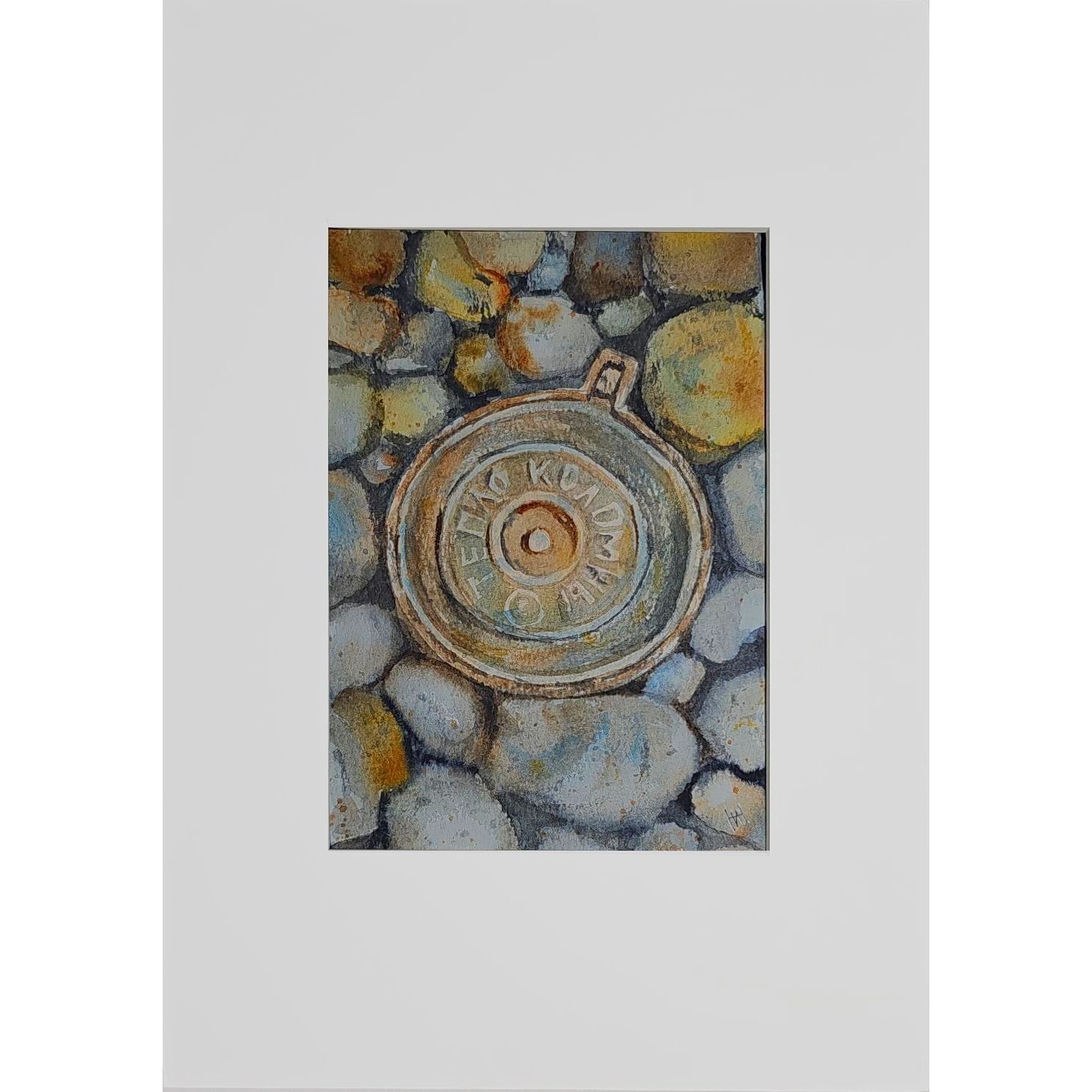 Нам представлен акварельный рисунок, который изображает люк с надписью "ТЕПЛО КОЛОМНЫ" на фоне множества камней или гальки. Люк расположен по центру, а его металлическая текстура четко выражена. Камни вокруг проработаны в серо-бежевых и голубоватых тонах, создавая ощущение натуралистичности и детализации в композиции. Работа оформлена в светлое паспарту, что подчеркивает яркость изображения. Картина готова к размещению в стандартной раме 21*30 см.
