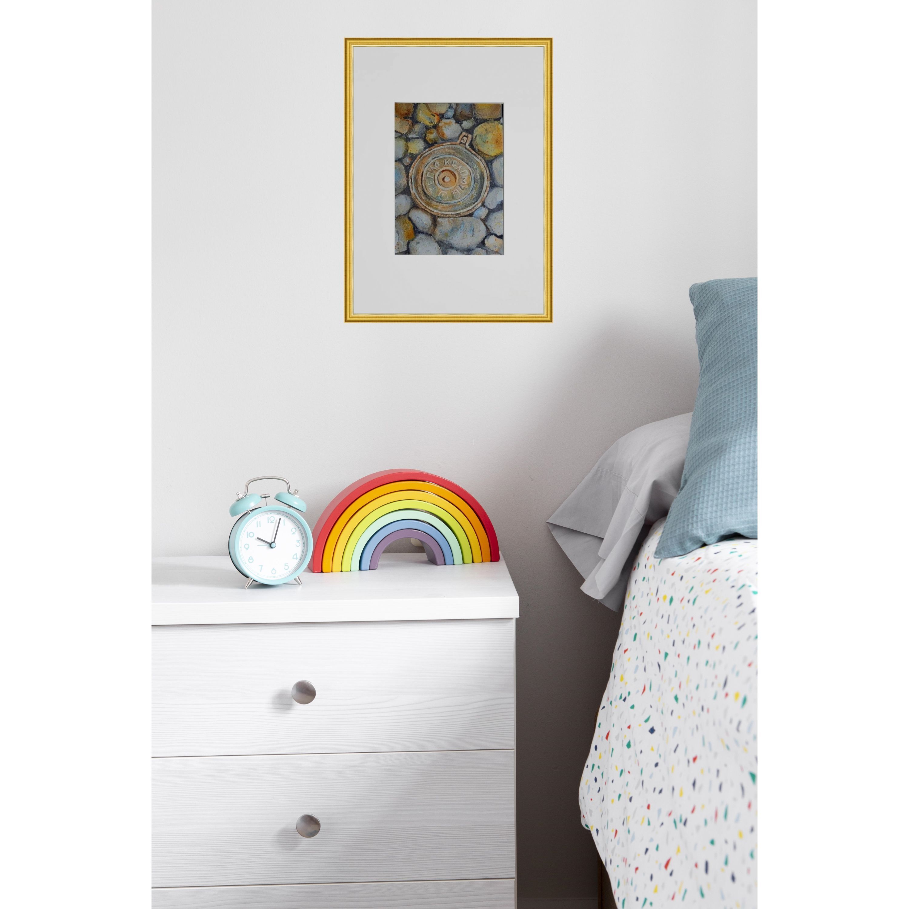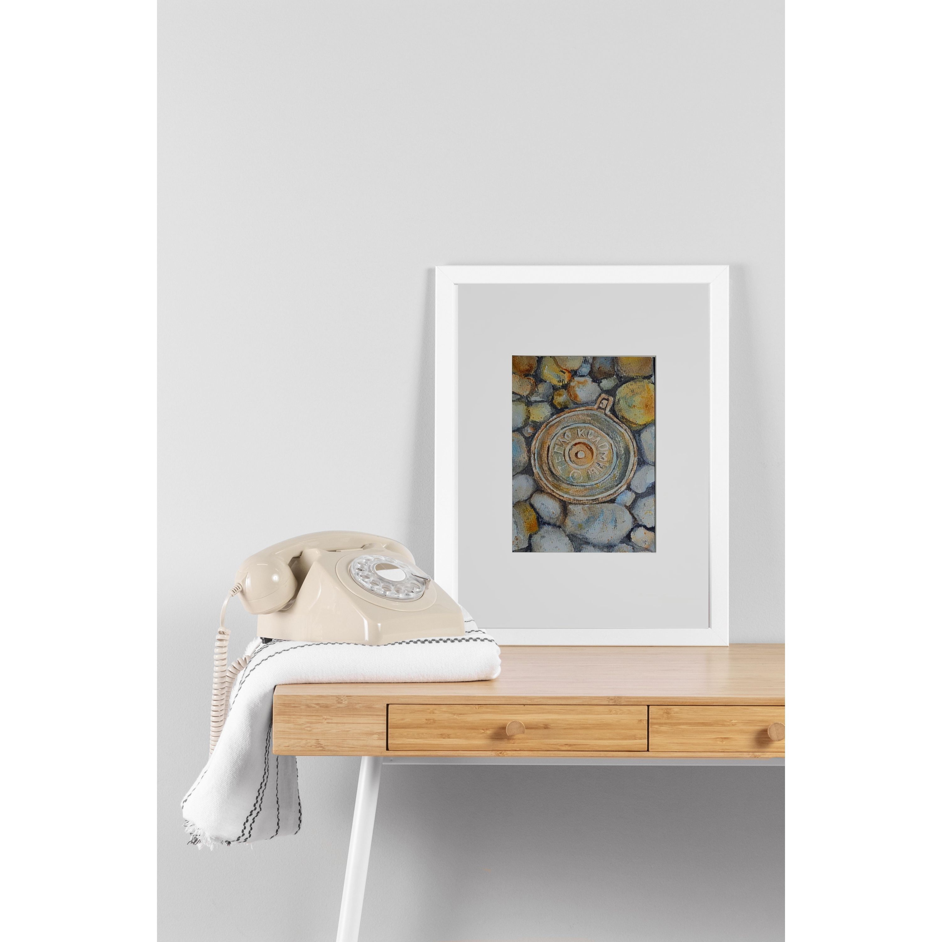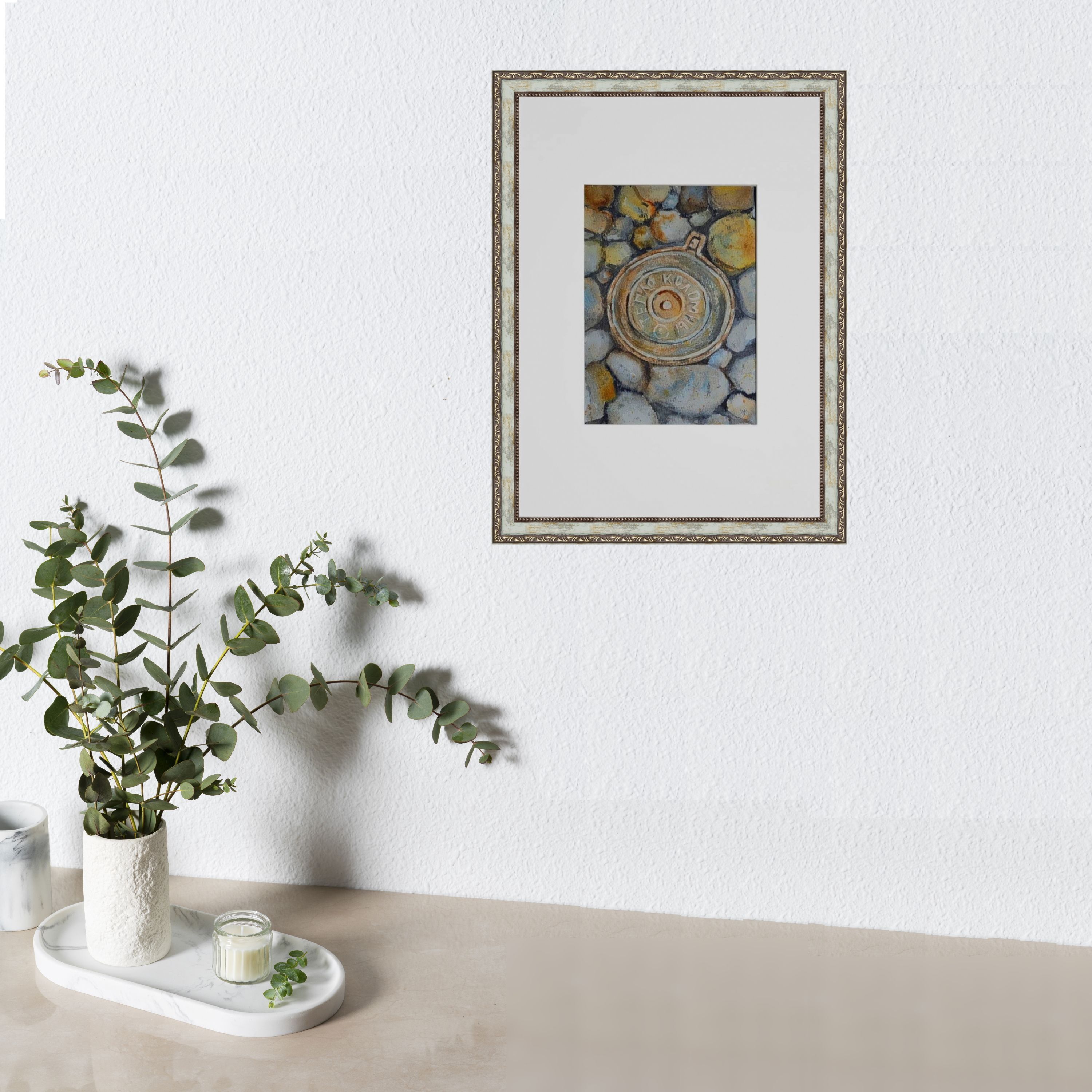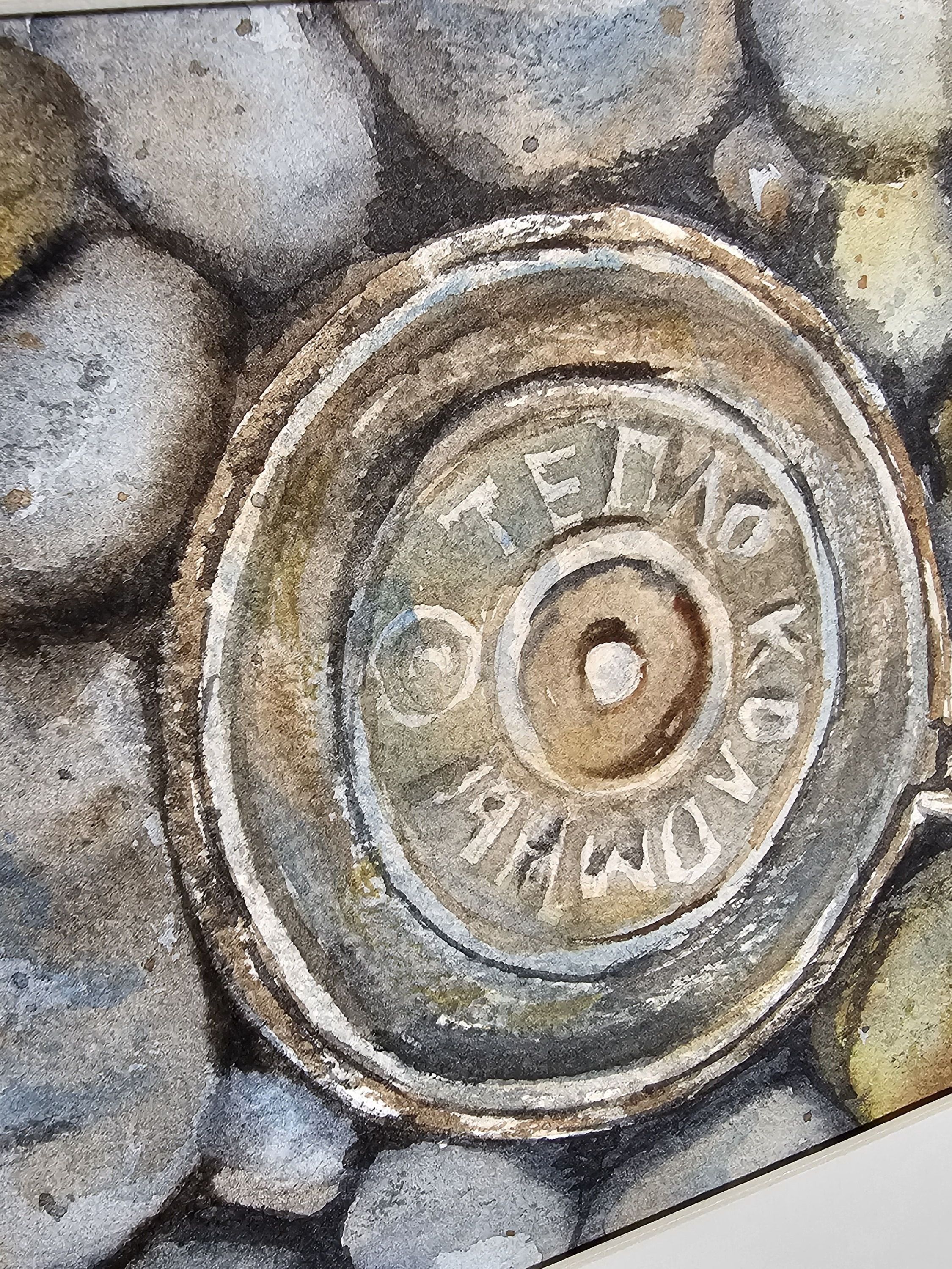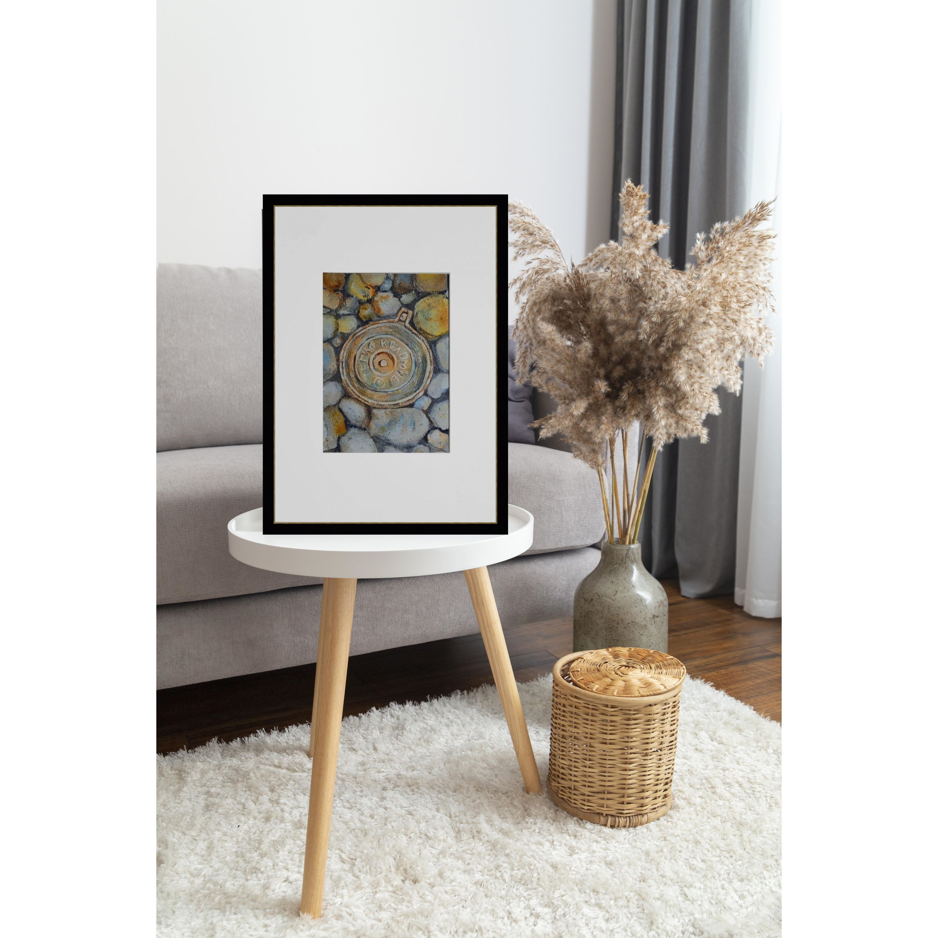 Нам представлен акварельный рисунок, который изображает люк с надписью "ТЕПЛО КОЛОМНЫ" на фоне множества камней или гальки. Люк расположен по центру, а его металлическая текстура четко выражена. Камни вокруг проработаны в серо-бежевых и голубоватых тонах, создавая ощущение натуралистичности и детализации в композиции. Работа оформлена в светлое паспарту, что подчеркивает яркость изображения. Картина готова к размещению в стандартной раме 21*30 см.