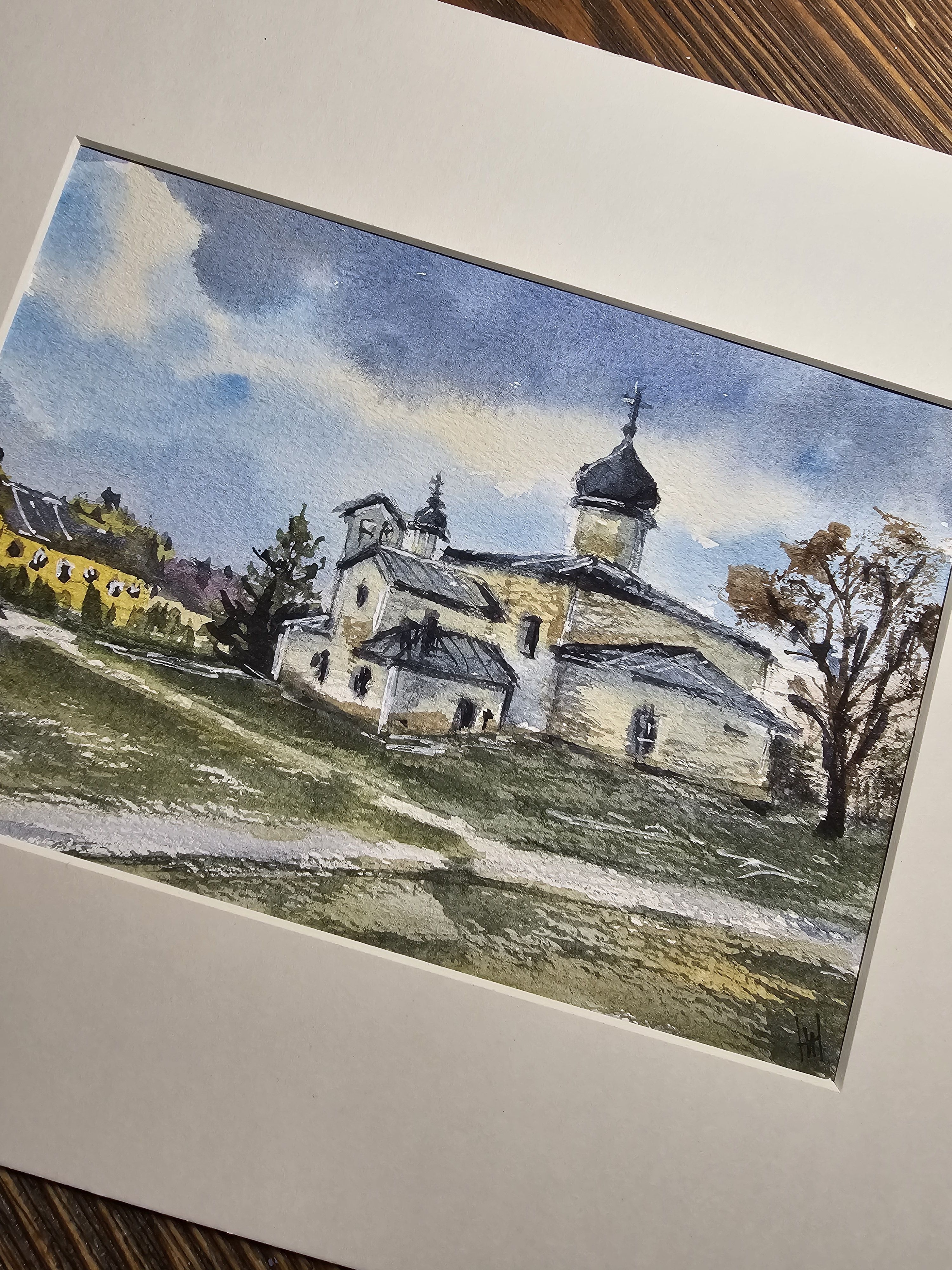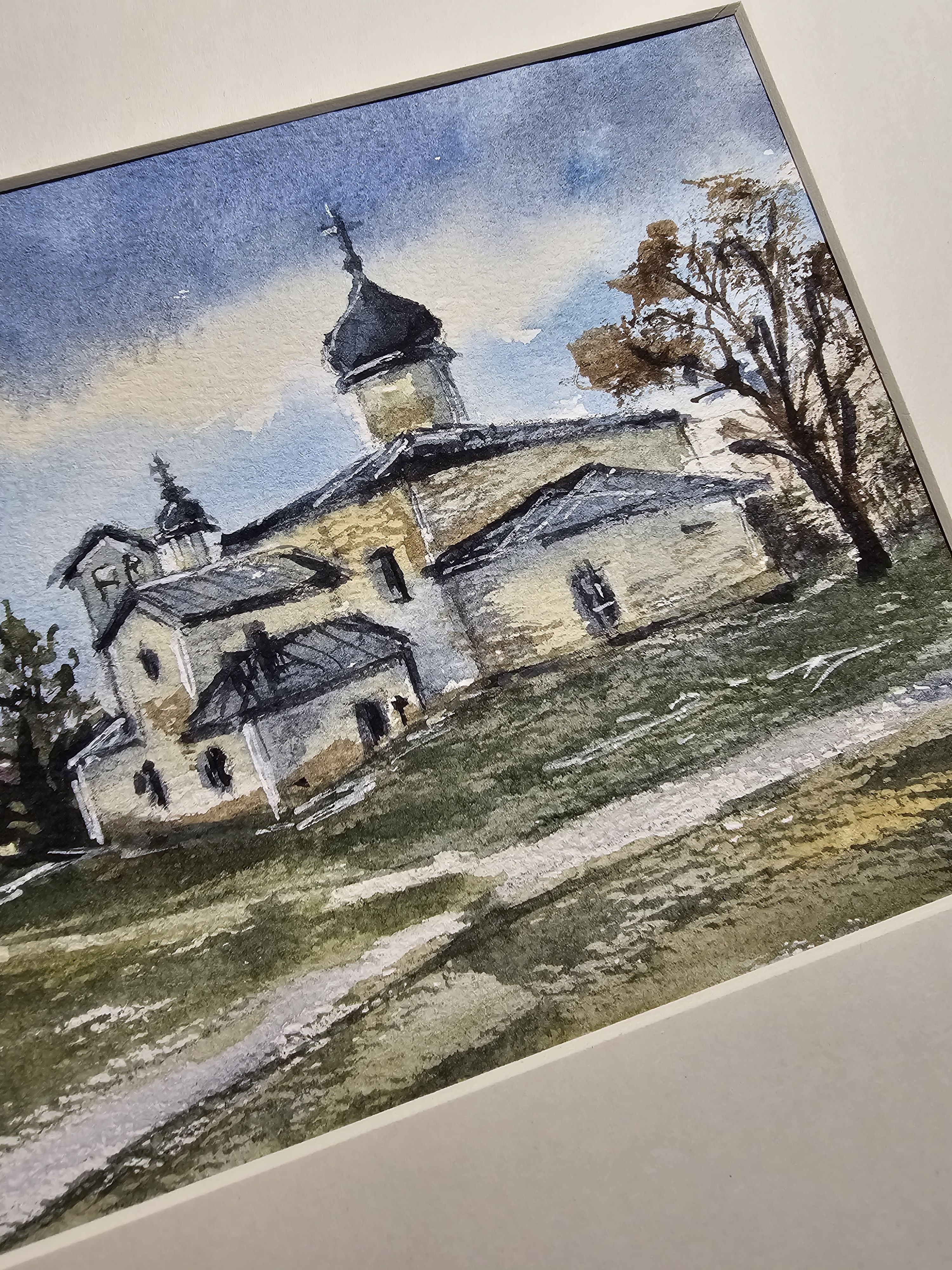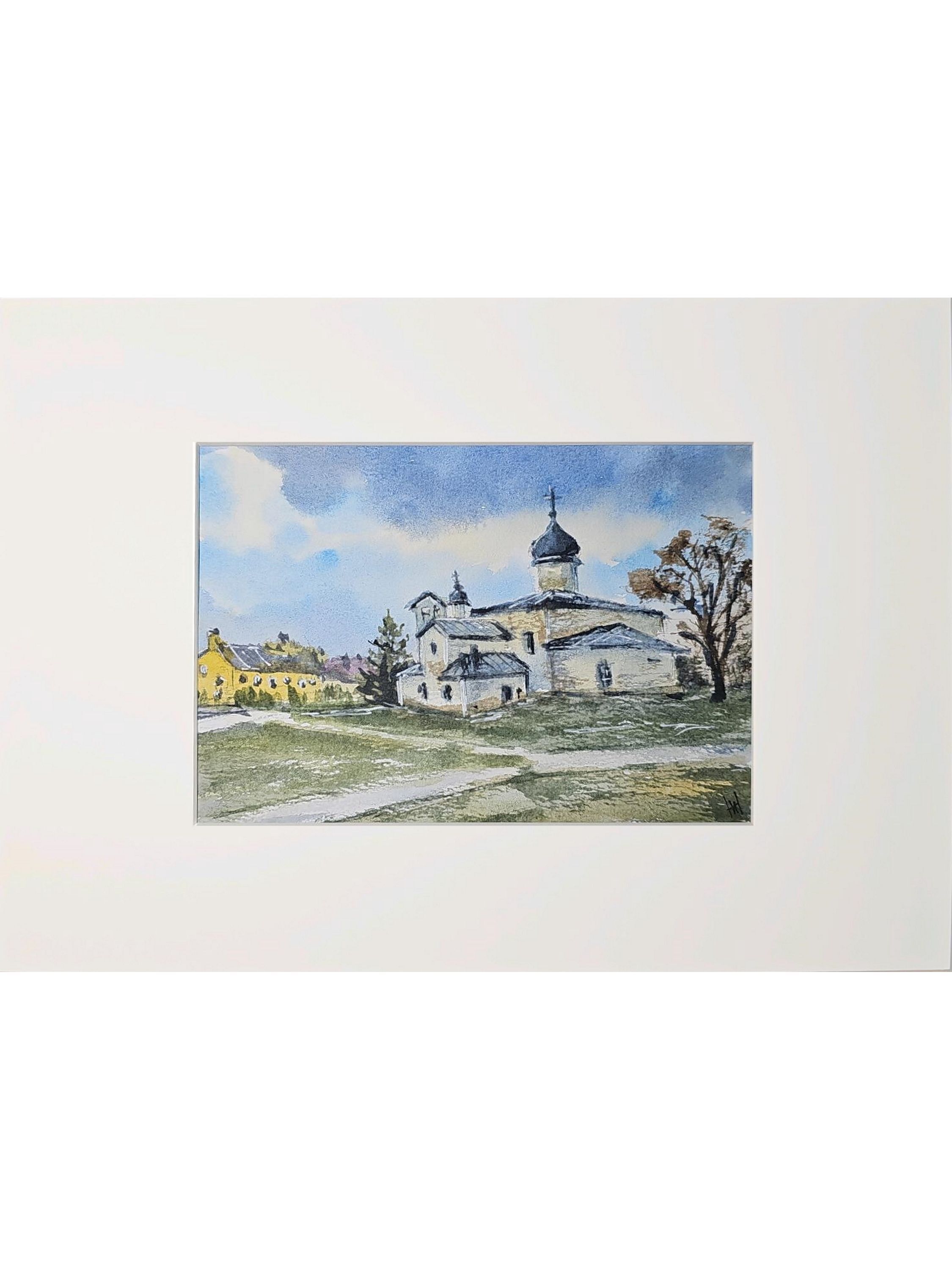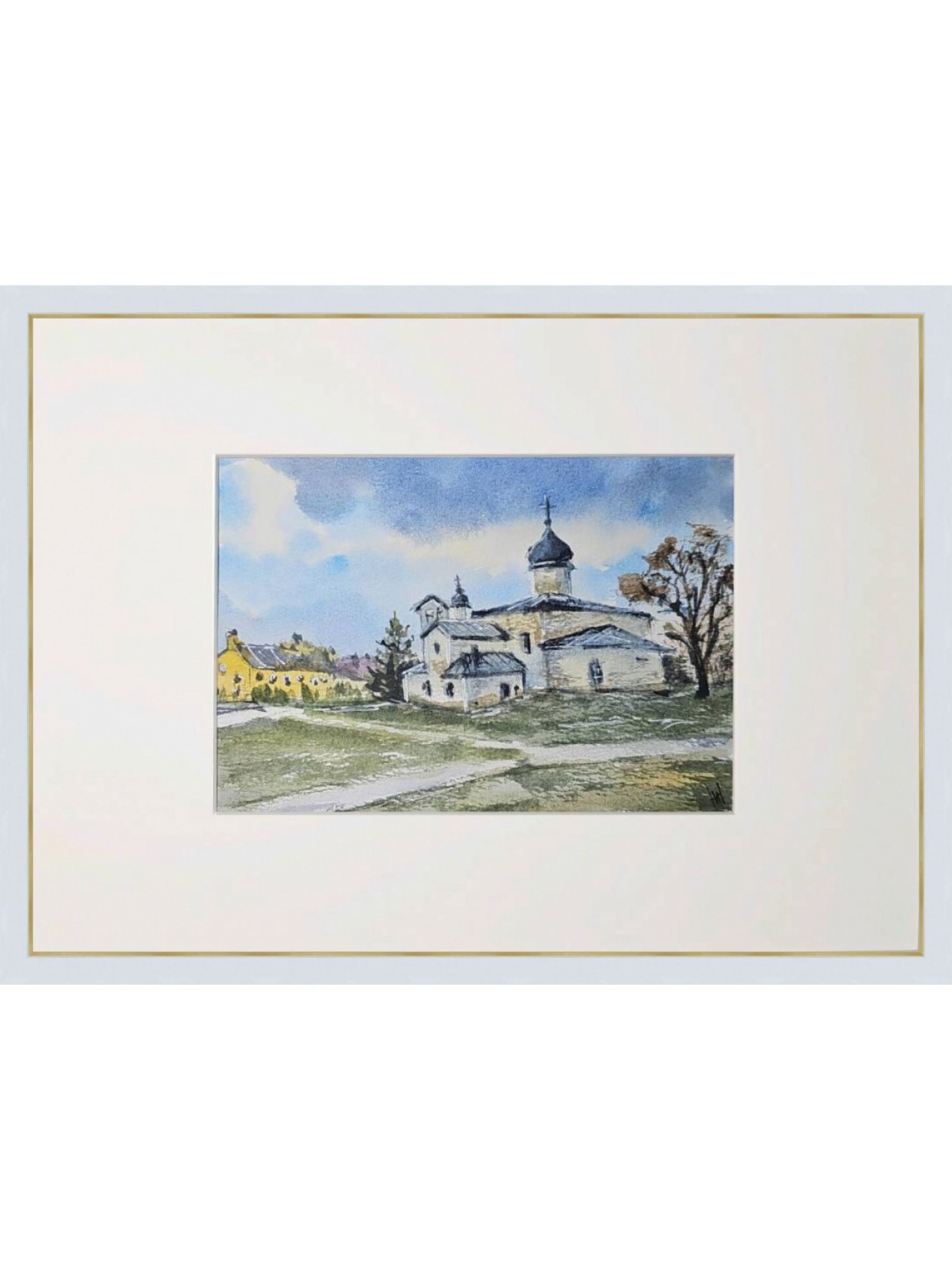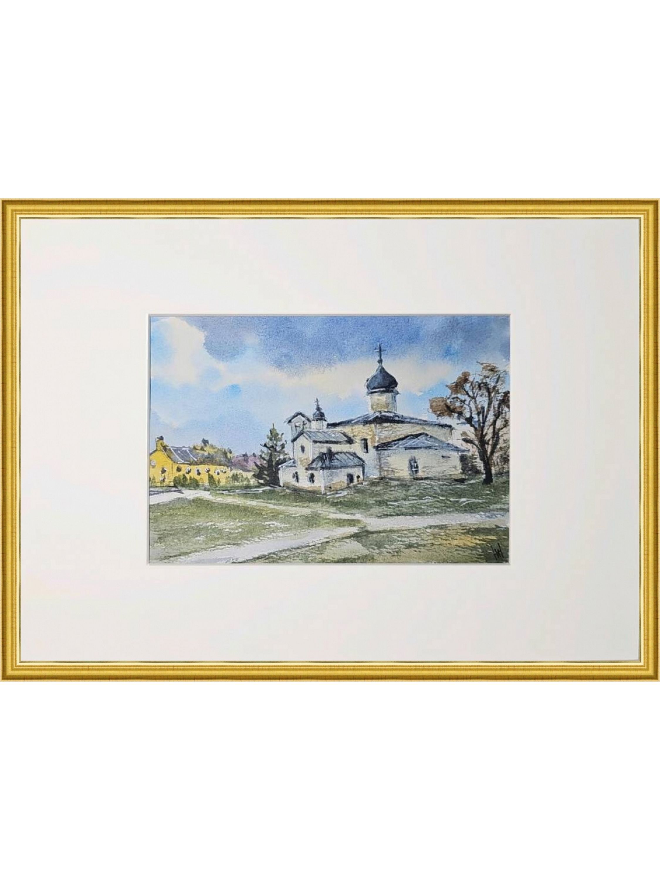 Нам представлена акварельная картина, на которой изображена церковь с куполом и крестом. Она расположена на открытом пространстве, вокруг которого можно увидеть слегка пожухлую траву и деревья. Справа от церкви большой дерево с голыми ветками, слева виднеются другие здания с желтыми стенами. Небо с облаками, создающими спокойную атмосферу. Картина оформлена в светлое паспарту, что подчеркивает яркость пейзажа и готова к размещению в раме 21*30 см.
