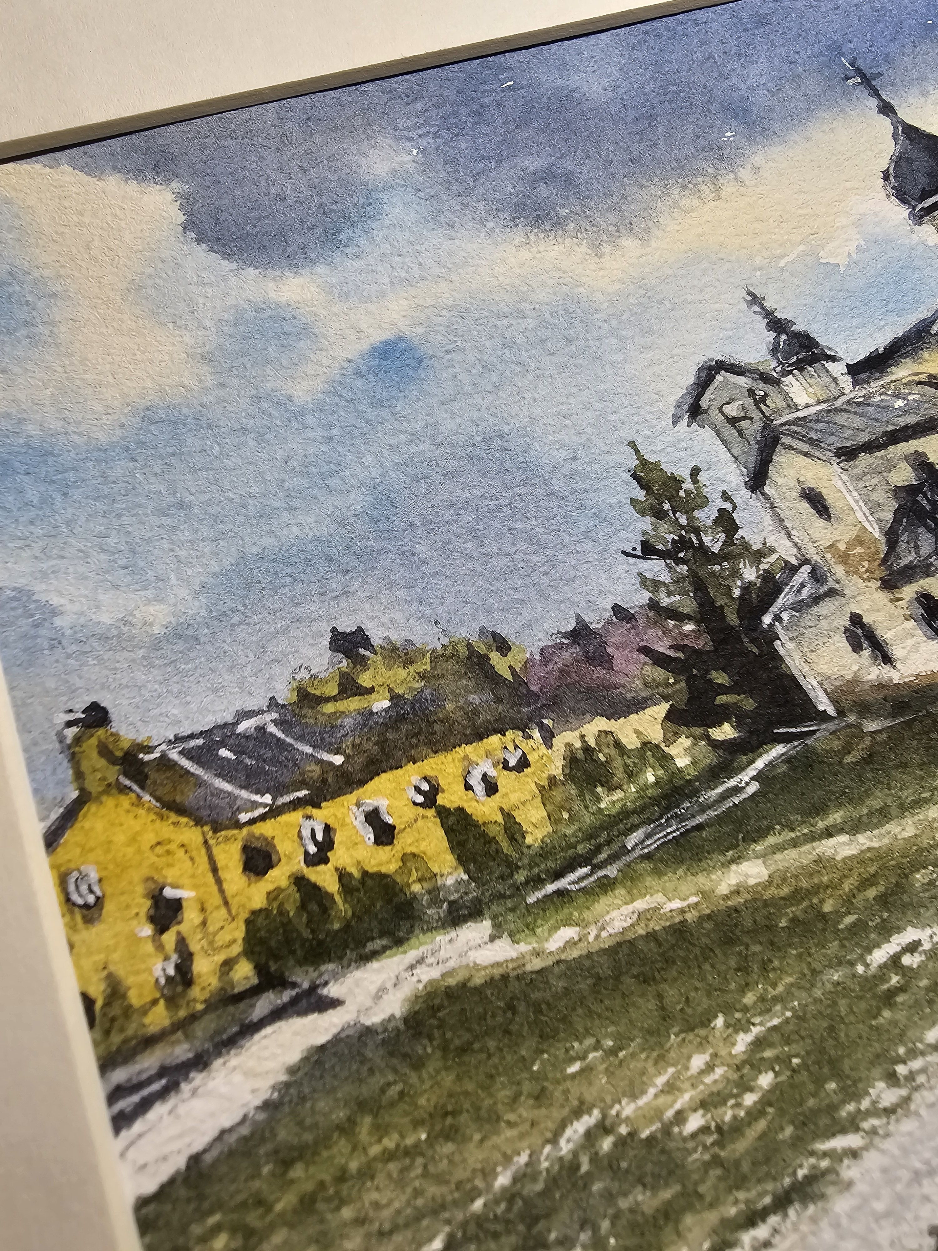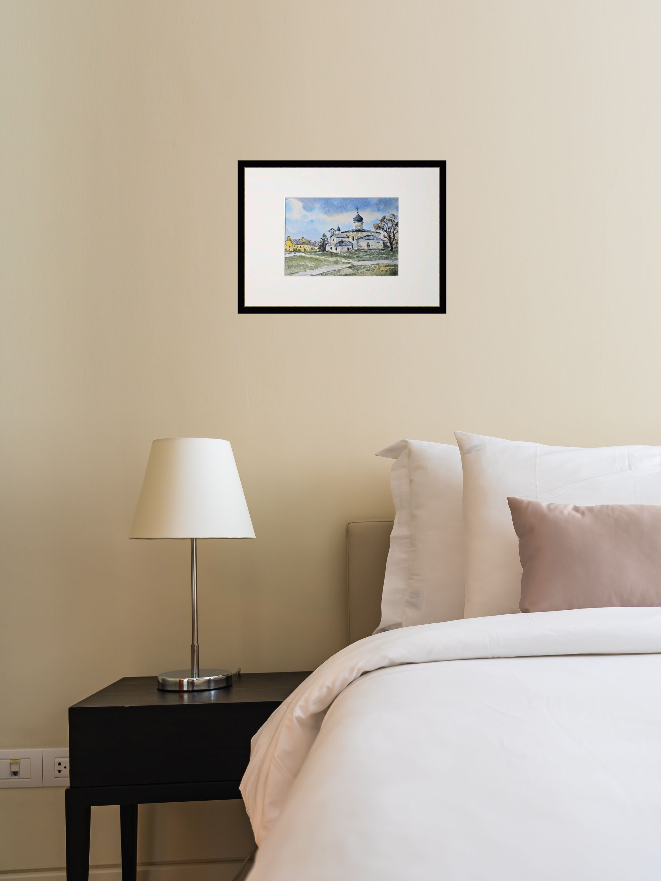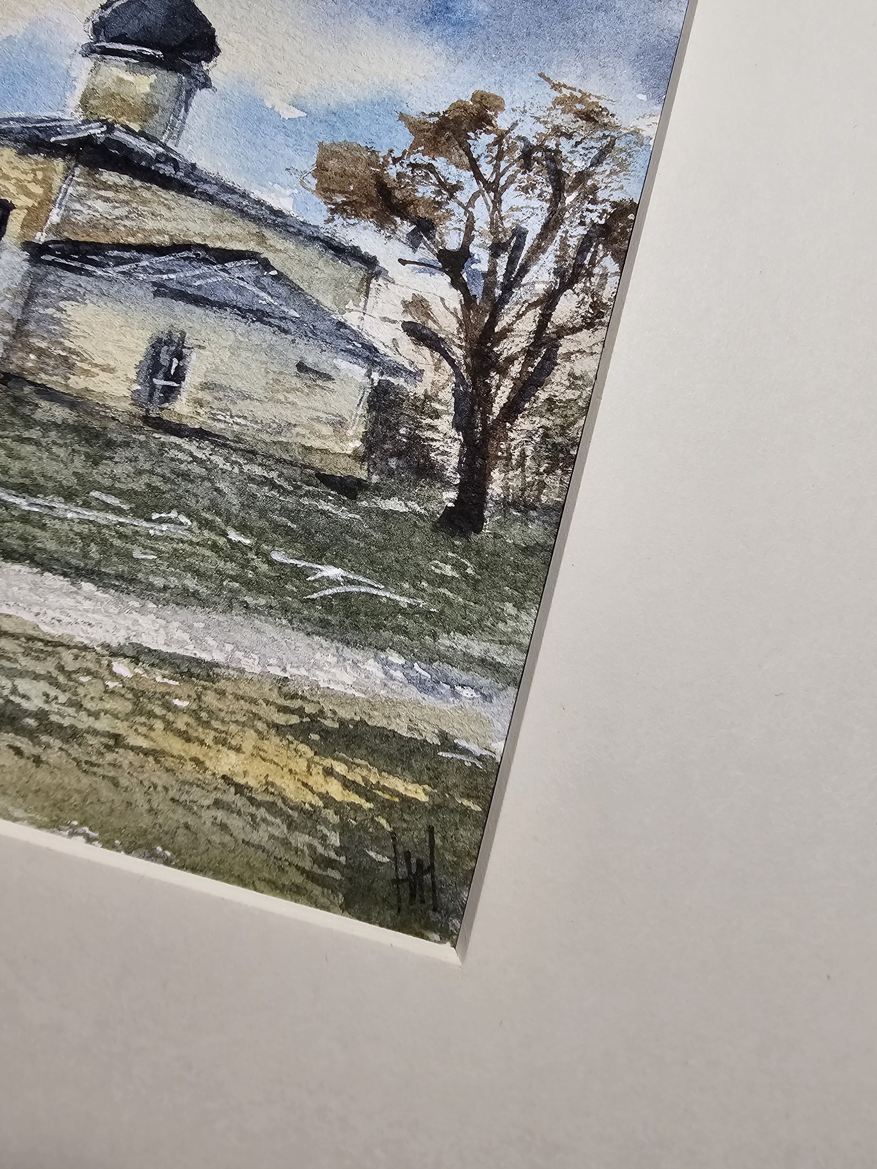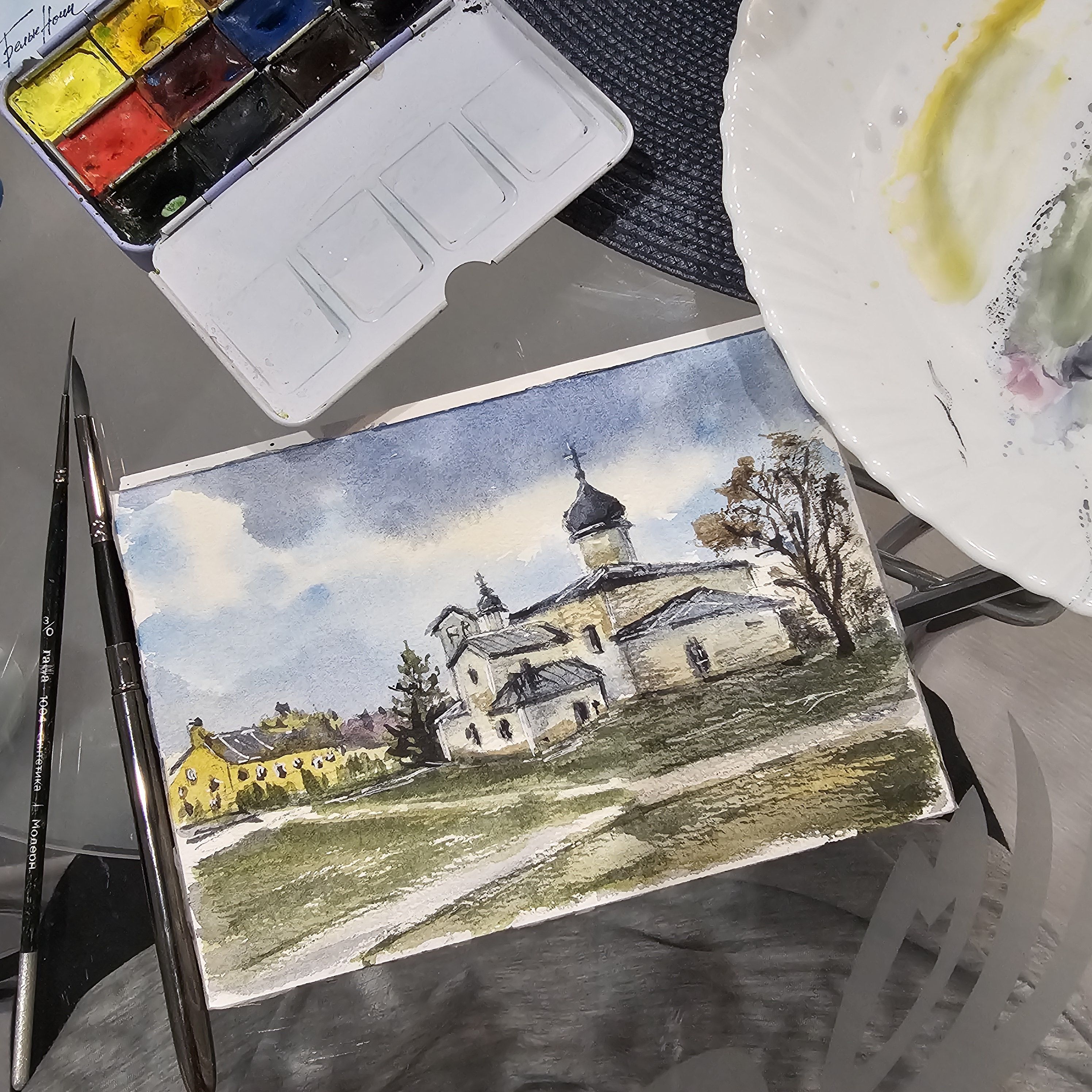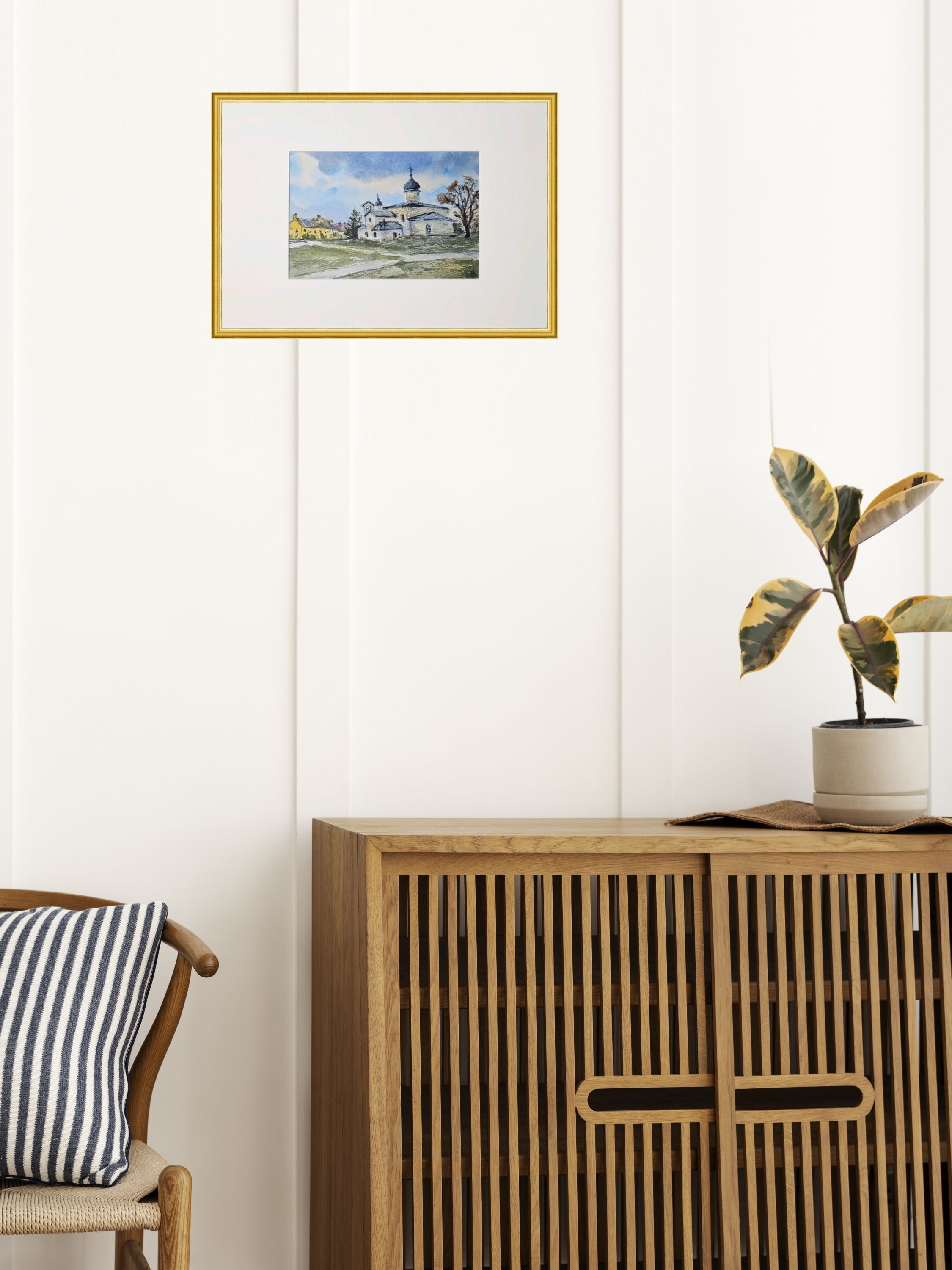 Нам представлена акварельная картина, на которой изображена церковь с куполом и крестом. Она расположена на открытом пространстве, вокруг которого можно увидеть слегка пожухлую траву и деревья. Справа от церкви большой дерево с голыми ветками, слева виднеются другие здания с желтыми стенами. Небо с облаками, создающими спокойную атмосферу. Картина оформлена в светлое паспарту, что подчеркивает яркость пейзажа и готова к размещению в раме 21*30 см.