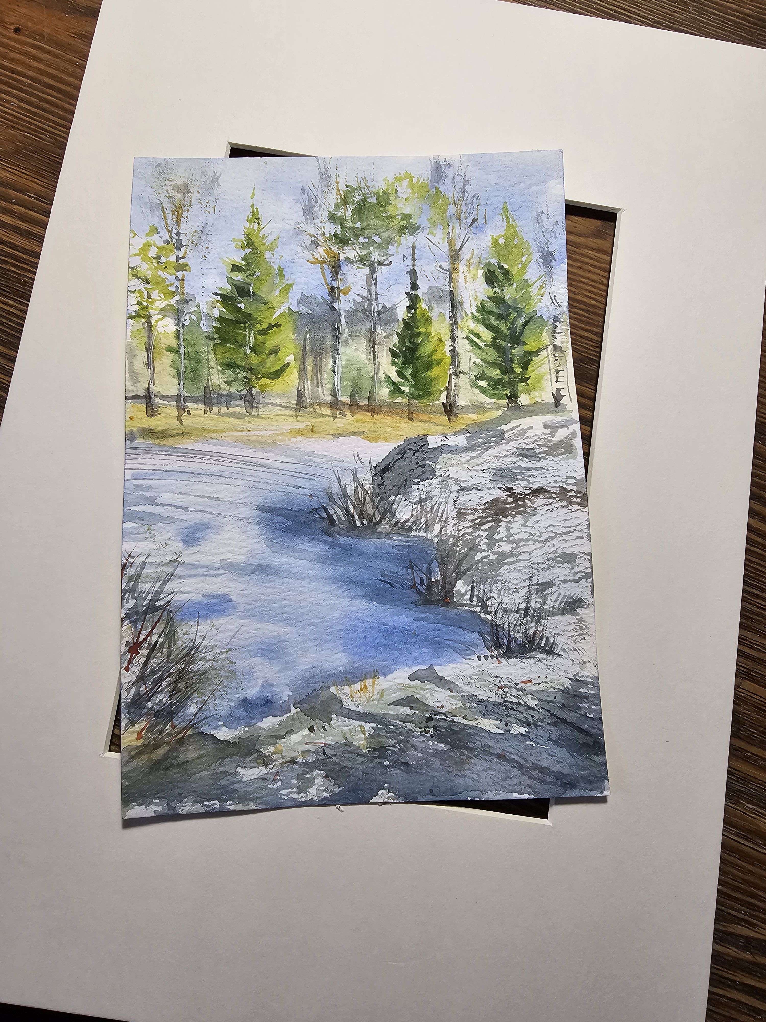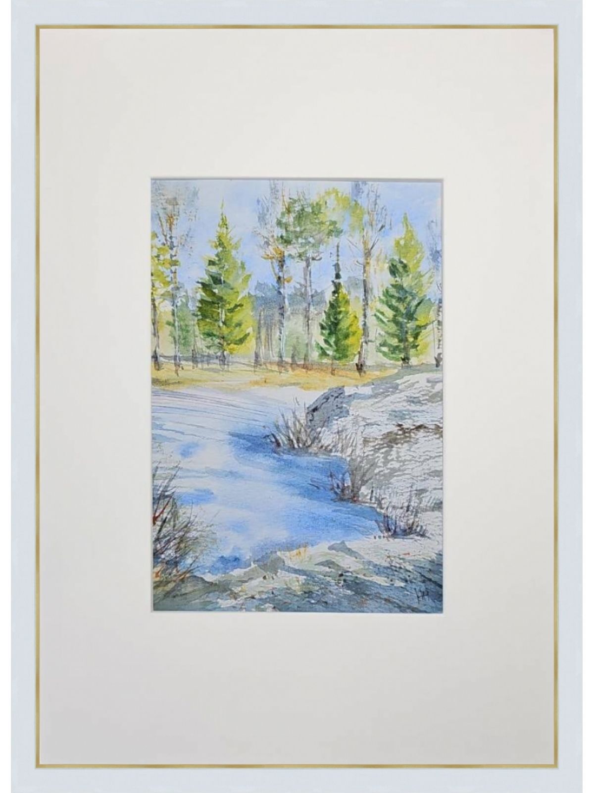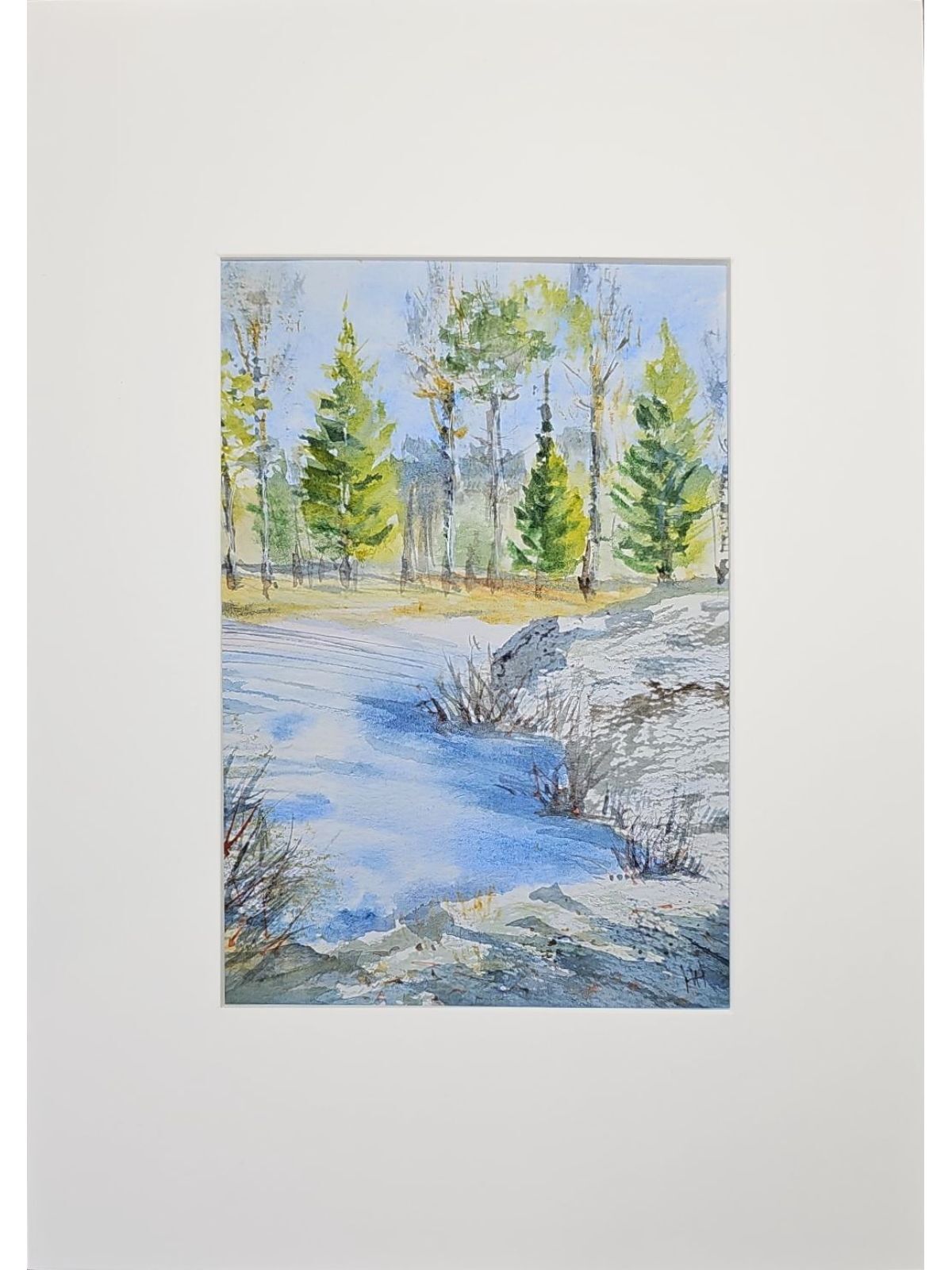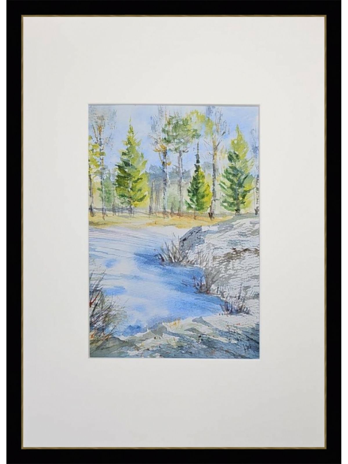 Нам представлена акварельная картина с природным пейзажем. На переднем плане виден замерзший водоем , вокруг которого растут кустарники. На заднем плане расположены деревья, преимущественно хвойные, с зелеными кронами. Небо ясное с голубым оттенком, что может указывать на хорошую погоду. Свет и тени на картине создают ощущение спокойствия и свежести. Общая композиция изображает спокойный лесной пейзаж.