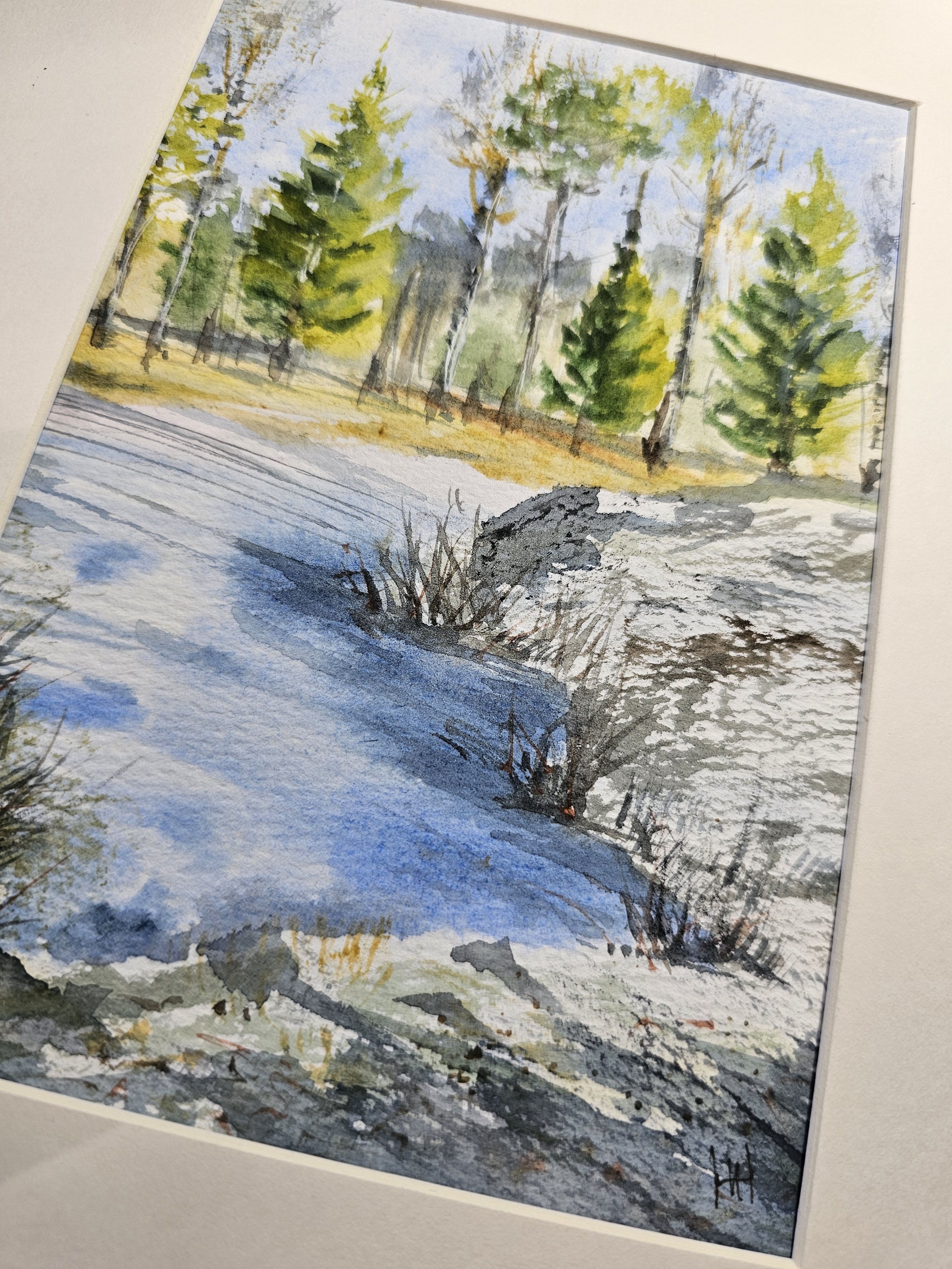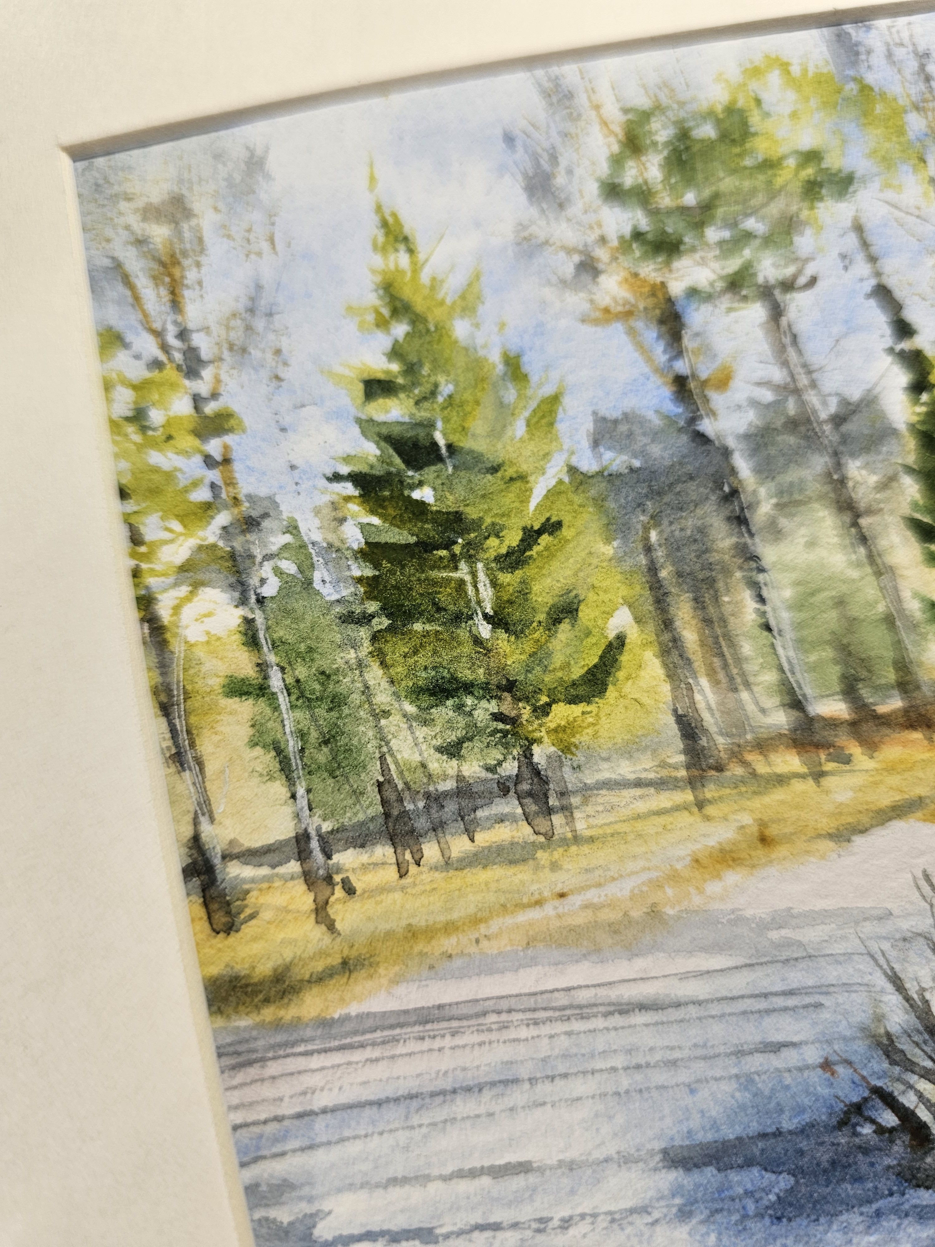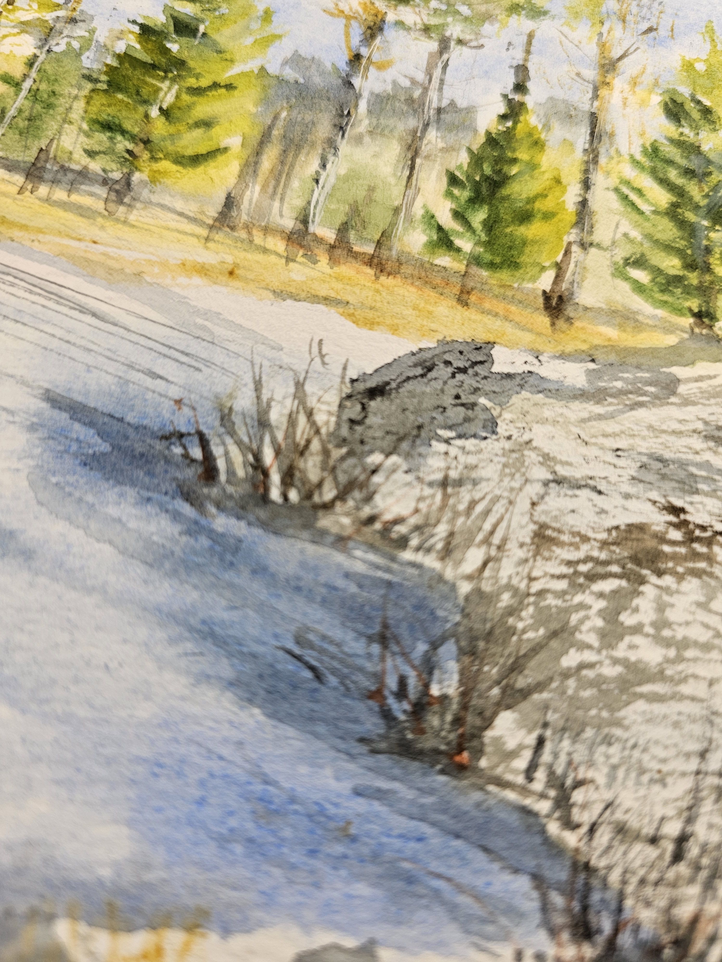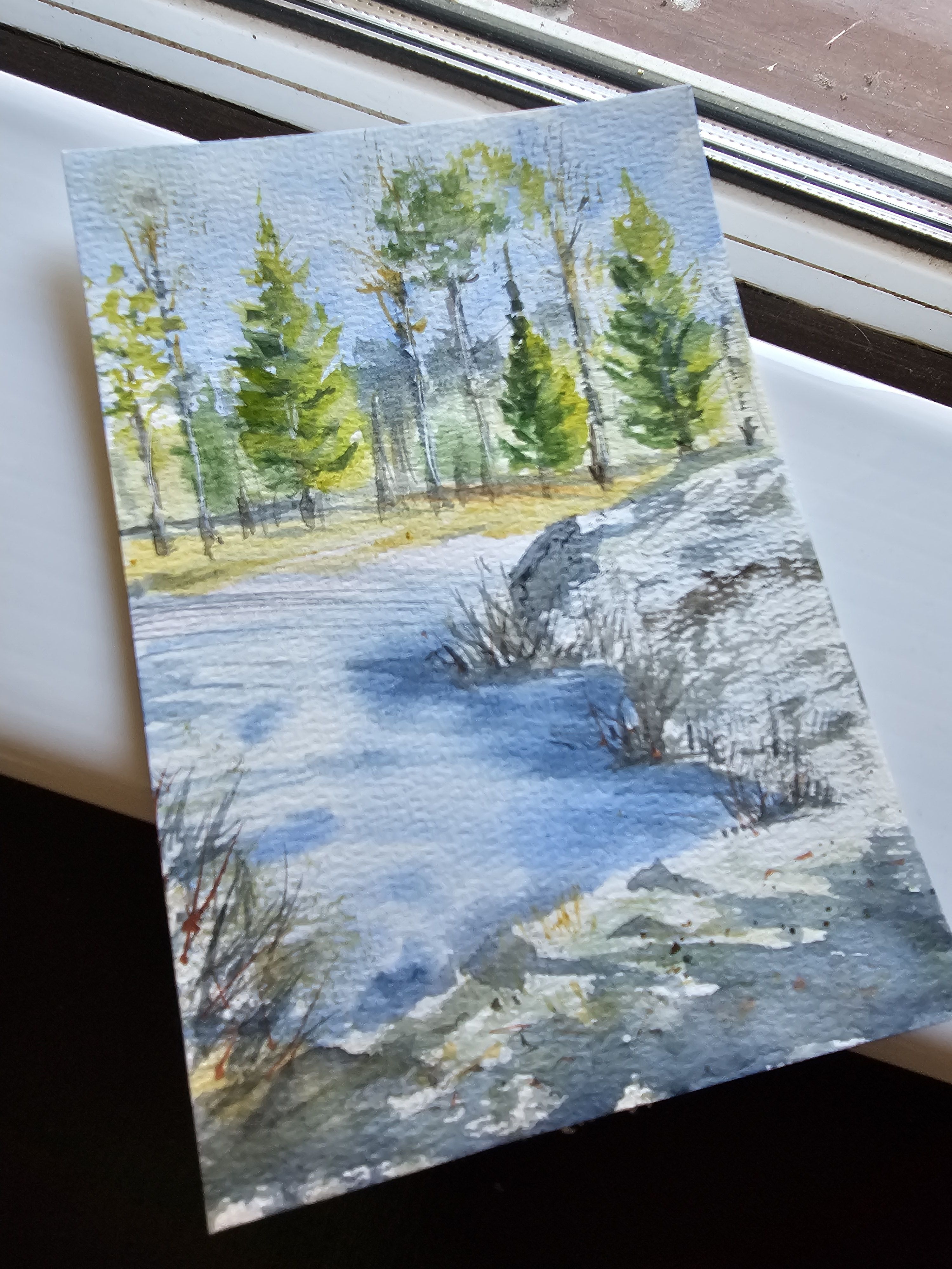 Нам представлена акварельная картина с природным пейзажем. На переднем плане виден замерзший водоем , вокруг которого растут кустарники. На заднем плане расположены деревья, преимущественно хвойные, с зелеными кронами. Небо ясное с голубым оттенком, что может указывать на хорошую погоду. Свет и тени на картине создают ощущение спокойствия и свежести. Общая композиция изображает спокойный лесной пейзаж.