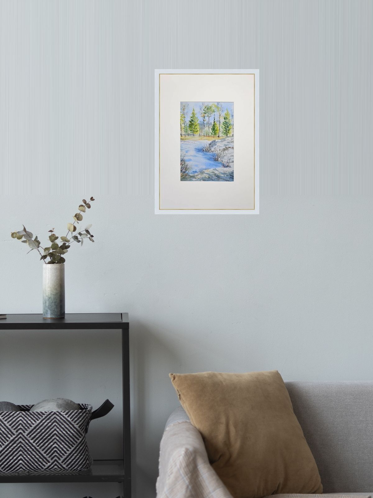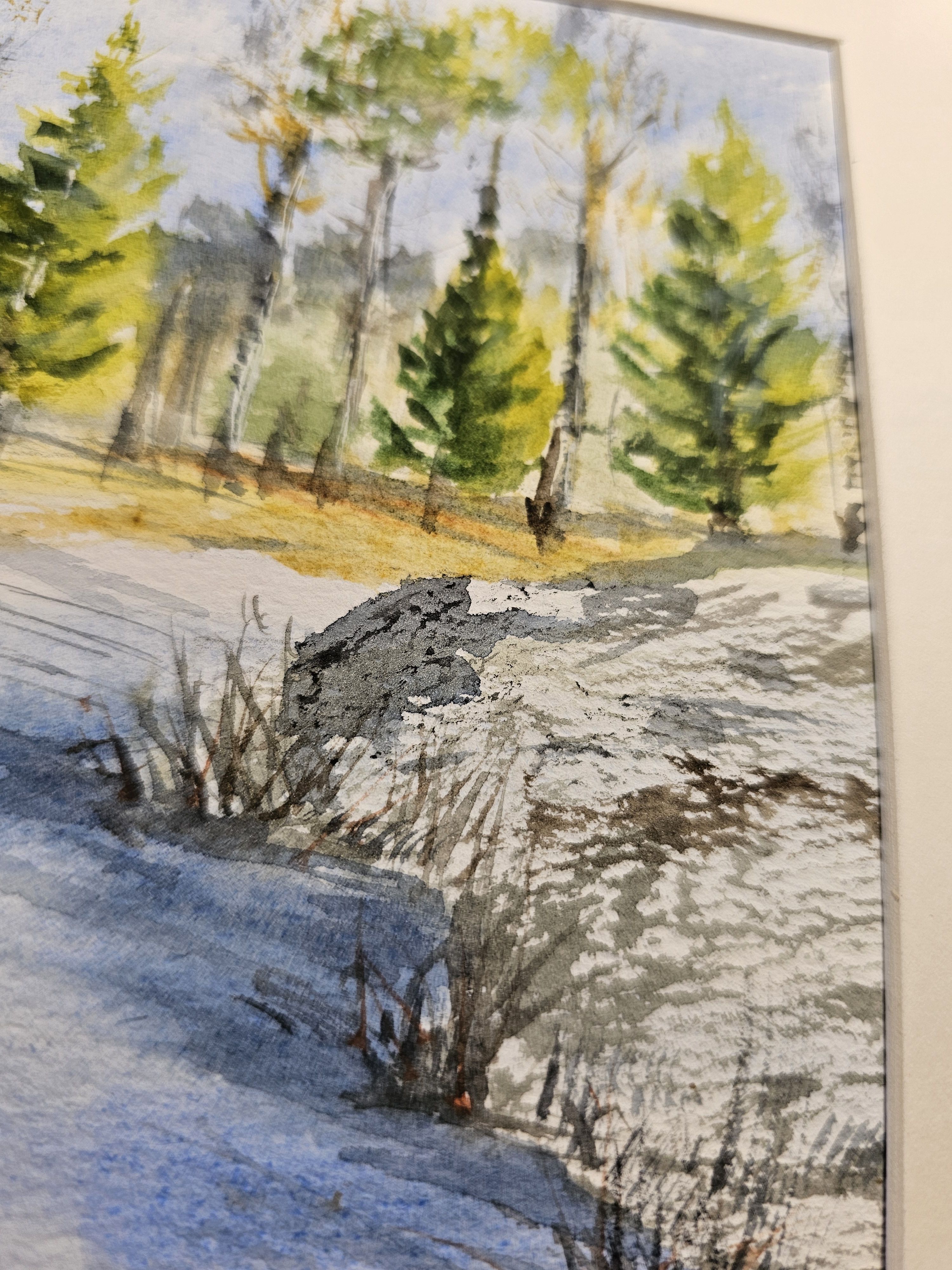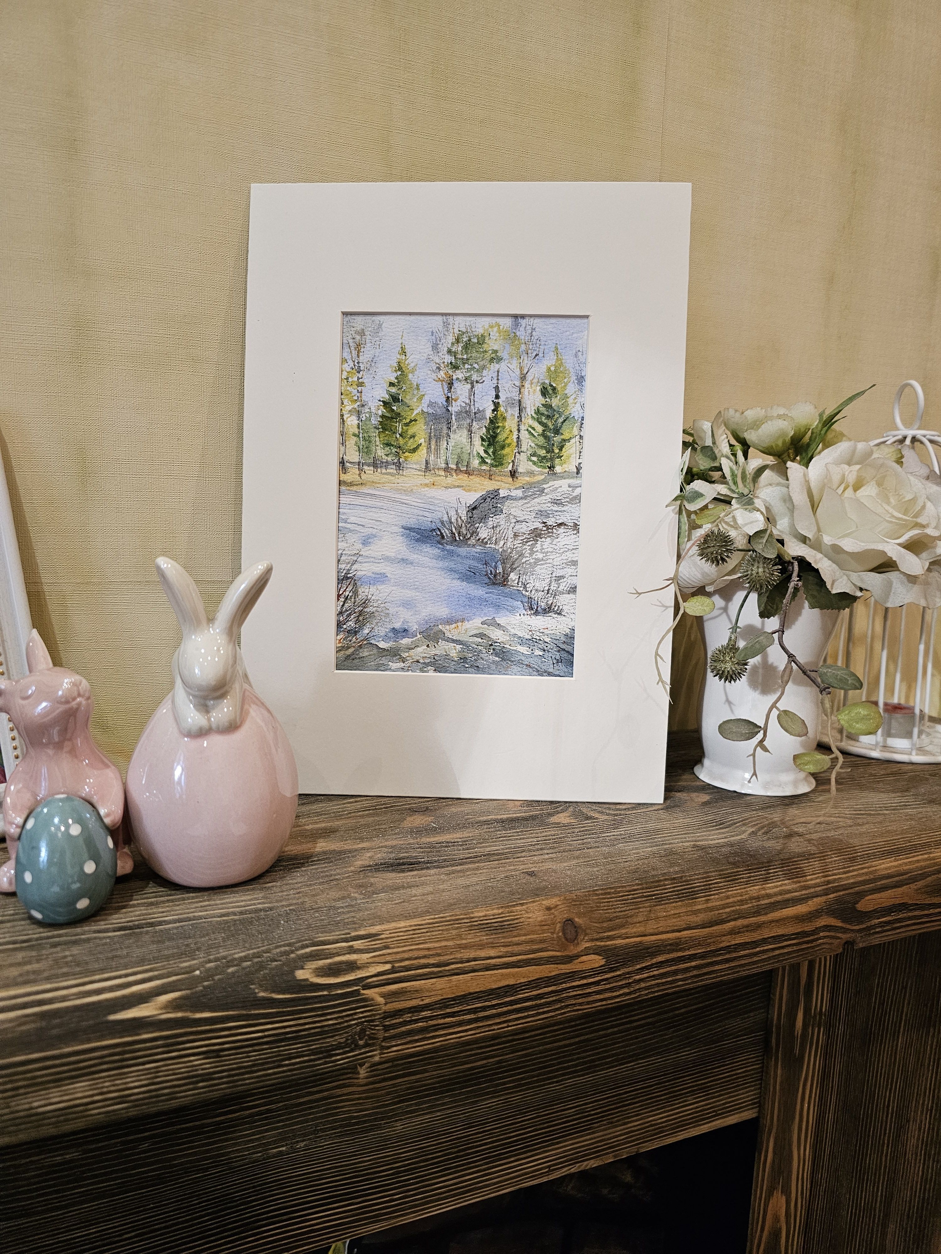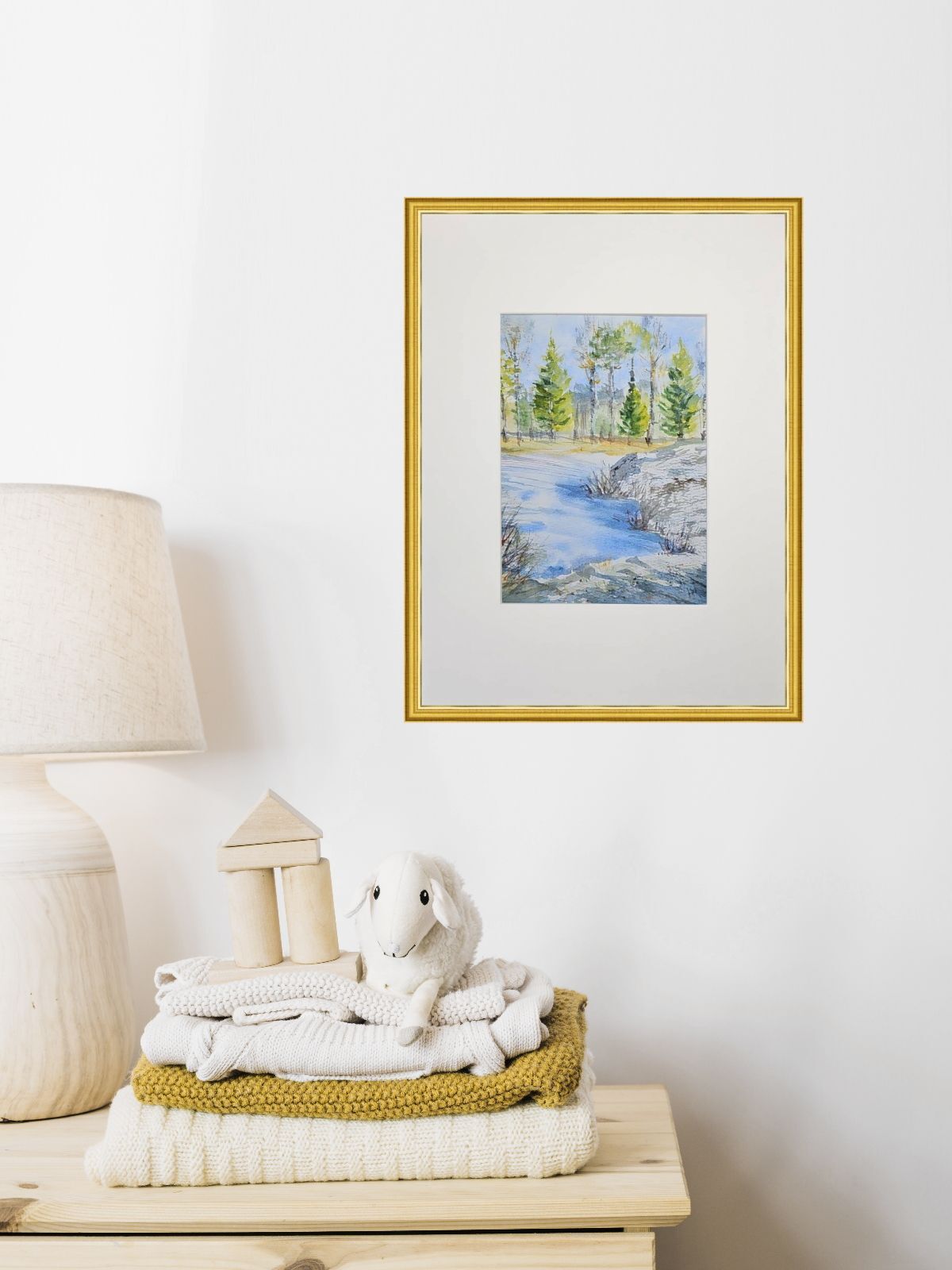 Нам представлена акварельная картина с природным пейзажем. На переднем плане виден замерзший водоем , вокруг которого растут кустарники. На заднем плане расположены деревья, преимущественно хвойные, с зелеными кронами. Небо ясное с голубым оттенком, что может указывать на хорошую погоду. Свет и тени на картине создают ощущение спокойствия и свежести. Общая композиция изображает спокойный лесной пейзаж.