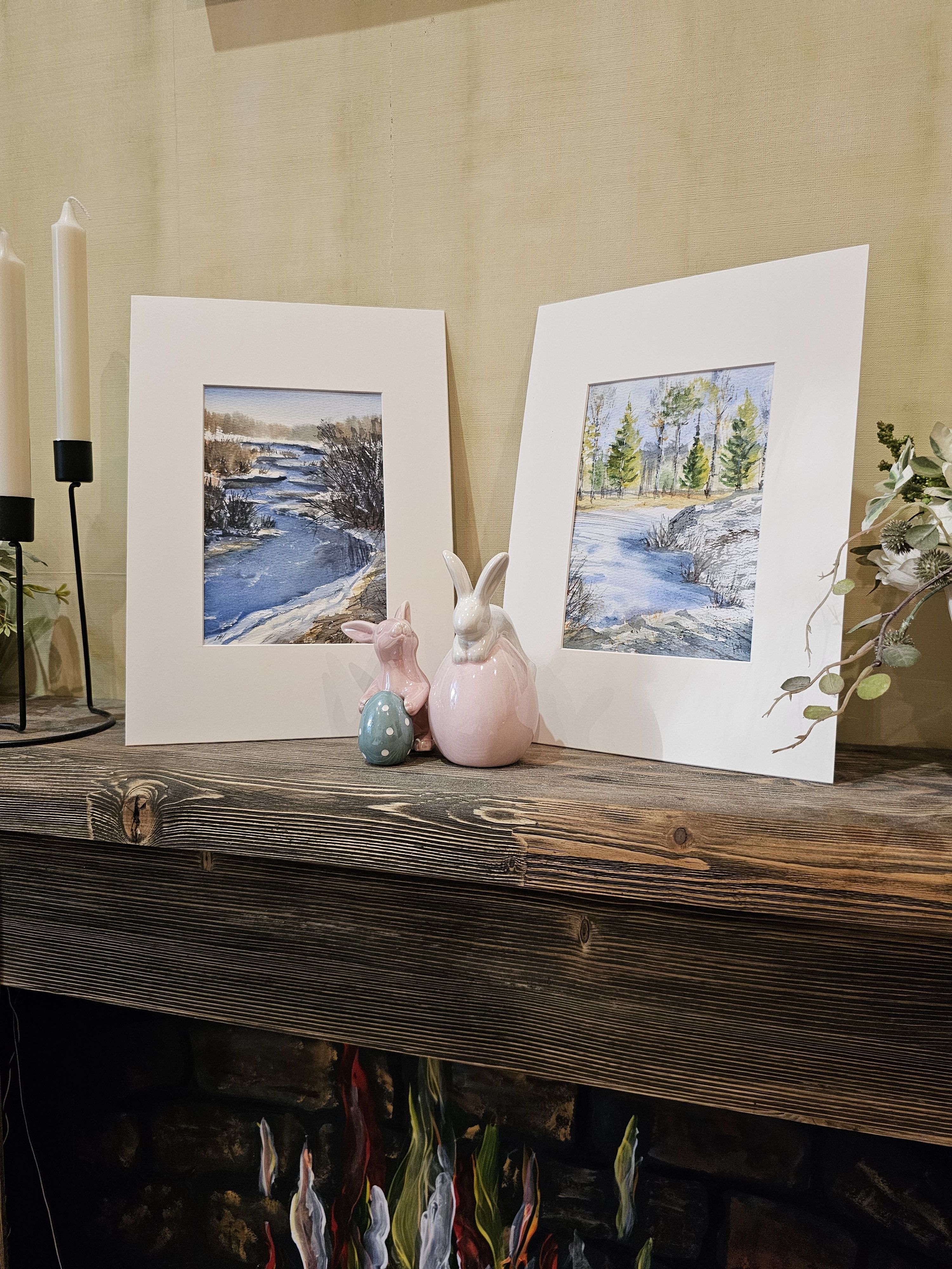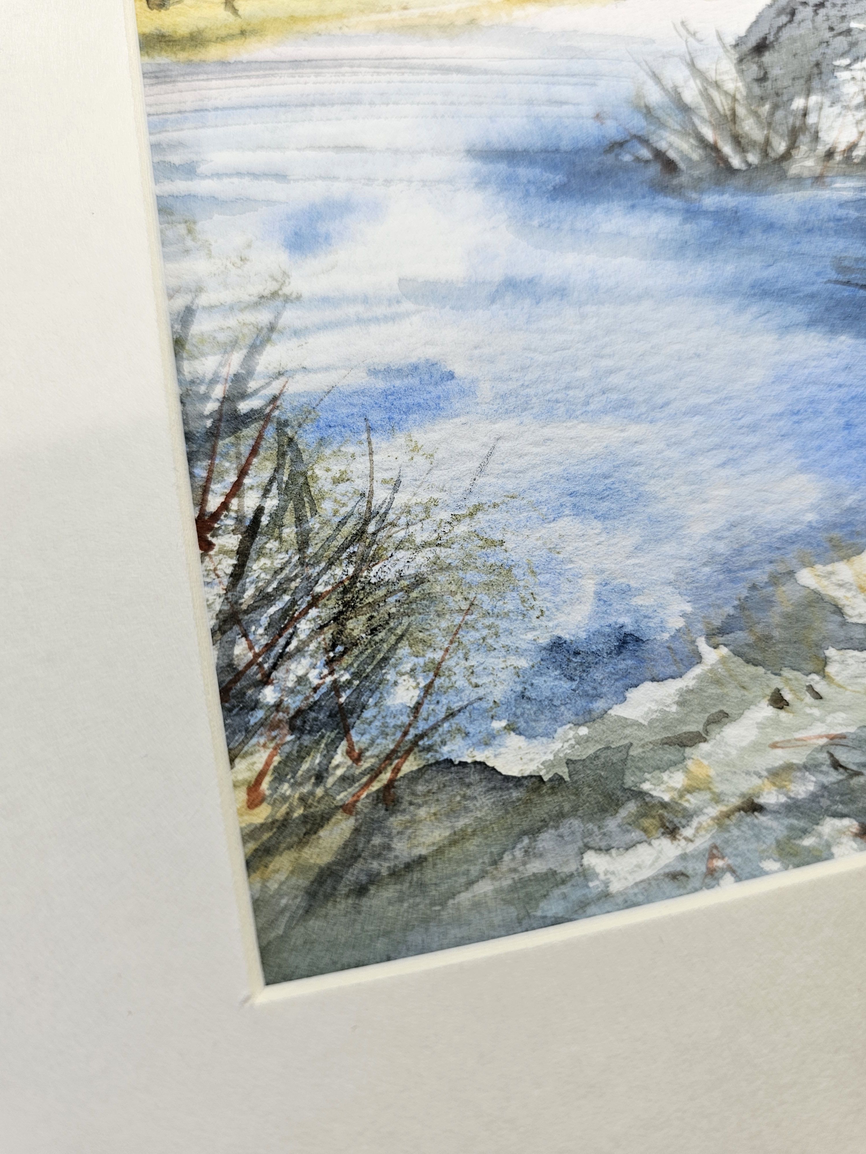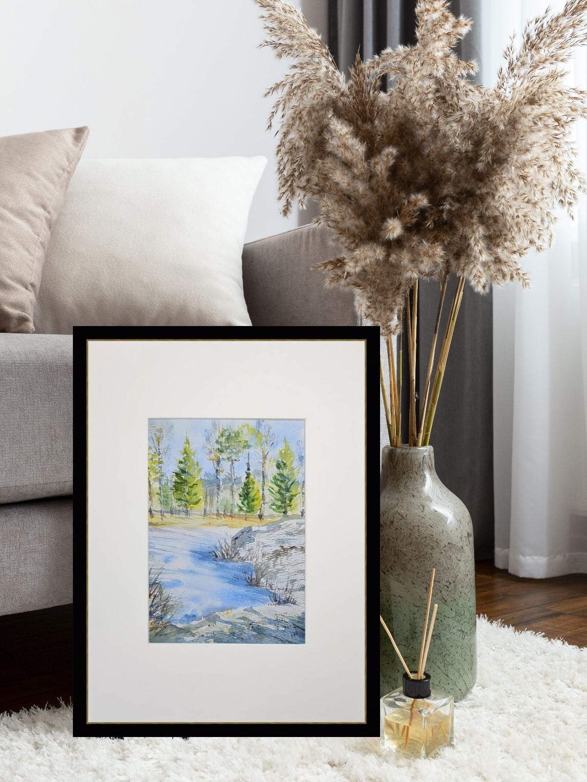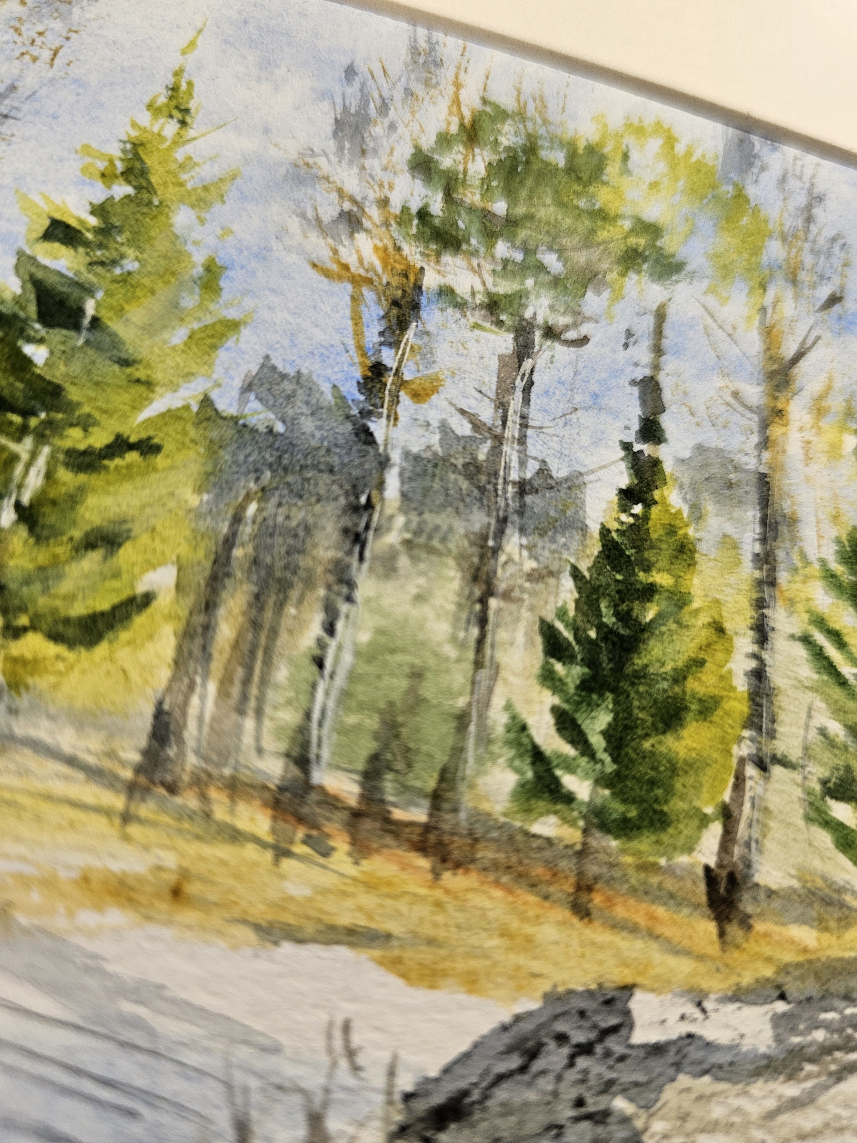 Нам представлена акварельная картина с природным пейзажем. На переднем плане виден замерзший водоем , вокруг которого растут кустарники. На заднем плане расположены деревья, преимущественно хвойные, с зелеными кронами. Небо ясное с голубым оттенком, что может указывать на хорошую погоду. Свет и тени на картине создают ощущение спокойствия и свежести. Общая композиция изображает спокойный лесной пейзаж.