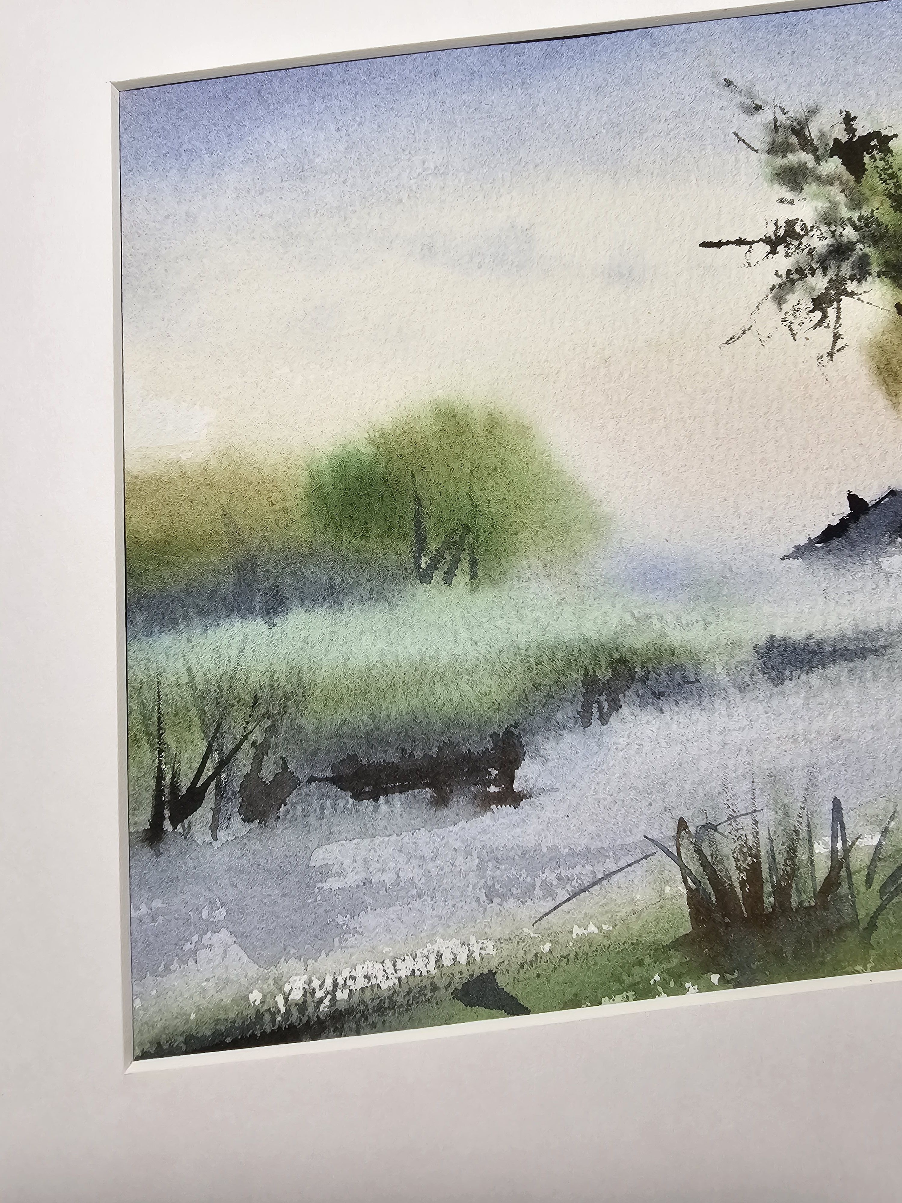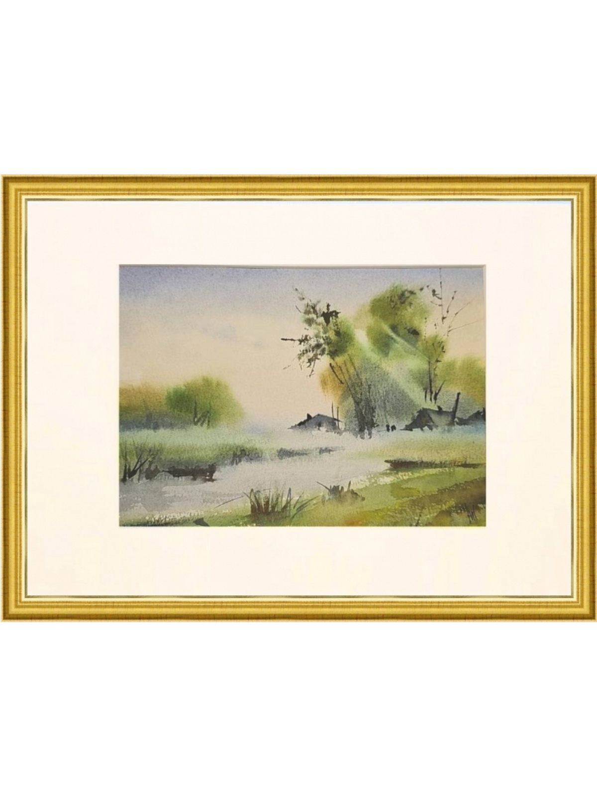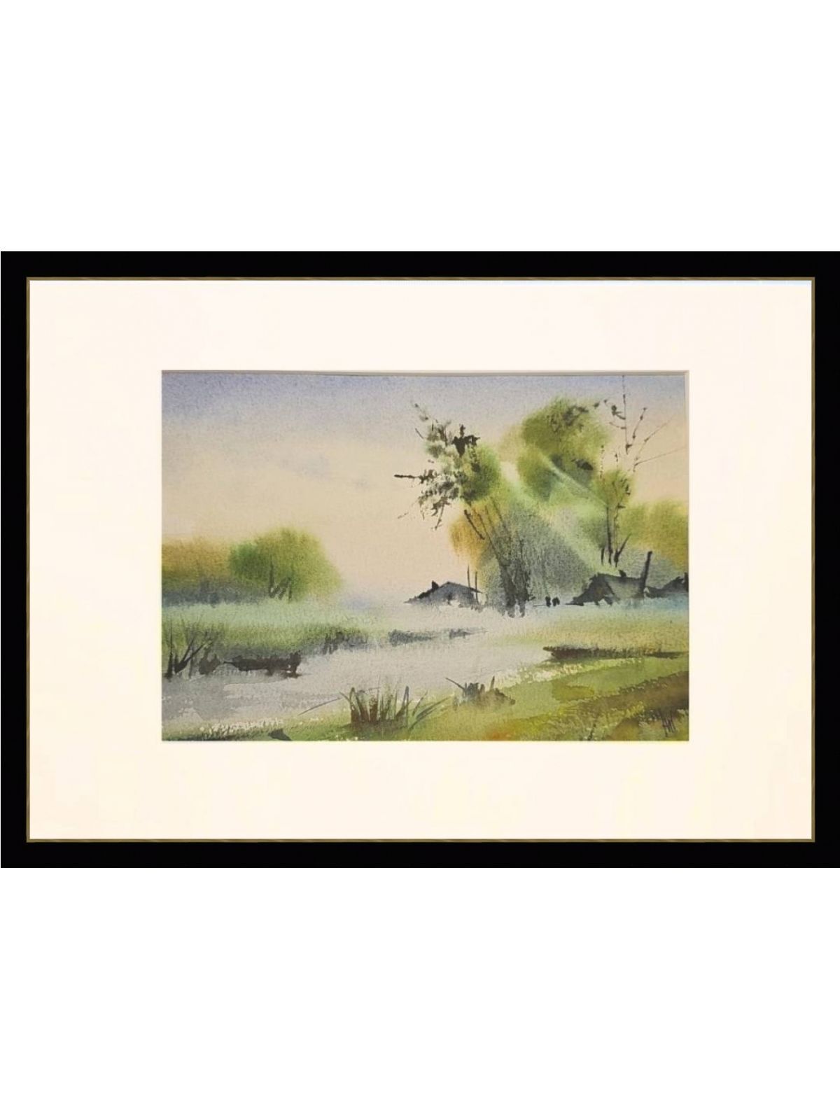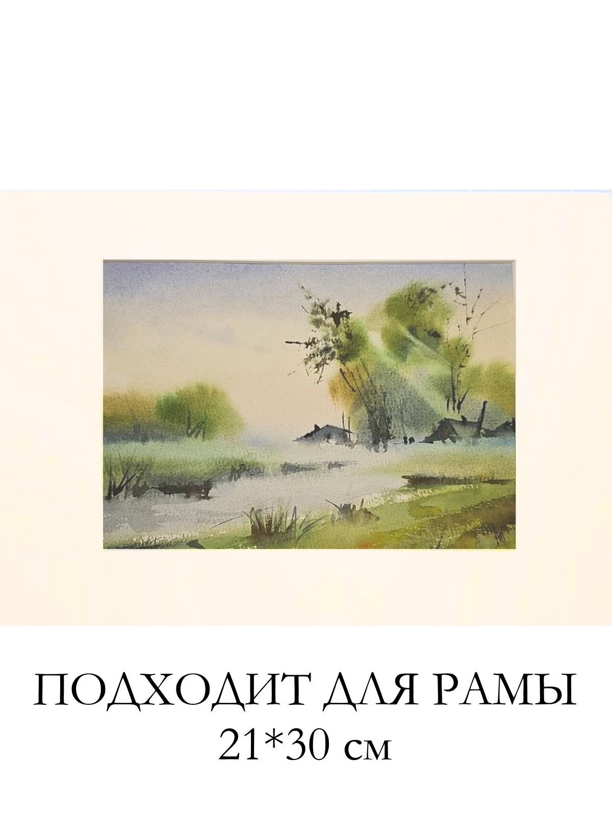 Нам представлена акварельная картина, на которой изображён пейзаж с туманом. На переднем плане видны водоём с берегами, поросшими травой. Вдалеке можно наблюдать силуэты деревьев и небольших домов или построек. Цветовая гамма выдержана в мягких зелёных и голубых тонах, создающих атмосферу спокойствия и уюта. Картина оформлена в паспарту.