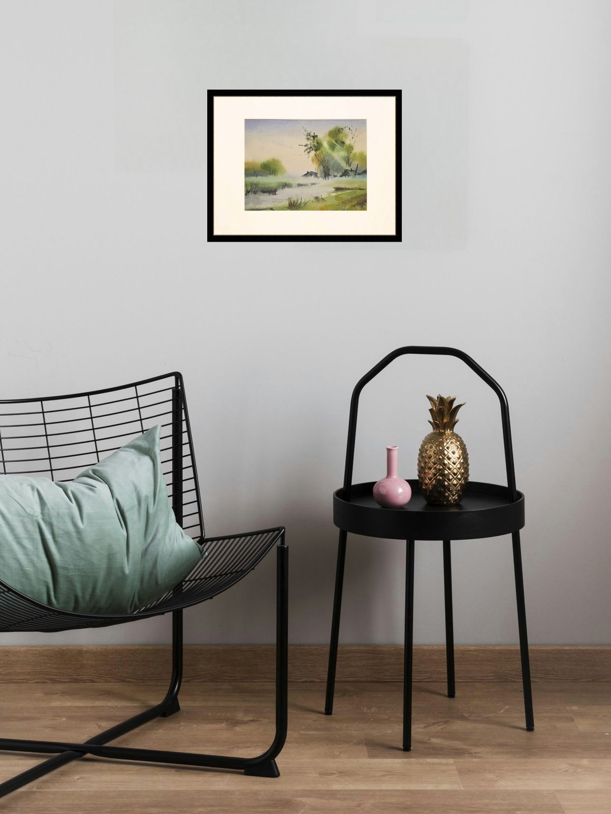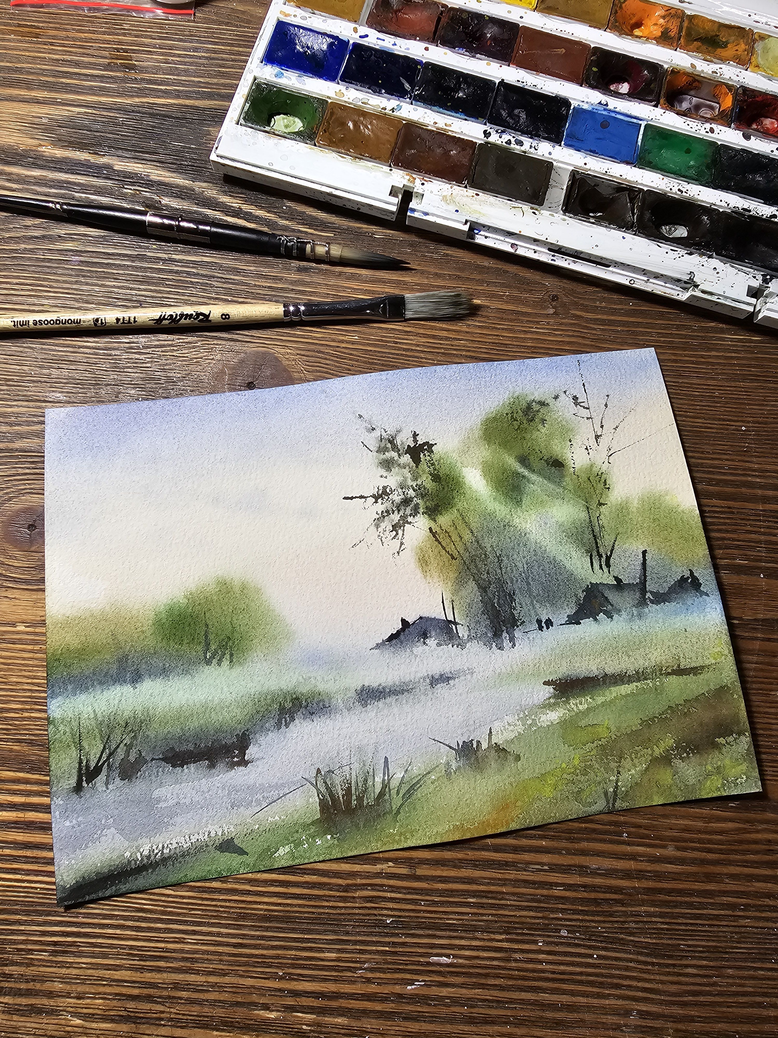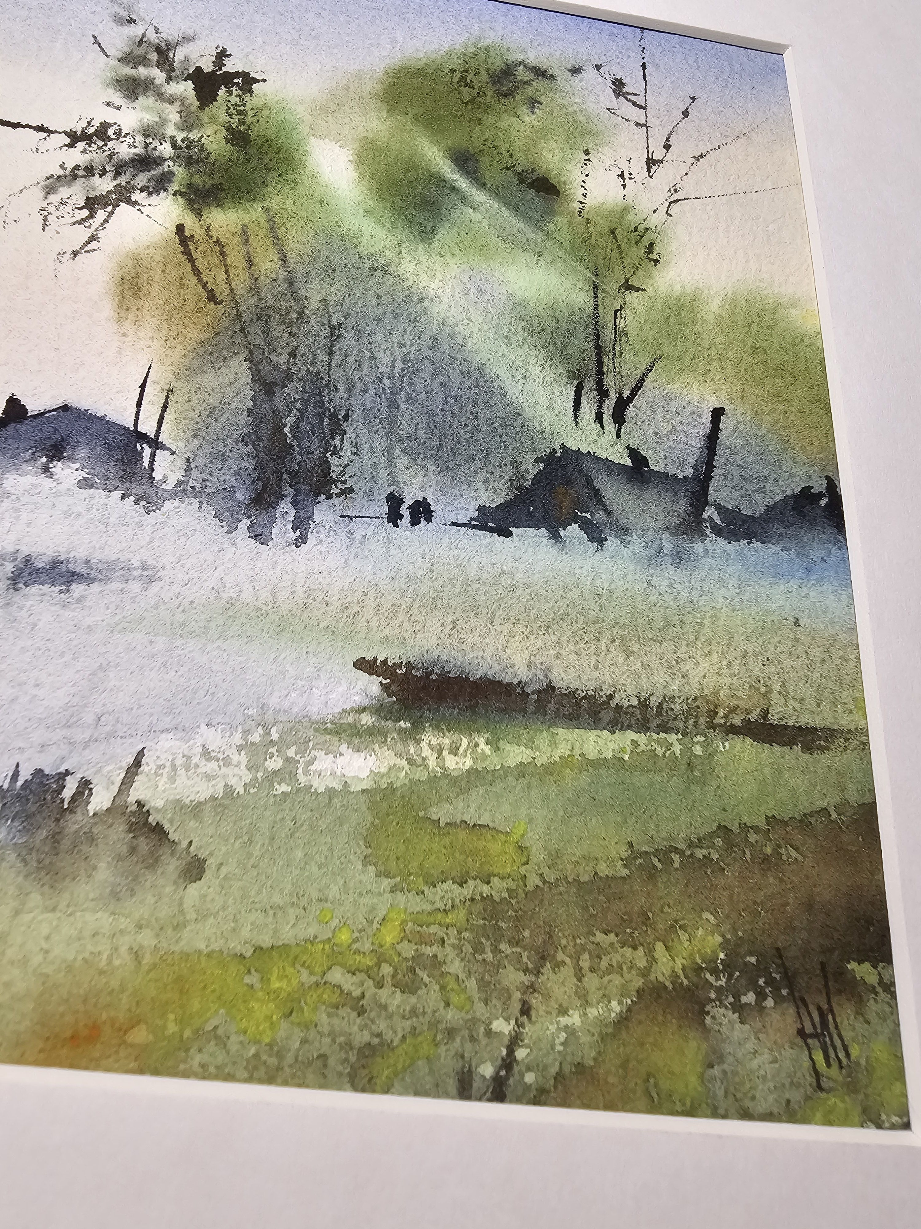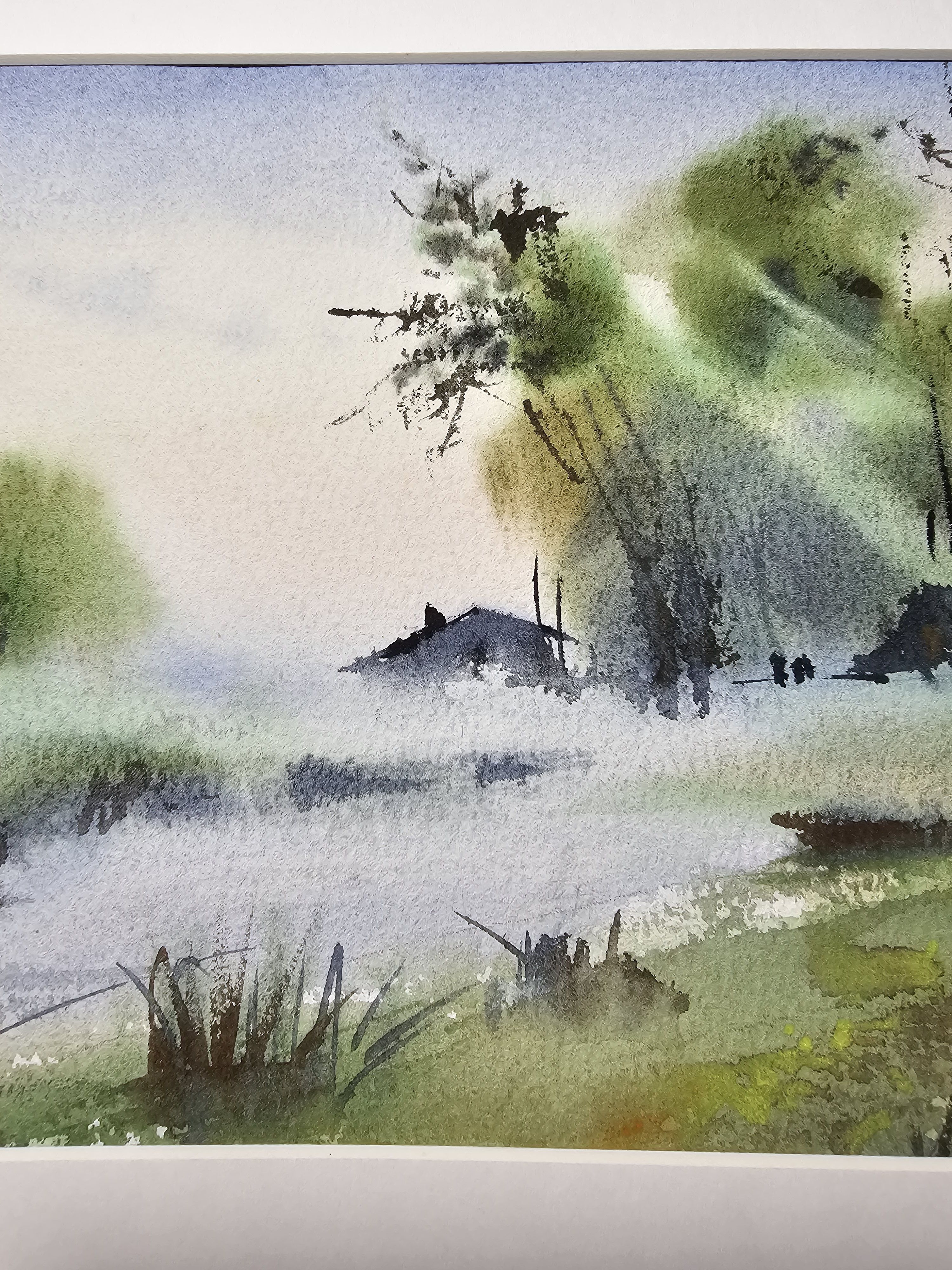 Нам представлена акварельная картина, на которой изображён пейзаж с туманом. На переднем плане видны водоём с берегами, поросшими травой. Вдалеке можно наблюдать силуэты деревьев и небольших домов или построек. Цветовая гамма выдержана в мягких зелёных и голубых тонах, создающих атмосферу спокойствия и уюта. Картина оформлена в паспарту.
