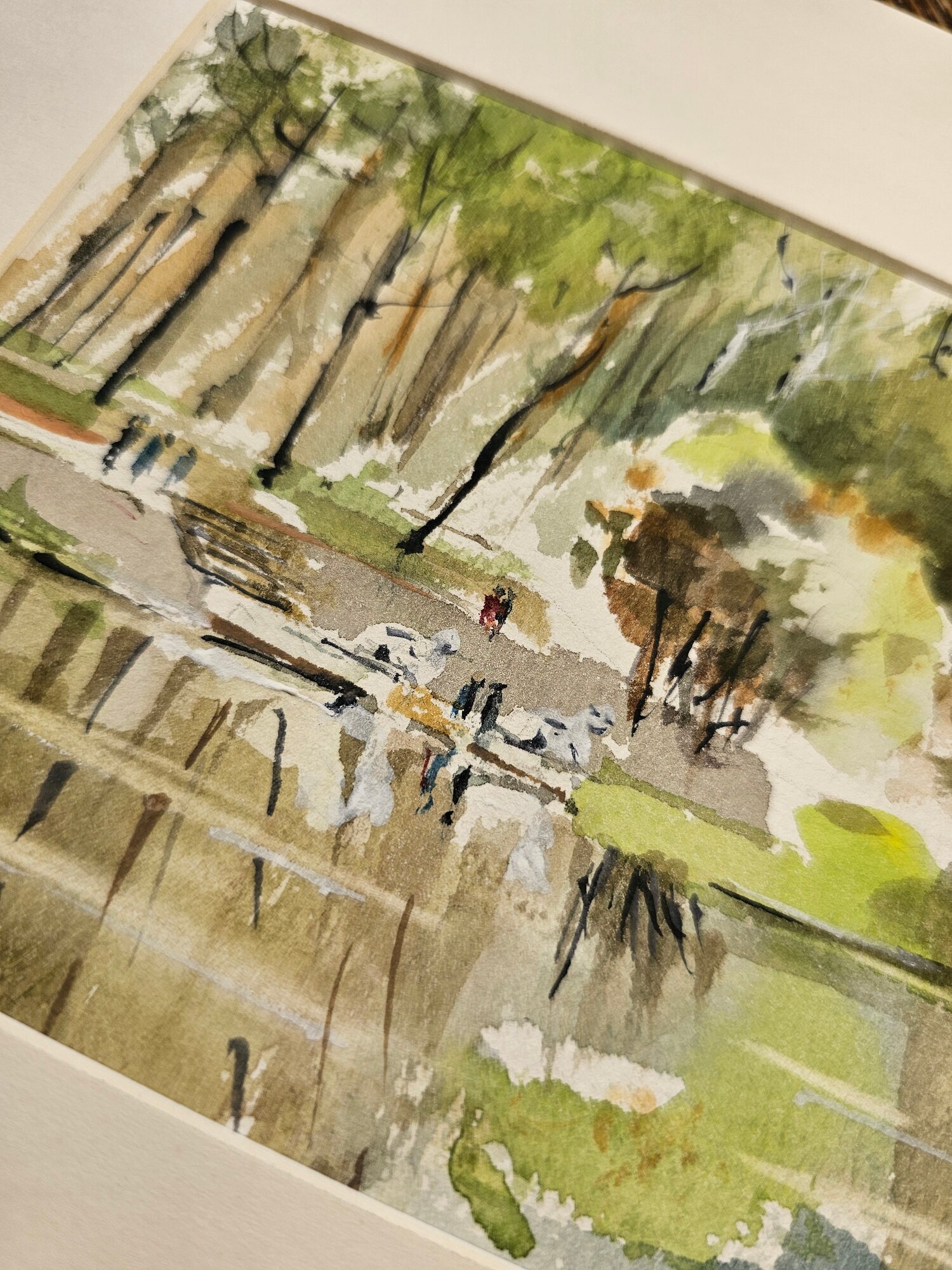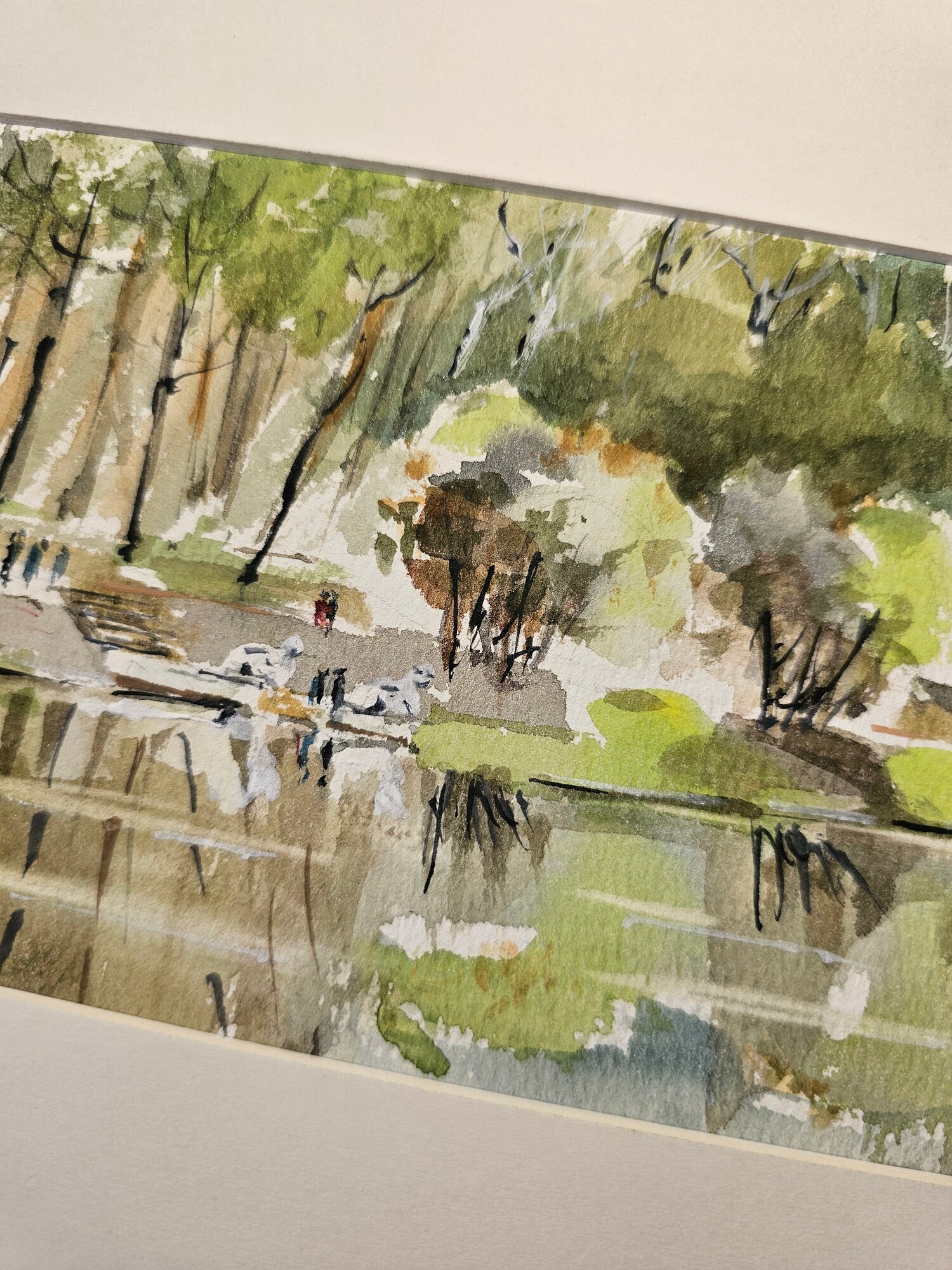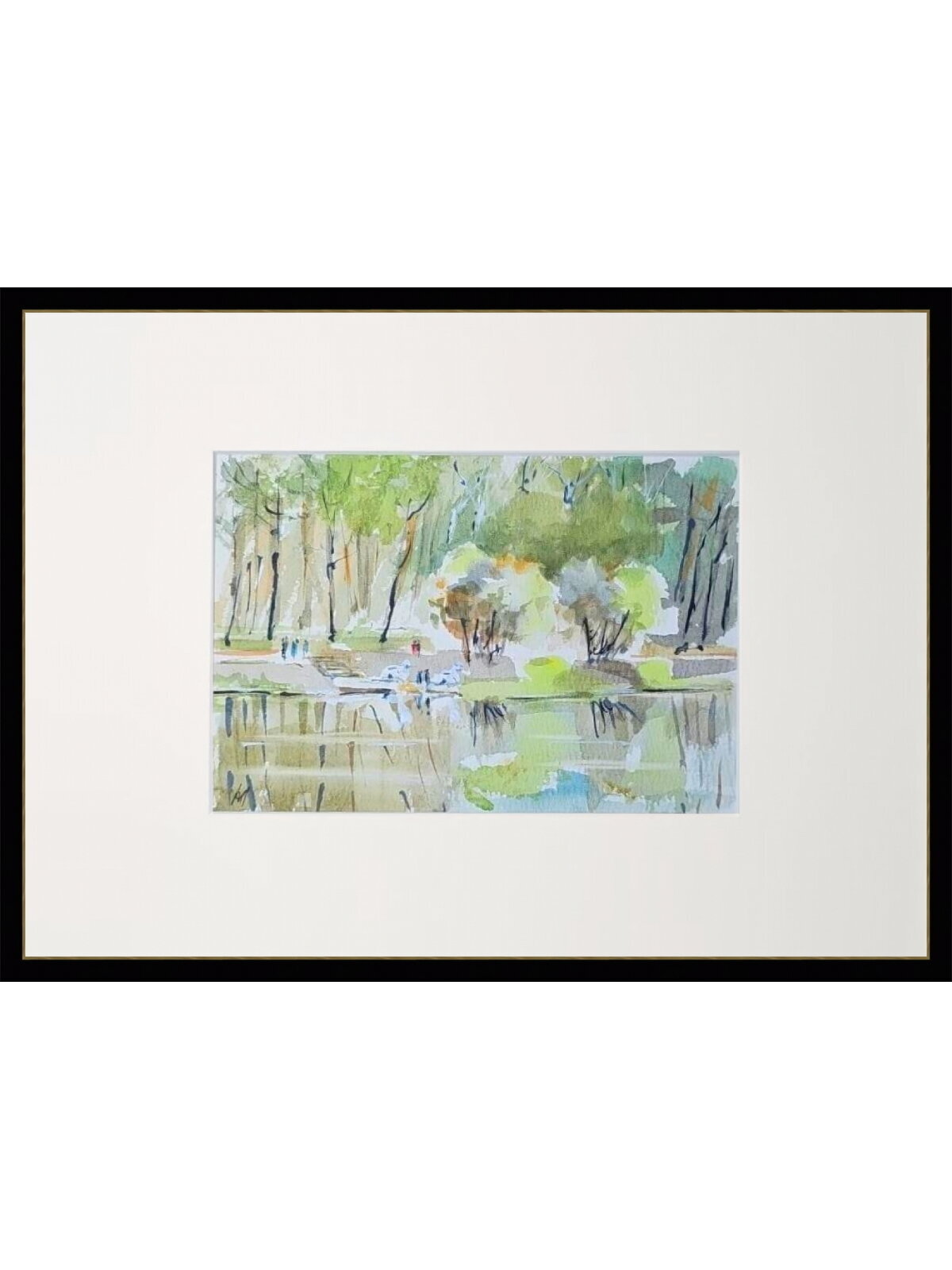 Нам представлена акварельная картина. Она показывает пейзаж с деревьями и водоёмом. Верхняя часть картины заполнена изображением деревьев, выполненных в зелёных и коричневых тонах, создающих ощущение леса. В центре картины можно увидеть фигуры людей, что добавляет жизни и динамики в композицию. Нижняя часть работы отражает водоём, где видны отражения деревьев и окружающей природы. Картина имеет нежные светлые оттенки, что создает атмосферу лёгкости и спокойствия.