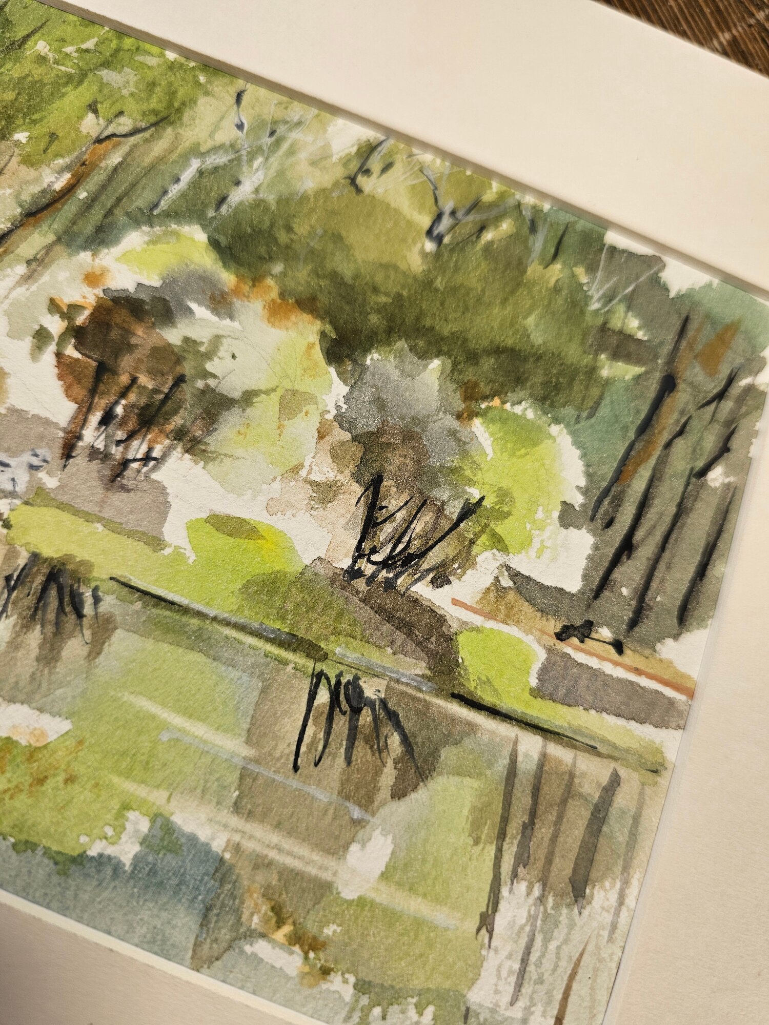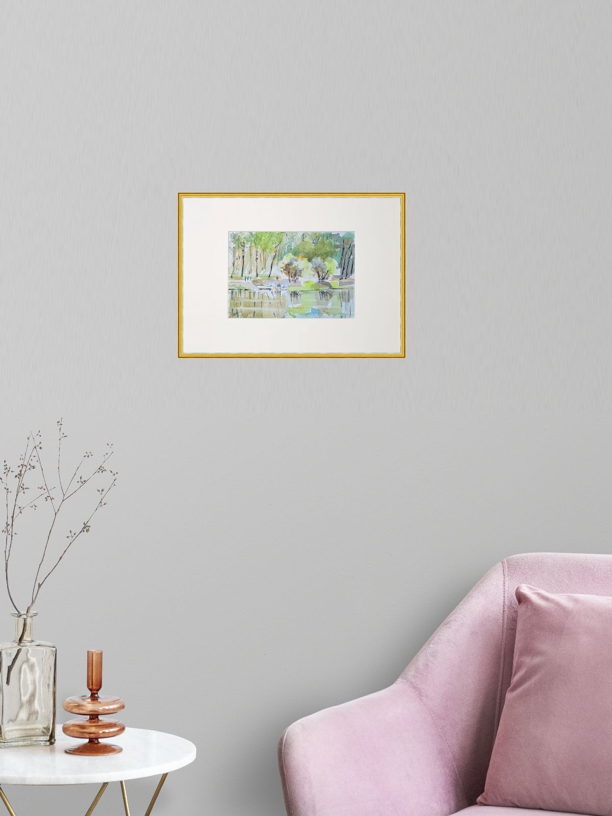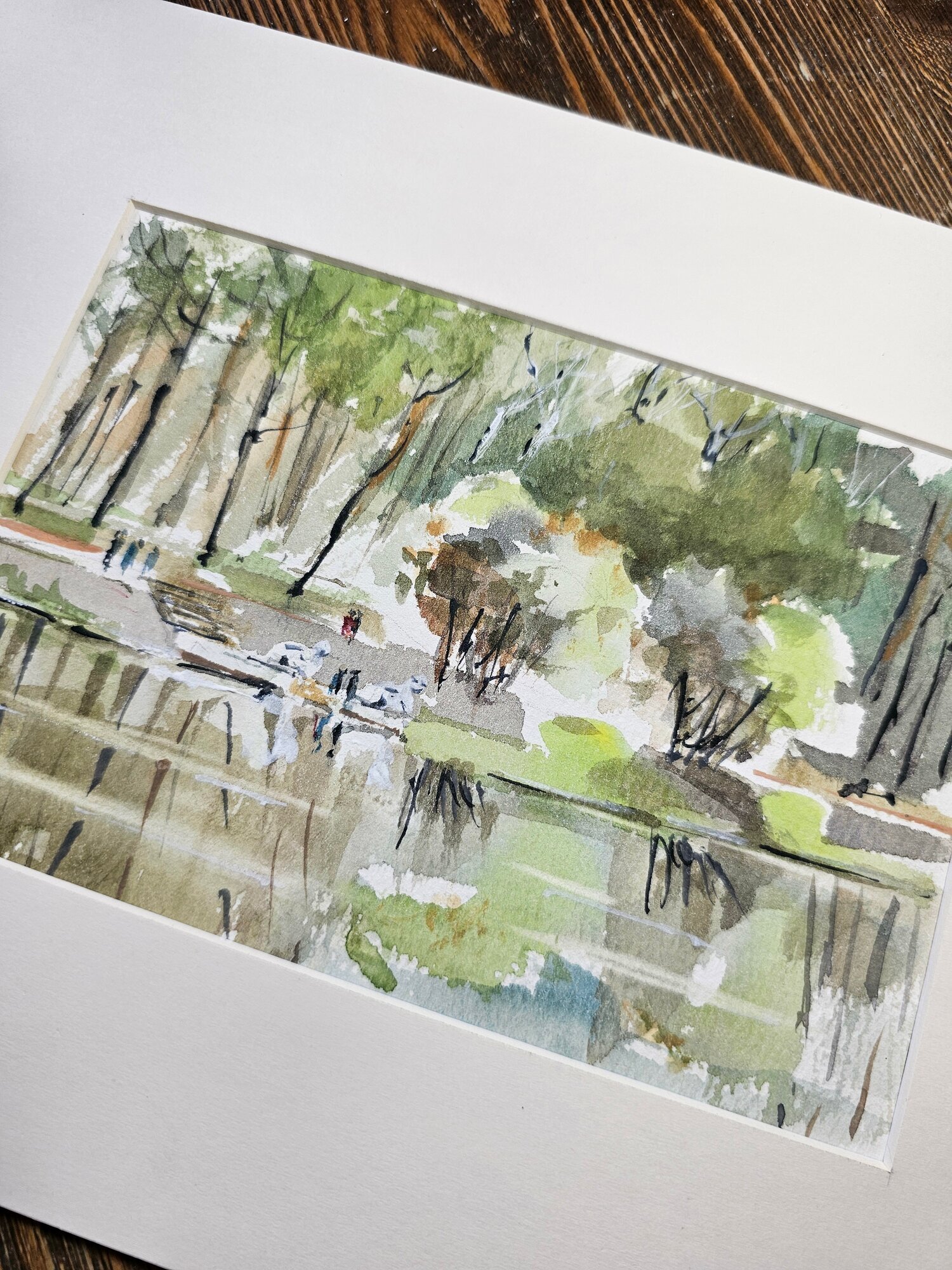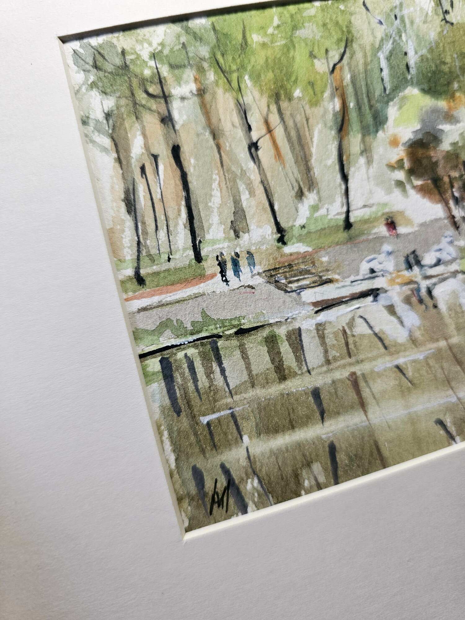 Нам представлена акварельная картина. Она показывает пейзаж с деревьями и водоёмом. Верхняя часть картины заполнена изображением деревьев, выполненных в зелёных и коричневых тонах, создающих ощущение леса. В центре картины можно увидеть фигуры людей, что добавляет жизни и динамики в композицию. Нижняя часть работы отражает водоём, где видны отражения деревьев и окружающей природы. Картина имеет нежные светлые оттенки, что создает атмосферу лёгкости и спокойствия.